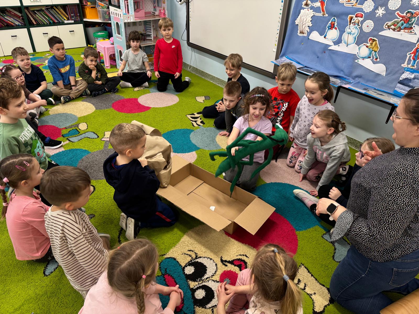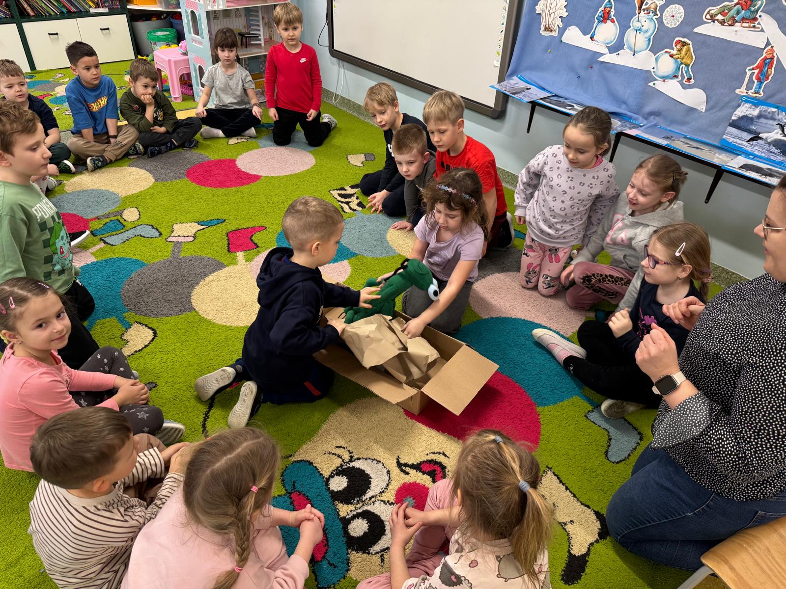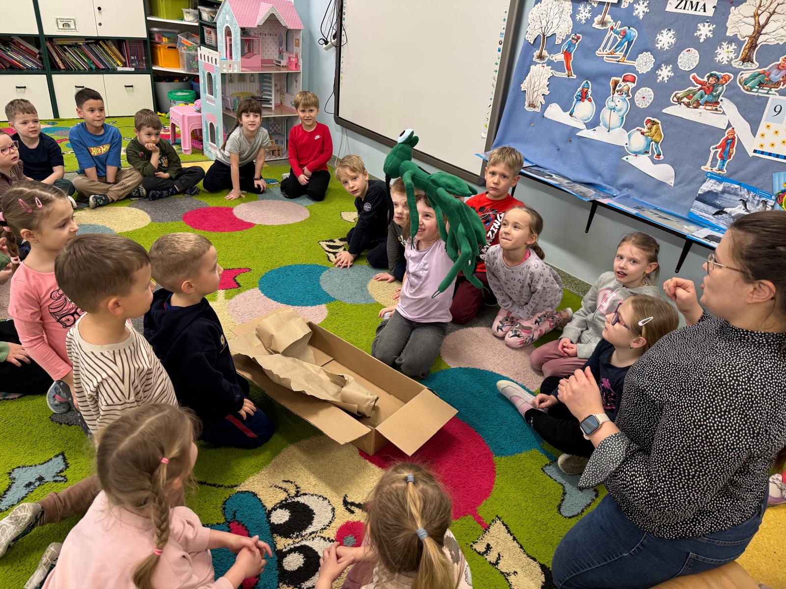 Zanim rozpoczęliśmy pierwsze zajęcia, nasze przedszkolaki czekała niespodzianka. Dzieci wspólnie rozpakowały tajemniczy prezent, w którym znajdowała się maskotka naszego nowego przyjaciela. W ten sposób poznały Patyczaka o imieniu Zippi, który będzie towarzyszył bohaterom: Tigowi, Lili i Sandy podczas cyklu 24 spotkań. Radości i ciekawości było co niemiara!
