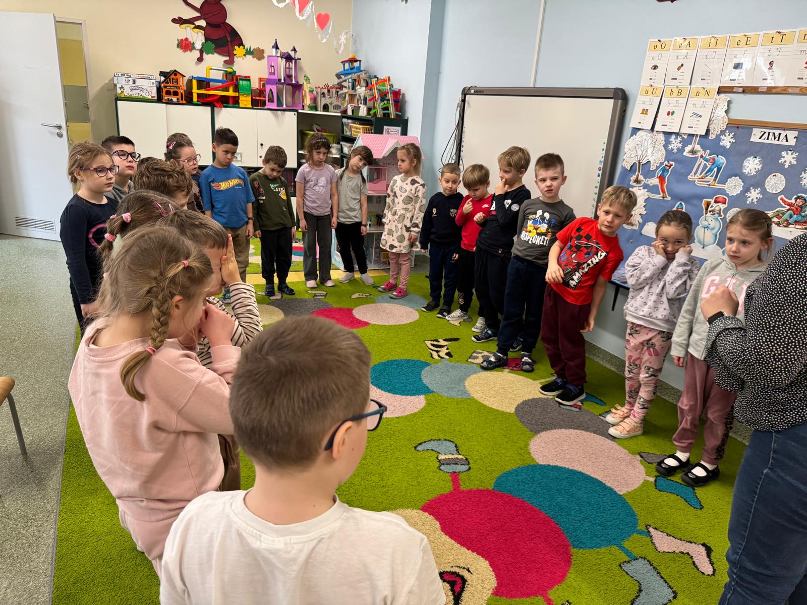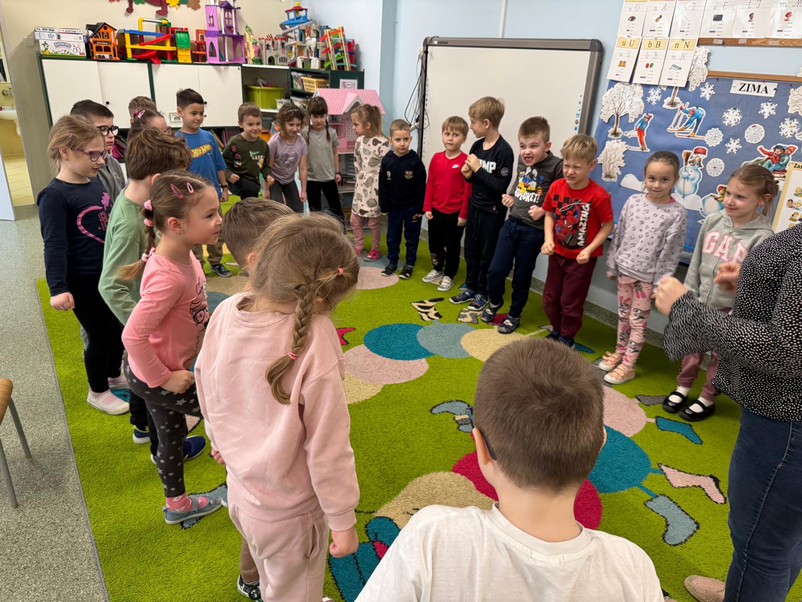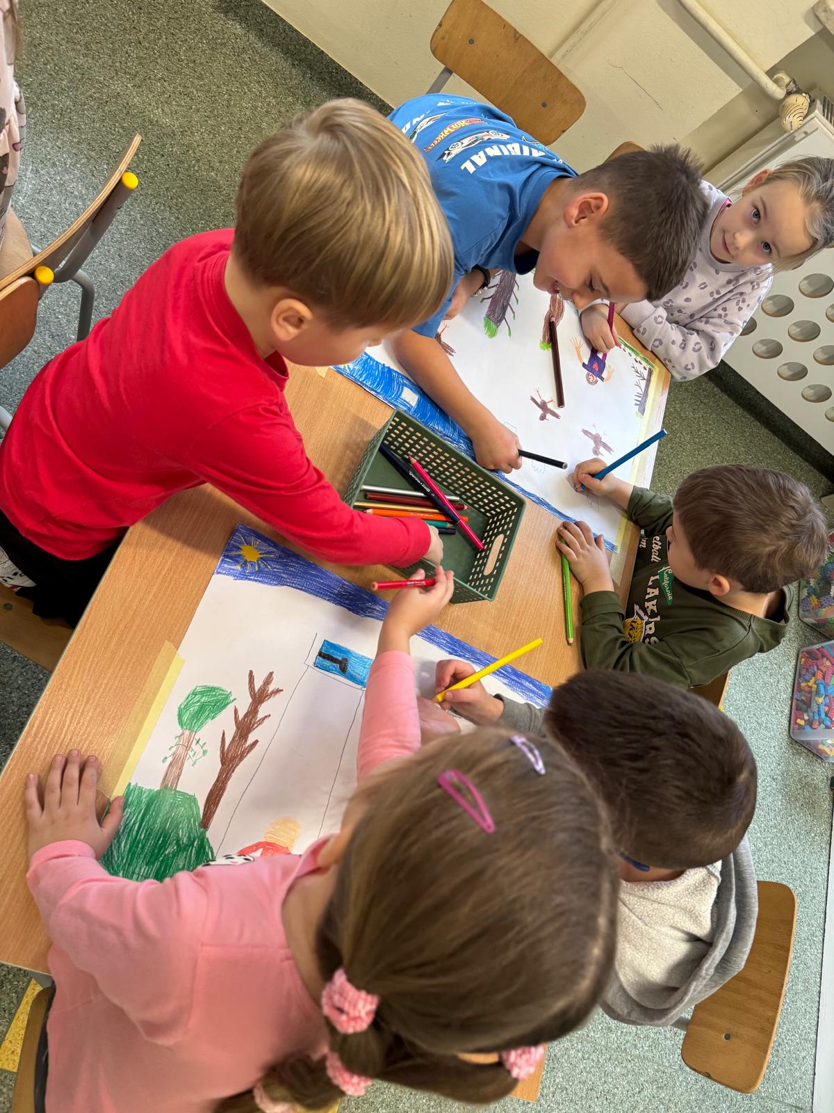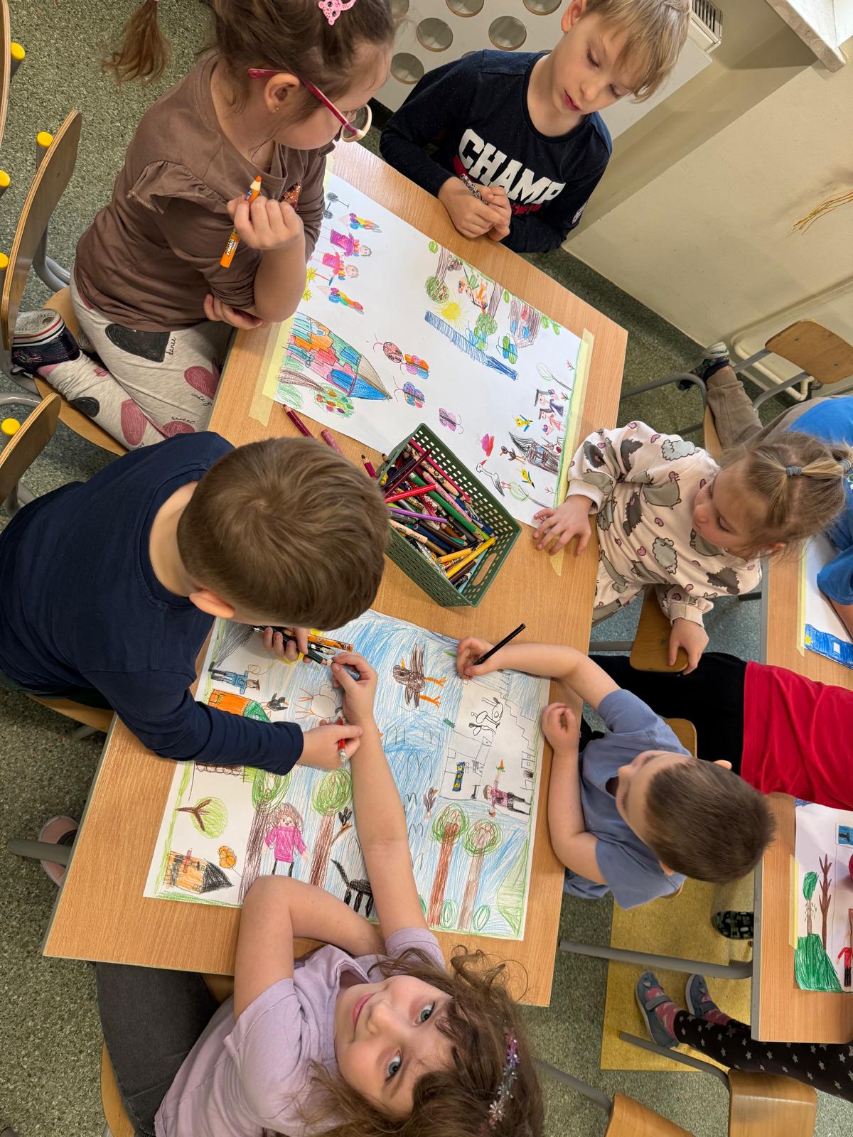 Podczas zajęć dzieci miały także okazję pracować grupach, tworząc rysunki przedstawiające sytuacje, w których czują się radosne, oraz rysowały sposoby, które pomagają im poradzić sobie ze smutkiem. Powstały piękne i bardzo refleksyjne prace, a przedszkolaki z dużym zaangażowaniem dzieliły się swoimi pomysłami.