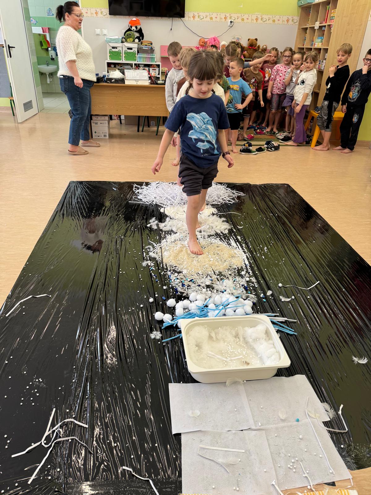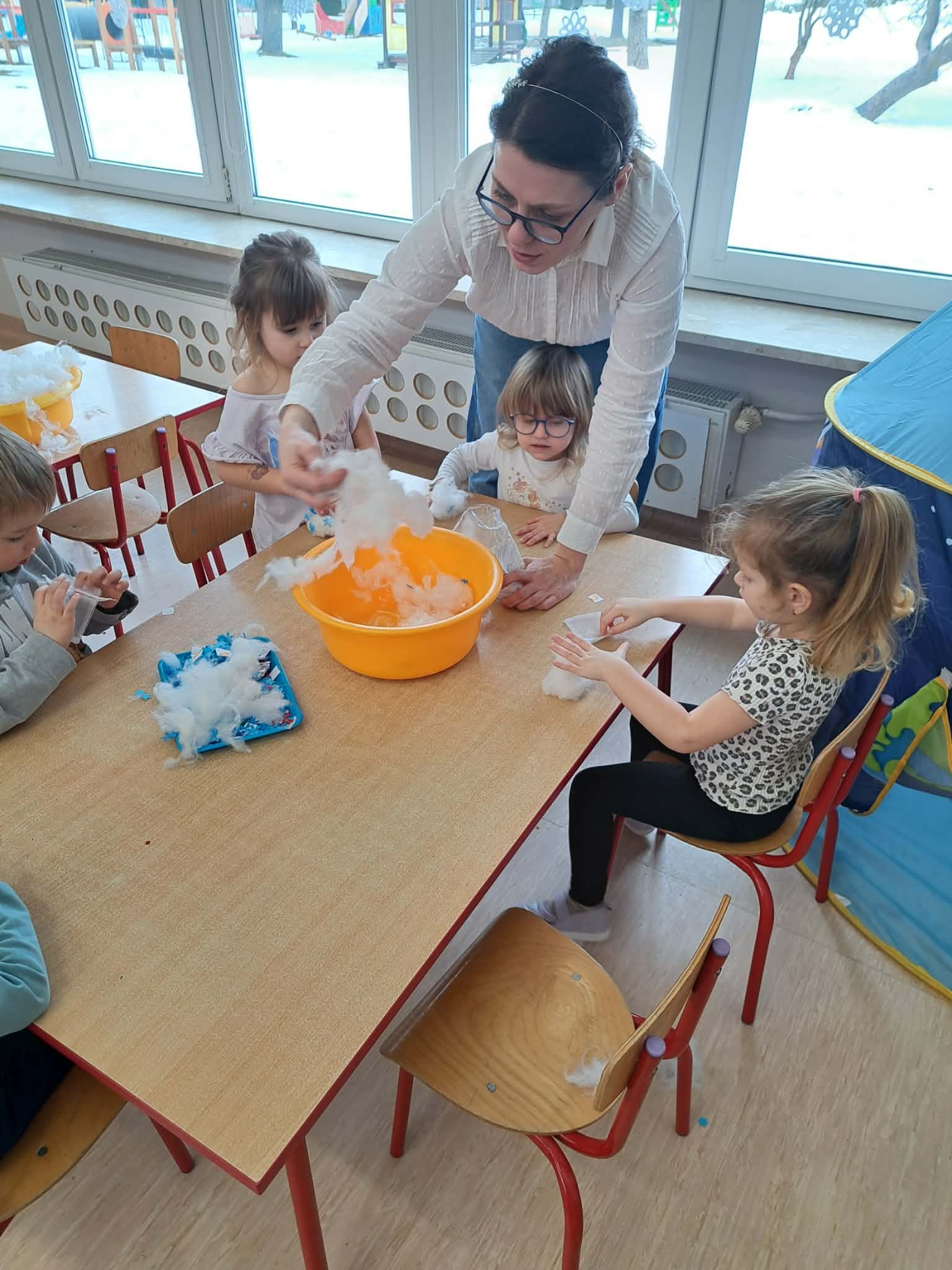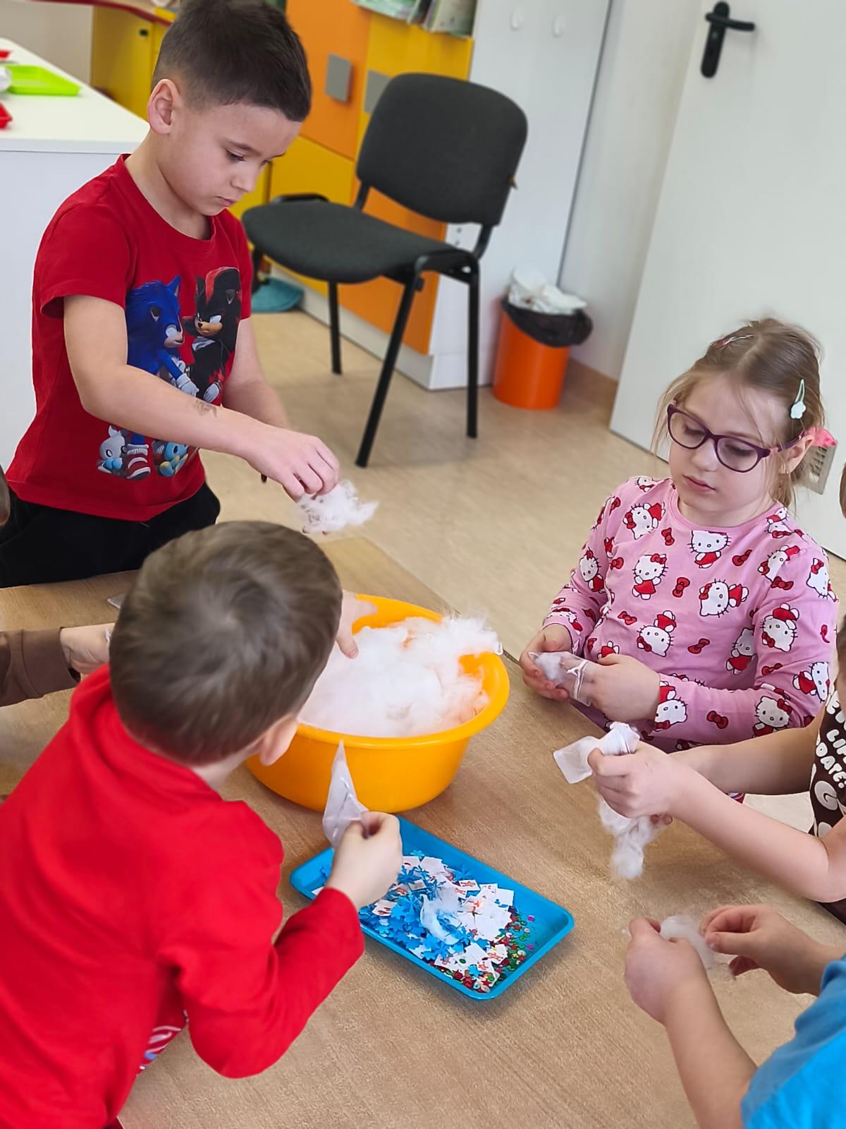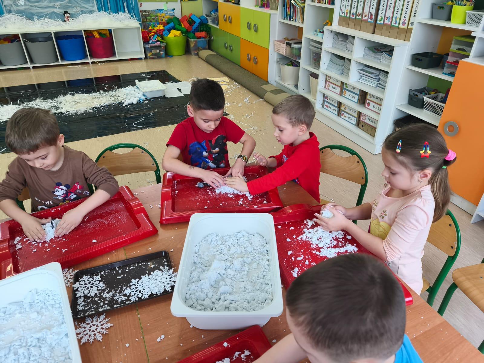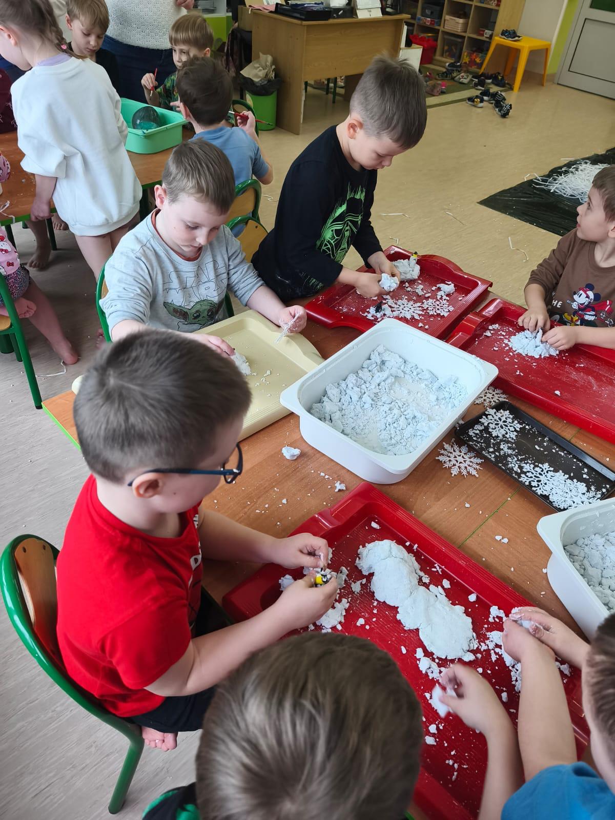 Tutaj był czas na odważne doświadczenia! Dzieci spacerowały boso przez zimową ścieżkę sensoryczną, a na jej końcu każdy przedszkolak – niczym prawdziwy śmiałek – stanął w prawdziwym śniegu przyniesionym z podwórka. Dzieci eksplorowały w własnoręcznie przygotowanej piankolinie, z której powstawały bałwany i igloo dla pingwinków, oraz badały zimową ciecz nienewtonowską w poszukiwaniu ukrytych skarbów, a także artystycznie malowały lodowe kule, obserwując ich niezwykłą teksturę.