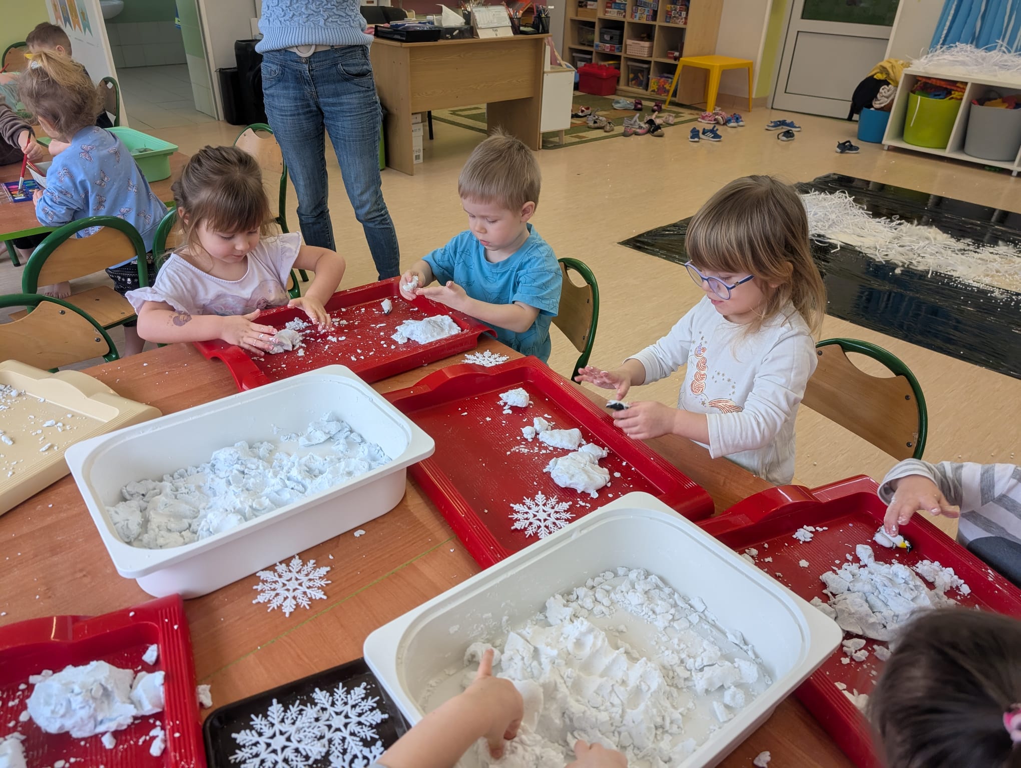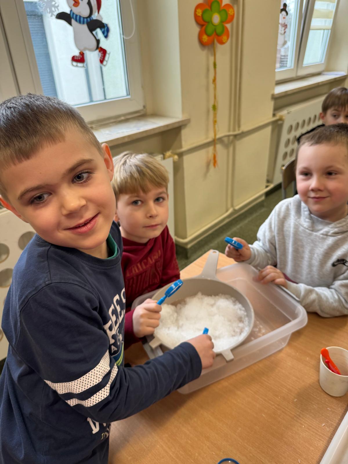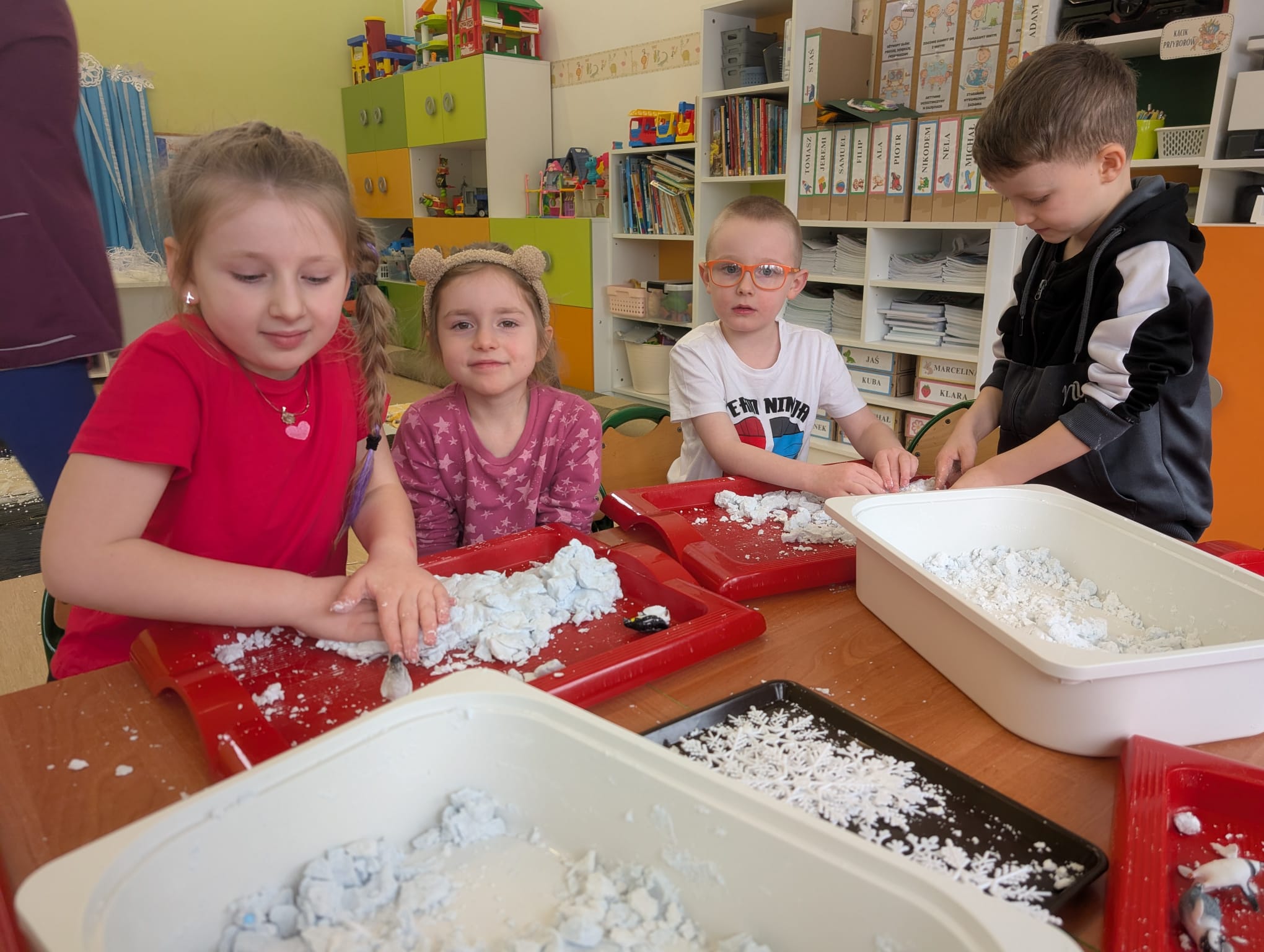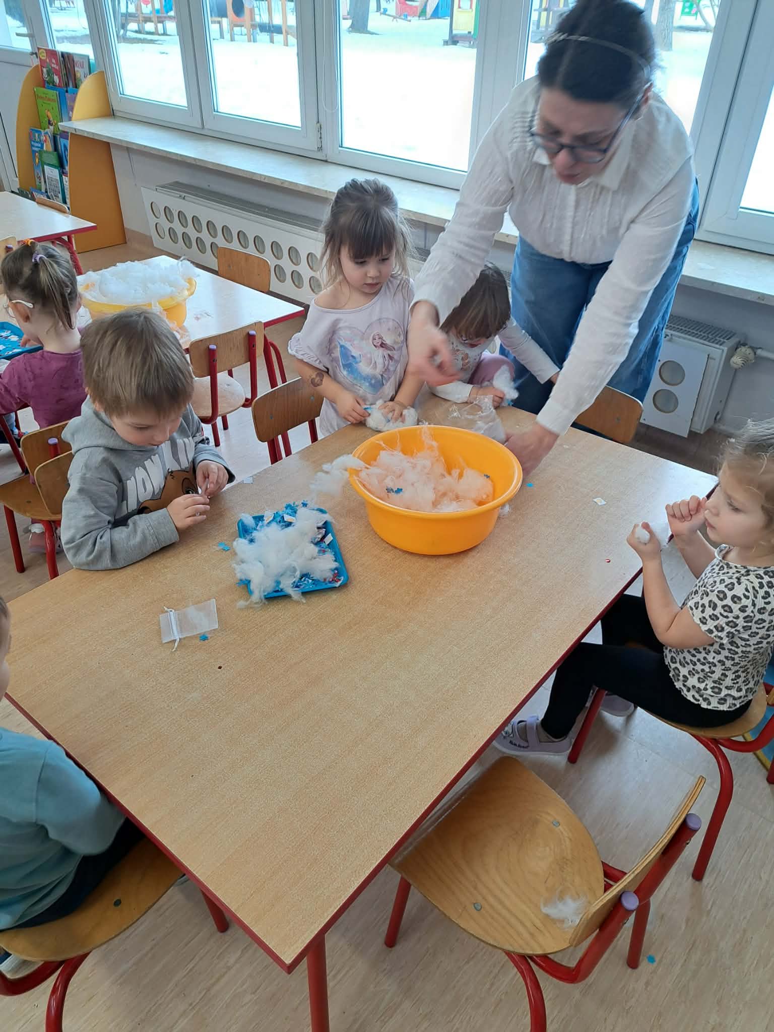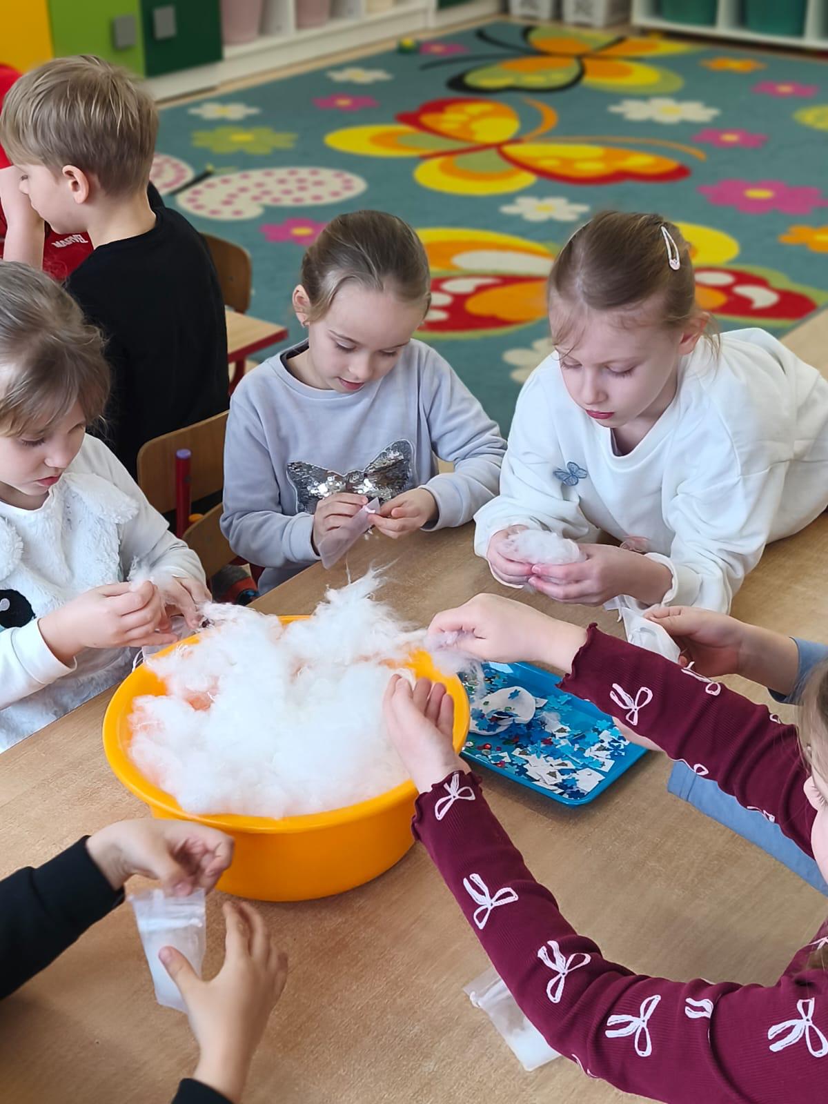 Tutaj był czas na odważne doświadczenia! Dzieci spacerowały boso przez zimową ścieżkę sensoryczną, a na jej końcu każdy przedszkolak – niczym prawdziwy śmiałek – stanął w prawdziwym śniegu przyniesionym z podwórka. Dzieci eksplorowały w własnoręcznie przygotowanej piankolinie, z której powstawały bałwany i igloo dla pingwinków, oraz badały zimową ciecz nienewtonowską w poszukiwaniu ukrytych skarbów, a także artystycznie malowały lodowe kule, obserwując ich niezwykłą teksturę.