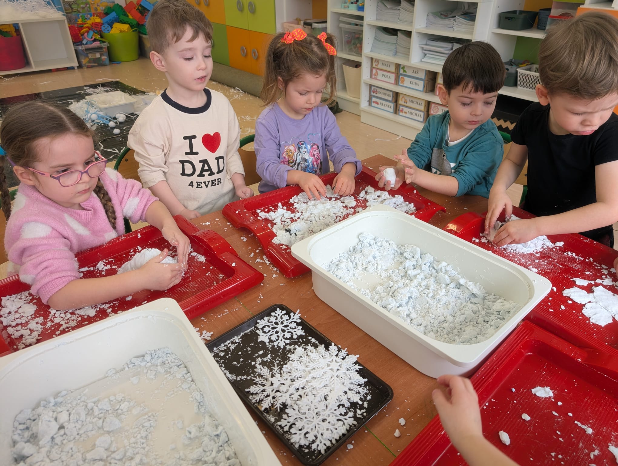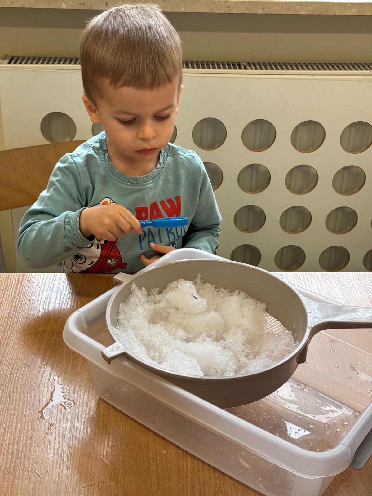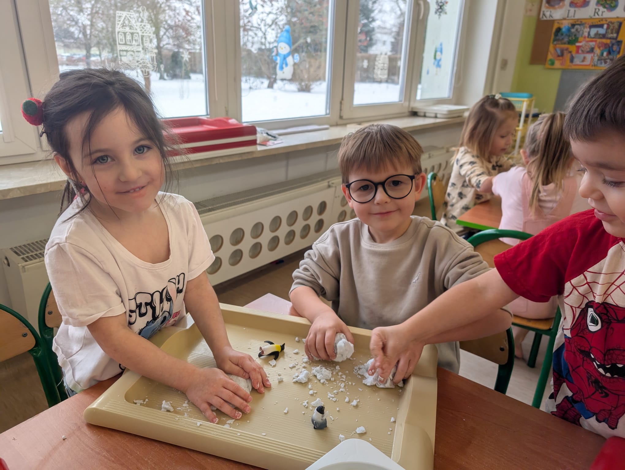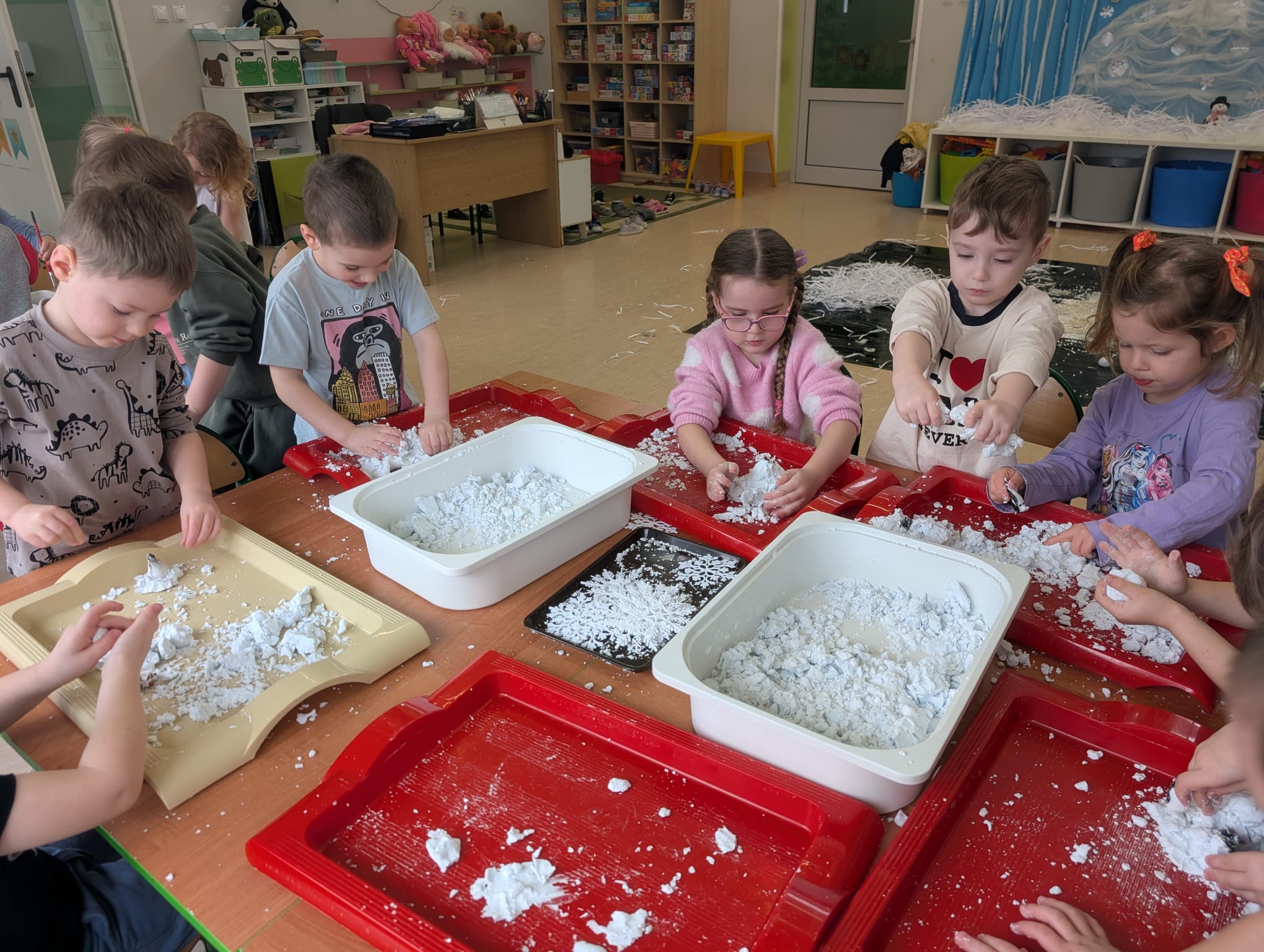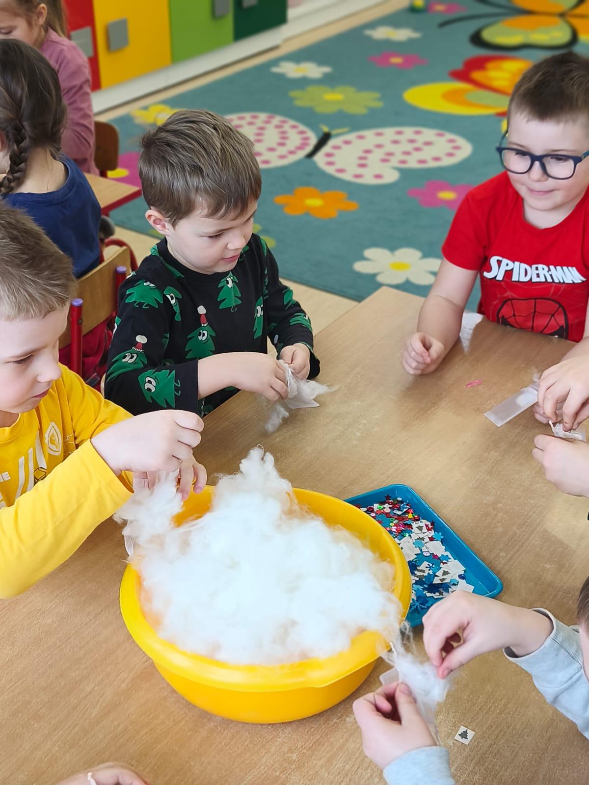 Tutaj był czas na odważne doświadczenia! Dzieci spacerowały boso przez zimową ścieżkę sensoryczną, a na jej końcu każdy przedszkolak – niczym prawdziwy śmiałek – stanął w prawdziwym śniegu przyniesionym z podwórka. Dzieci eksplorowały w własnoręcznie przygotowanej piankolinie, z której powstawały bałwany i igloo dla pingwinków, oraz badały zimową ciecz nienewtonowską w poszukiwaniu ukrytych skarbów, a także artystycznie malowały lodowe kule, obserwując ich niezwykłą teksturę.