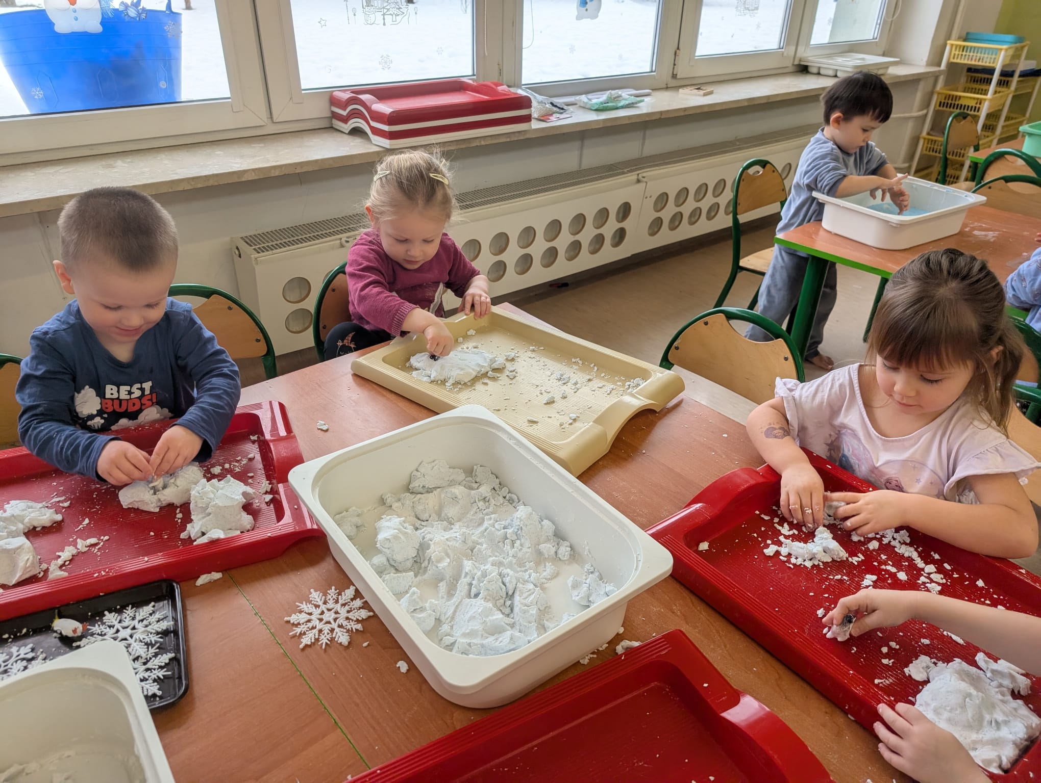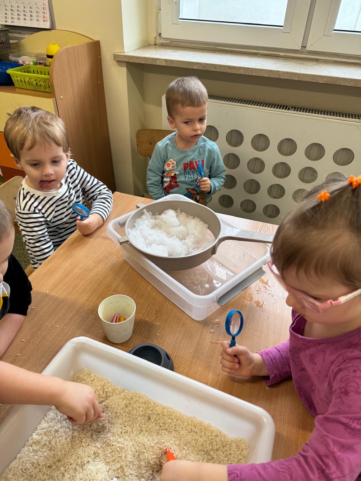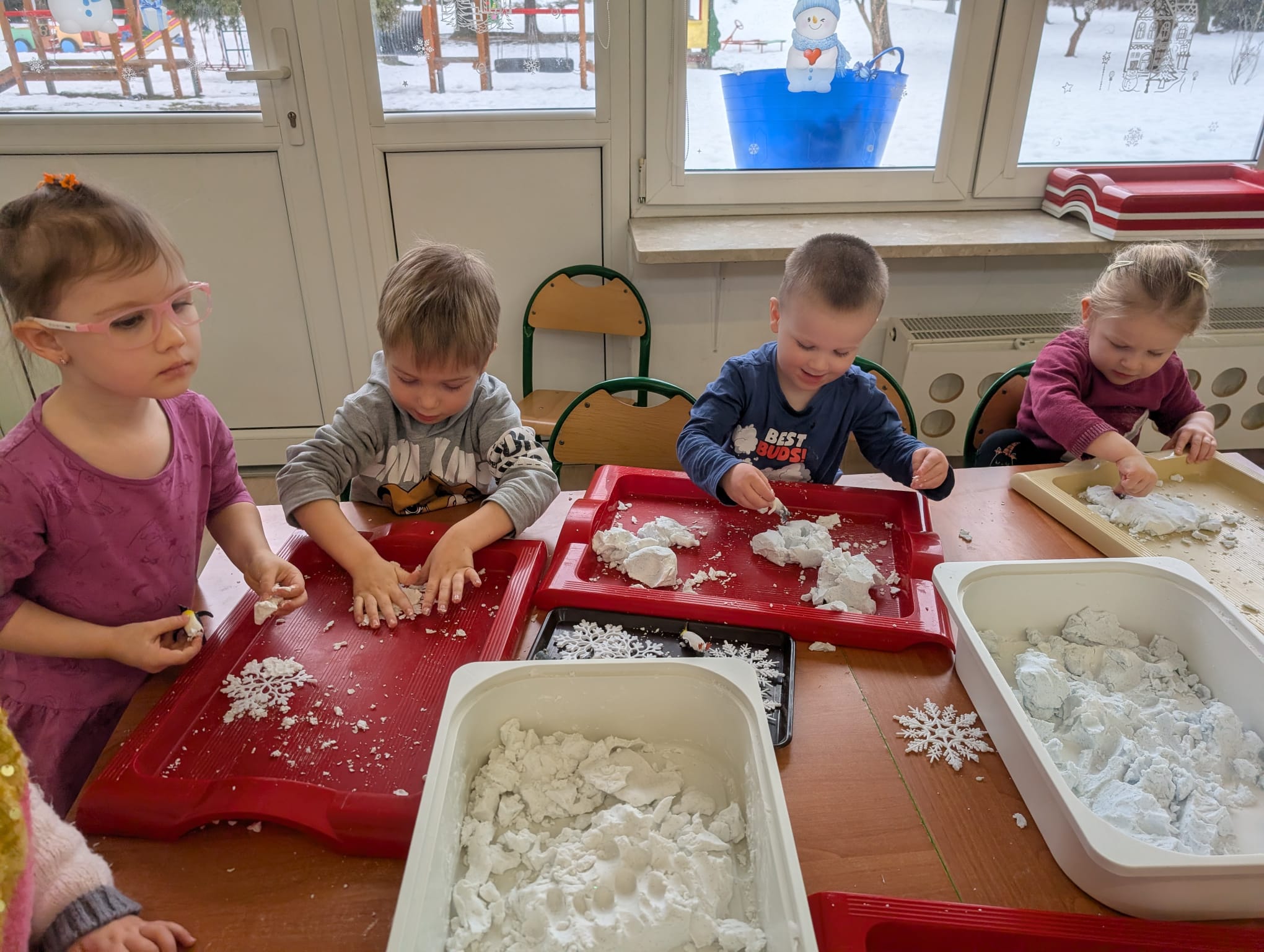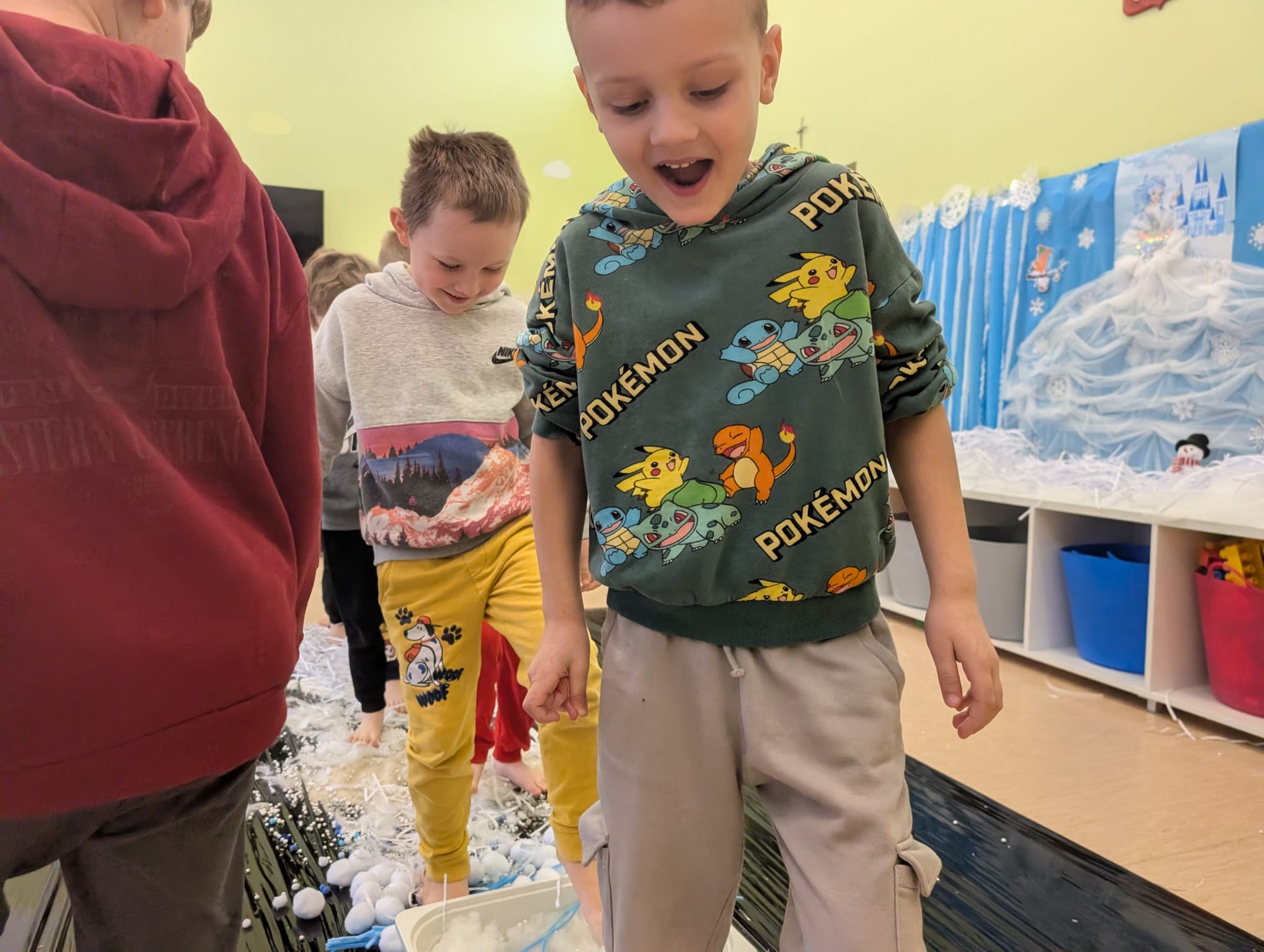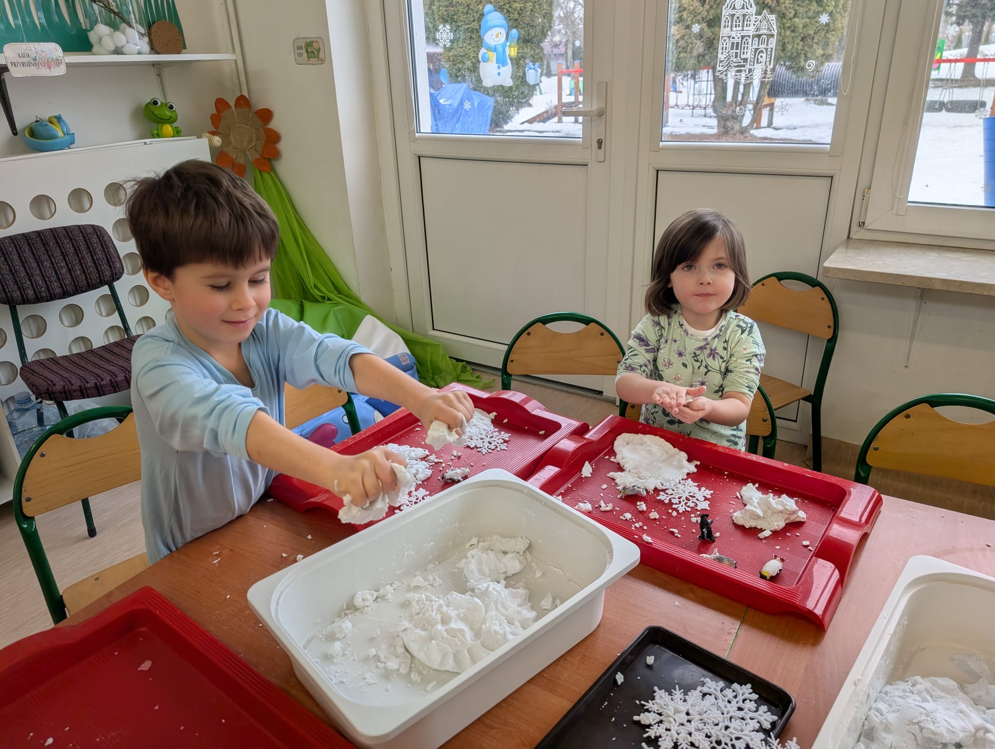 Tutaj był czas na odważne doświadczenia! Dzieci spacerowały boso przez zimową ścieżkę sensoryczną, a na jej końcu każdy przedszkolak – niczym prawdziwy śmiałek – stanął w prawdziwym śniegu przyniesionym z podwórka. Dzieci eksplorowały w własnoręcznie przygotowanej piankolinie, z której powstawały bałwany i igloo dla pingwinków, oraz badały zimową ciecz nienewtonowską w poszukiwaniu ukrytych skarbów, a także artystycznie malowały lodowe kule, obserwując ich niezwykłą teksturę.