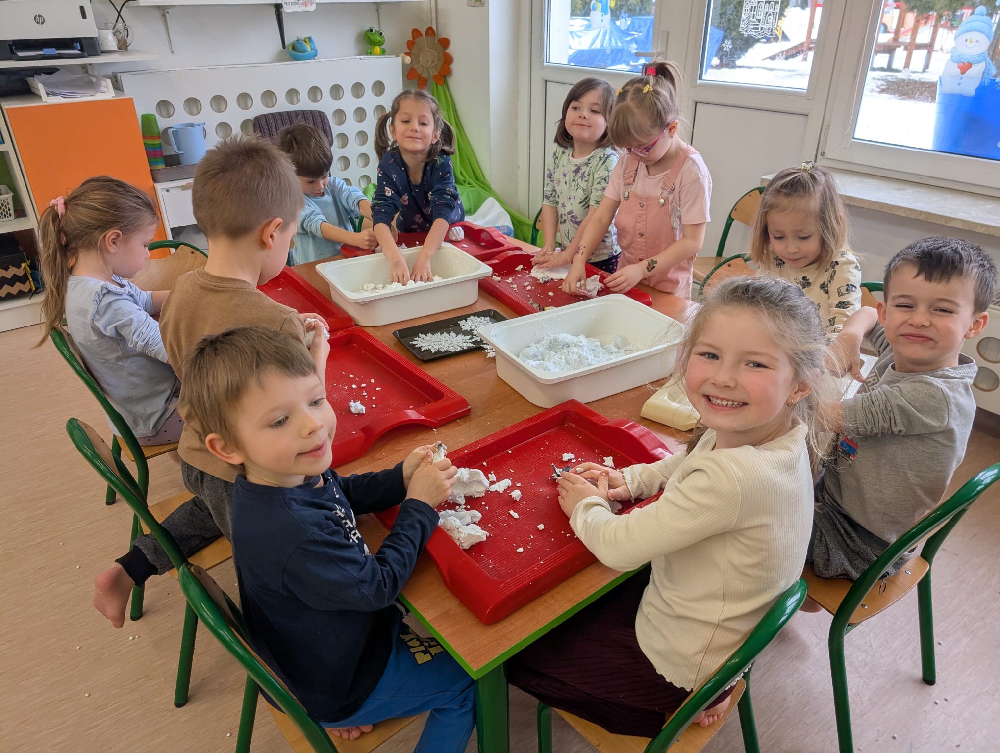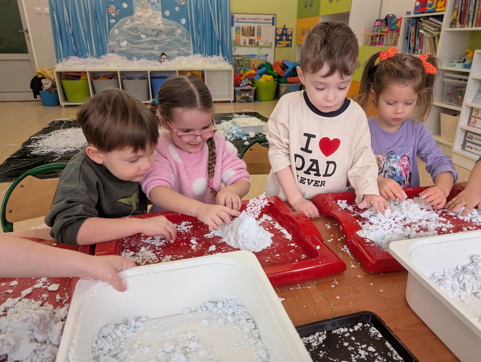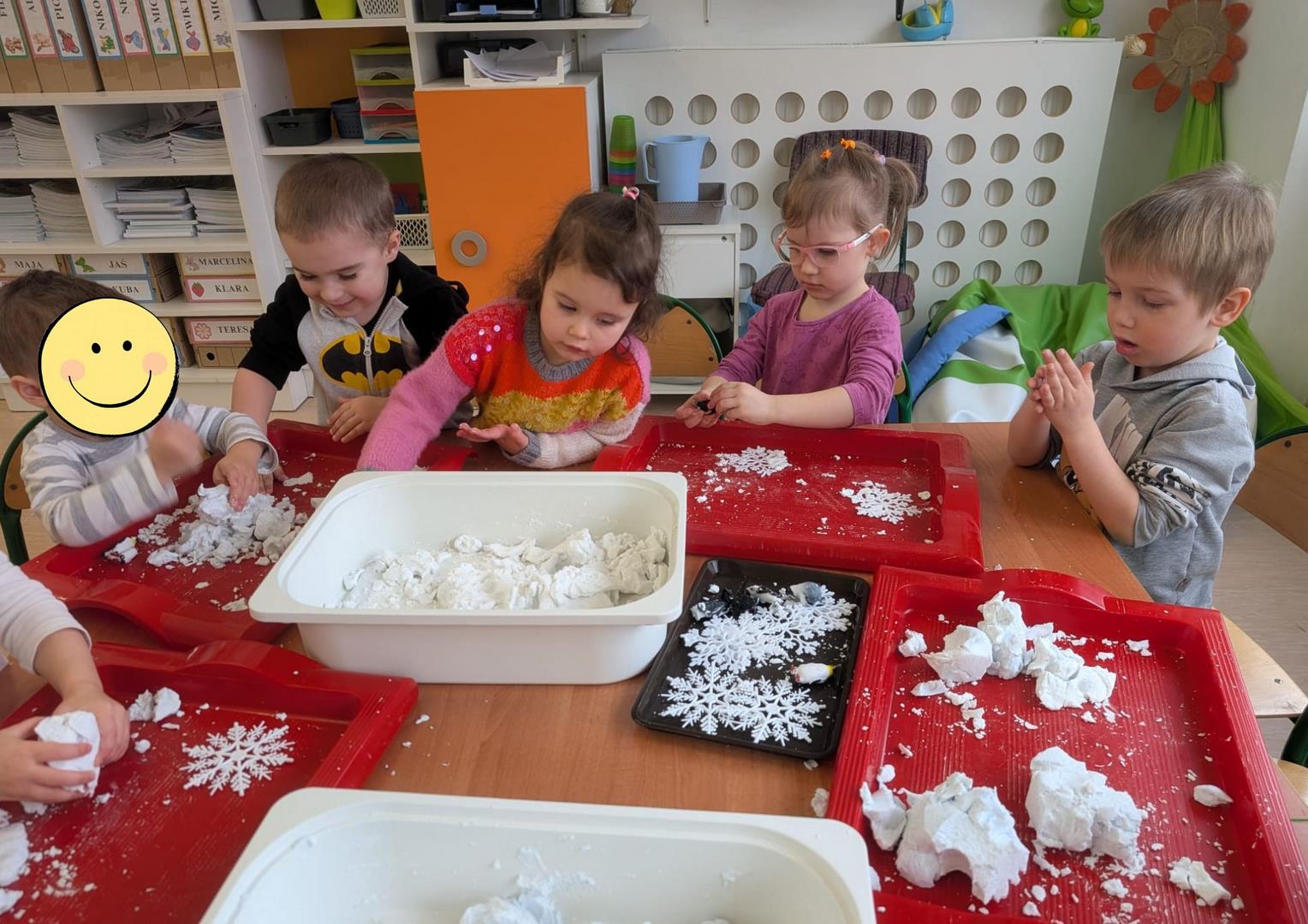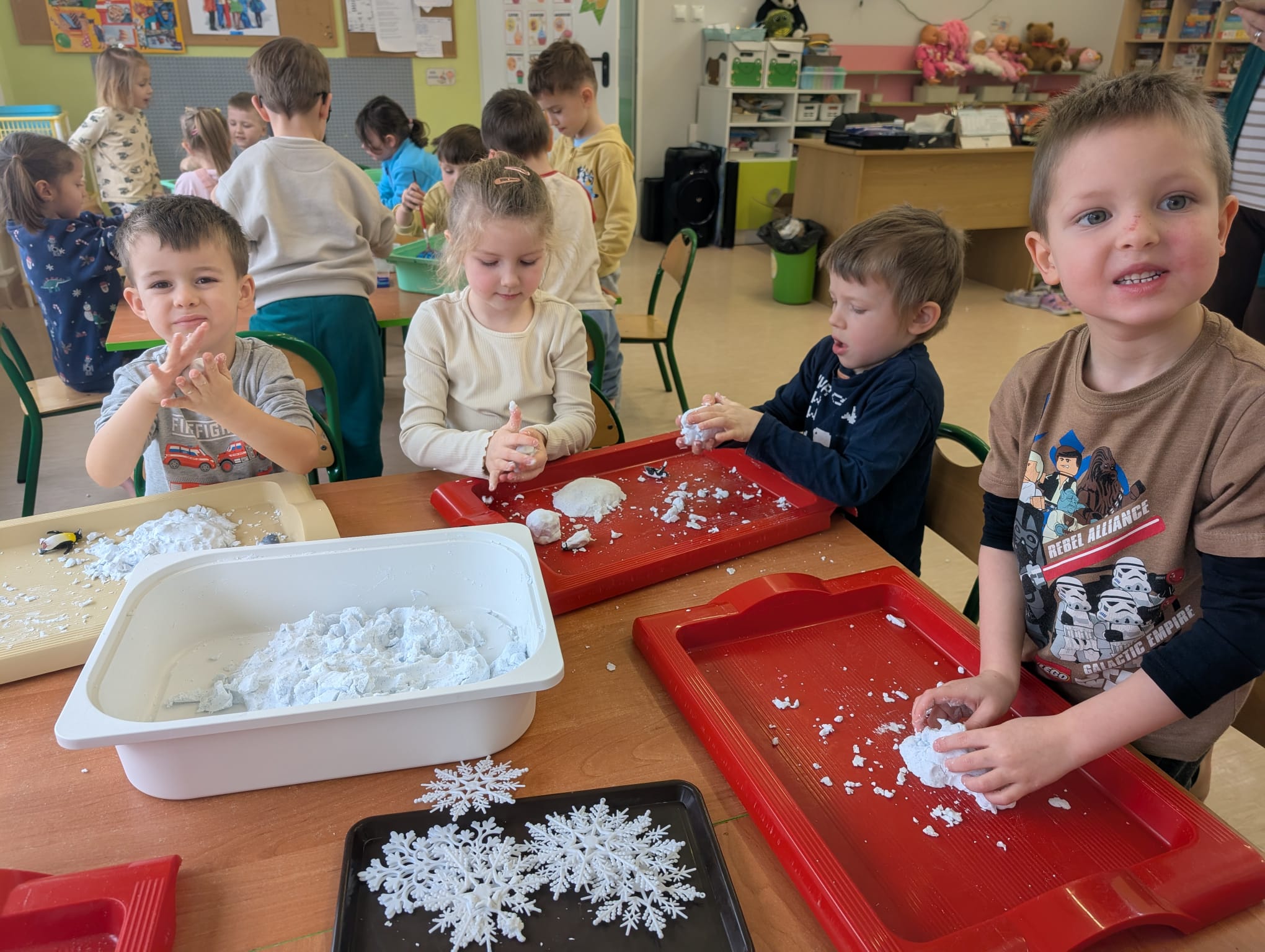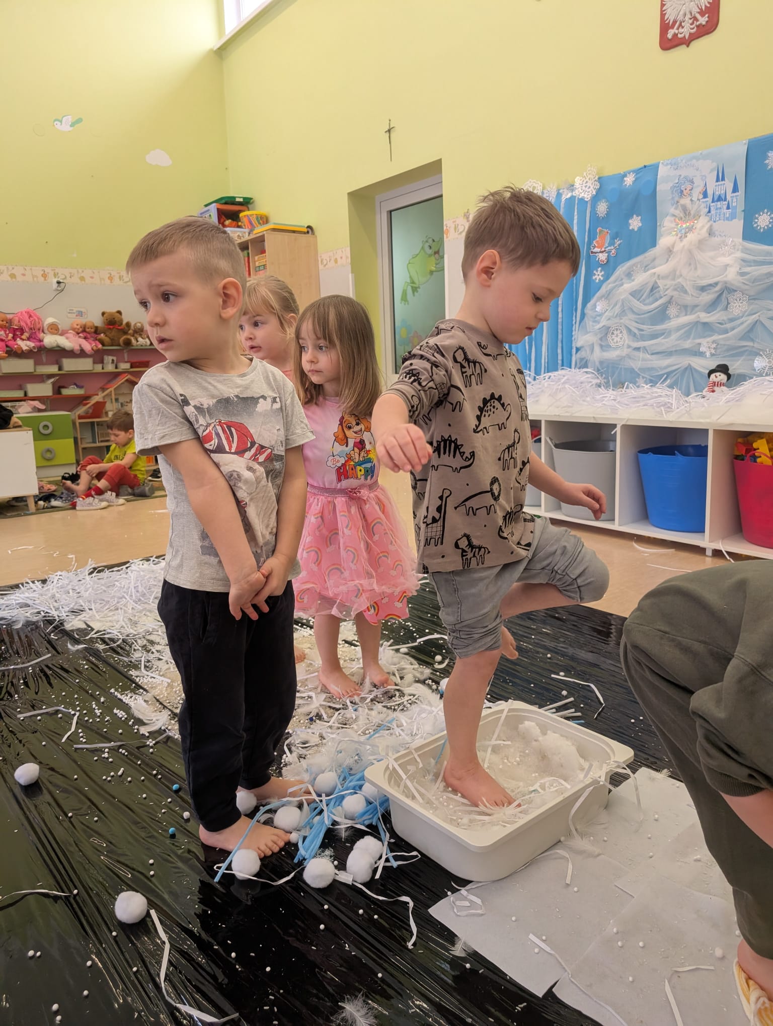 Tutaj był czas na odważne doświadczenia! Dzieci spacerowały boso przez zimową ścieżkę sensoryczną, a na jej końcu każdy przedszkolak – niczym prawdziwy śmiałek – stanął w prawdziwym śniegu przyniesionym z podwórka. Dzieci eksplorowały w własnoręcznie przygotowanej piankolinie, z której powstawały bałwany i igloo dla pingwinków, oraz badały zimową ciecz nienewtonowską w poszukiwaniu ukrytych skarbów, a także artystycznie malowały lodowe kule, obserwując ich niezwykłą teksturę.