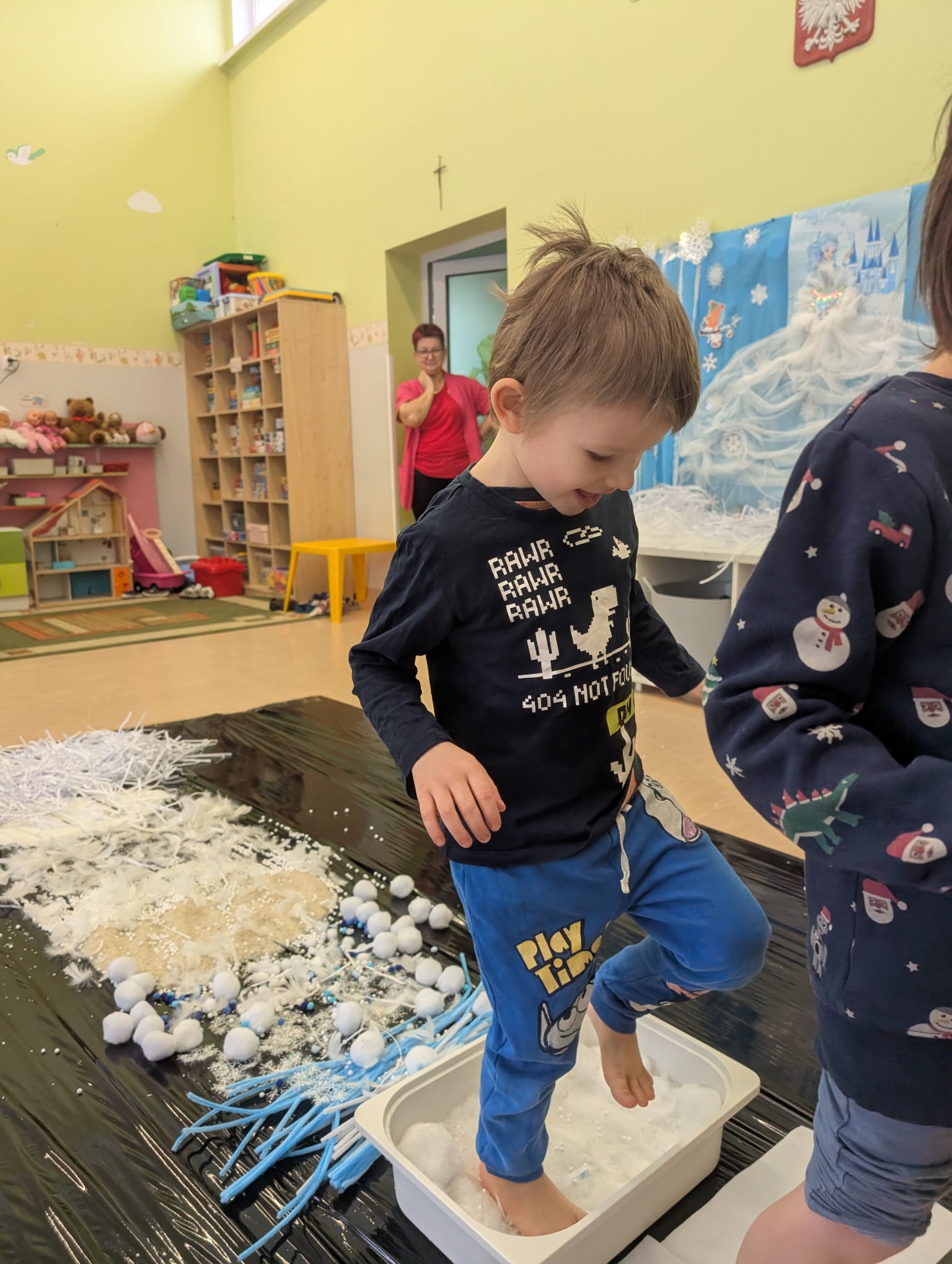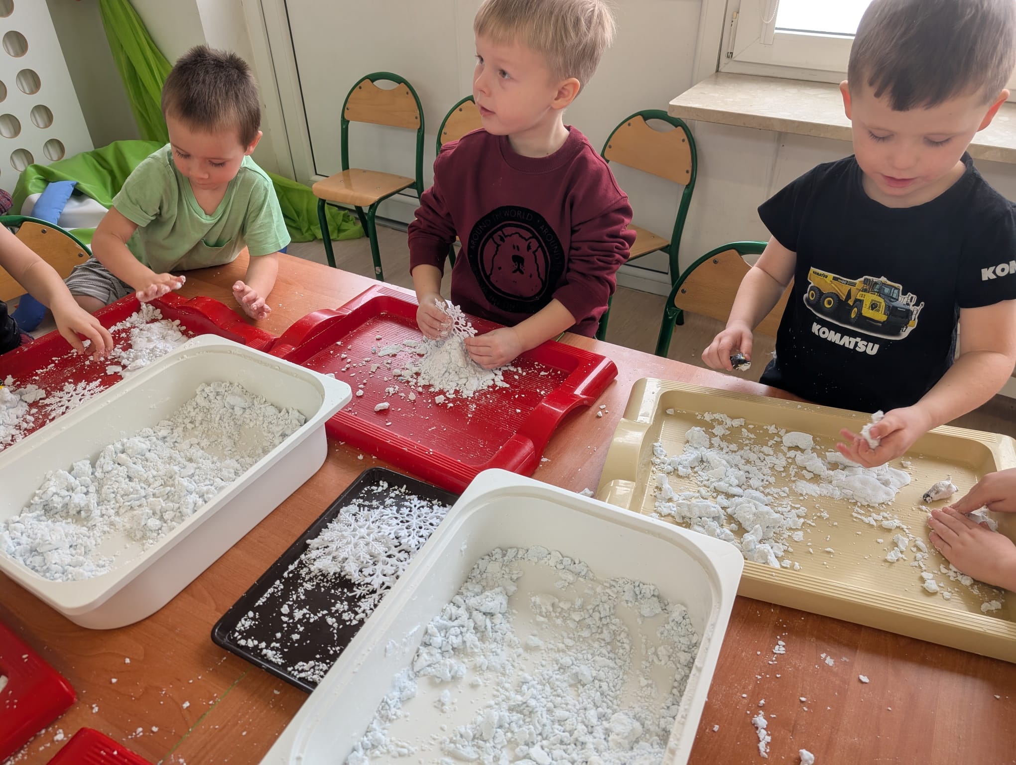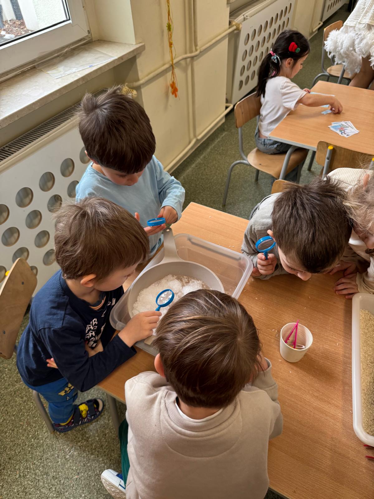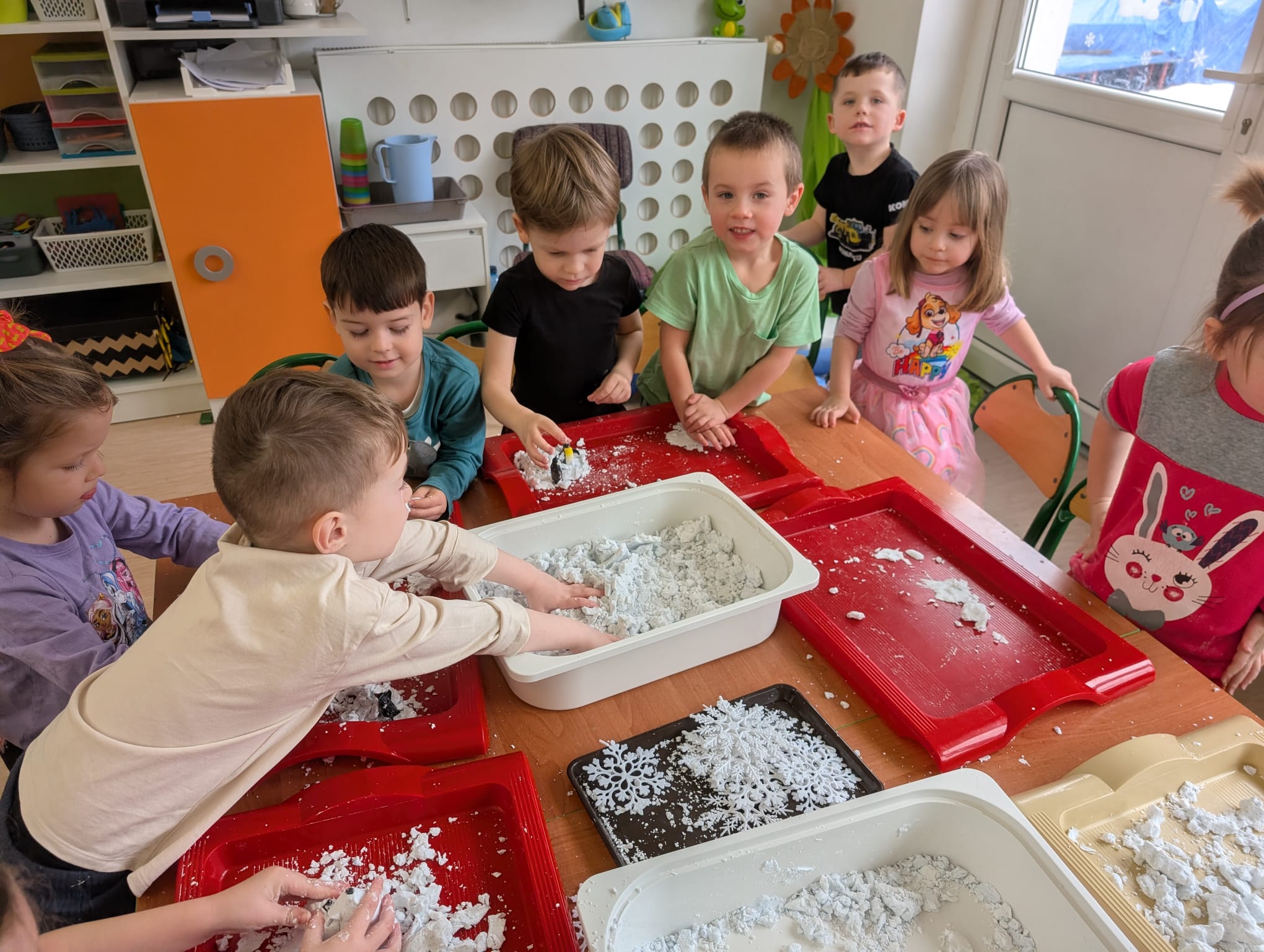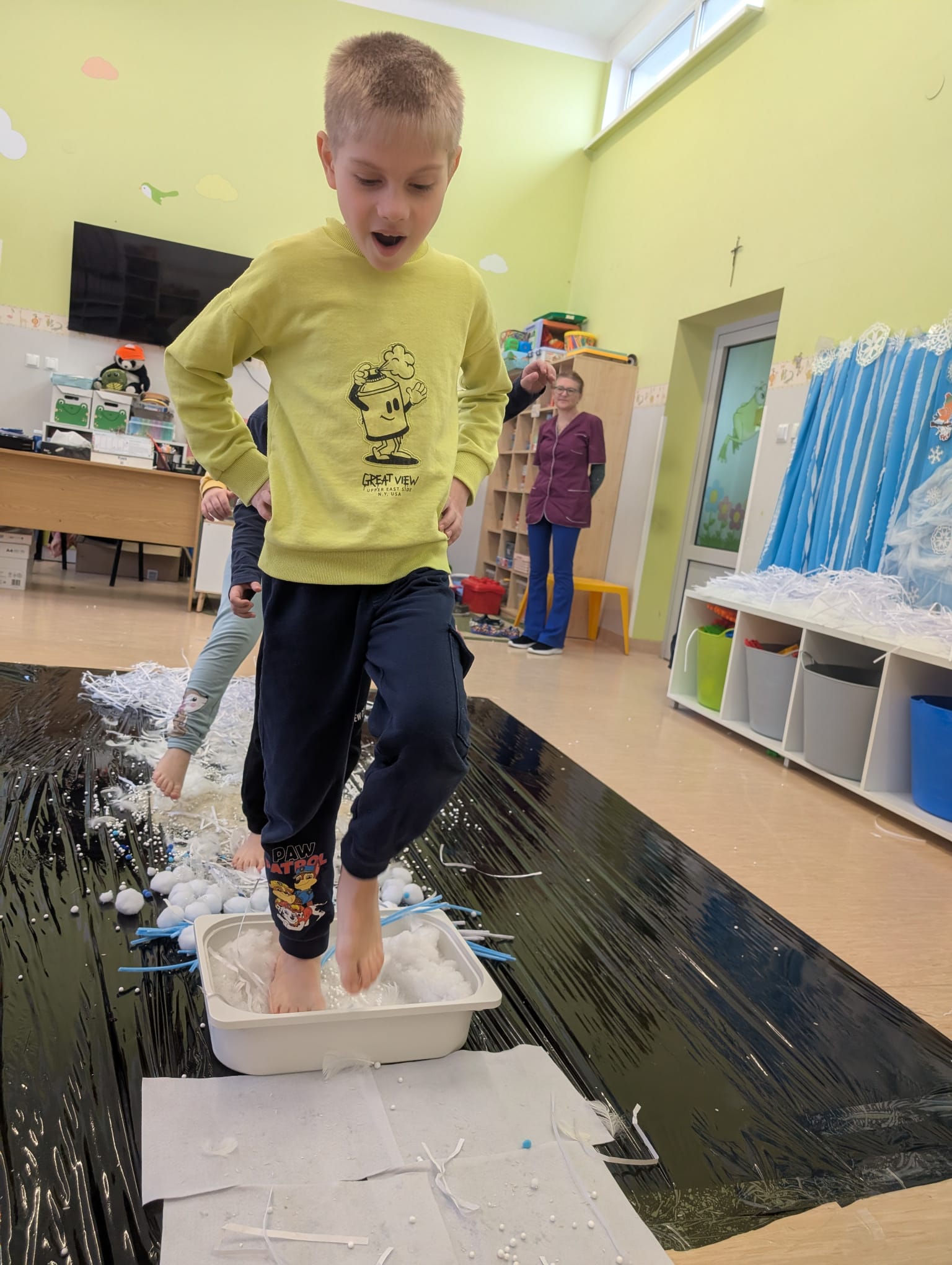 Tutaj był czas na odważne doświadczenia! Dzieci spacerowały boso przez zimową ścieżkę sensoryczną, a na jej końcu każdy przedszkolak – niczym prawdziwy śmiałek – stanął w prawdziwym śniegu przyniesionym z podwórka. Dzieci eksplorowały w własnoręcznie przygotowanej piankolinie, z której powstawały bałwany i igloo dla pingwinków, oraz badały zimową ciecz nienewtonowską w poszukiwaniu ukrytych skarbów, a także artystycznie malowały lodowe kule, obserwując ich niezwykłą teksturę.