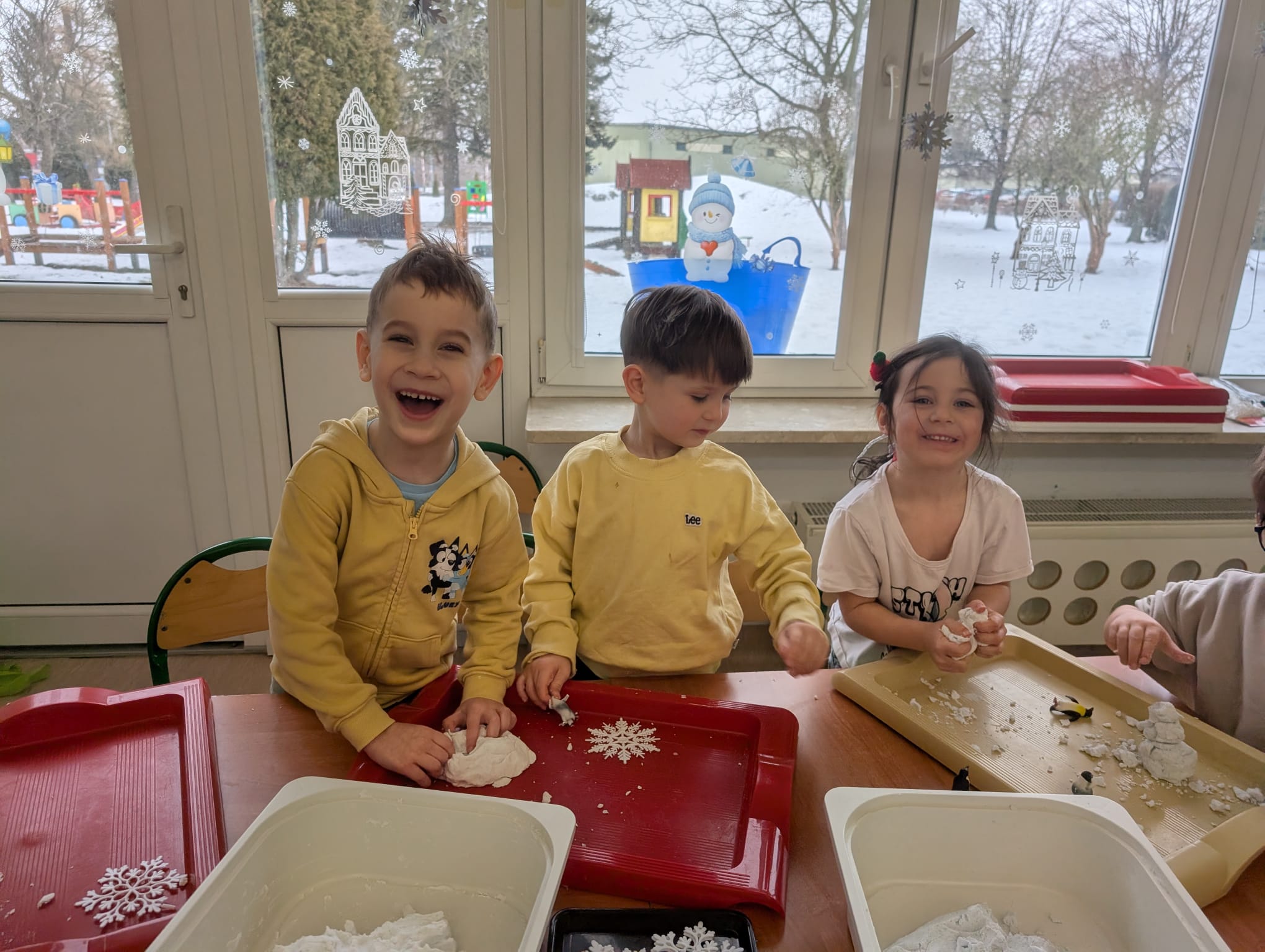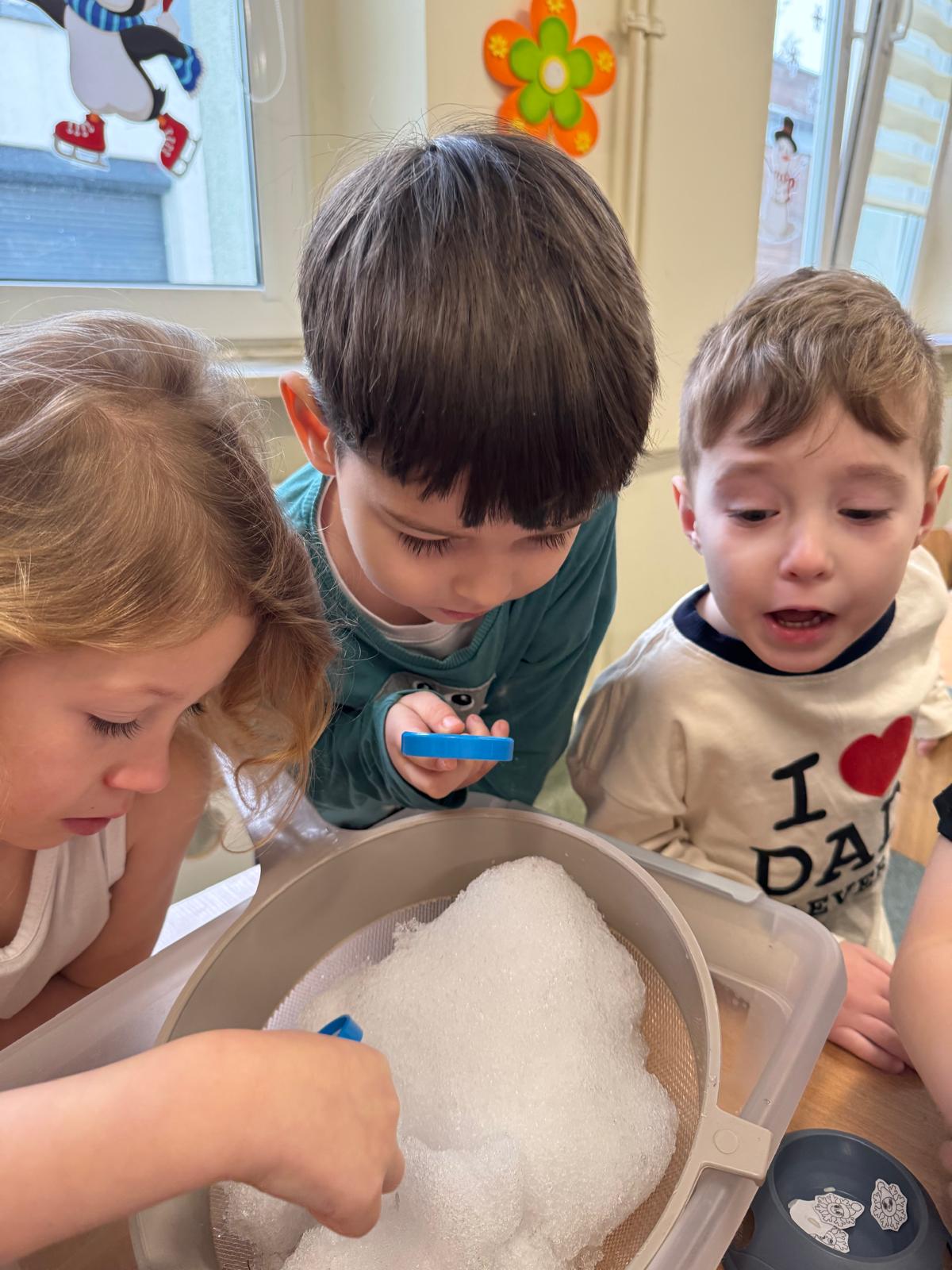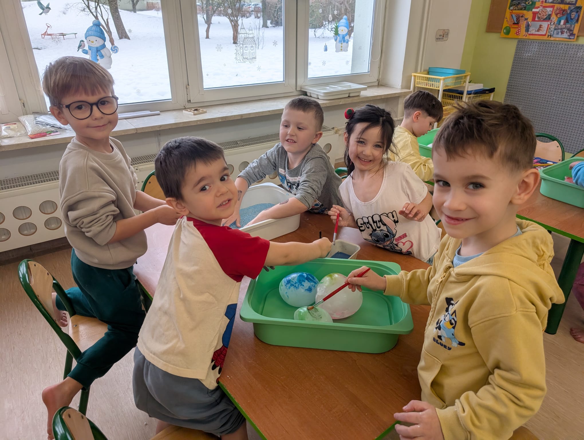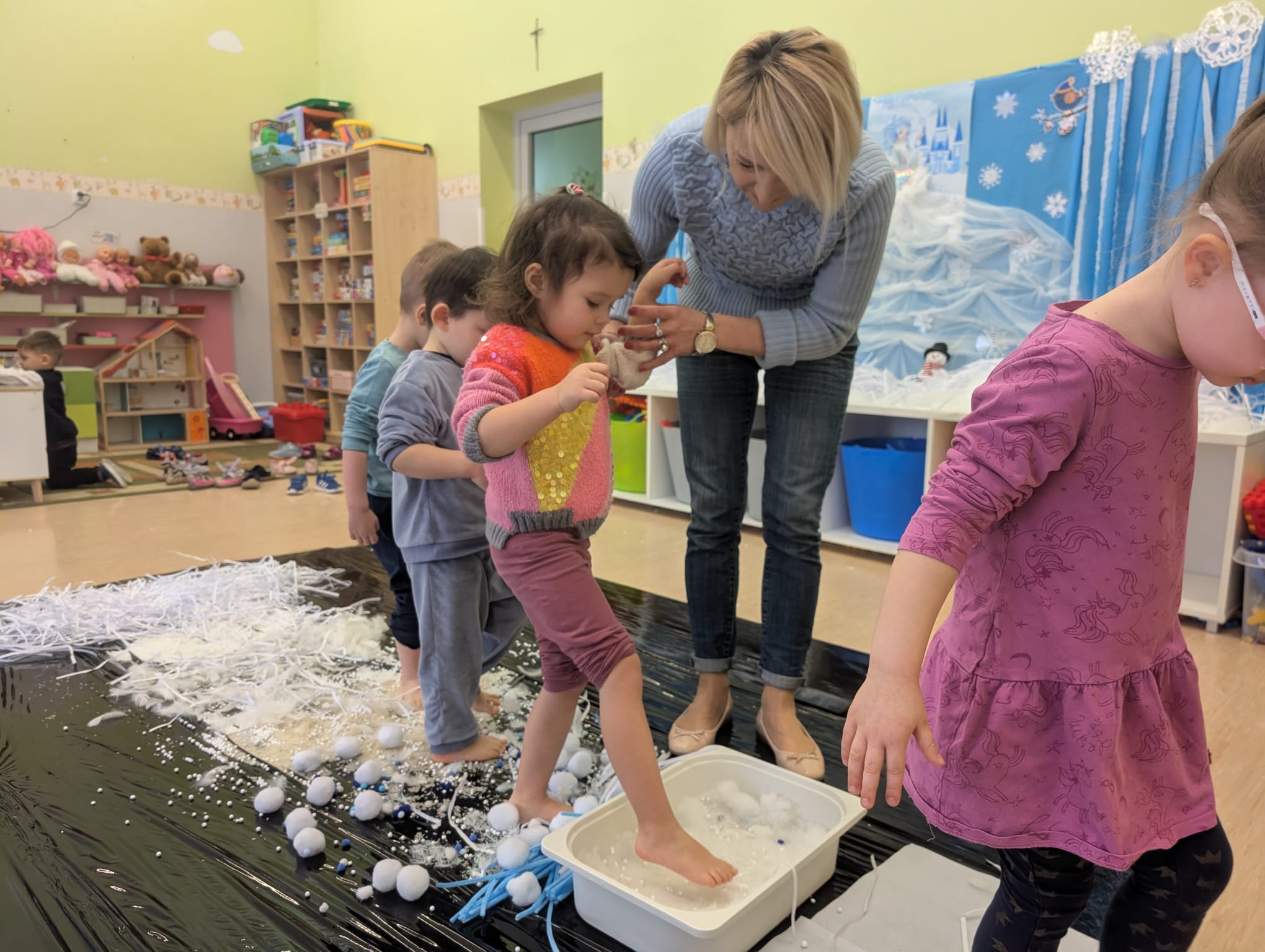 Tutaj był czas na odważne doświadczenia! Dzieci spacerowały boso przez zimową ścieżkę sensoryczną, a na jej końcu każdy przedszkolak – niczym prawdziwy śmiałek – stanął w prawdziwym śniegu przyniesionym z podwórka. Dzieci eksplorowały w własnoręcznie przygotowanej piankolinie, z której powstawały bałwany i igloo dla pingwinków, oraz badały zimową ciecz nienewtonowską w poszukiwaniu ukrytych skarbów, a także artystycznie malowały lodowe kule, obserwując ich niezwykłą teksturę.