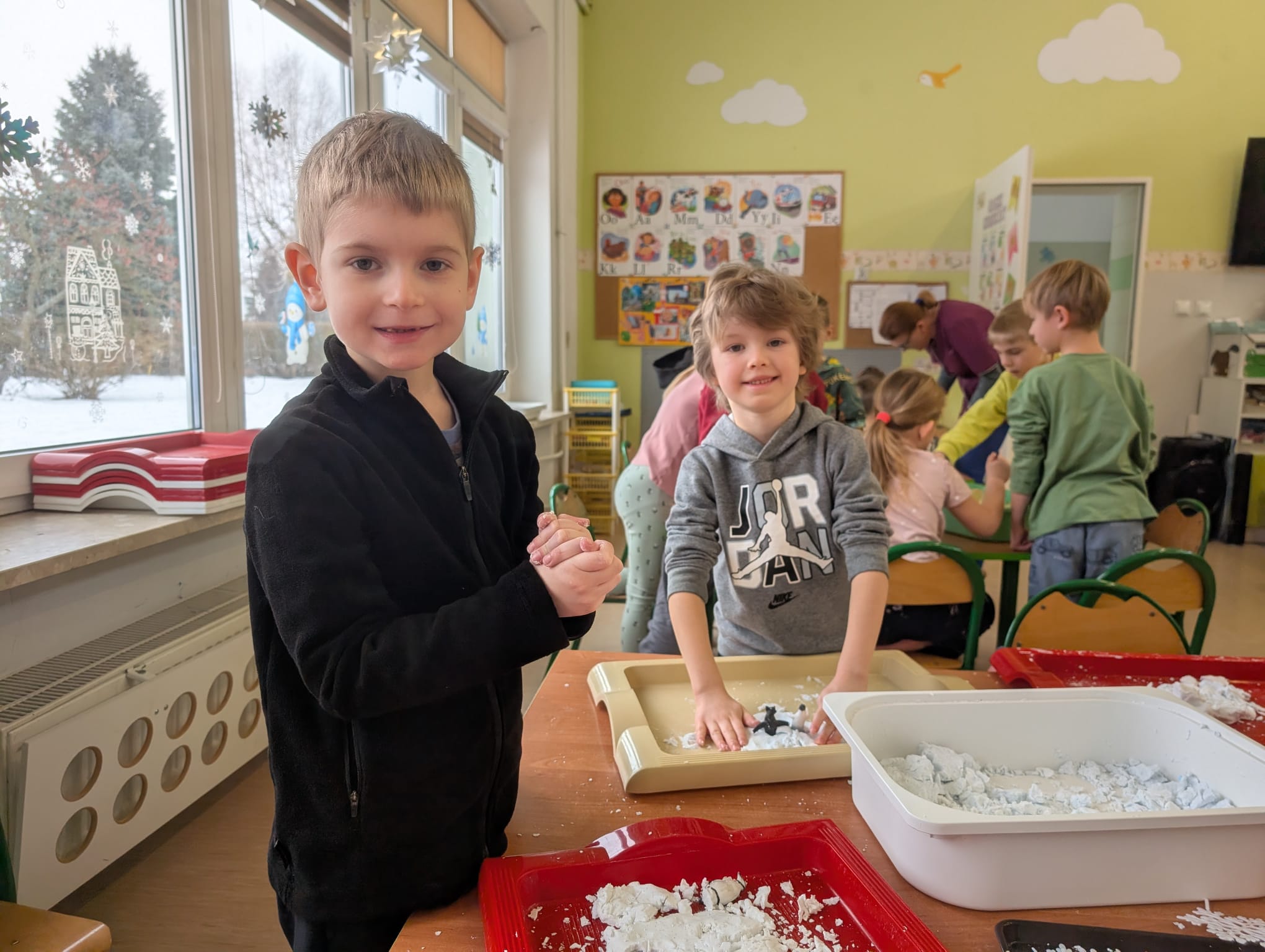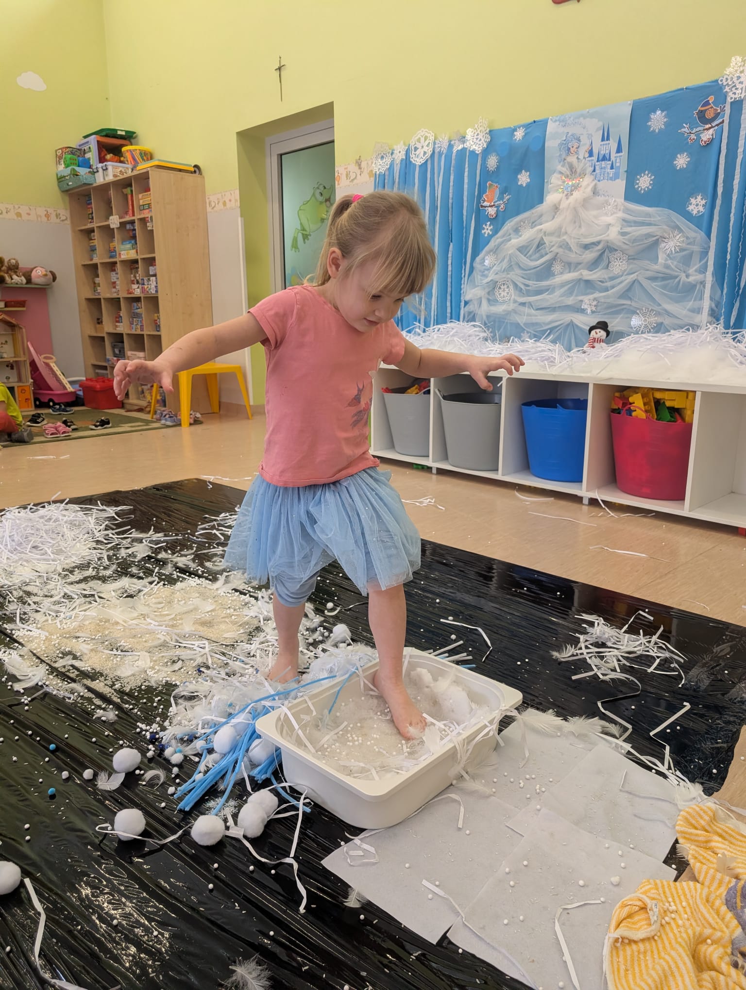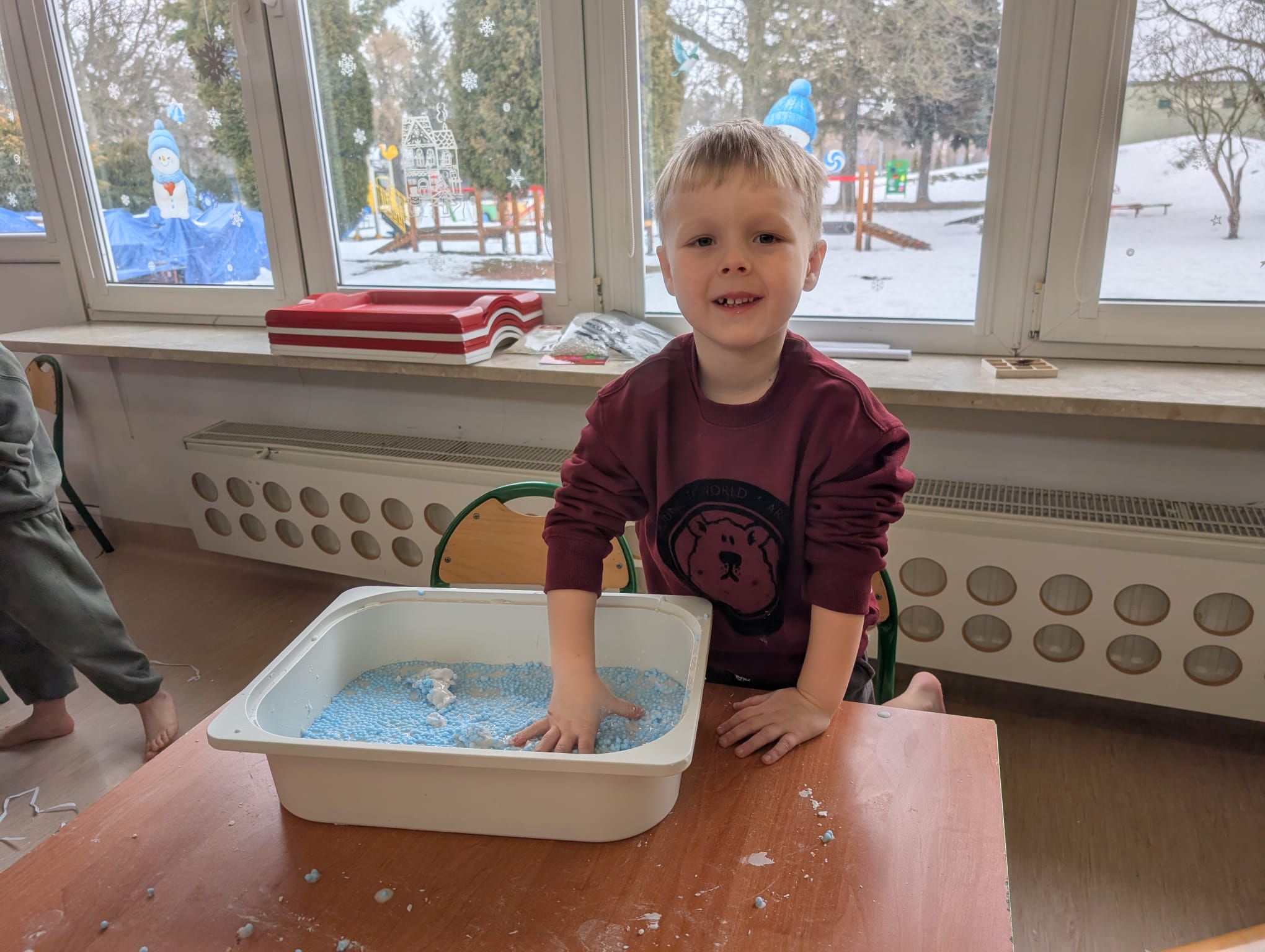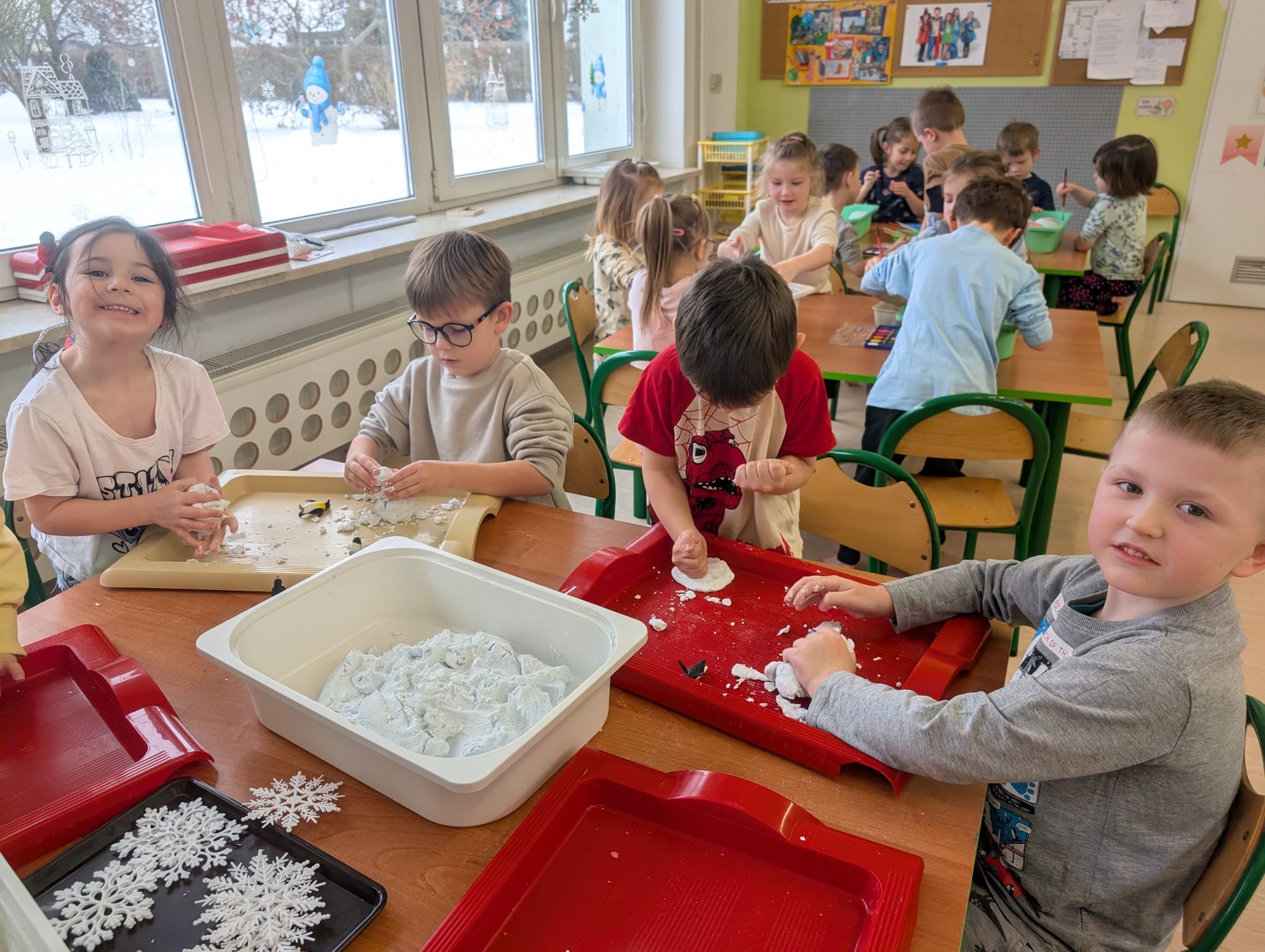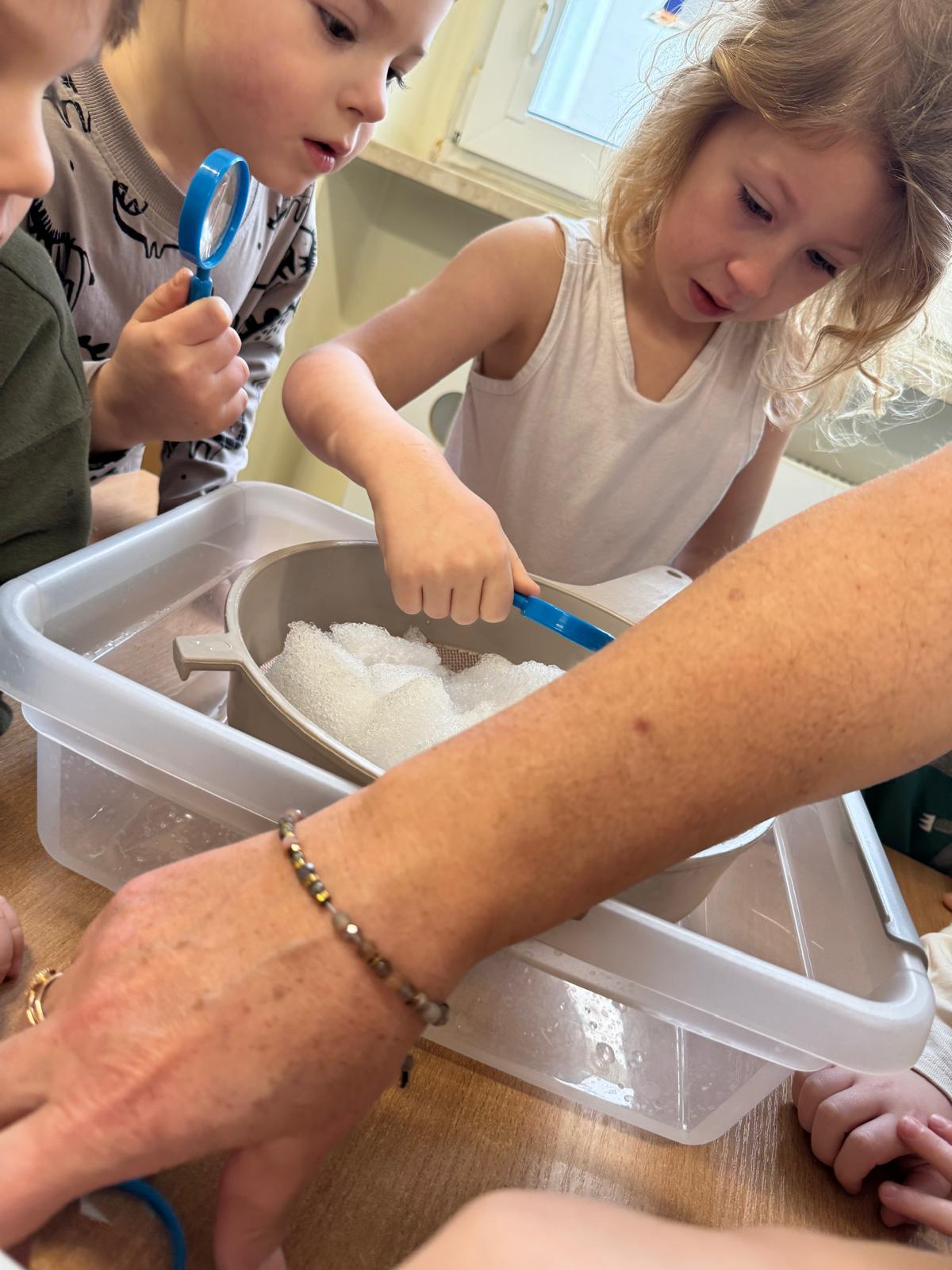 Tutaj był czas na odważne doświadczenia! Dzieci spacerowały boso przez zimową ścieżkę sensoryczną, a na jej końcu każdy przedszkolak – niczym prawdziwy śmiałek – stanął w prawdziwym śniegu przyniesionym z podwórka. Dzieci eksplorowały w własnoręcznie przygotowanej piankolinie, z której powstawały bałwany i igloo dla pingwinków, oraz badały zimową ciecz nienewtonowską w poszukiwaniu ukrytych skarbów, a także artystycznie malowały lodowe kule, obserwując ich niezwykłą teksturę.