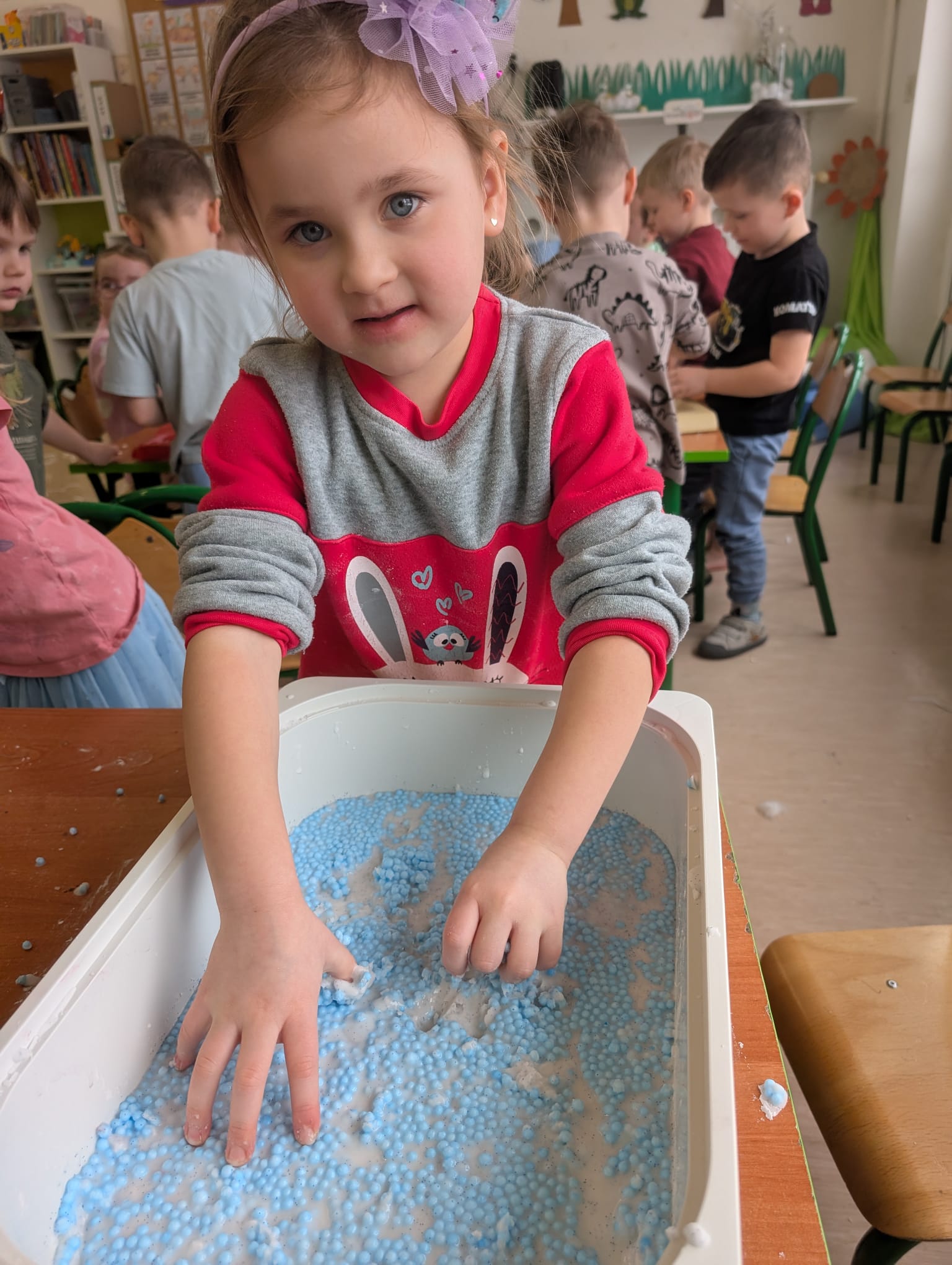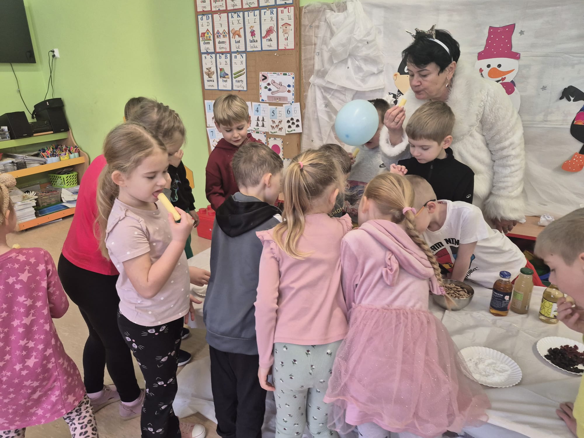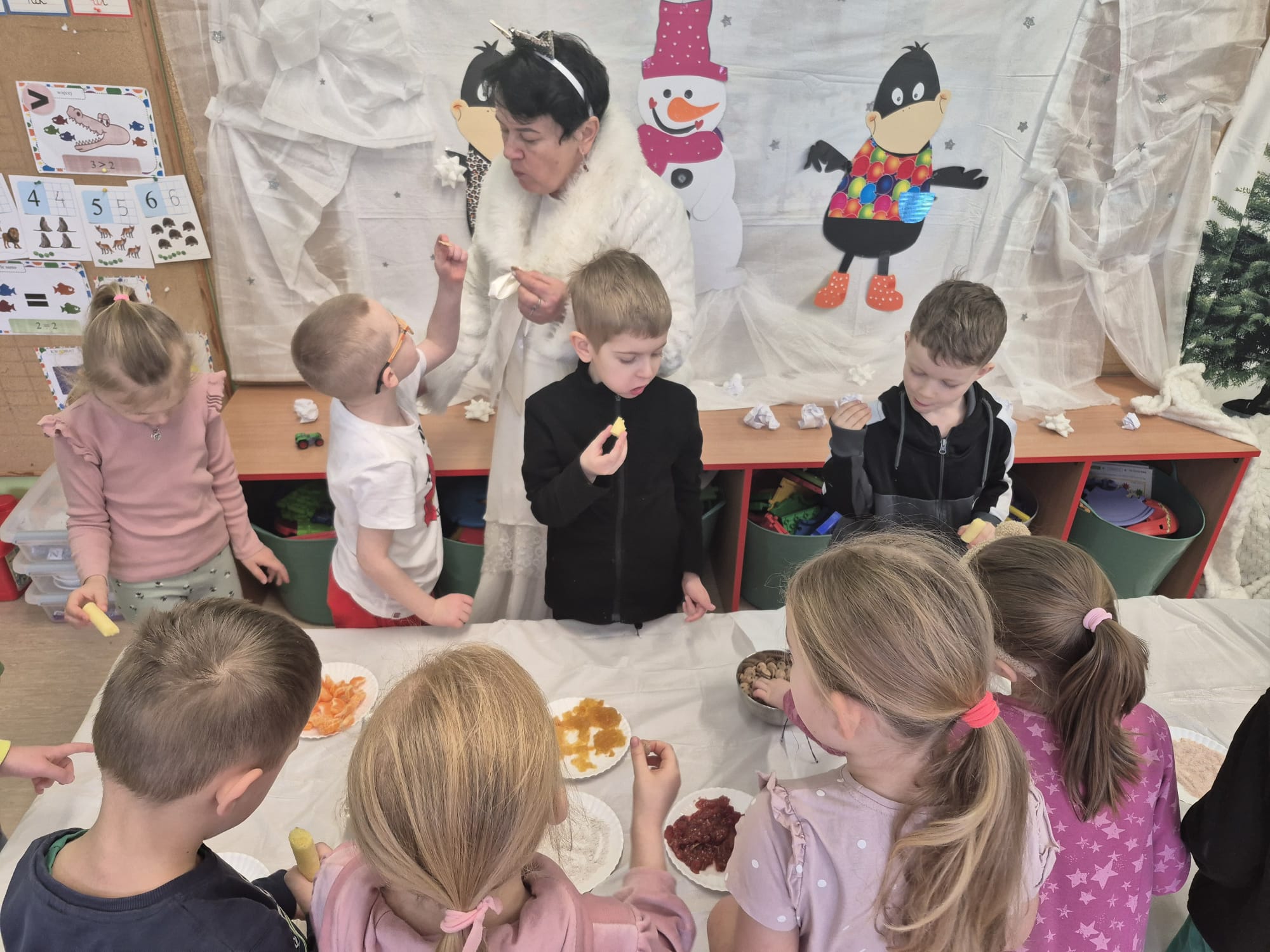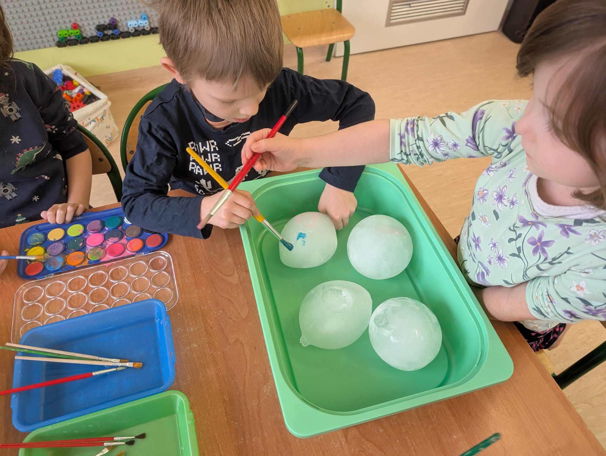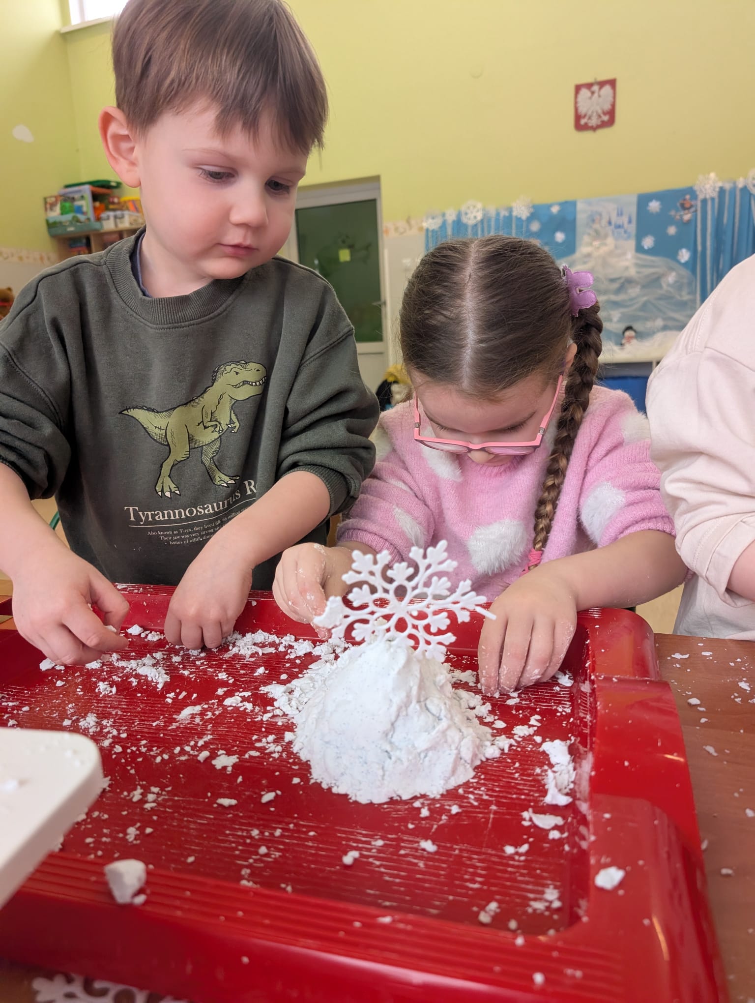 Tutaj był czas na odważne doświadczenia! Dzieci spacerowały boso przez zimową ścieżkę sensoryczną, a na jej końcu każdy przedszkolak – niczym prawdziwy śmiałek – stanął w prawdziwym śniegu przyniesionym z podwórka. Dzieci eksplorowały w własnoręcznie przygotowanej piankolinie, z której powstawały bałwany i igloo dla pingwinków, oraz badały zimową ciecz nienewtonowską w poszukiwaniu ukrytych skarbów, a także artystycznie malowały lodowe kule, obserwując ich niezwykłą teksturę.