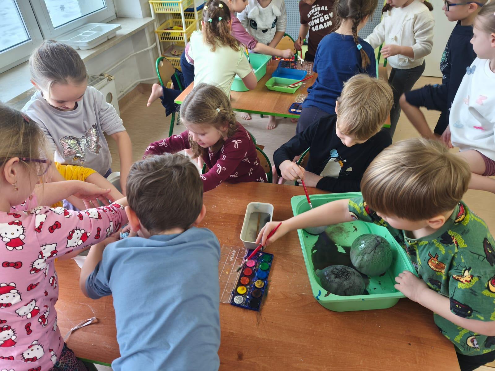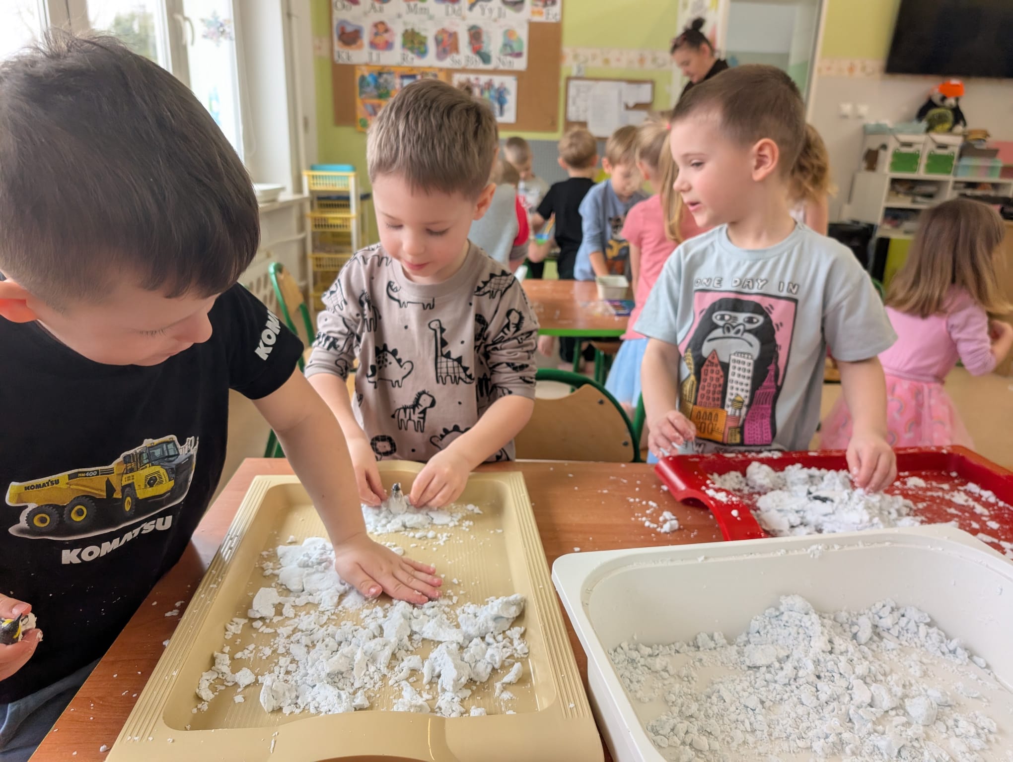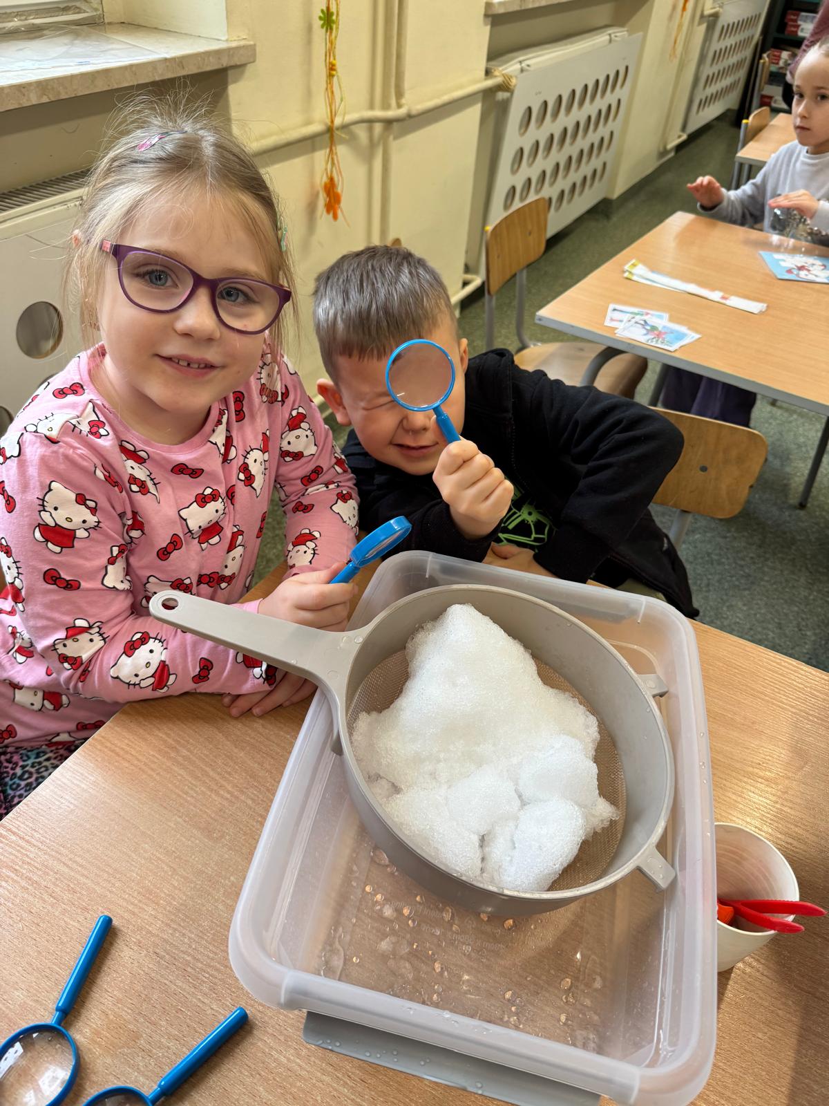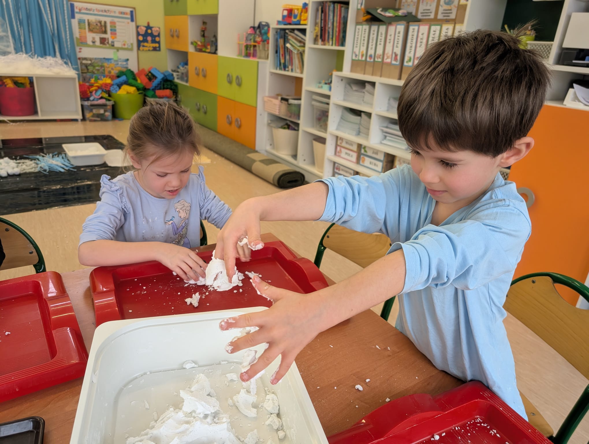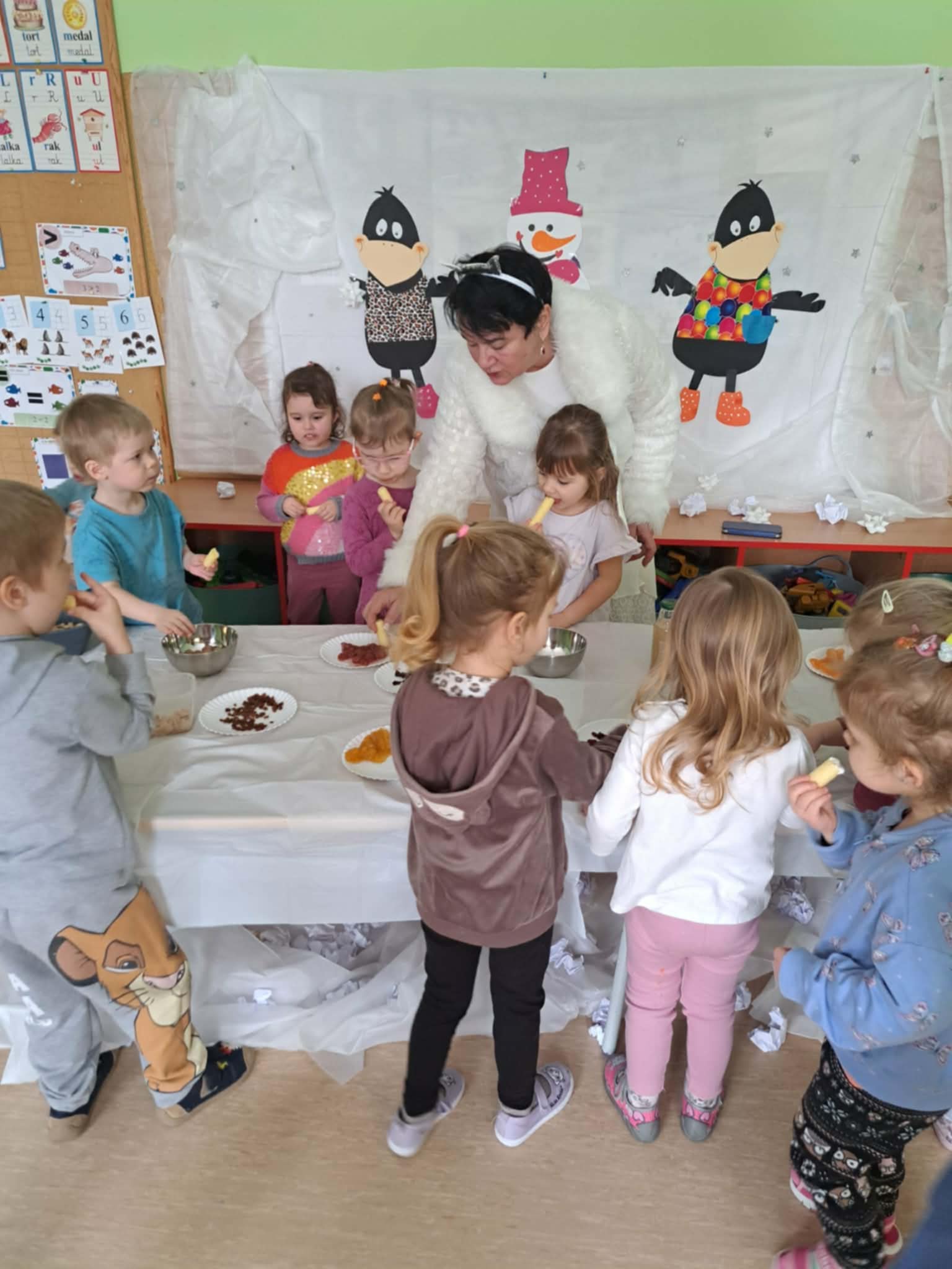 Tutaj był czas na odważne doświadczenia! Dzieci spacerowały boso przez zimową ścieżkę sensoryczną, a na jej końcu każdy przedszkolak – niczym prawdziwy śmiałek – stanął w prawdziwym śniegu przyniesionym z podwórka. Dzieci eksplorowały w własnoręcznie przygotowanej piankolinie, z której powstawały bałwany i igloo dla pingwinków, oraz badały zimową ciecz nienewtonowską w poszukiwaniu ukrytych skarbów, a także artystycznie malowały lodowe kule, obserwując ich niezwykłą teksturę.