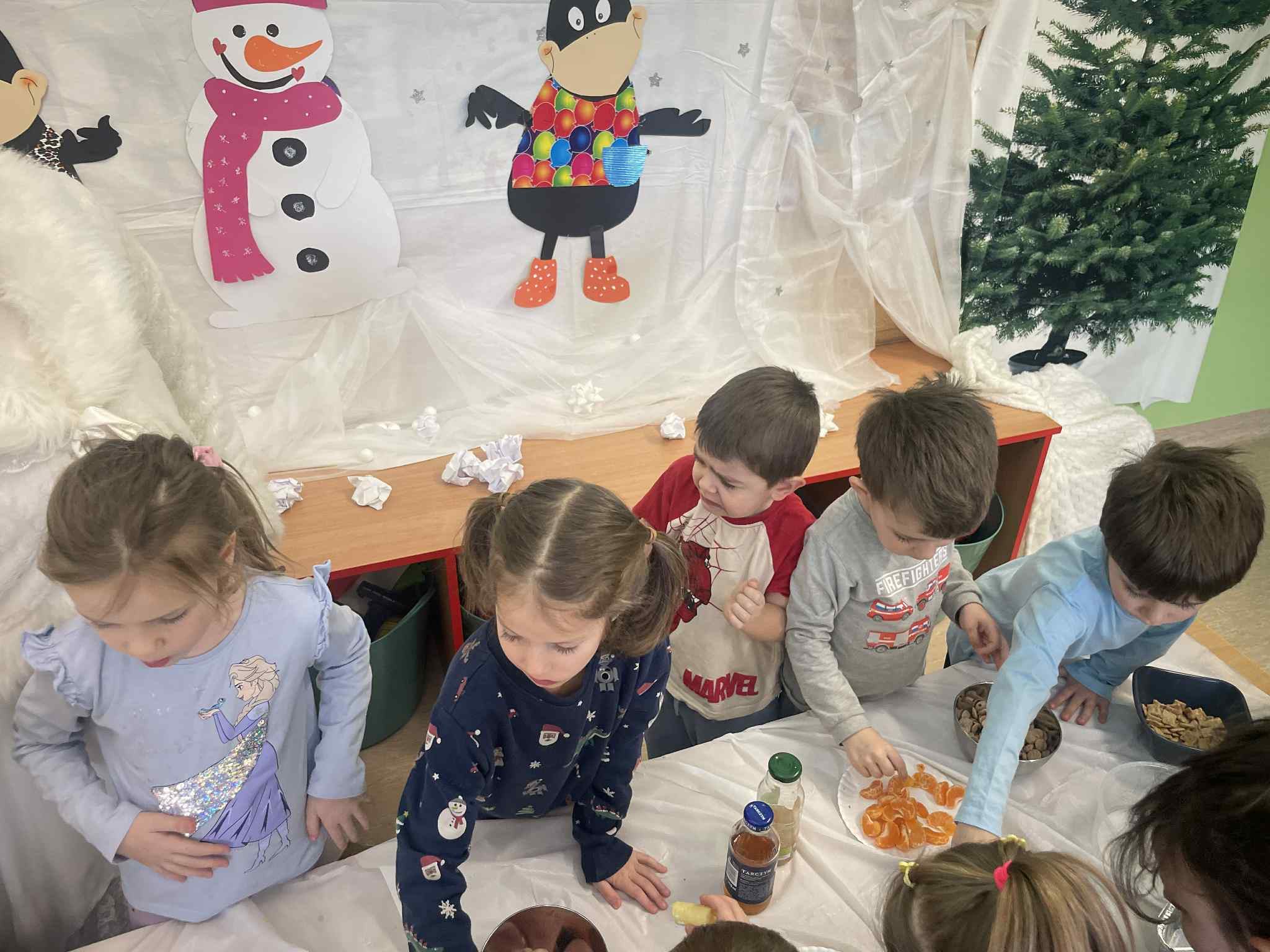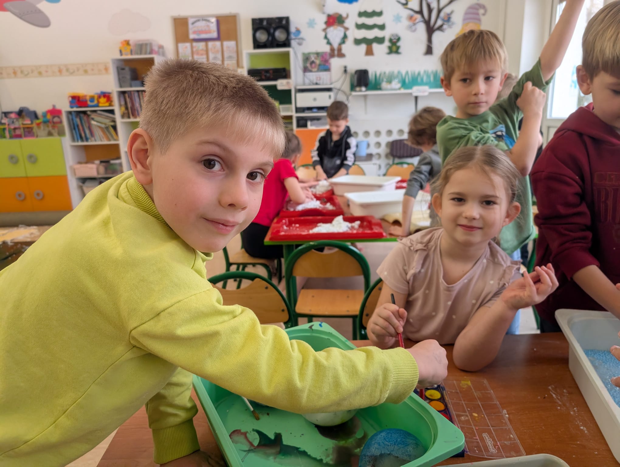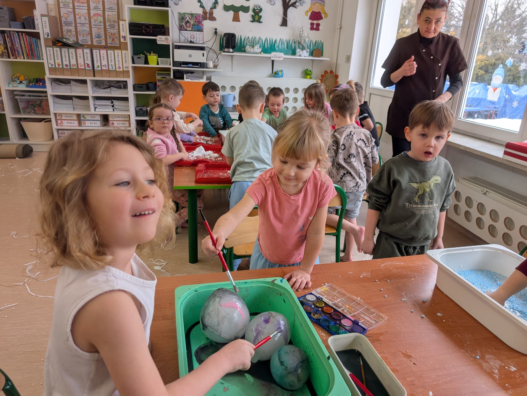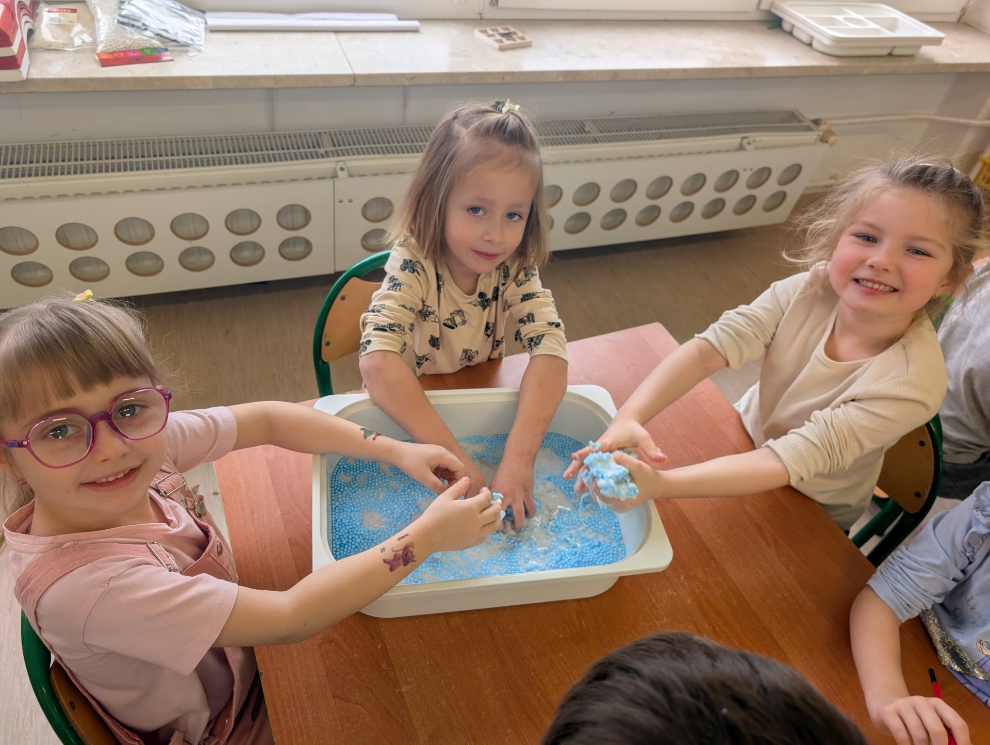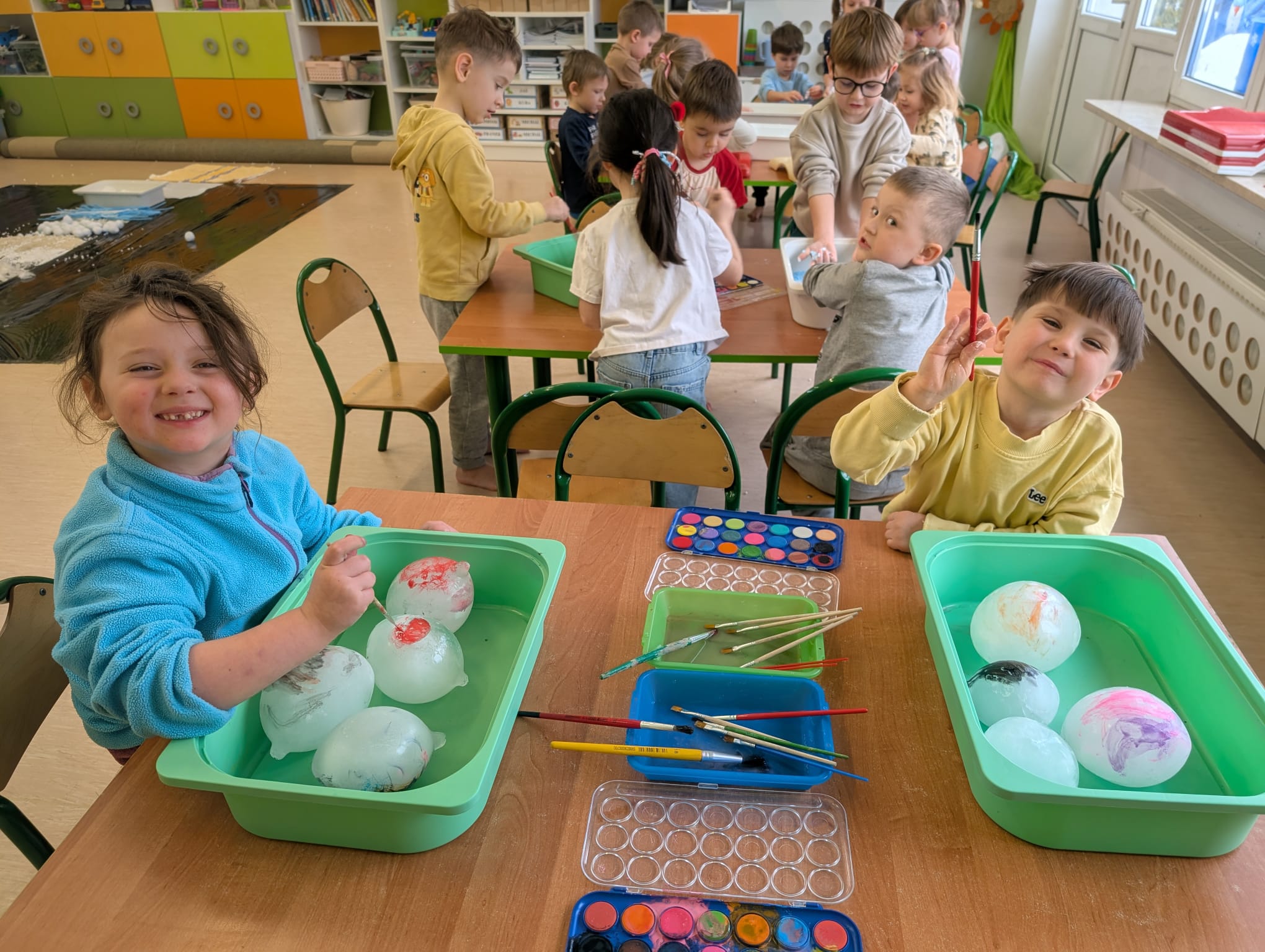 Tutaj był czas na odważne doświadczenia! Dzieci spacerowały boso przez zimową ścieżkę sensoryczną, a na jej końcu każdy przedszkolak – niczym prawdziwy śmiałek – stanął w prawdziwym śniegu przyniesionym z podwórka. Dzieci eksplorowały w własnoręcznie przygotowanej piankolinie, z której powstawały bałwany i igloo dla pingwinków, oraz badały zimową ciecz nienewtonowską w poszukiwaniu ukrytych skarbów, a także artystycznie malowały lodowe kule, obserwując ich niezwykłą teksturę.