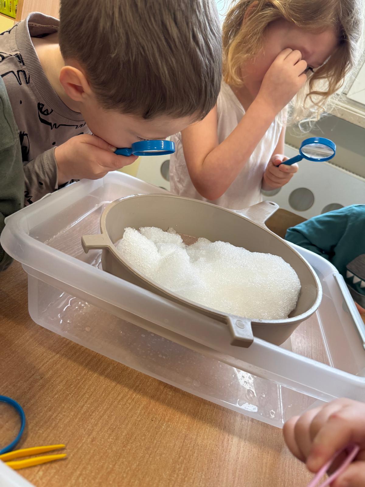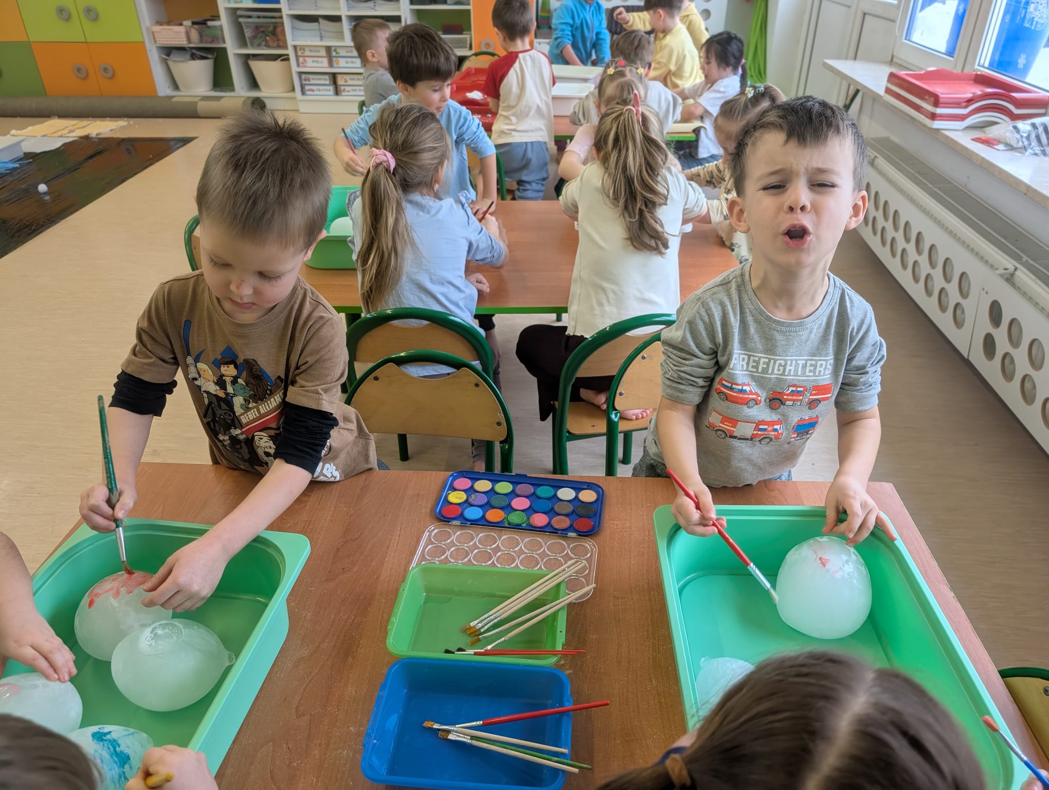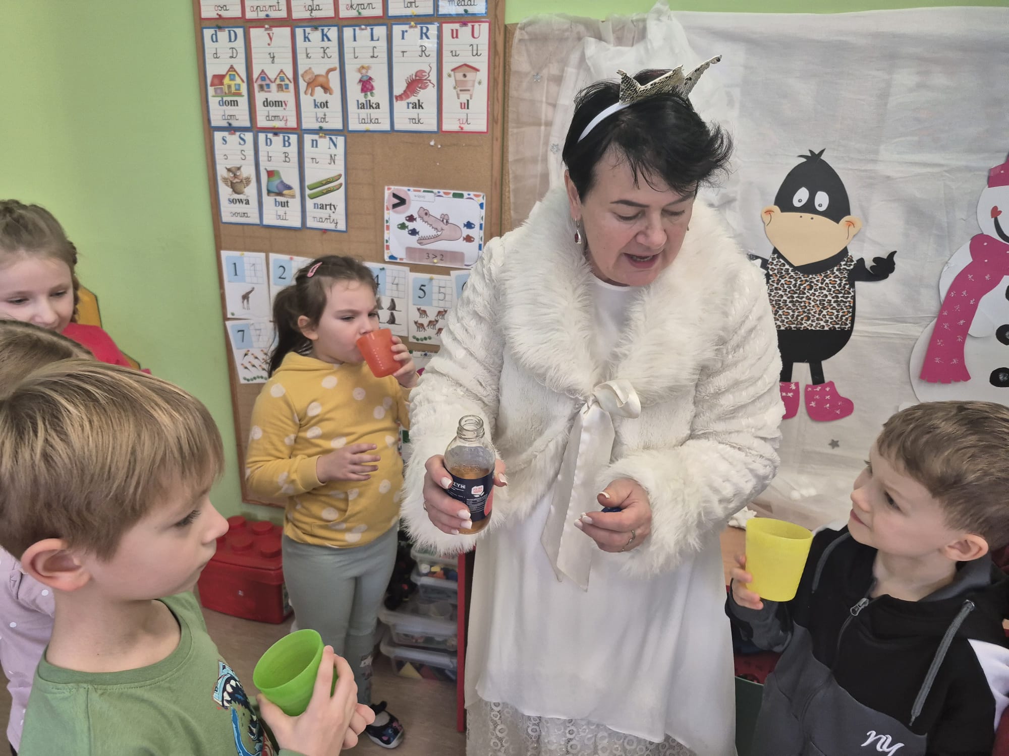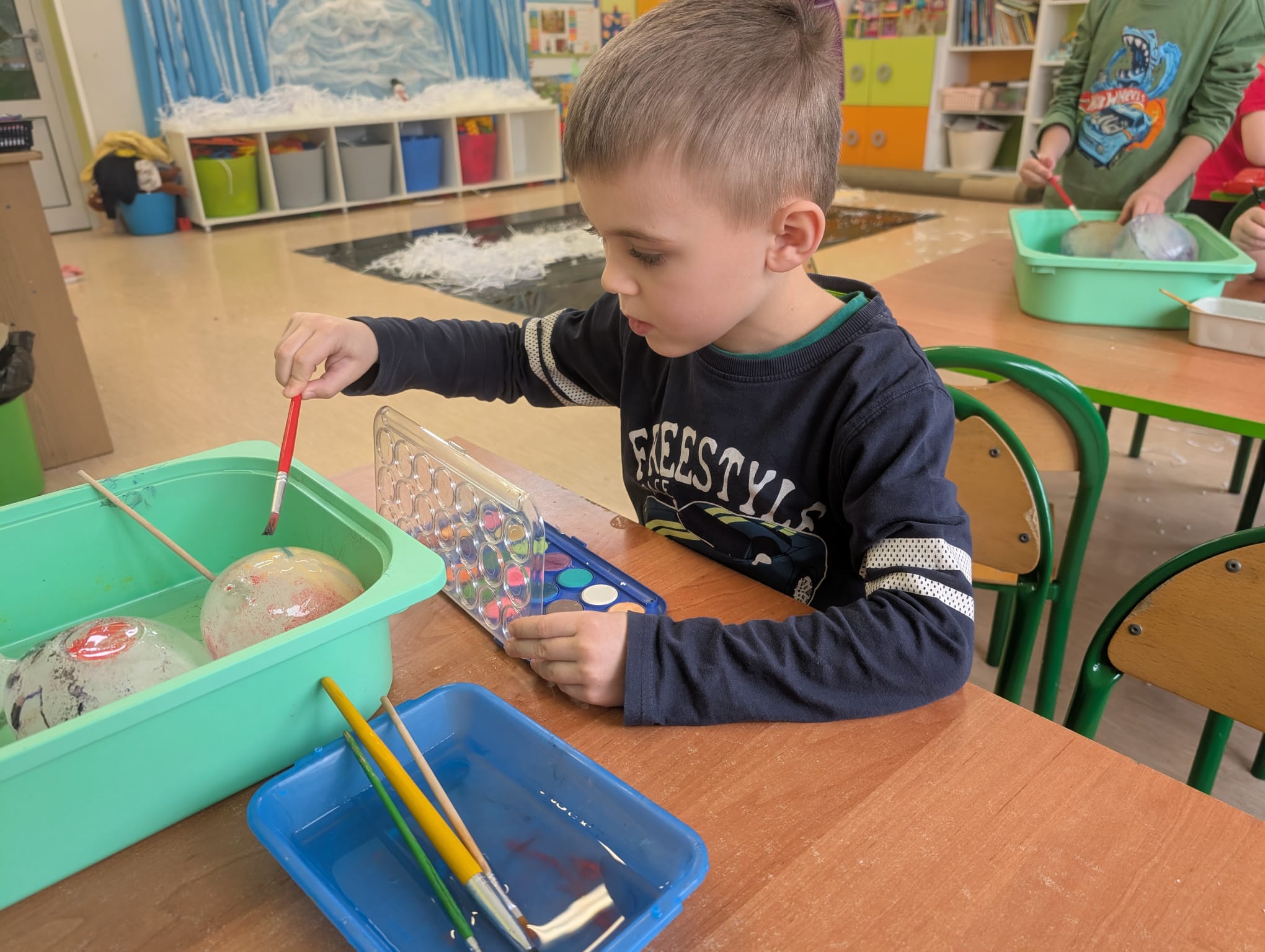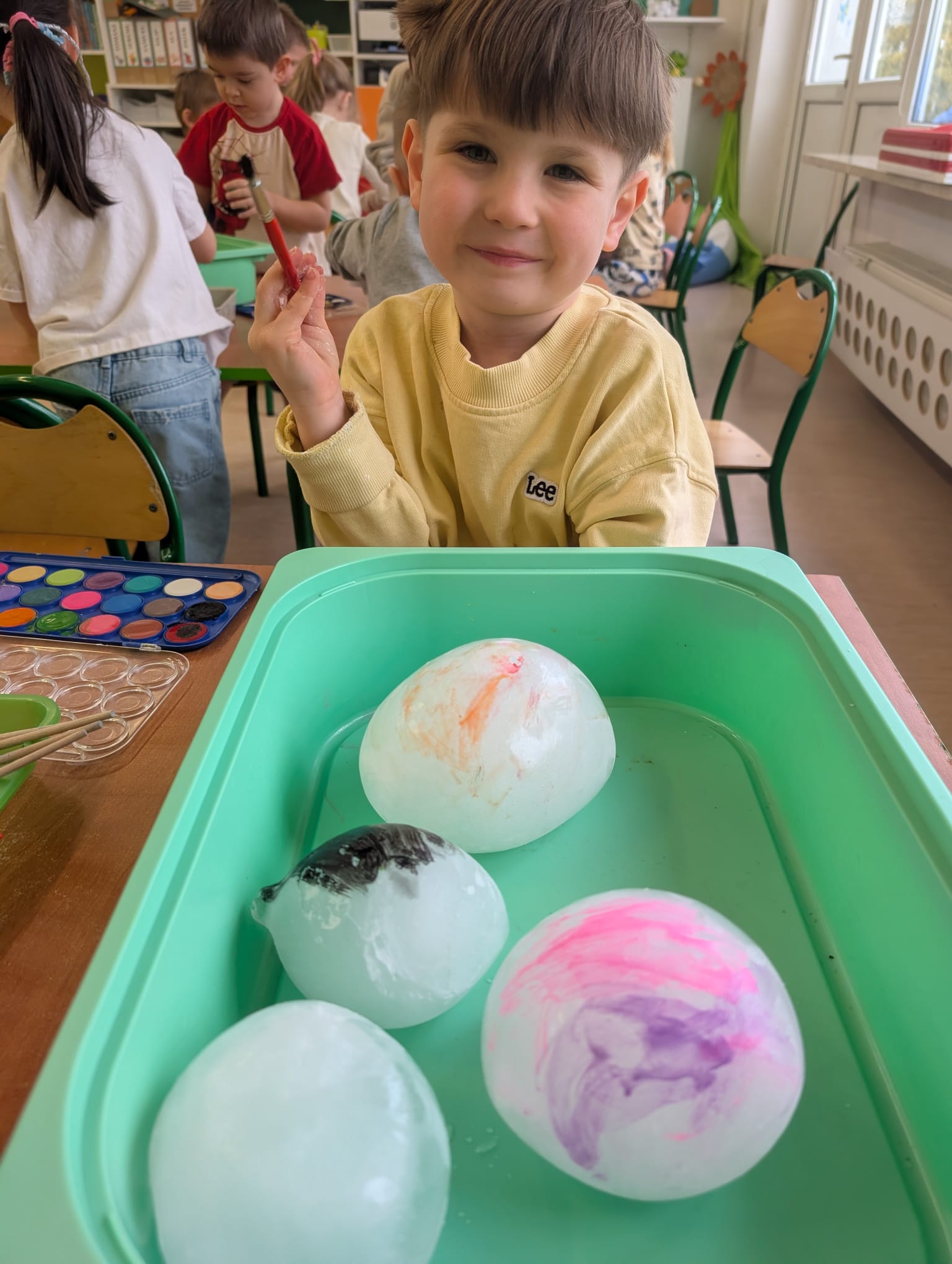 Tutaj był czas na odważne doświadczenia! Dzieci spacerowały boso przez zimową ścieżkę sensoryczną, a na jej końcu każdy przedszkolak – niczym prawdziwy śmiałek – stanął w prawdziwym śniegu przyniesionym z podwórka. Dzieci eksplorowały w własnoręcznie przygotowanej piankolinie, z której powstawały bałwany i igloo dla pingwinków, oraz badały zimową ciecz nienewtonowską w poszukiwaniu ukrytych skarbów, a także artystycznie malowały lodowe kule, obserwując ich niezwykłą teksturę.