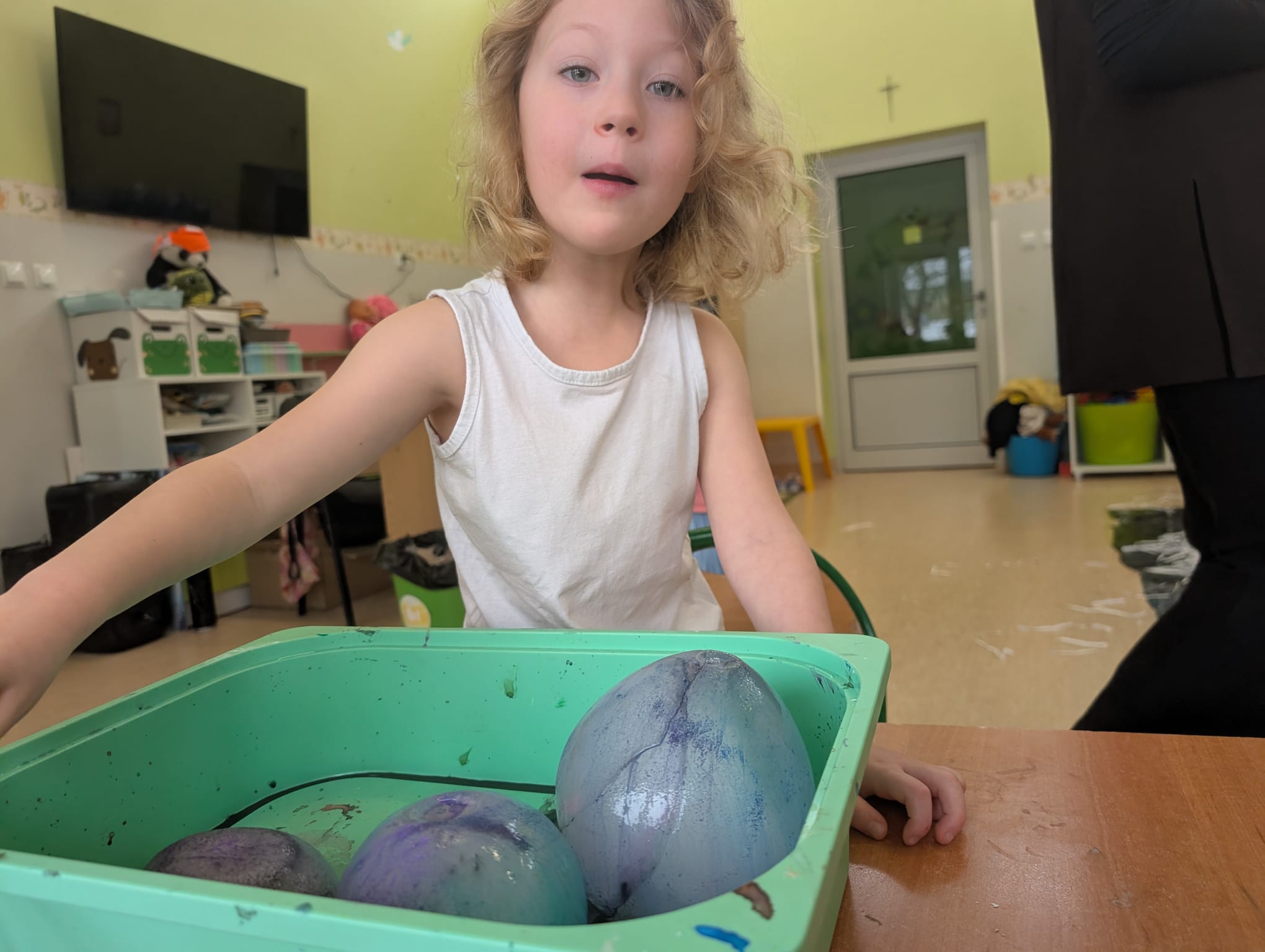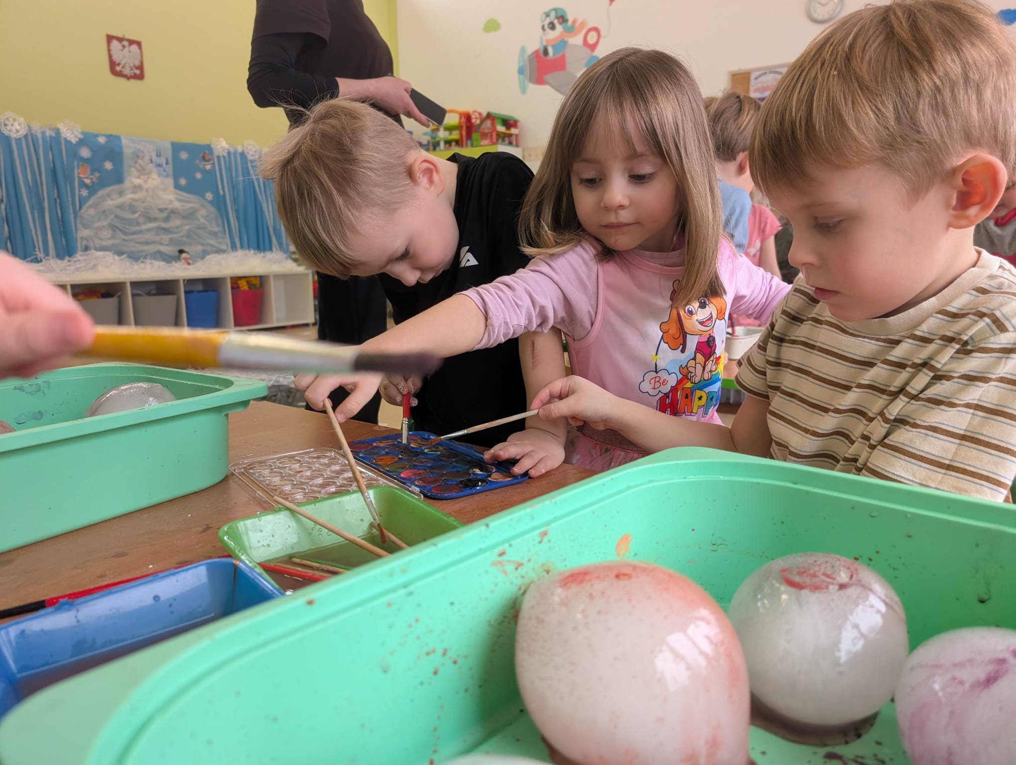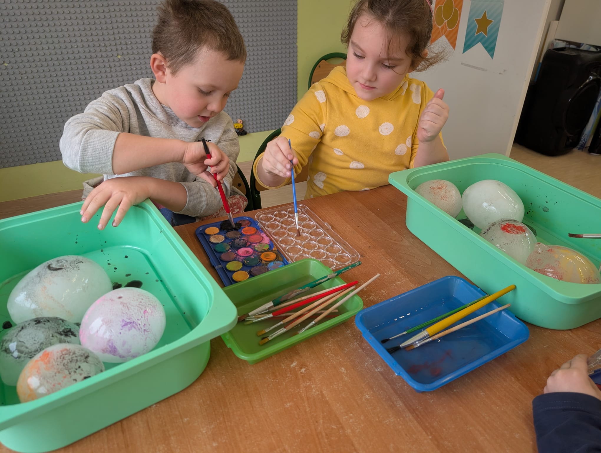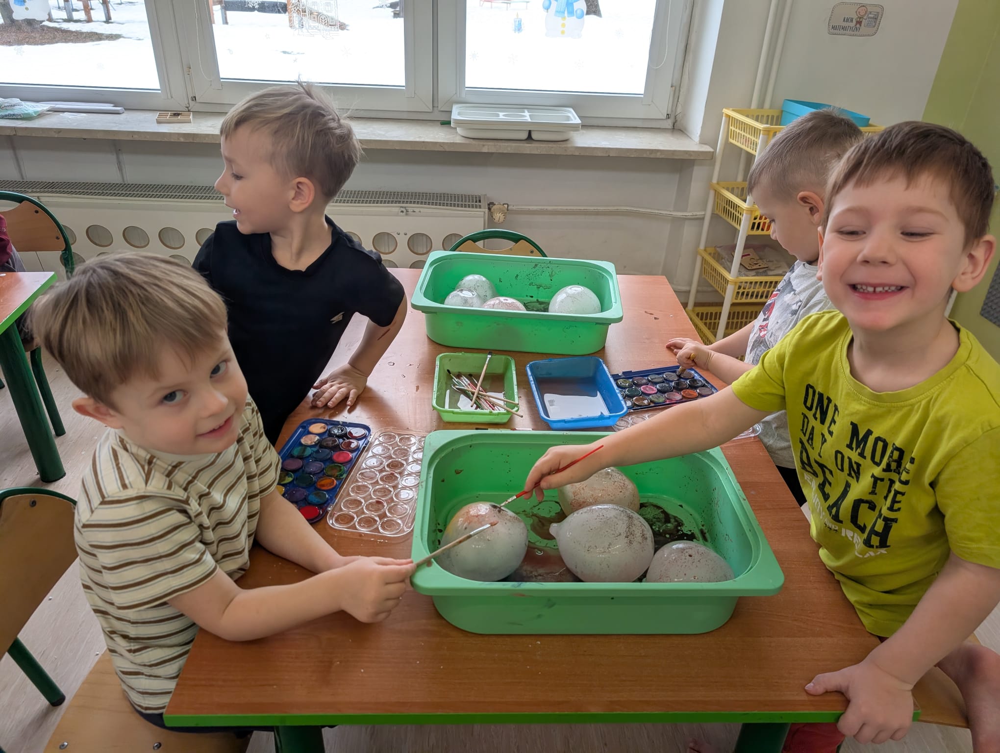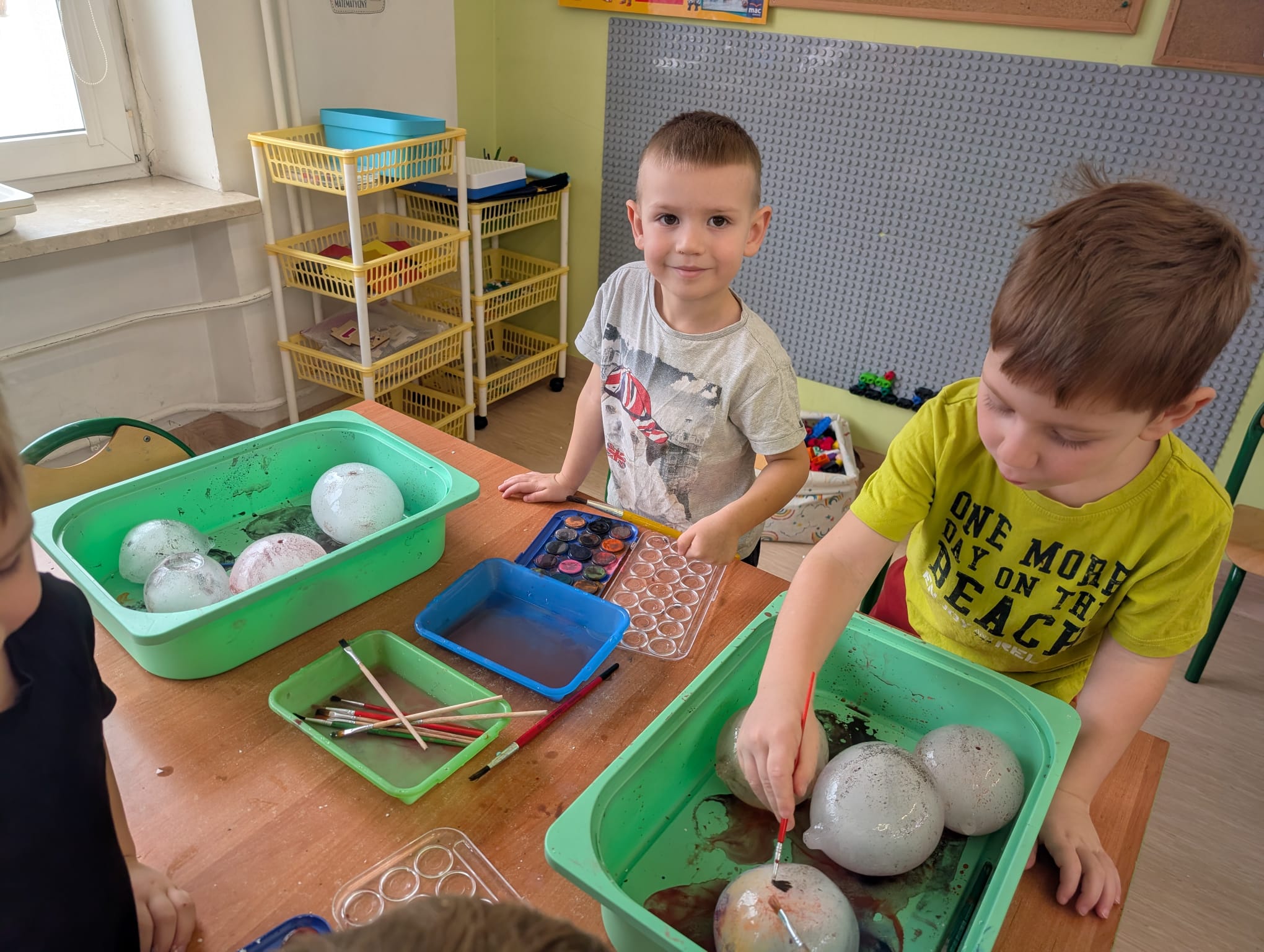 Tutaj był czas na odważne doświadczenia! Dzieci spacerowały boso przez zimową ścieżkę sensoryczną, a na jej końcu każdy przedszkolak – niczym prawdziwy śmiałek – stanął w prawdziwym śniegu przyniesionym z podwórka. Dzieci eksplorowały w własnoręcznie przygotowanej piankolinie, z której powstawały bałwany i igloo dla pingwinków, oraz badały zimową ciecz nienewtonowską w poszukiwaniu ukrytych skarbów, a także artystycznie malowały lodowe kule, obserwując ich niezwykłą teksturę.