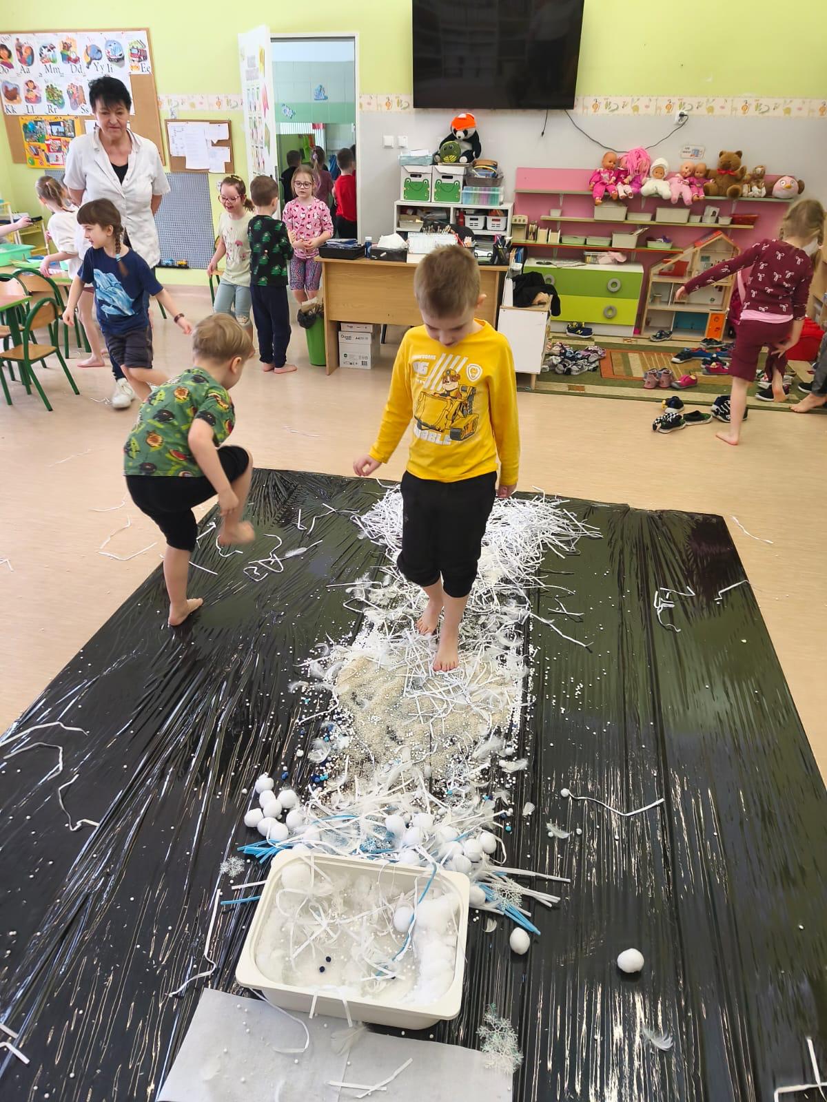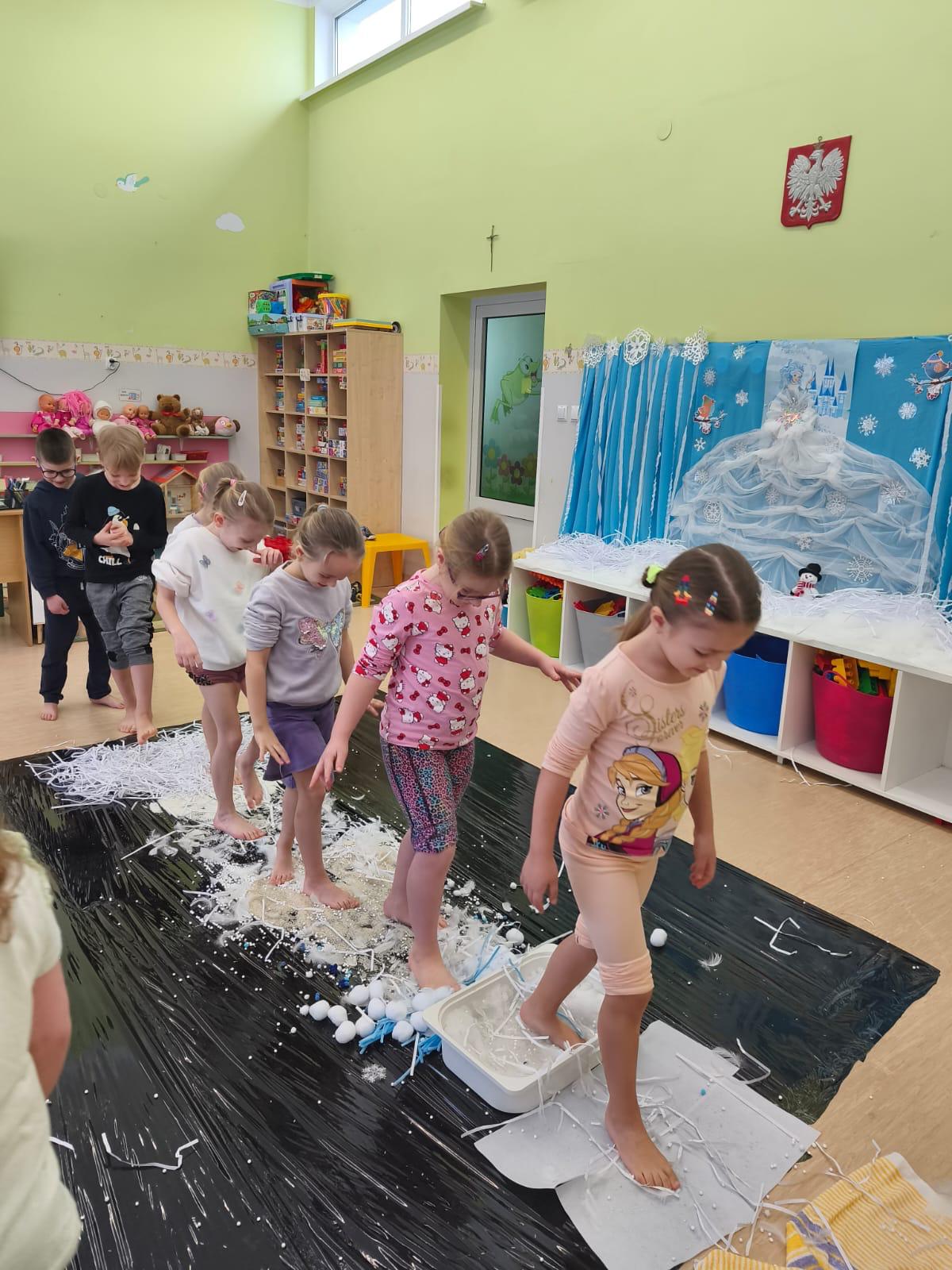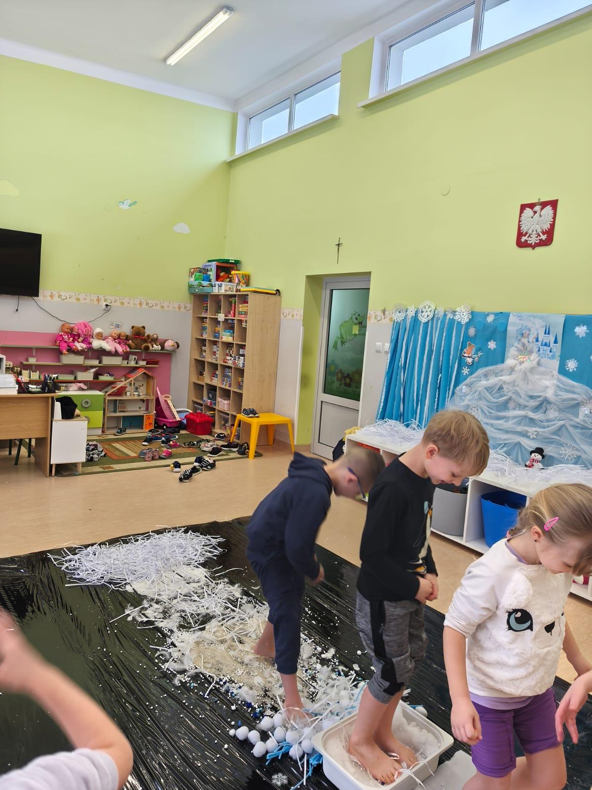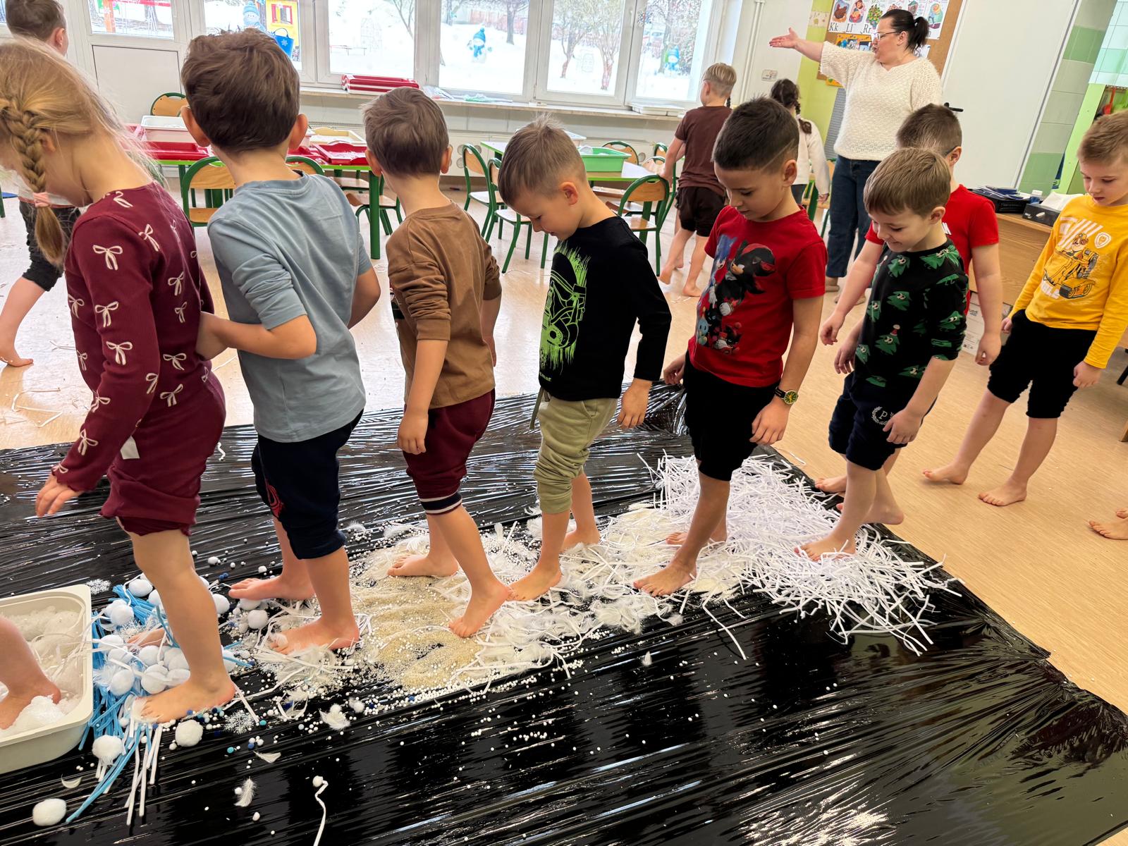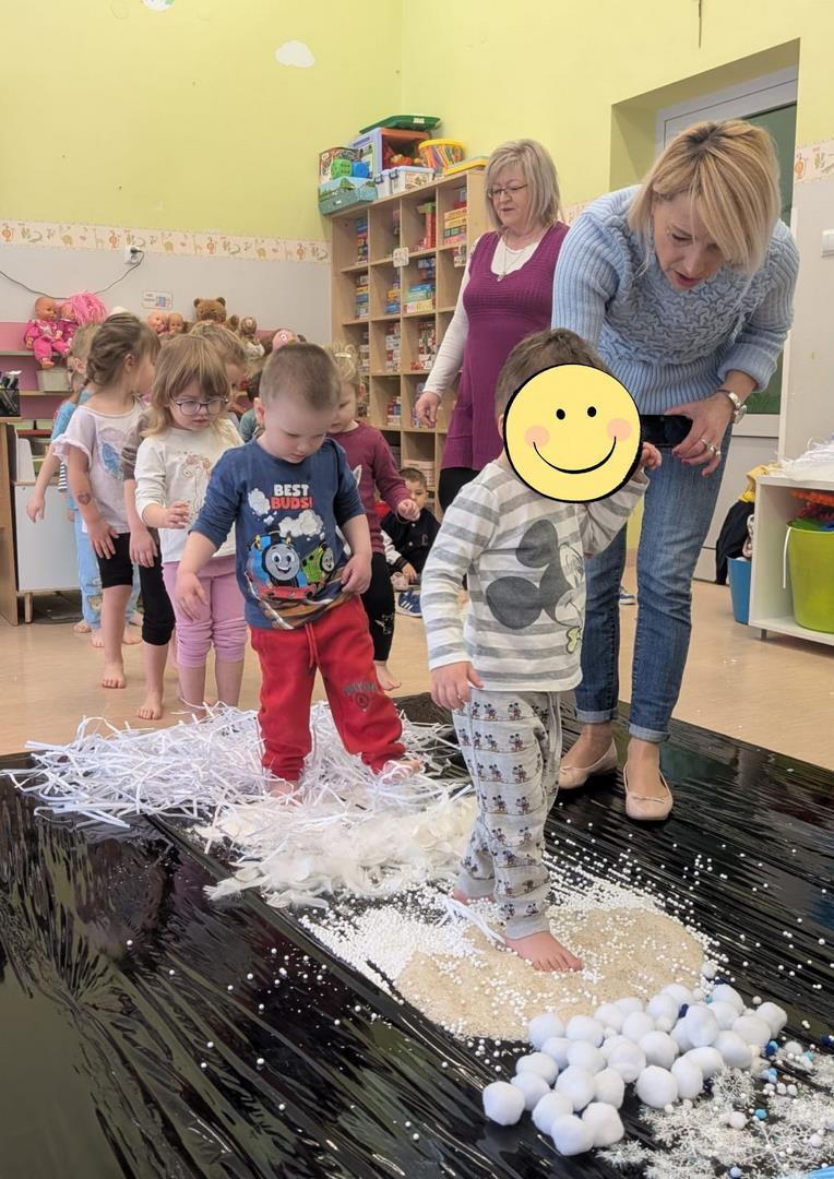 W tej grupie królowały dźwięki! Dzieci wsłuchiwały się w odgłosy zimy, śpiewały zimowe piosenki i muzykowały przy użyciu instrumentów domowej roboty. Prawdziwym hitem okazała się sensoryczna ścieżka muzyczna, która pozwoliła przedszkolakom „wychodzić” rytm zimy.