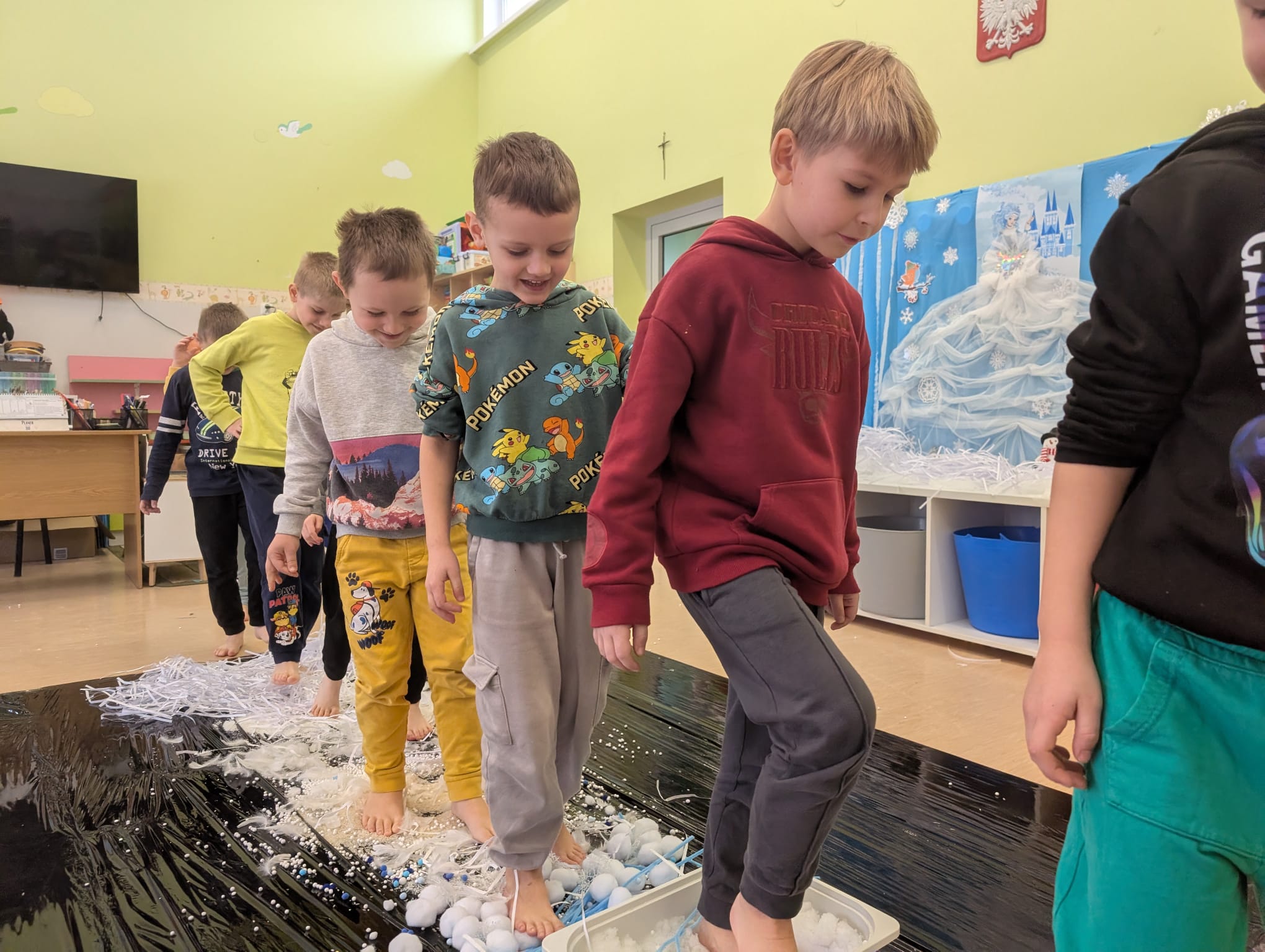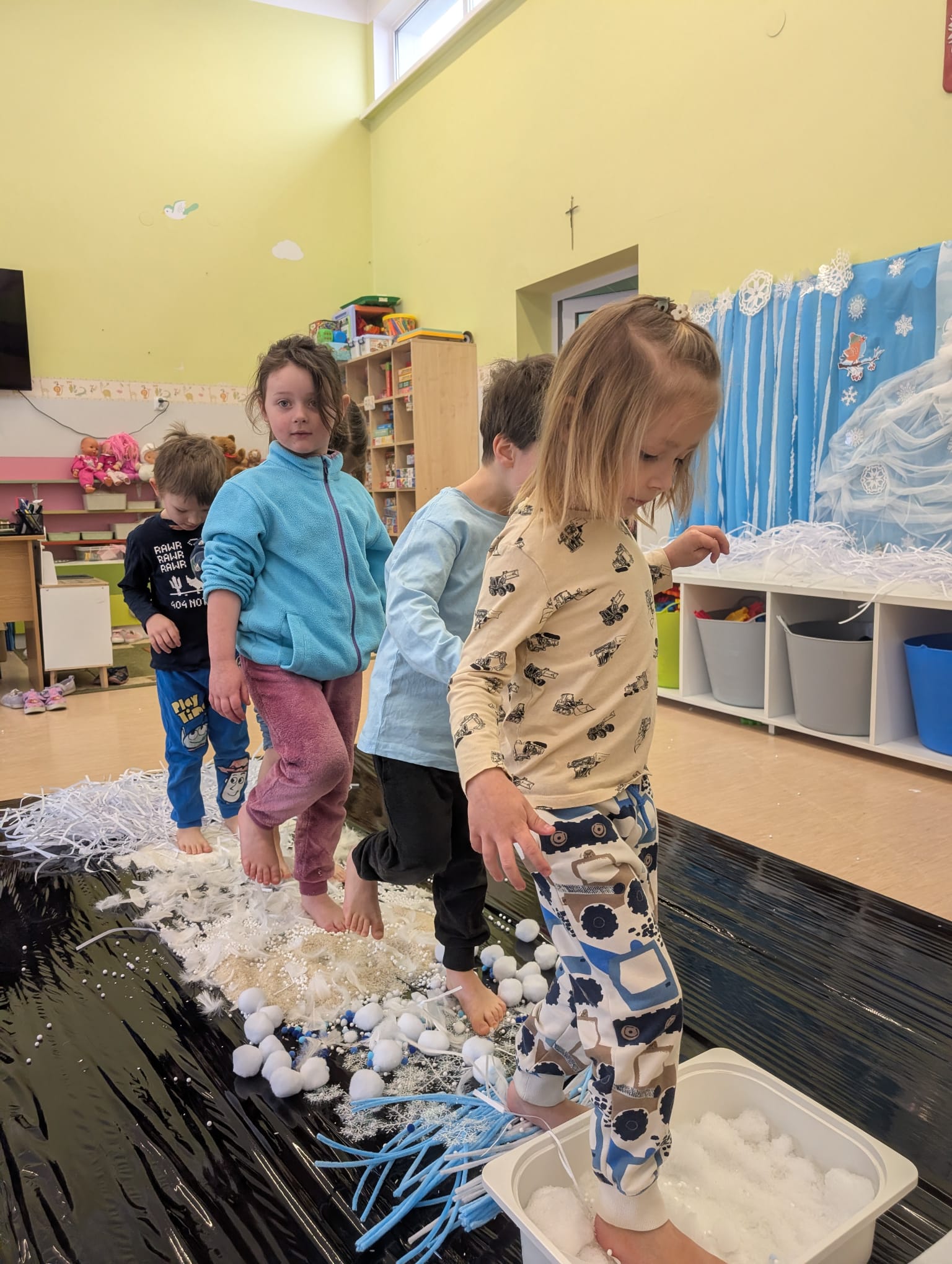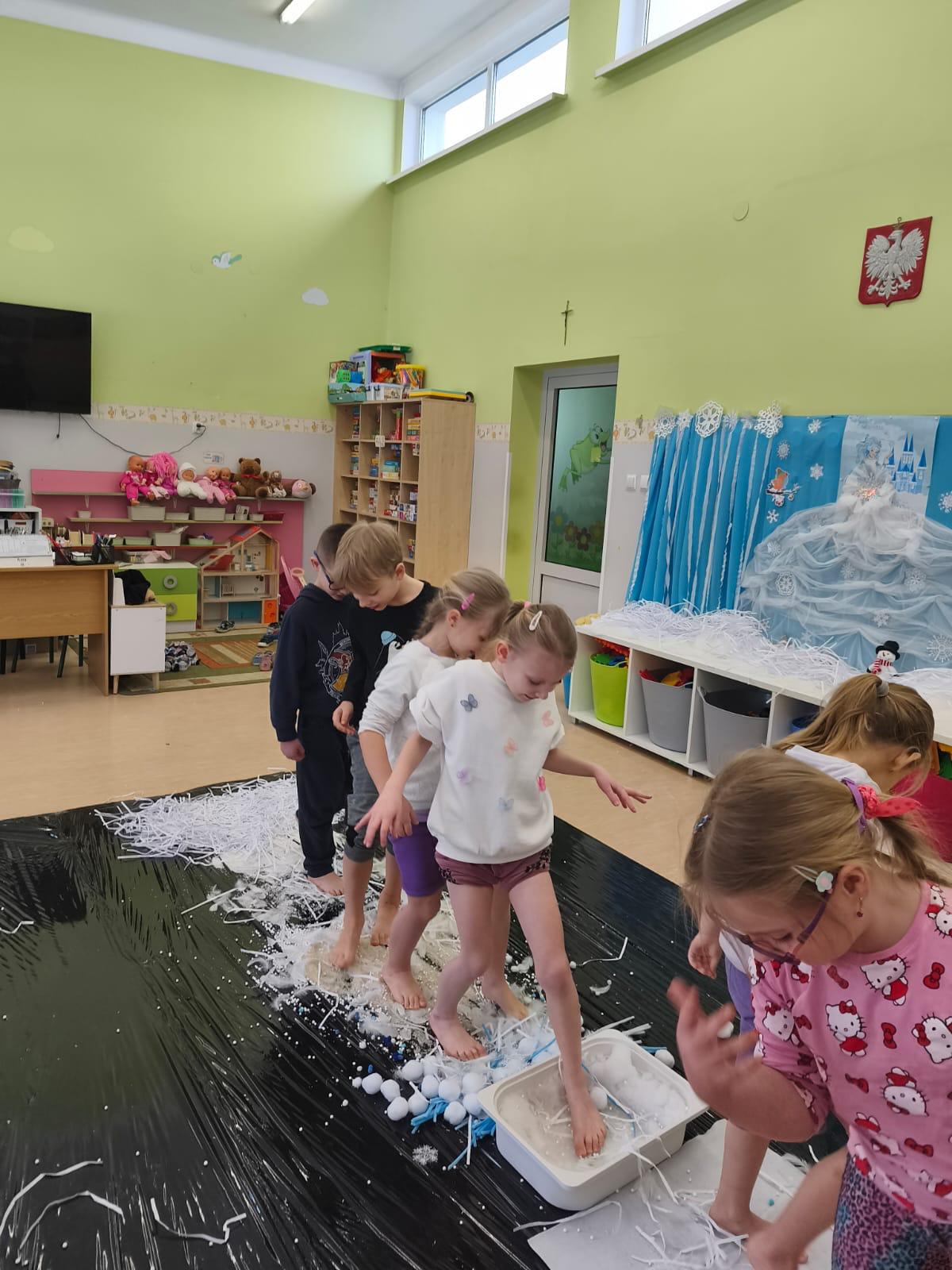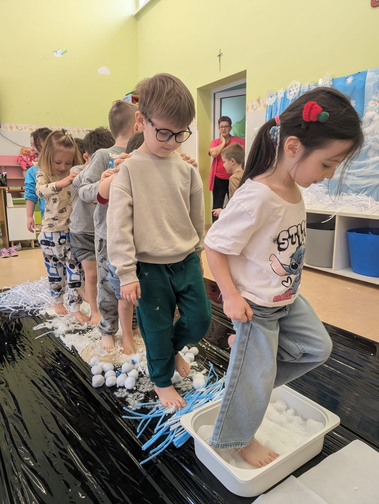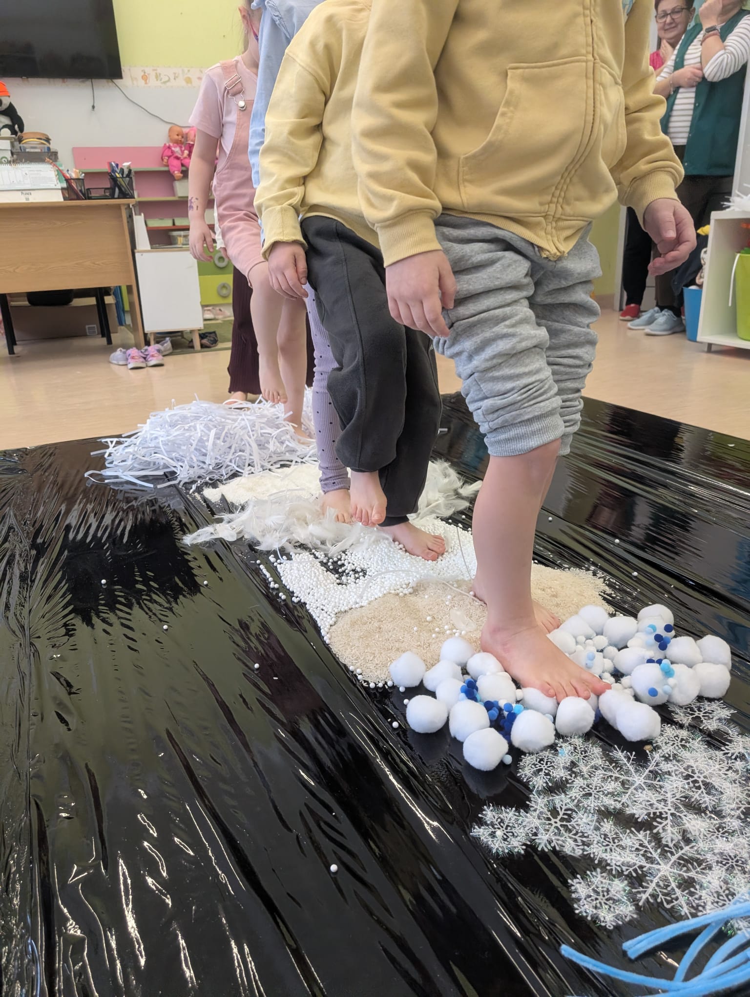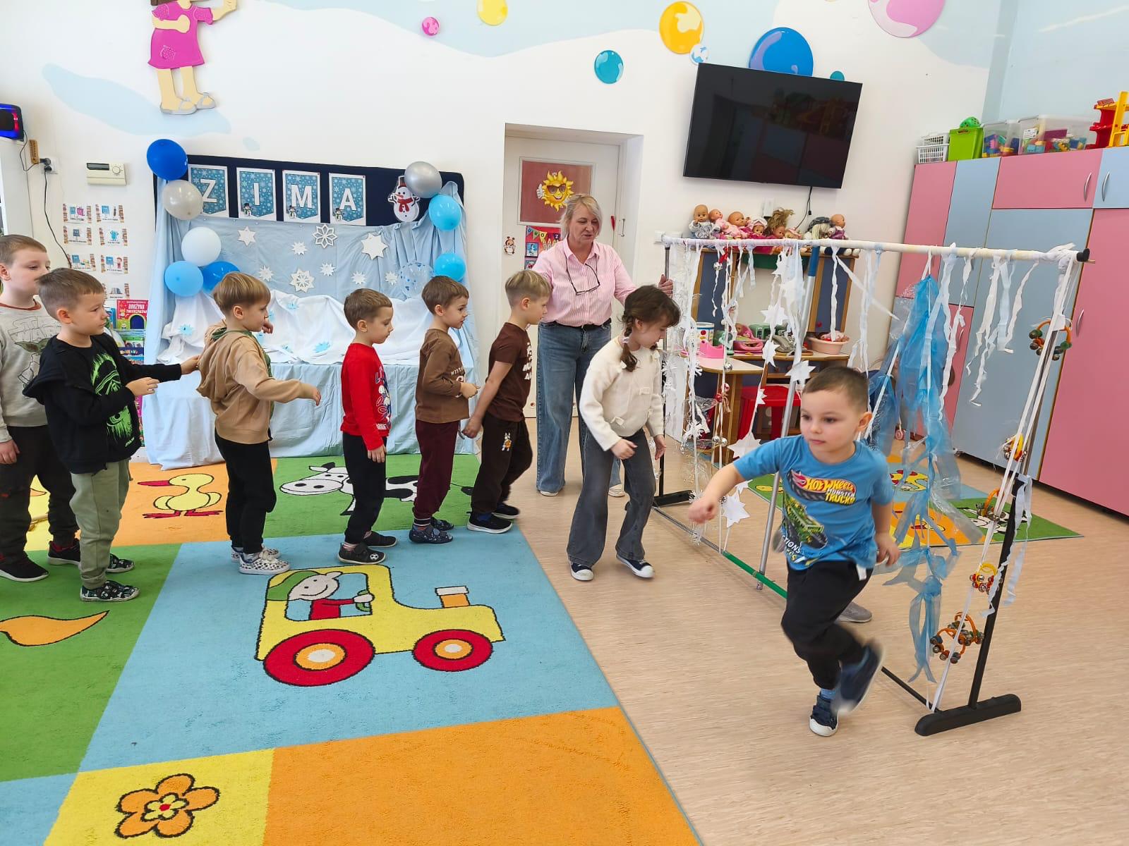 W tej grupie królowały dźwięki! Dzieci wsłuchiwały się w odgłosy zimy, śpiewały zimowe piosenki i muzykowały przy użyciu instrumentów domowej roboty. Prawdziwym hitem okazała się sensoryczna ścieżka muzyczna, która pozwoliła przedszkolakom „wychodzić” rytm zimy.