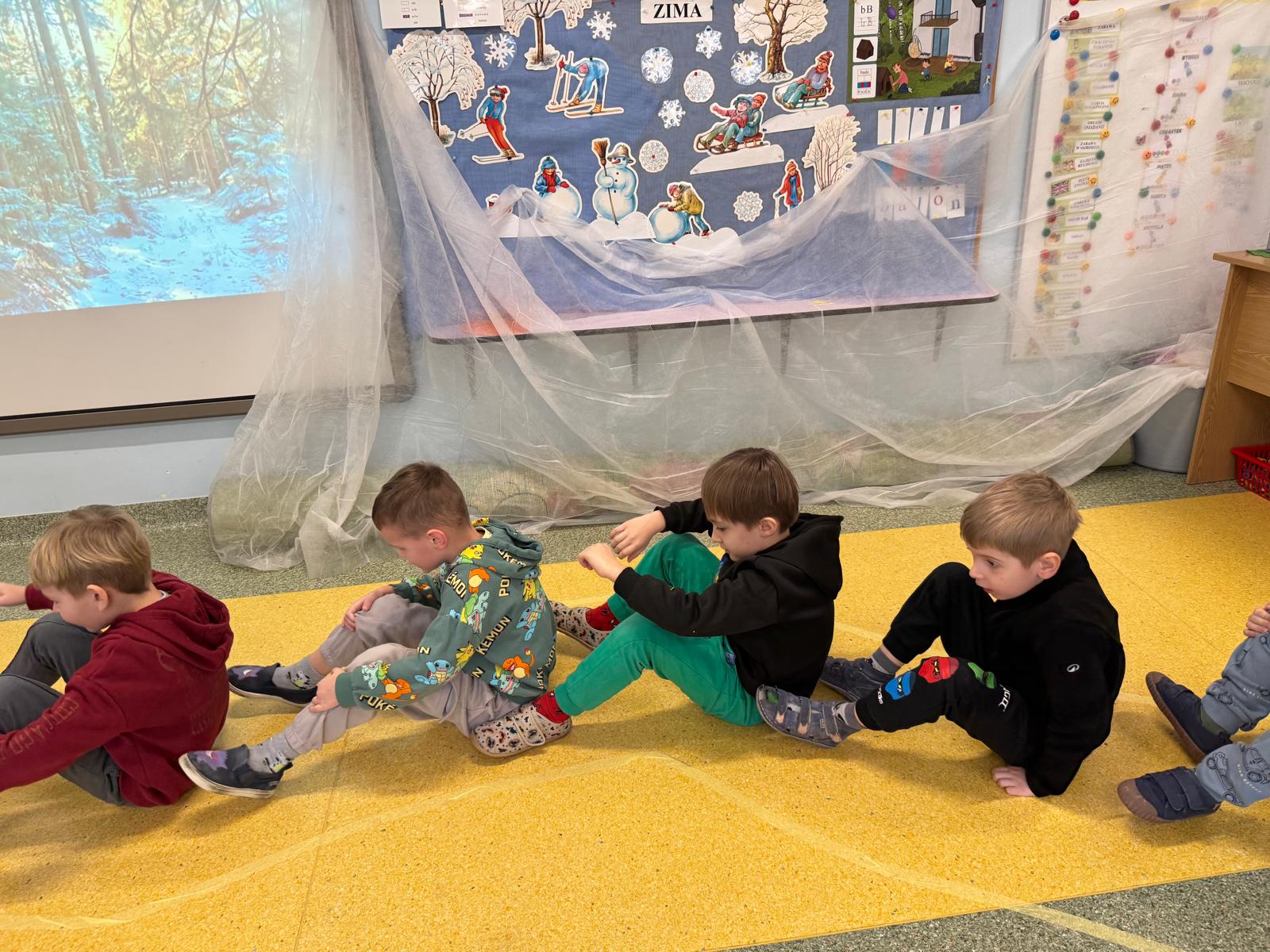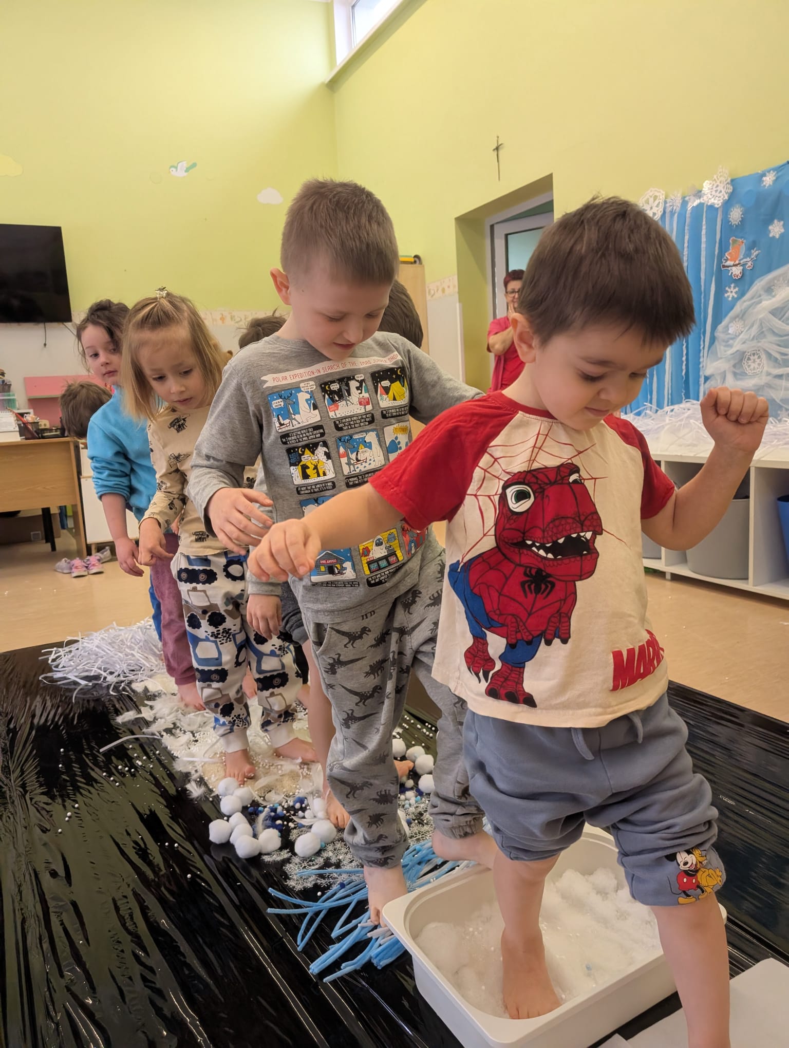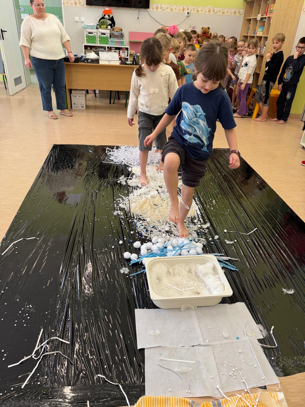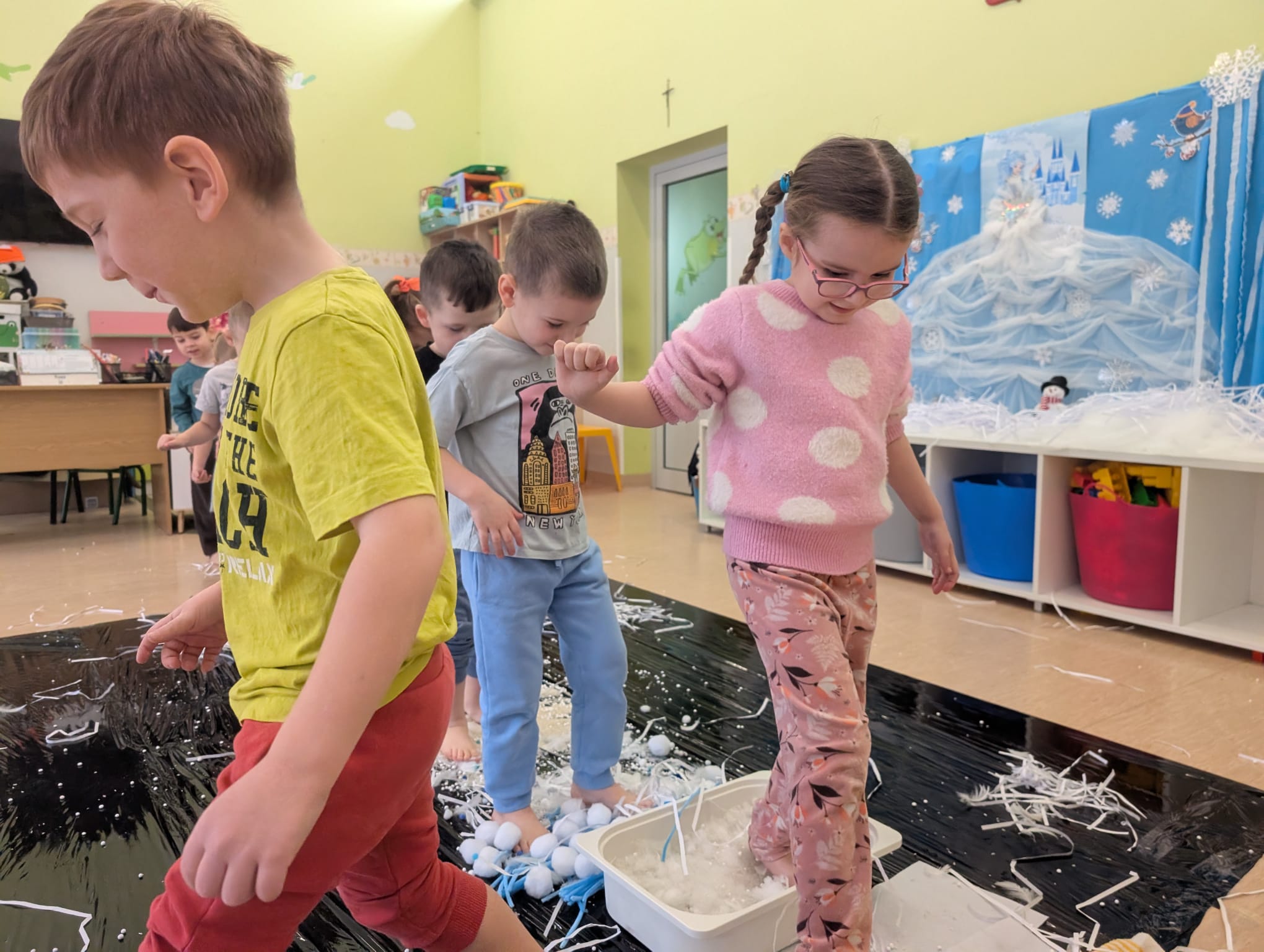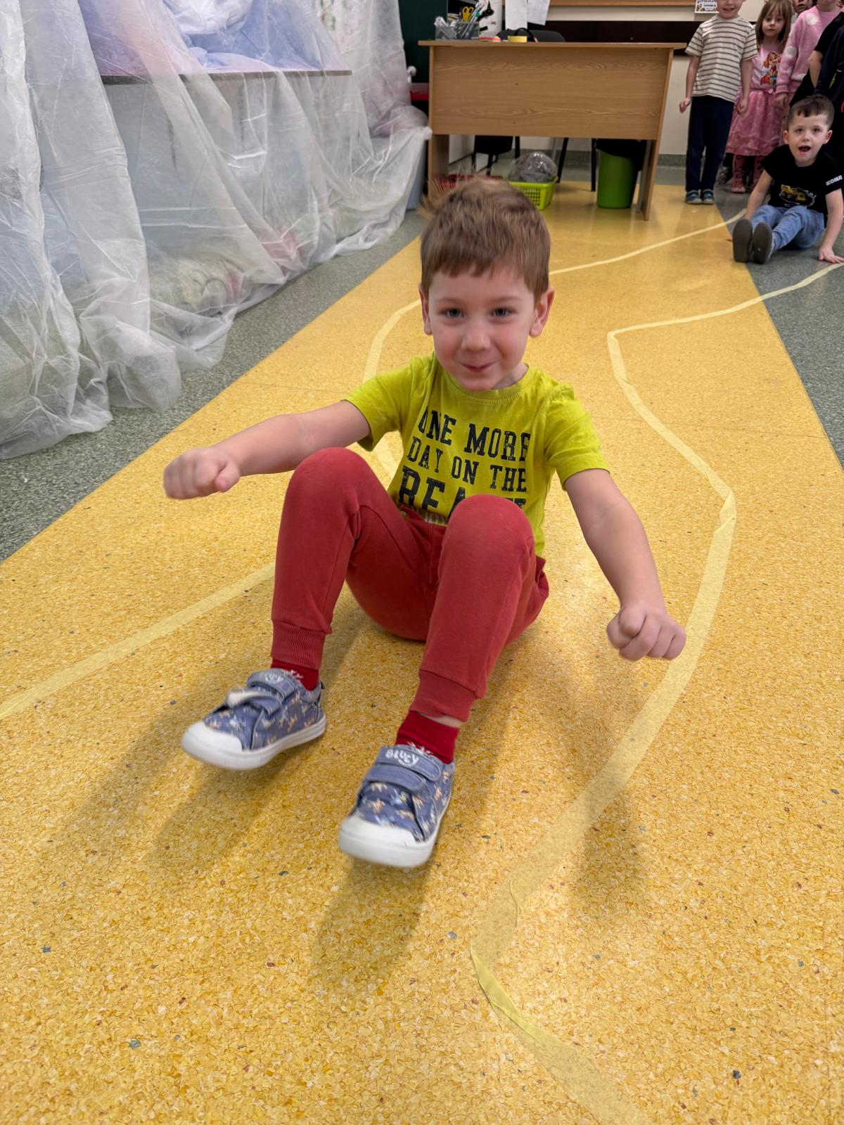W tej grupie królowały dźwięki! Dzieci wsłuchiwały się w odgłosy zimy, śpiewały zimowe piosenki i muzykowały przy użyciu instrumentów domowej roboty. Prawdziwym hitem okazała się sensoryczna ścieżka muzyczna, która pozwoliła przedszkolakom „wychodzić” rytm zimy.