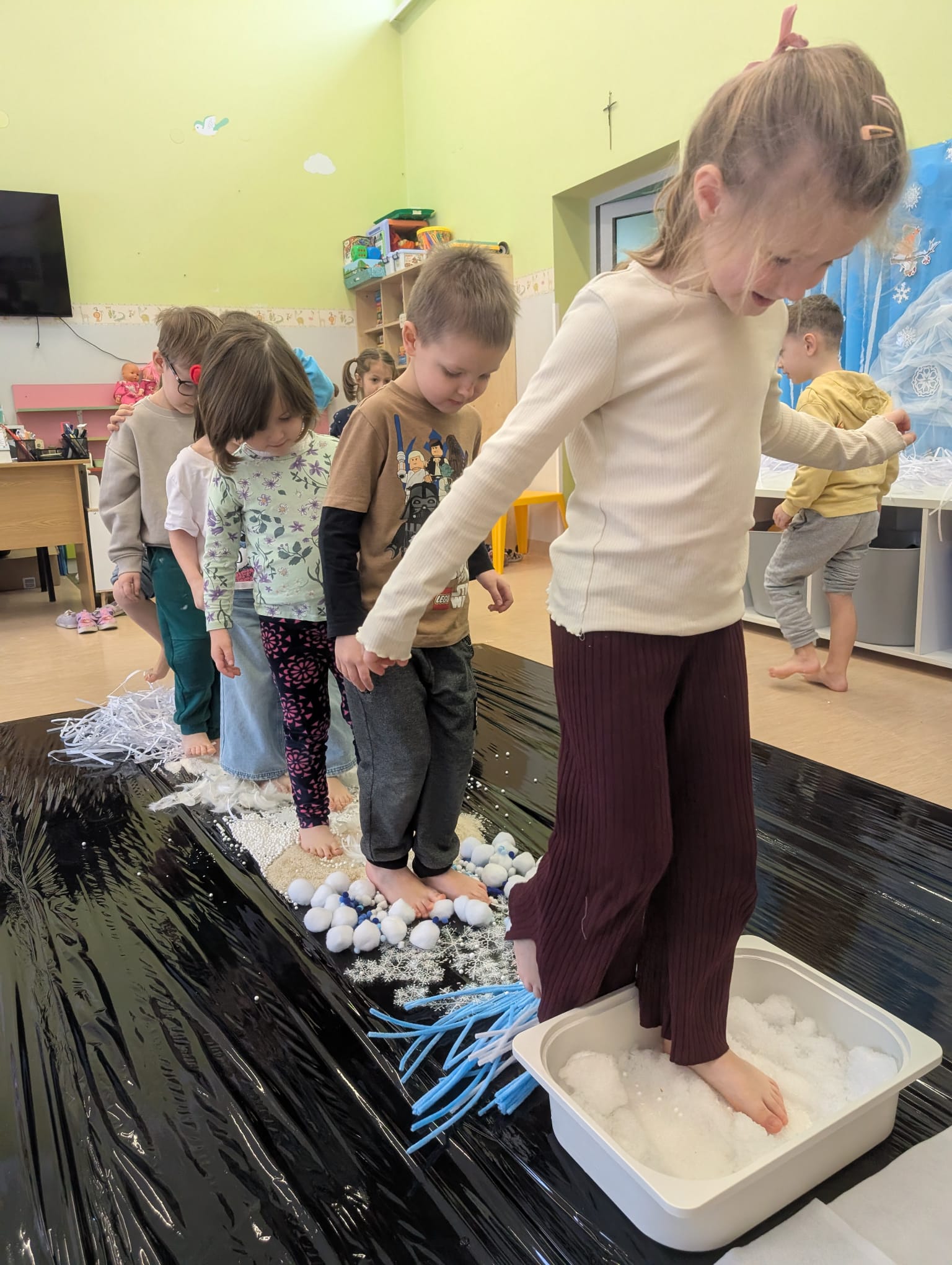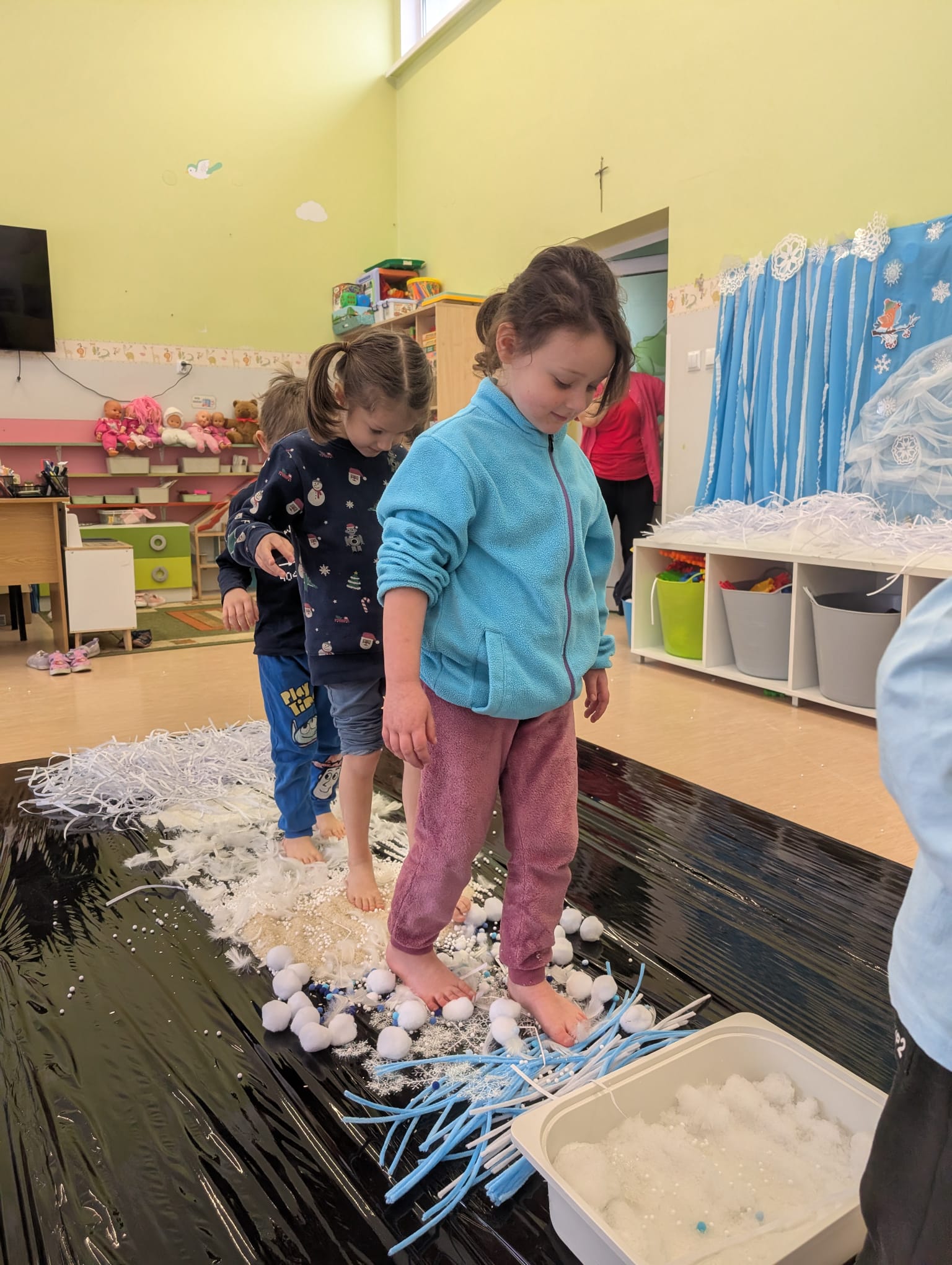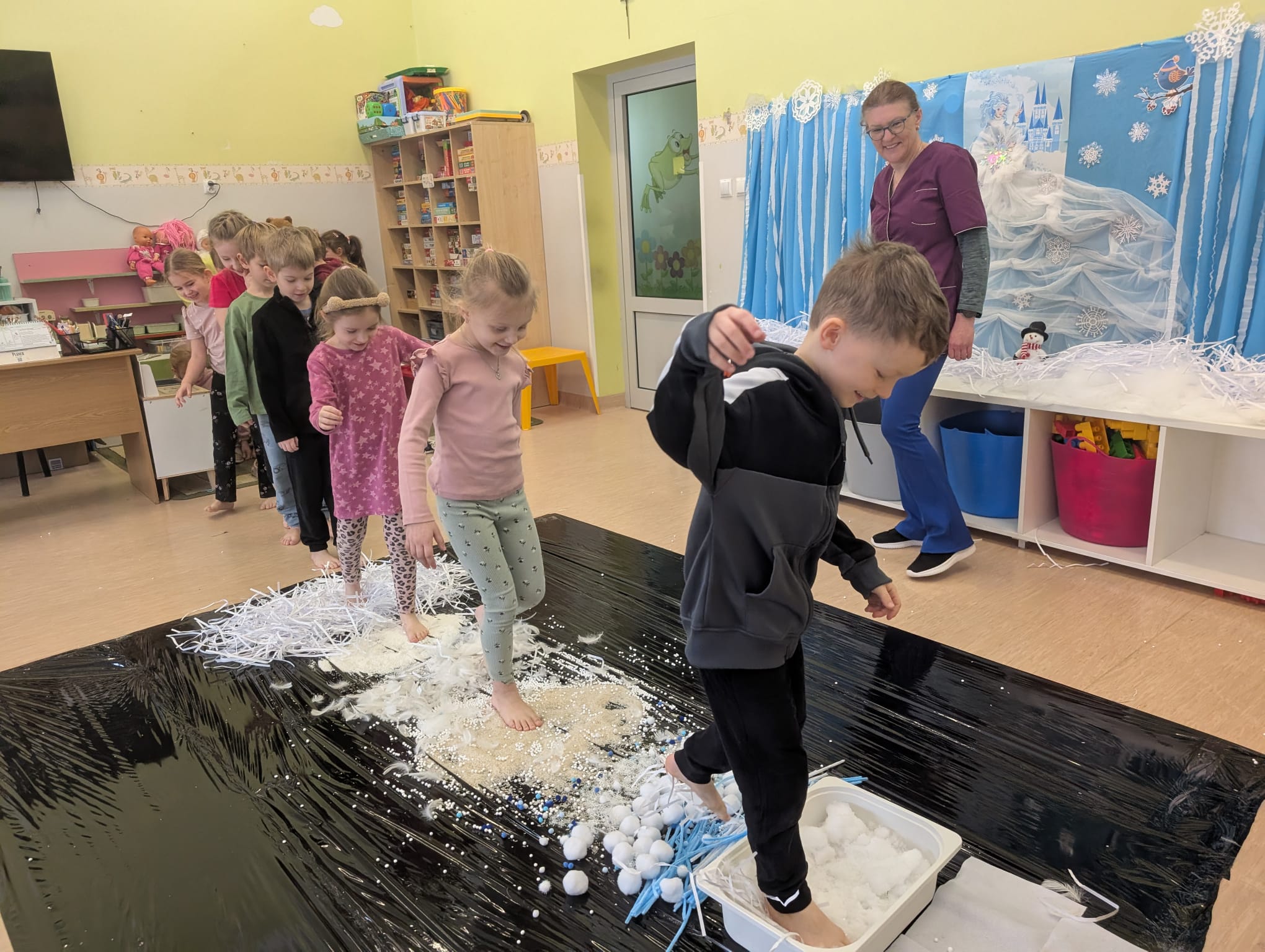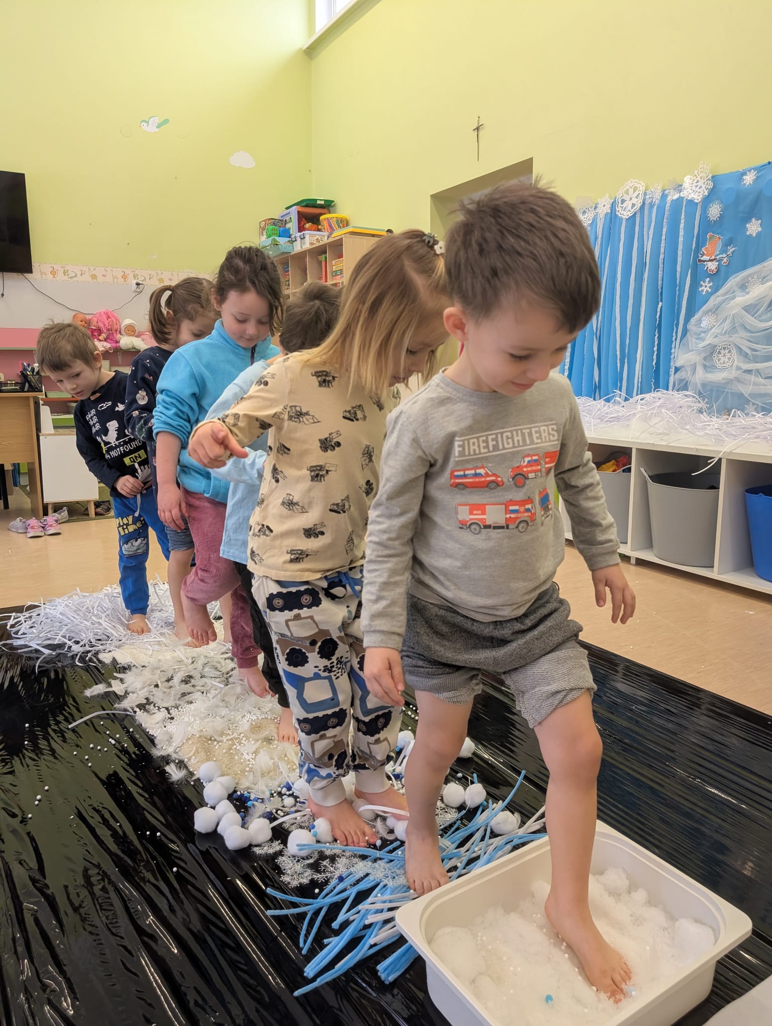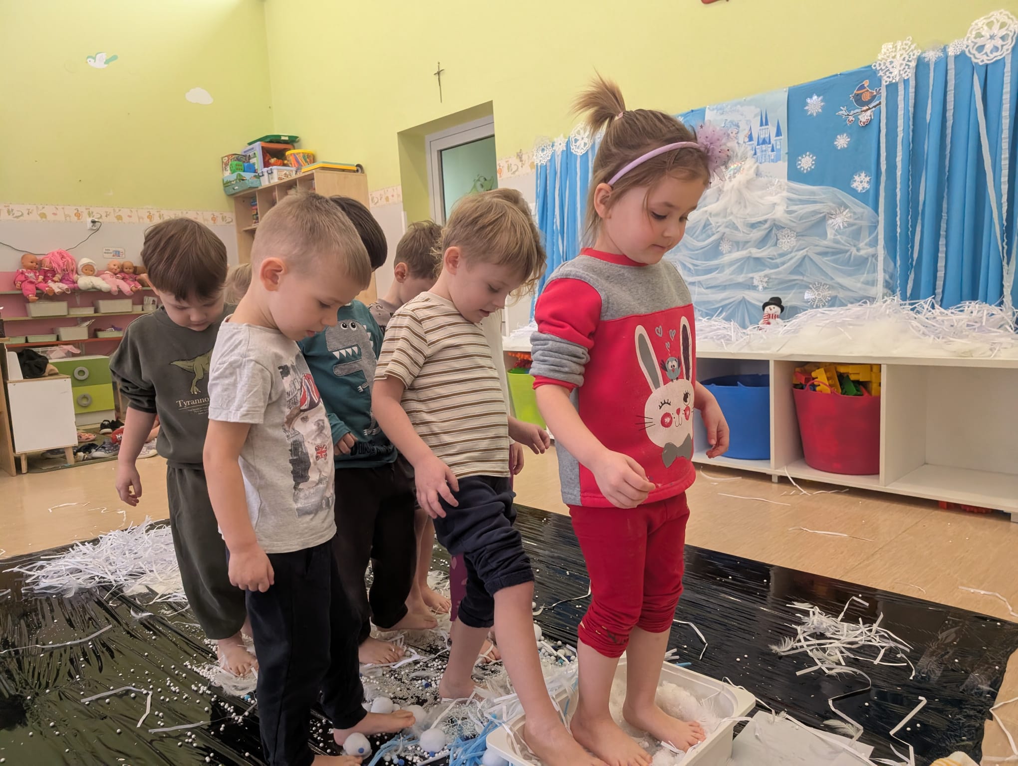 W tej grupie królowały dźwięki! Dzieci wsłuchiwały się w odgłosy zimy, śpiewały zimowe piosenki i muzykowały przy użyciu instrumentów domowej roboty. Prawdziwym hitem okazała się sensoryczna ścieżka muzyczna, która pozwoliła przedszkolakom „wychodzić” rytm zimy.