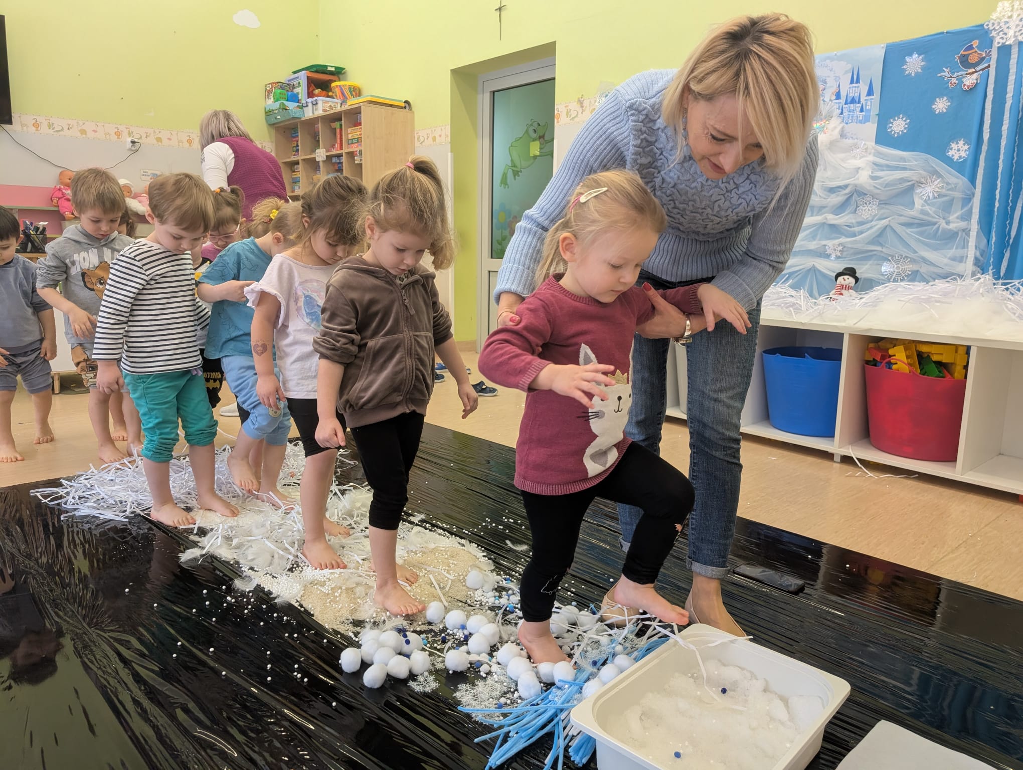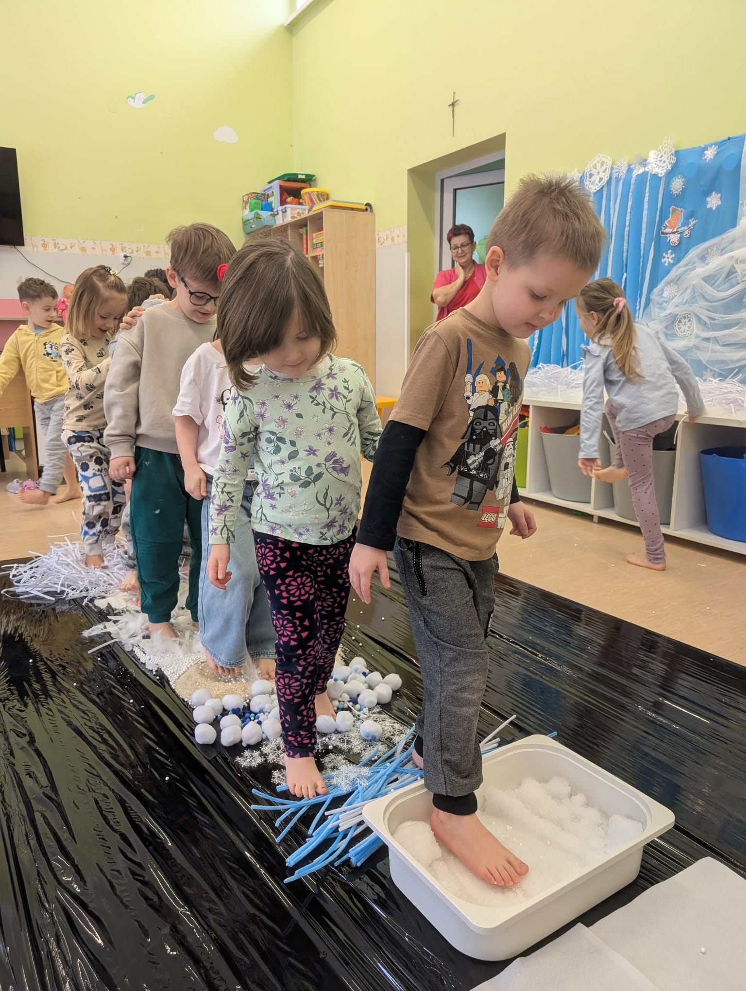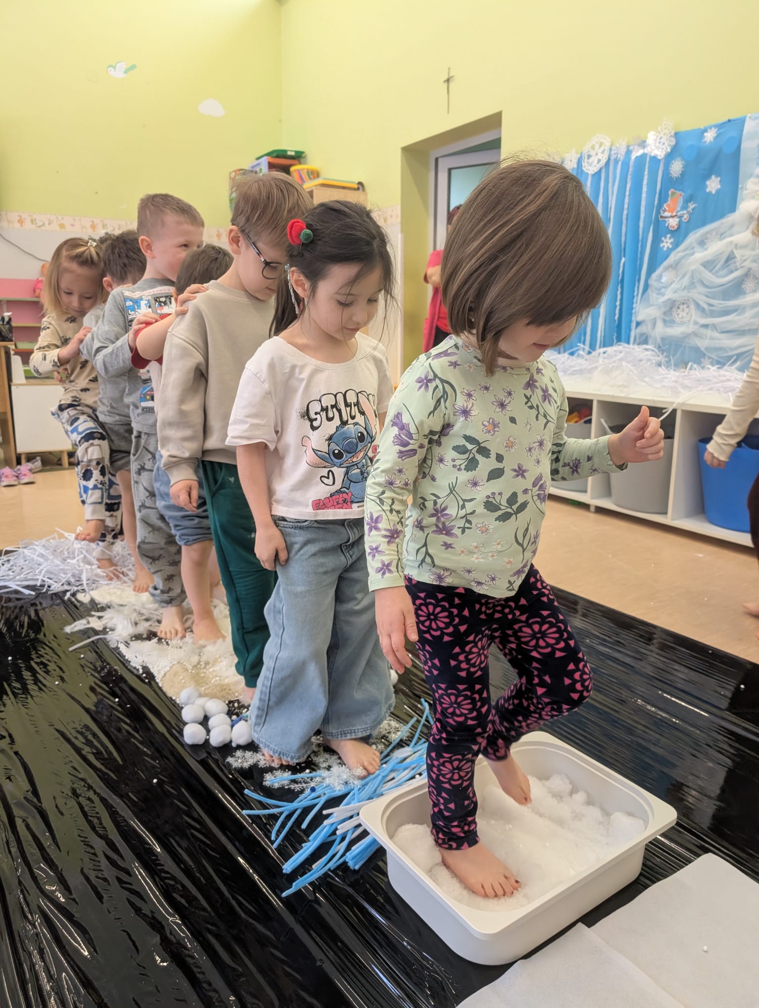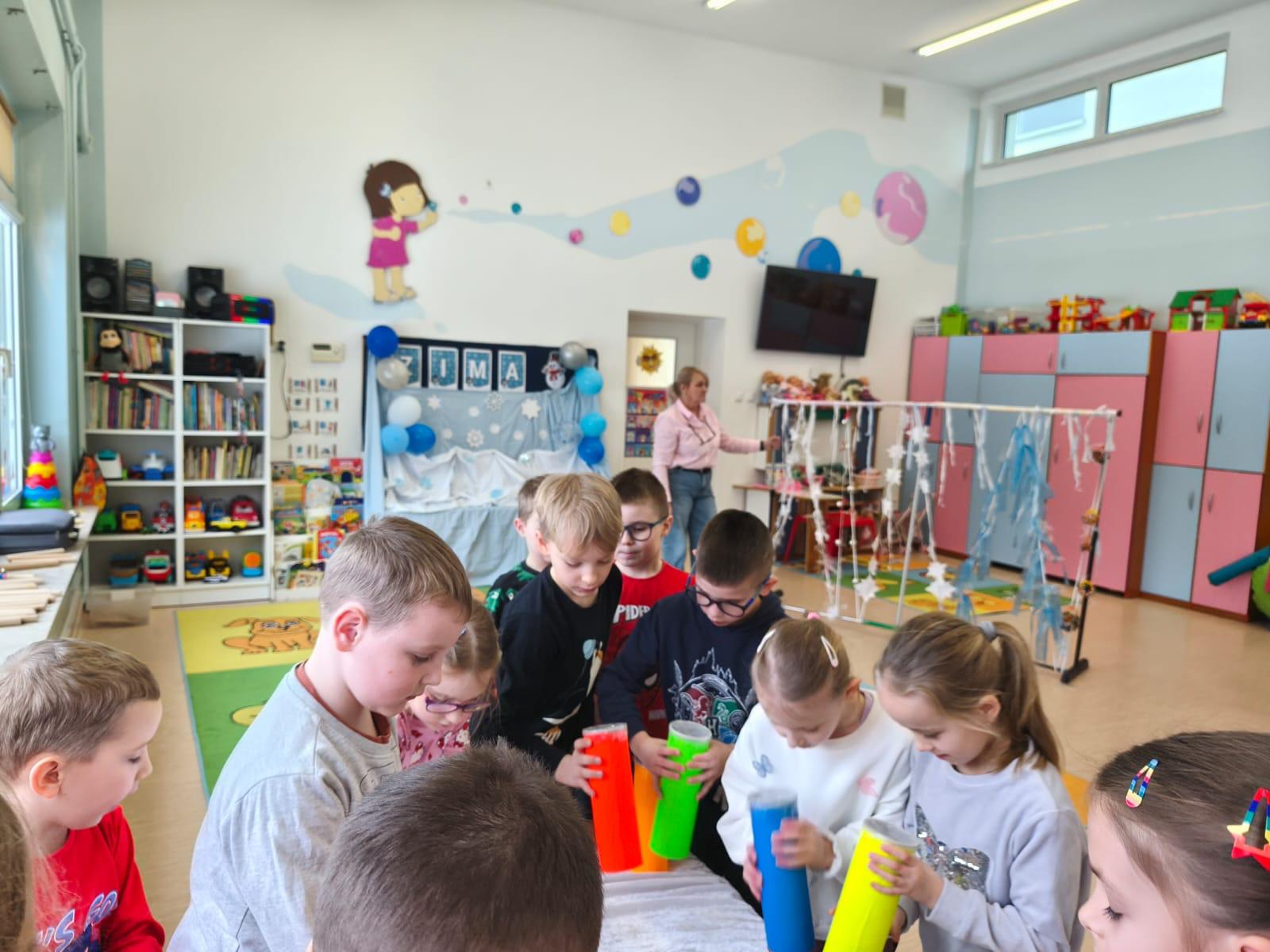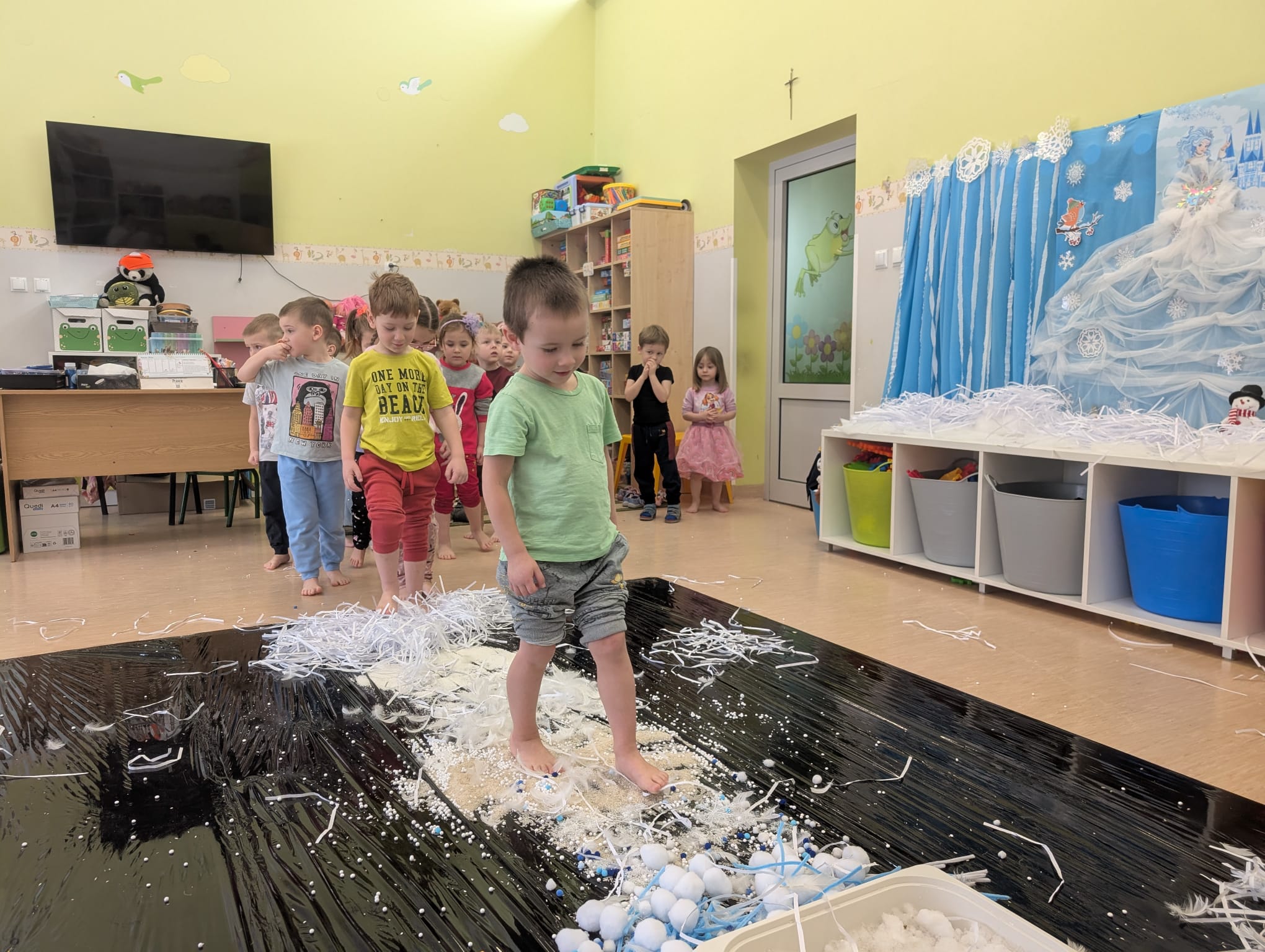 W tej grupie królowały dźwięki! Dzieci wsłuchiwały się w odgłosy zimy, śpiewały zimowe piosenki i muzykowały przy użyciu instrumentów domowej roboty. Prawdziwym hitem okazała się sensoryczna ścieżka muzyczna, która pozwoliła przedszkolakom „wychodzić” rytm zimy.