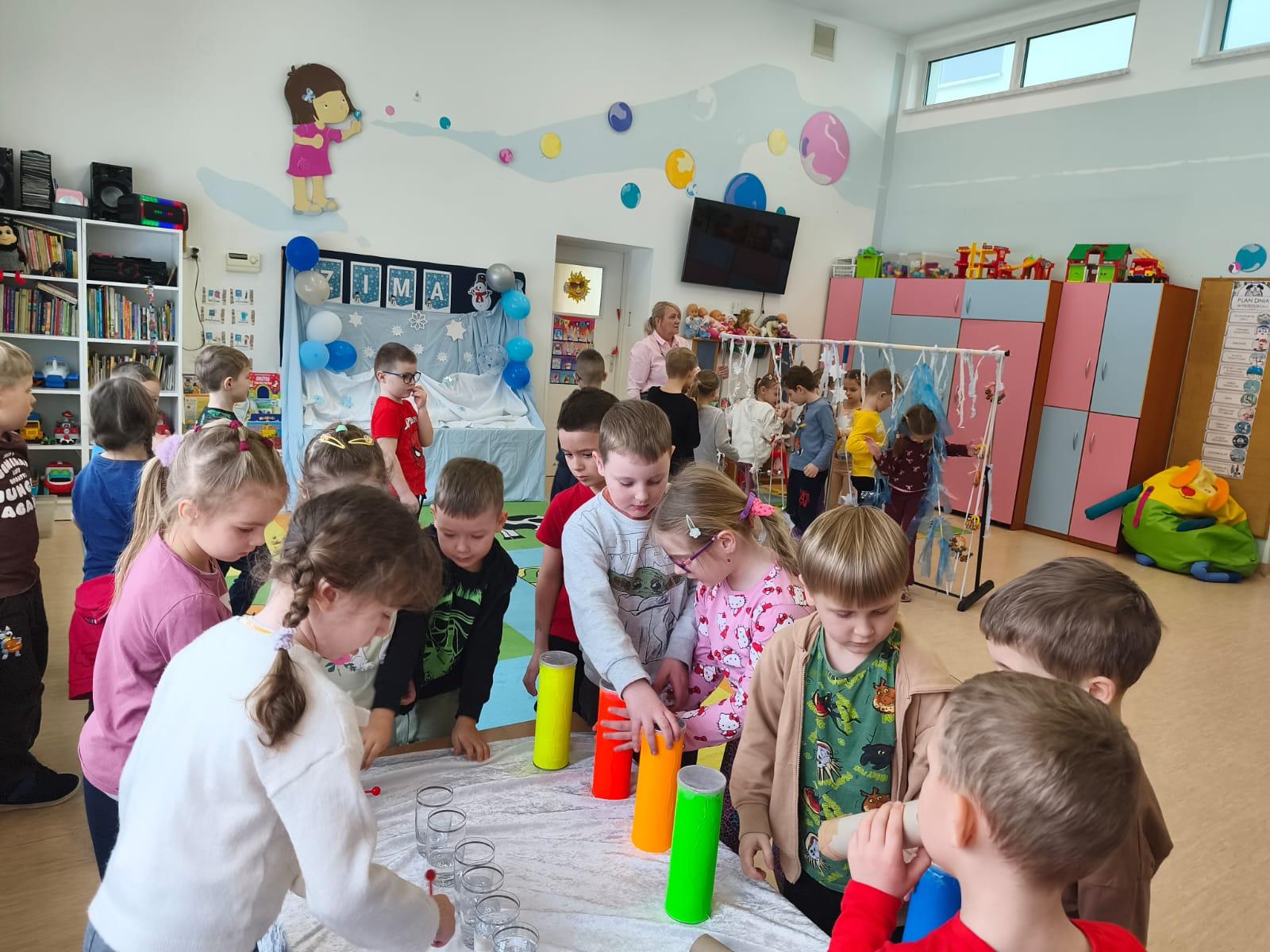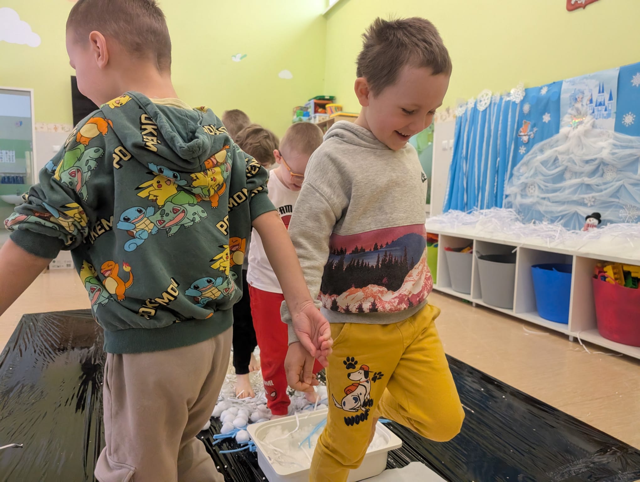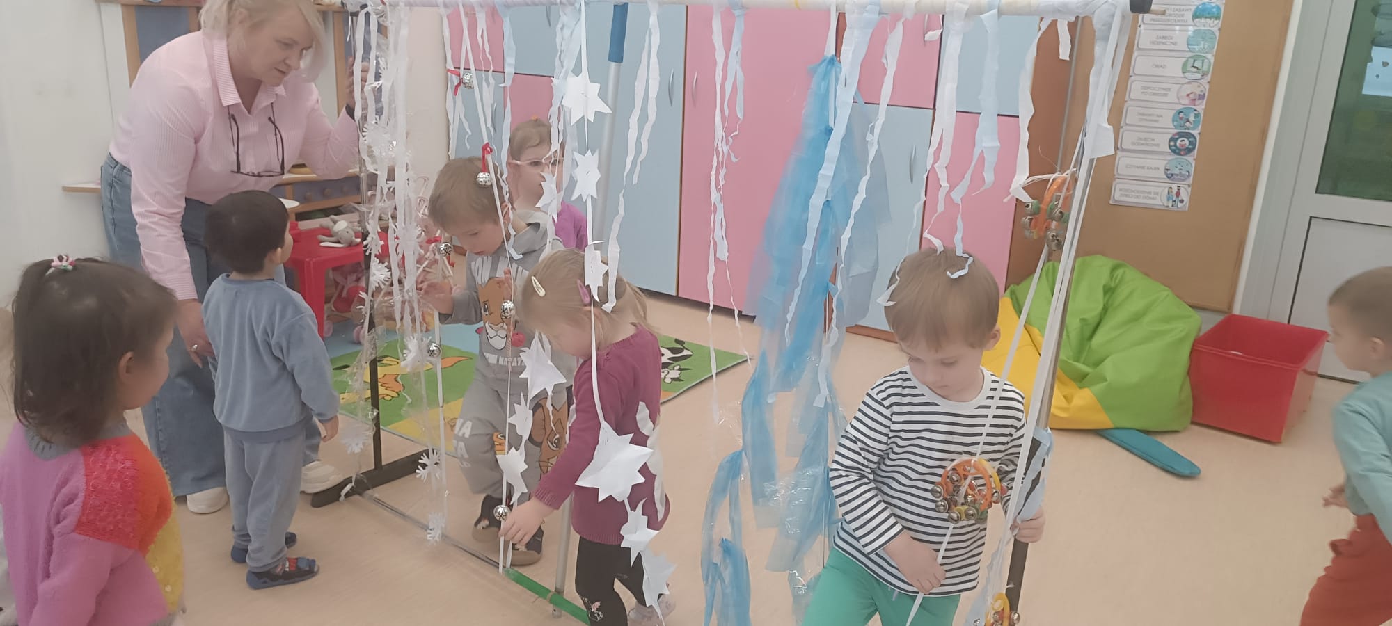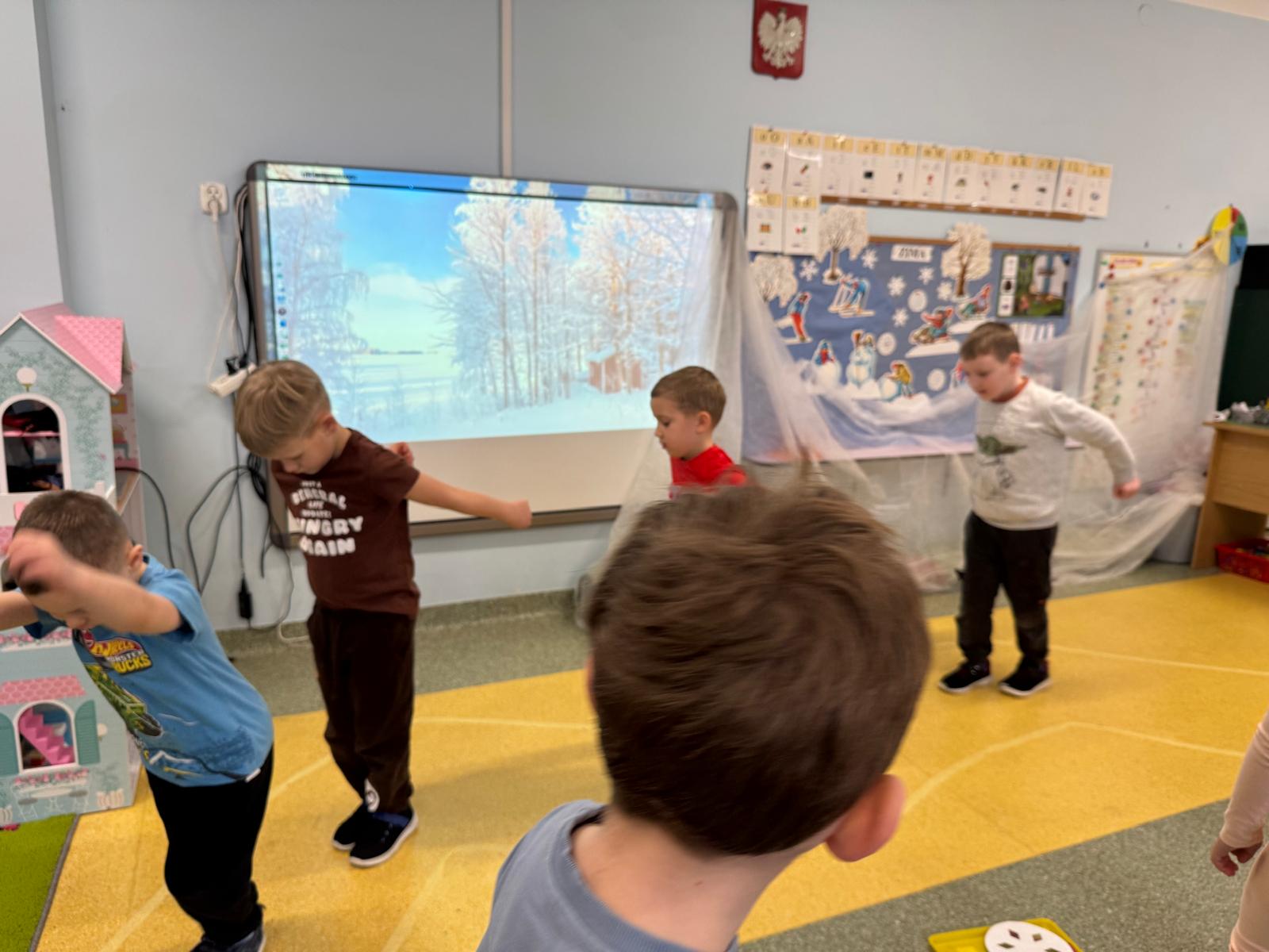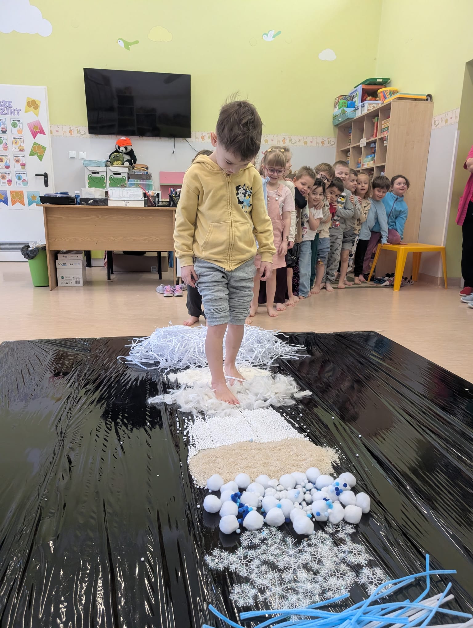 W tej grupie królowały dźwięki! Dzieci wsłuchiwały się w odgłosy zimy, śpiewały zimowe piosenki i muzykowały przy użyciu instrumentów domowej roboty. Prawdziwym hitem okazała się sensoryczna ścieżka muzyczna, która pozwoliła przedszkolakom „wychodzić” rytm zimy.