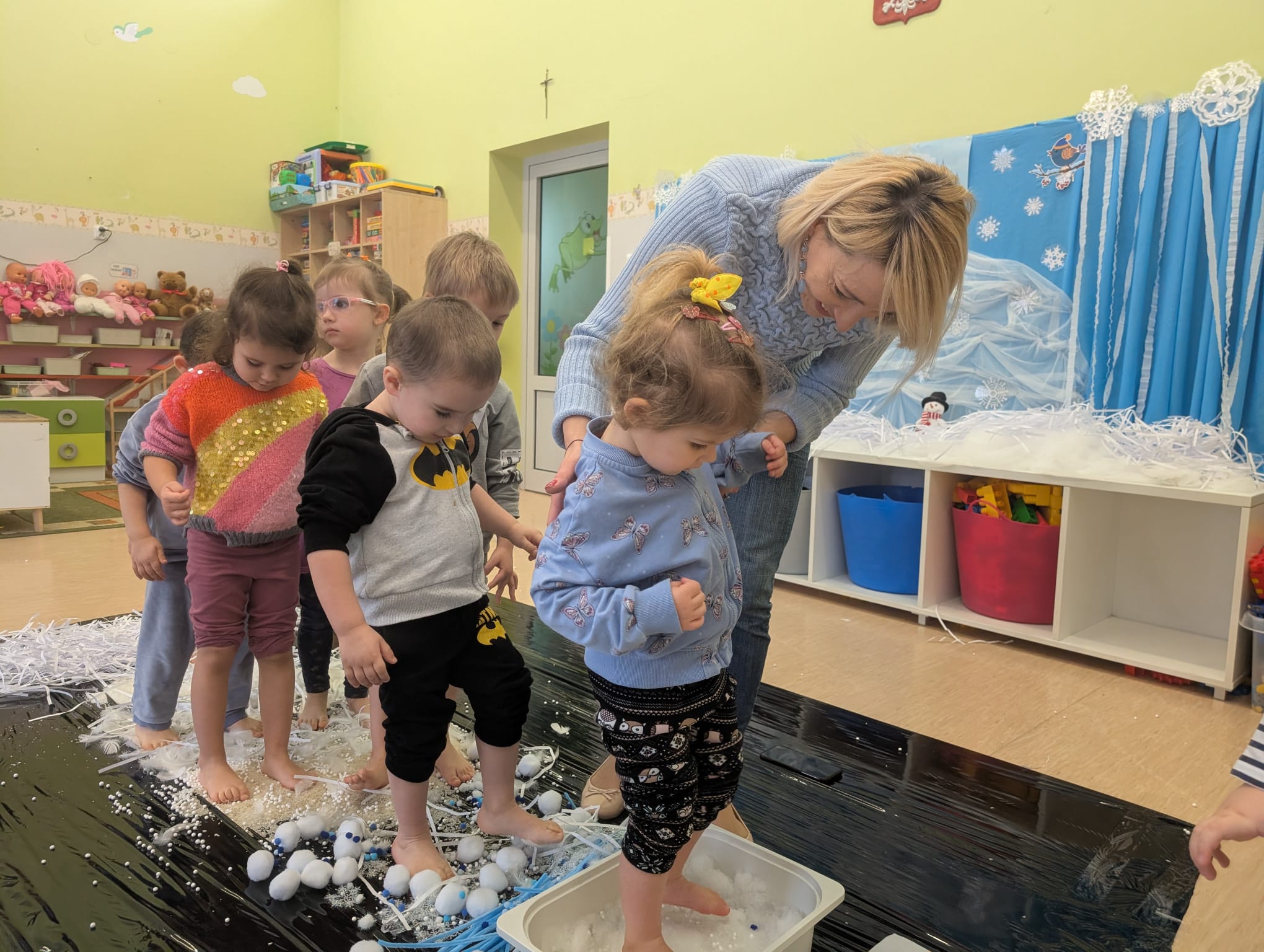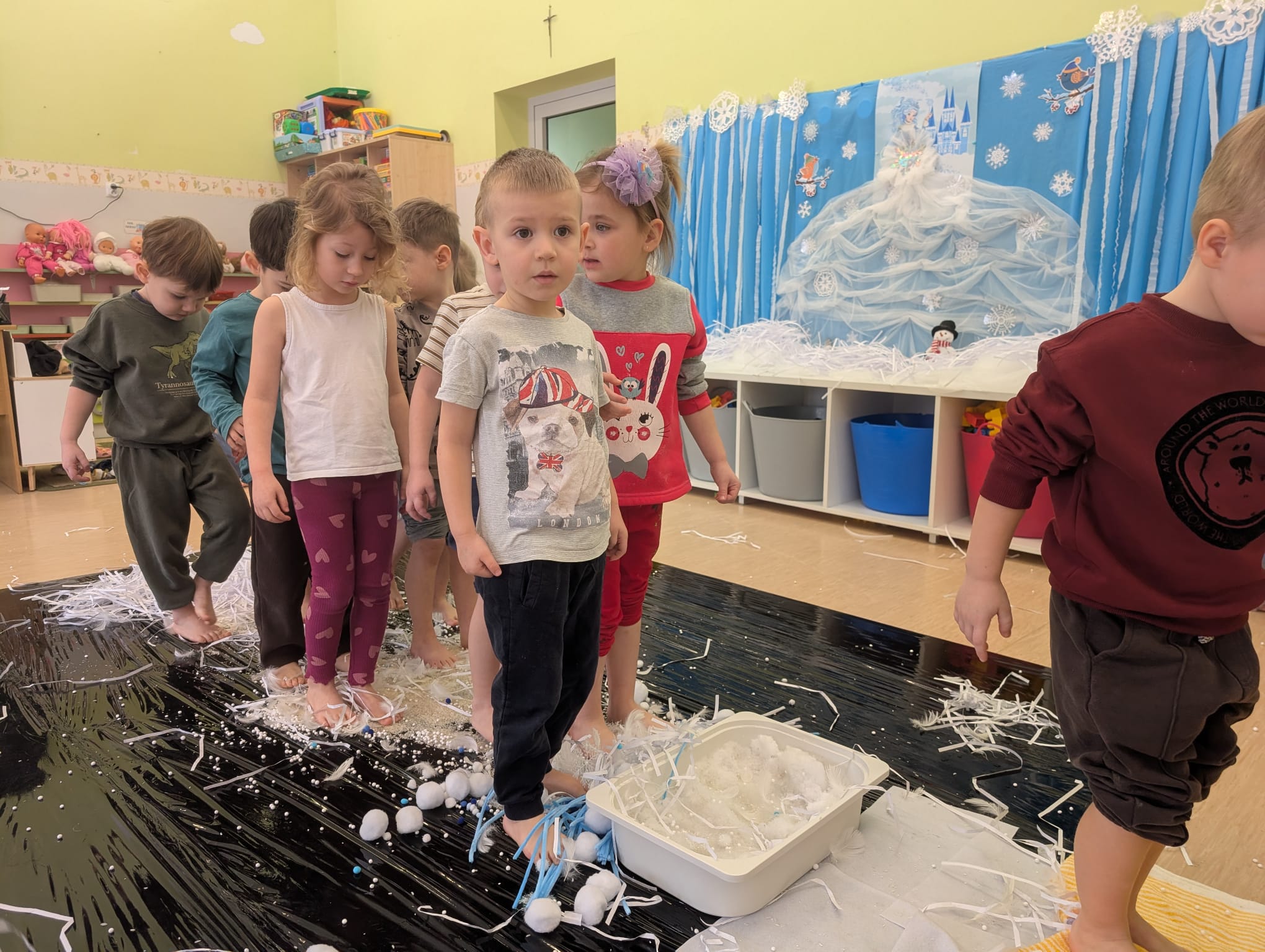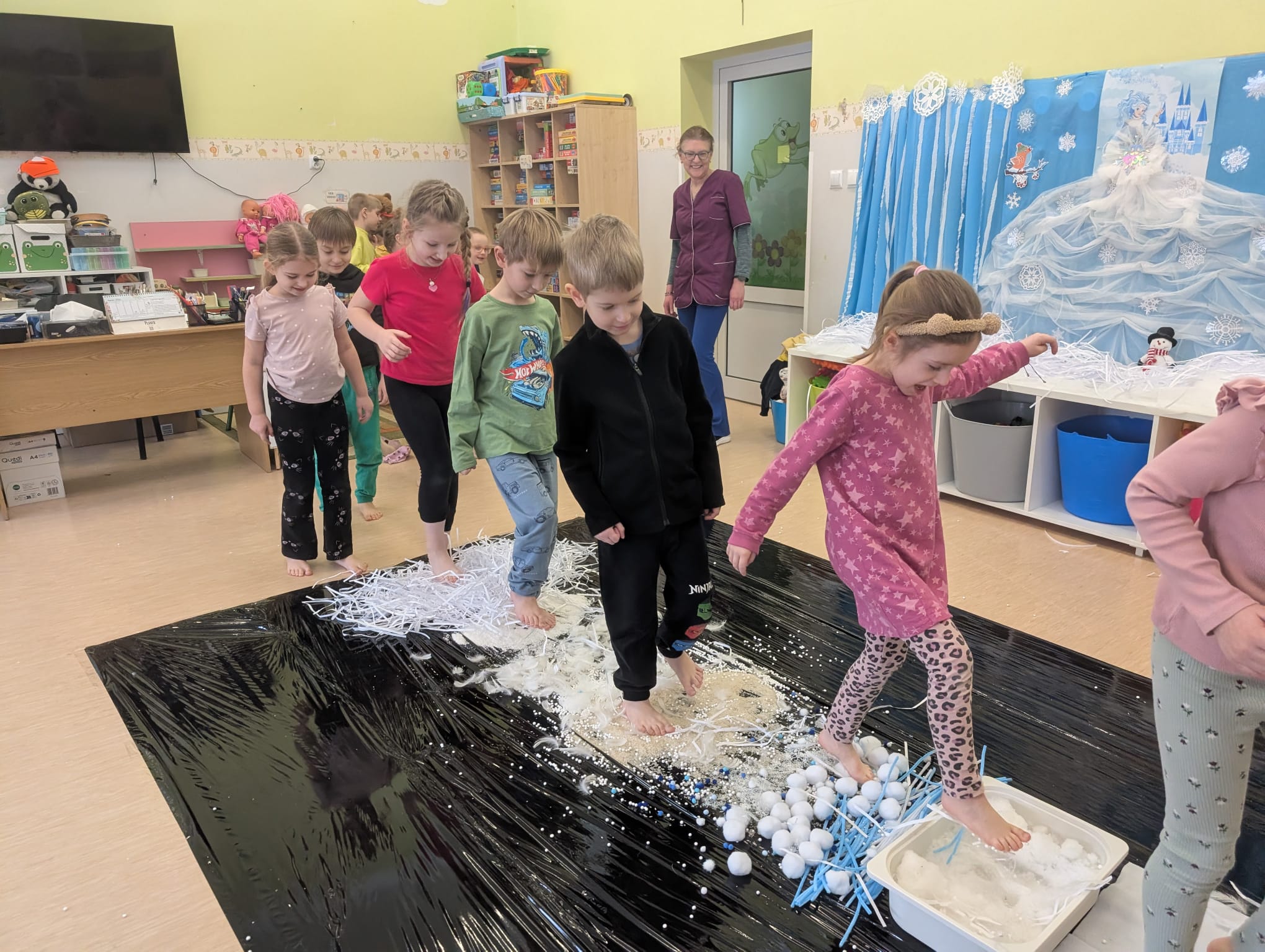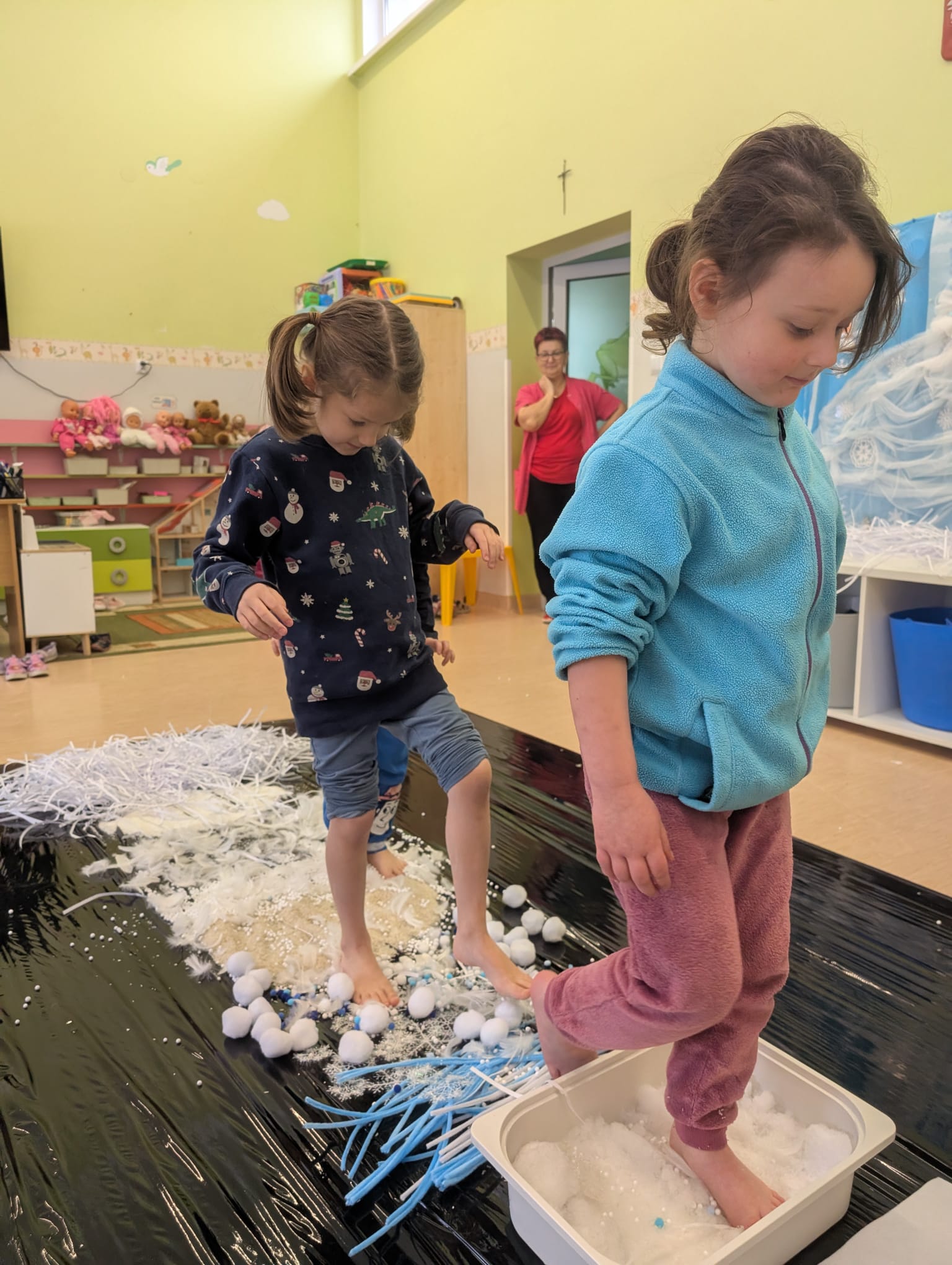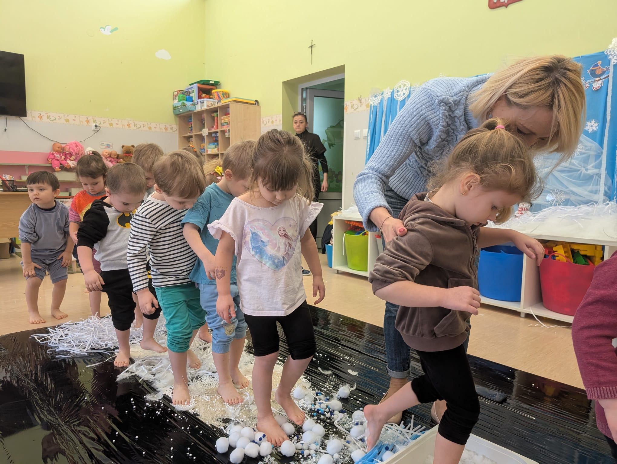W tej grupie królowały dźwięki! Dzieci wsłuchiwały się w odgłosy zimy, śpiewały zimowe piosenki i muzykowały przy użyciu instrumentów domowej roboty. Prawdziwym hitem okazała się sensoryczna ścieżka muzyczna, która pozwoliła przedszkolakom „wychodzić” rytm zimy.