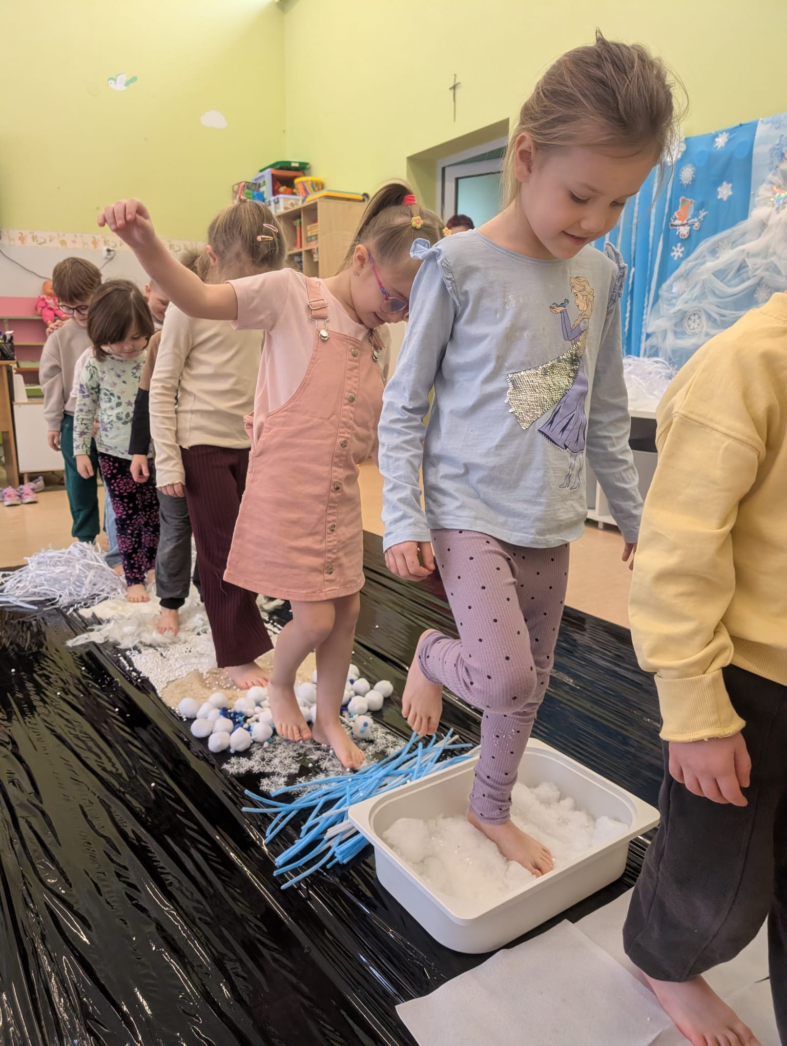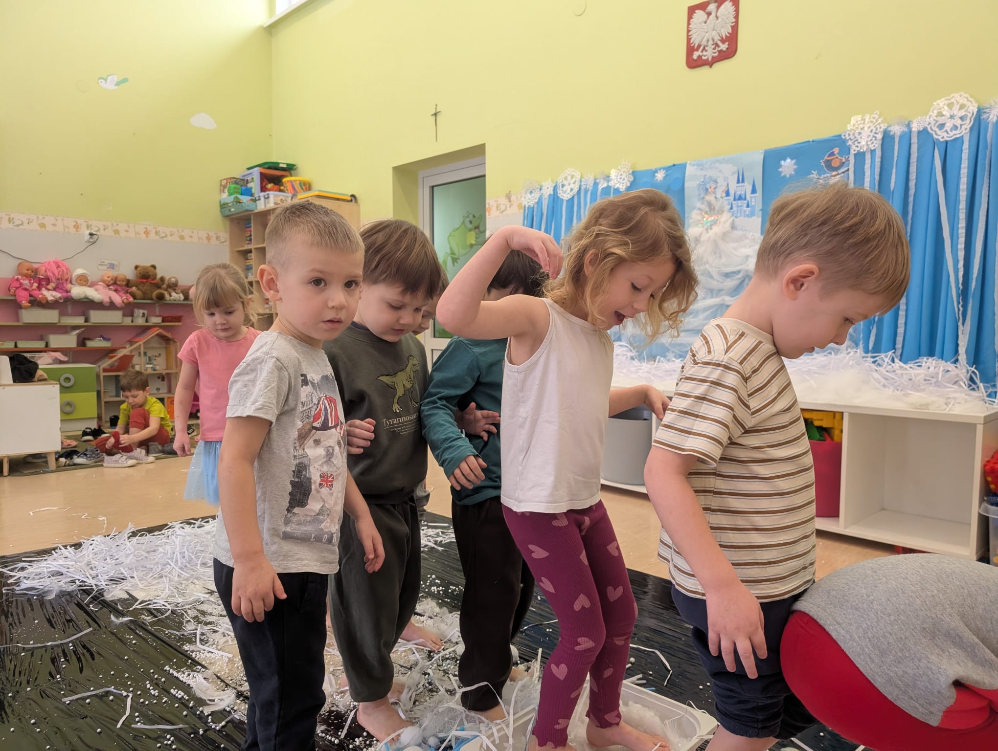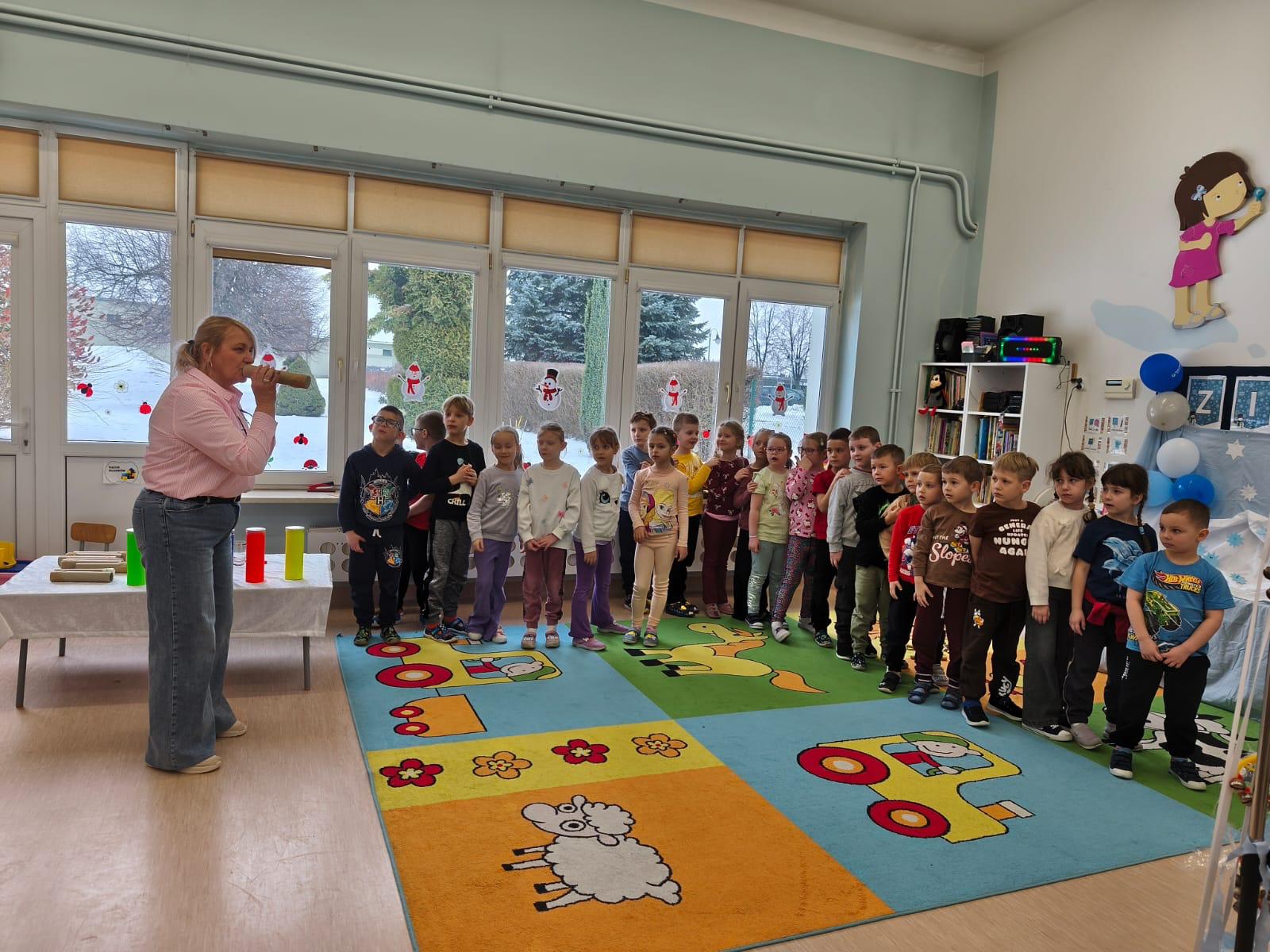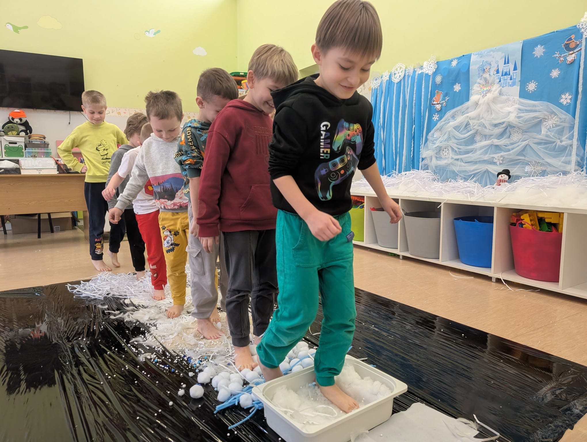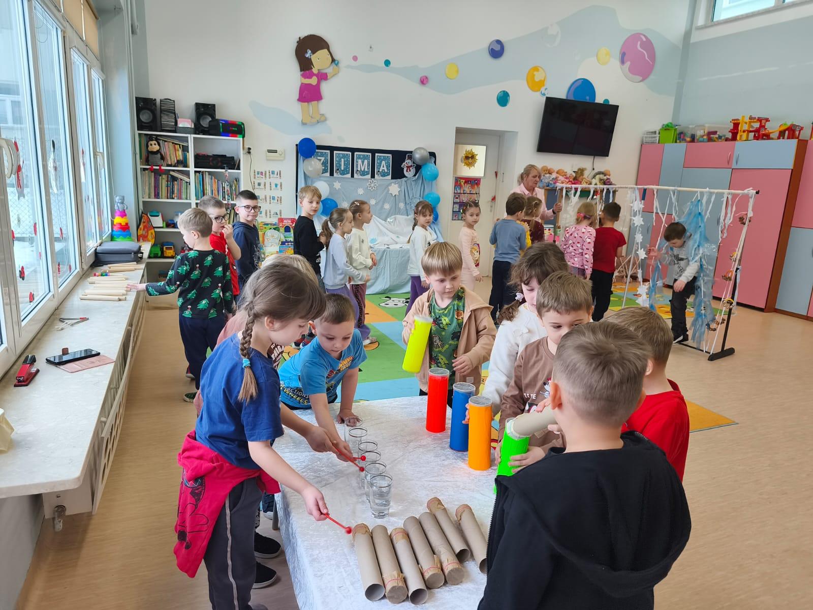 W tej grupie królowały dźwięki! Dzieci wsłuchiwały się w odgłosy zimy, śpiewały zimowe piosenki i muzykowały przy użyciu instrumentów domowej roboty. Prawdziwym hitem okazała się sensoryczna ścieżka muzyczna, która pozwoliła przedszkolakom „wychodzić” rytm zimy.