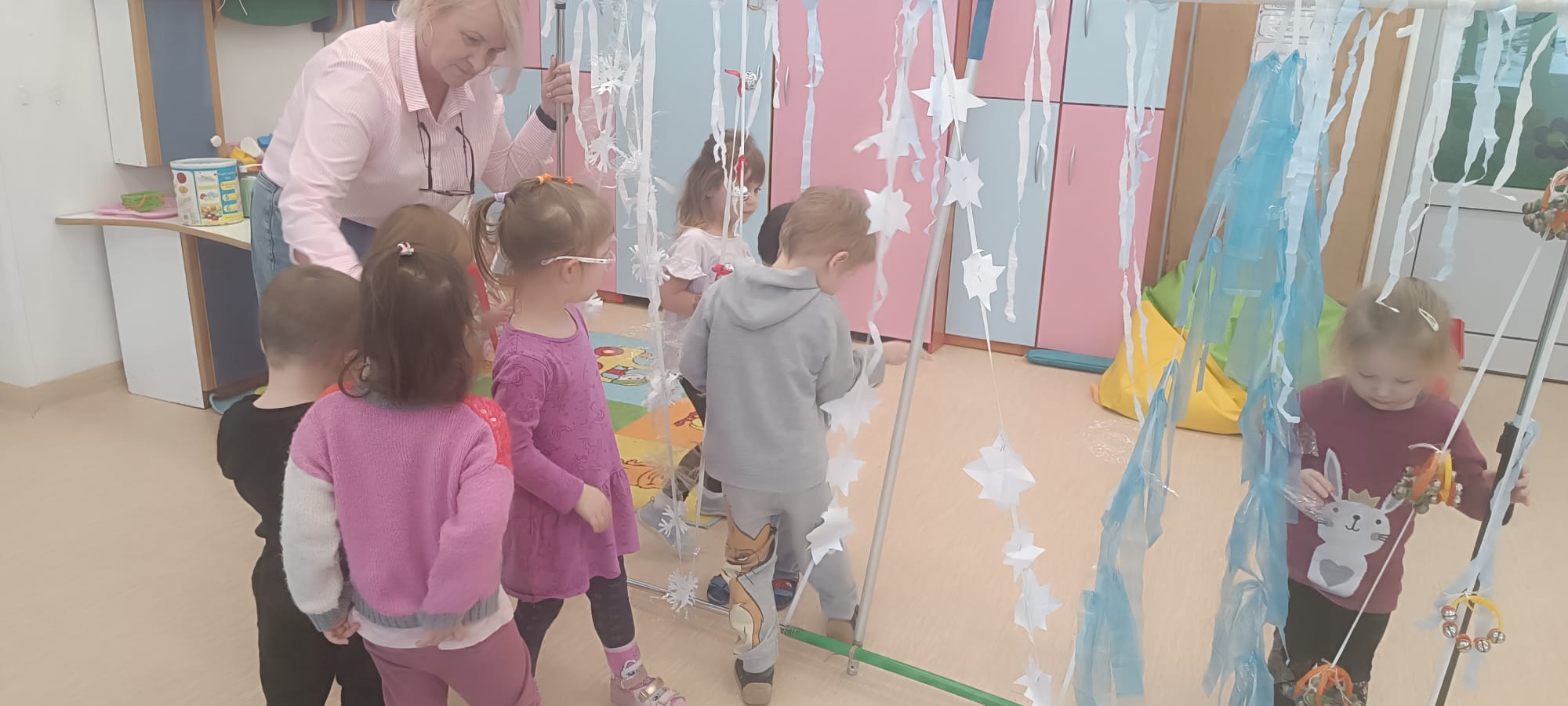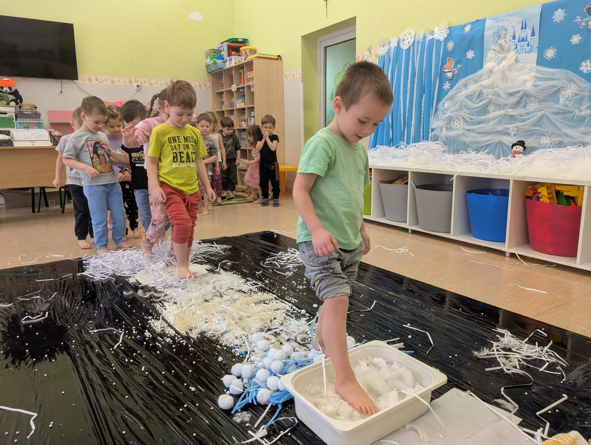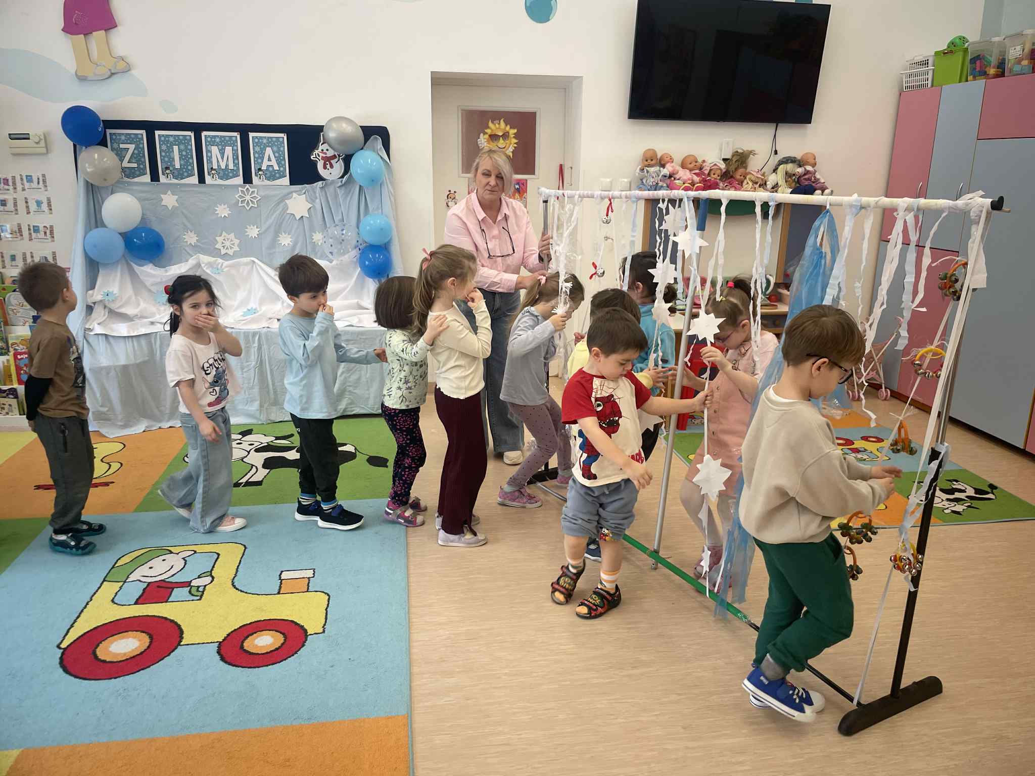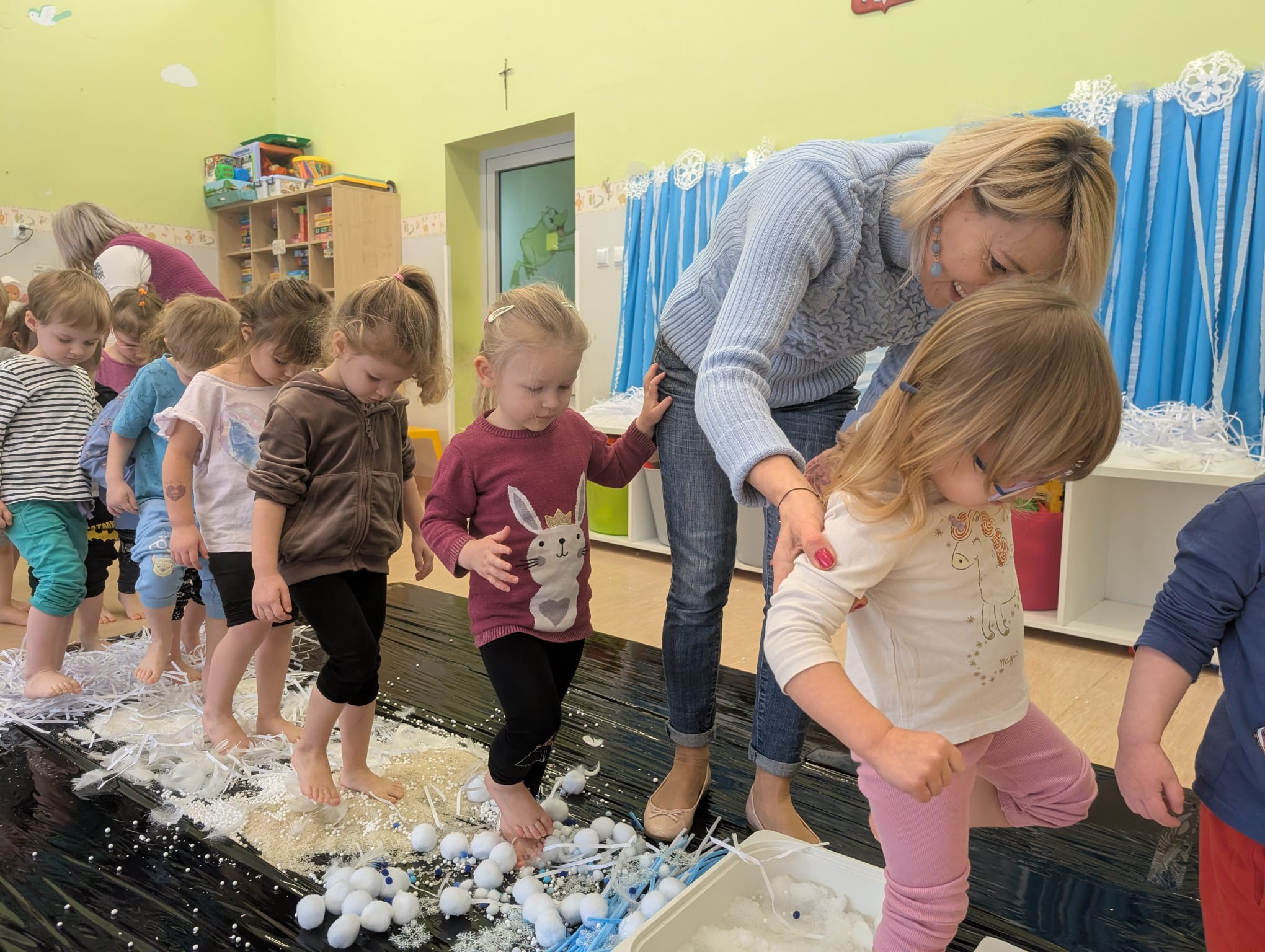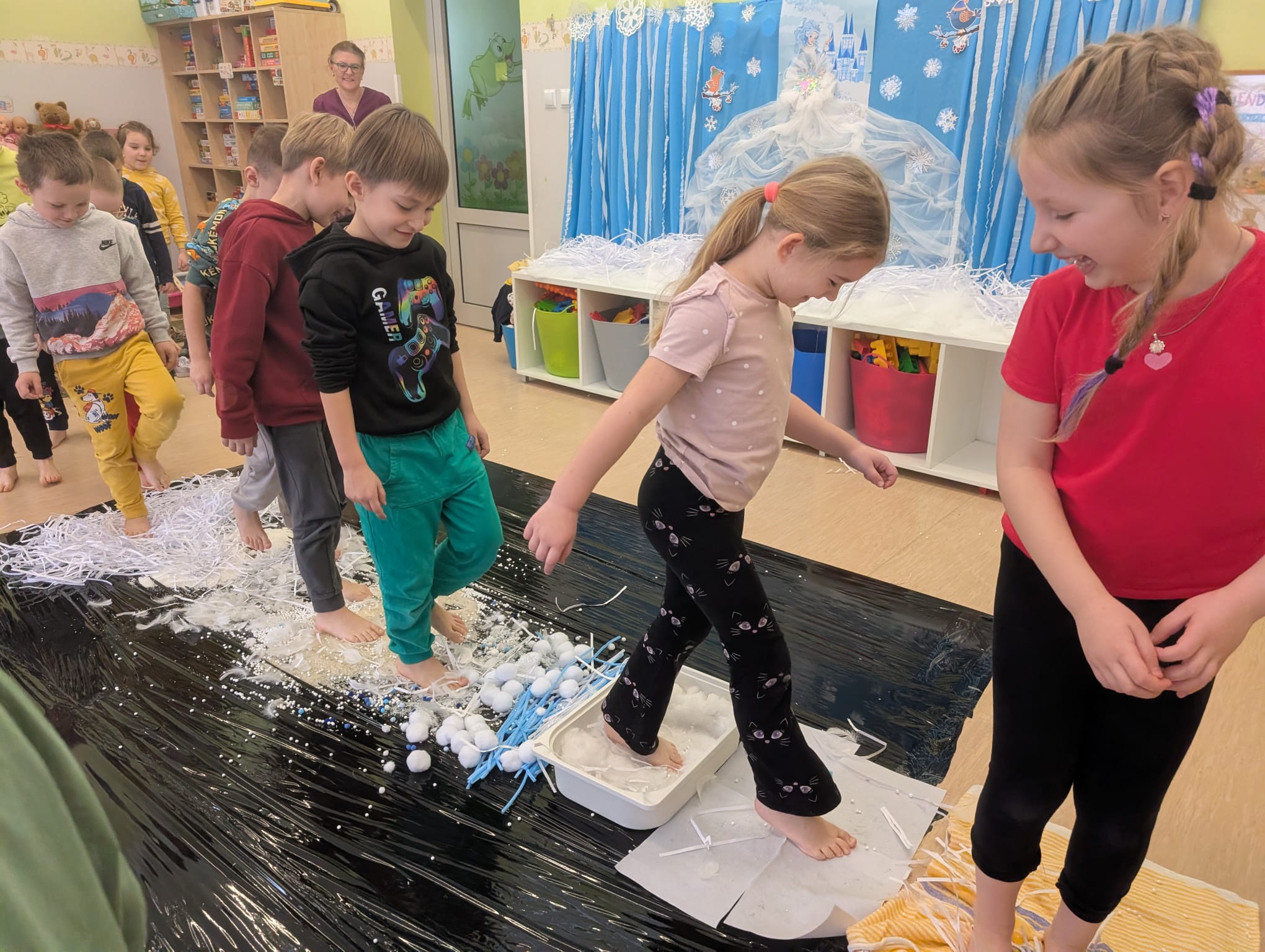 W tej grupie królowały dźwięki! Dzieci wsłuchiwały się w odgłosy zimy, śpiewały zimowe piosenki i muzykowały przy użyciu instrumentów domowej roboty. Prawdziwym hitem okazała się sensoryczna ścieżka muzyczna, która pozwoliła przedszkolakom „wychodzić” rytm zimy.