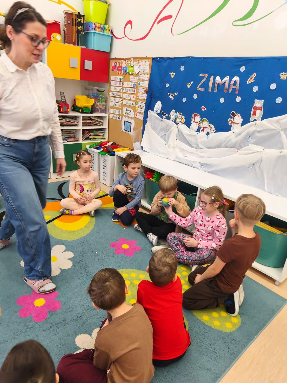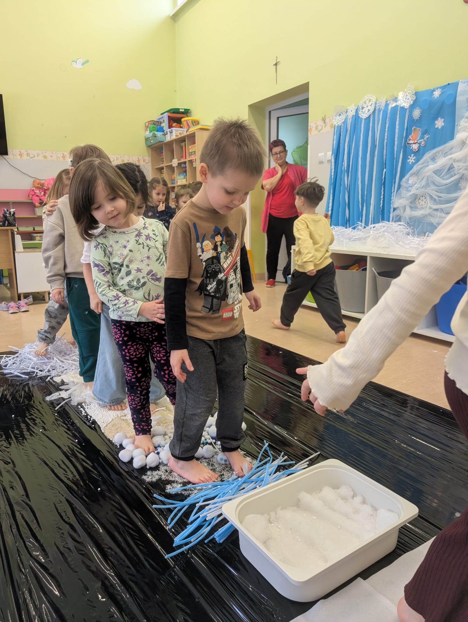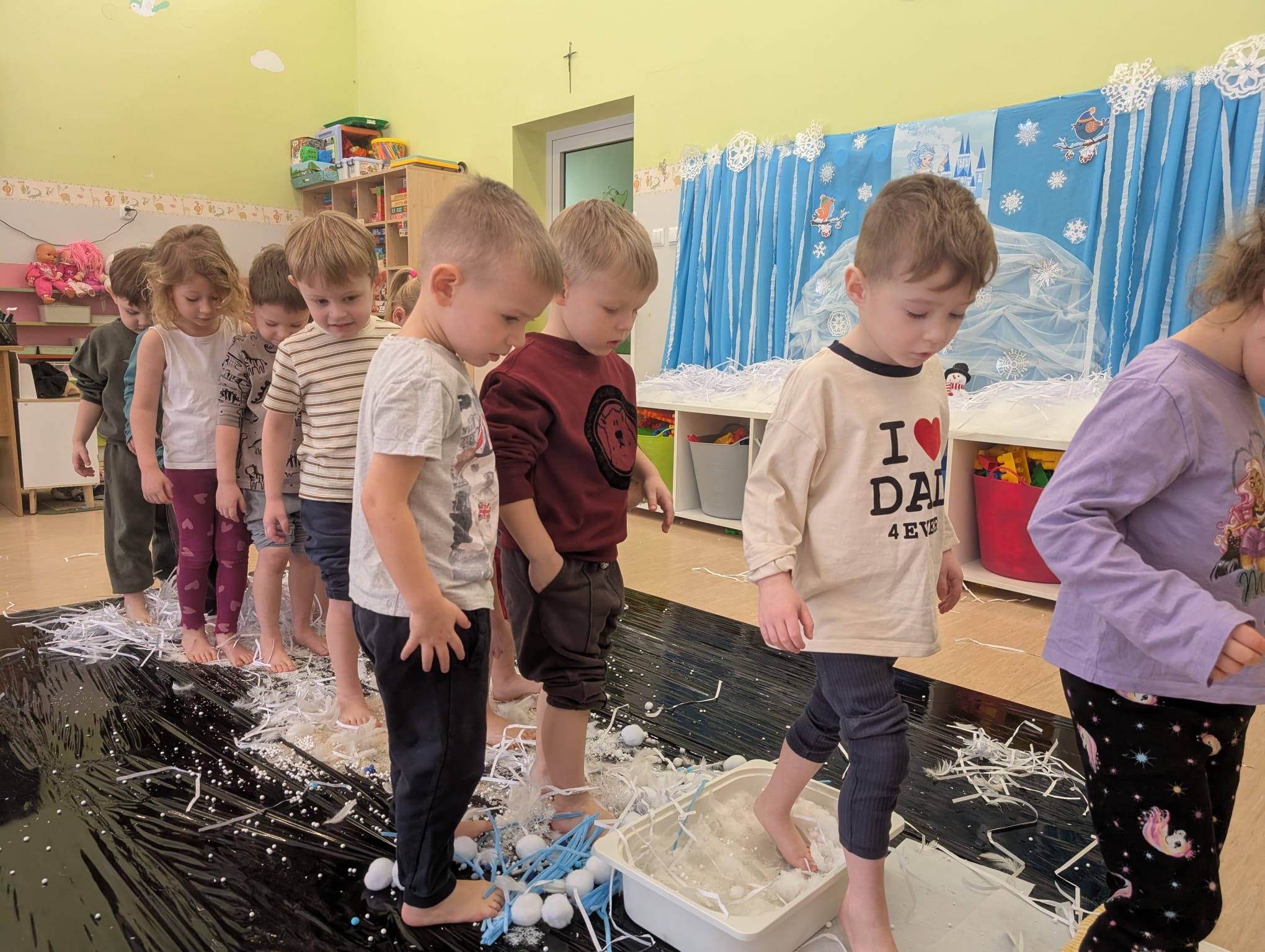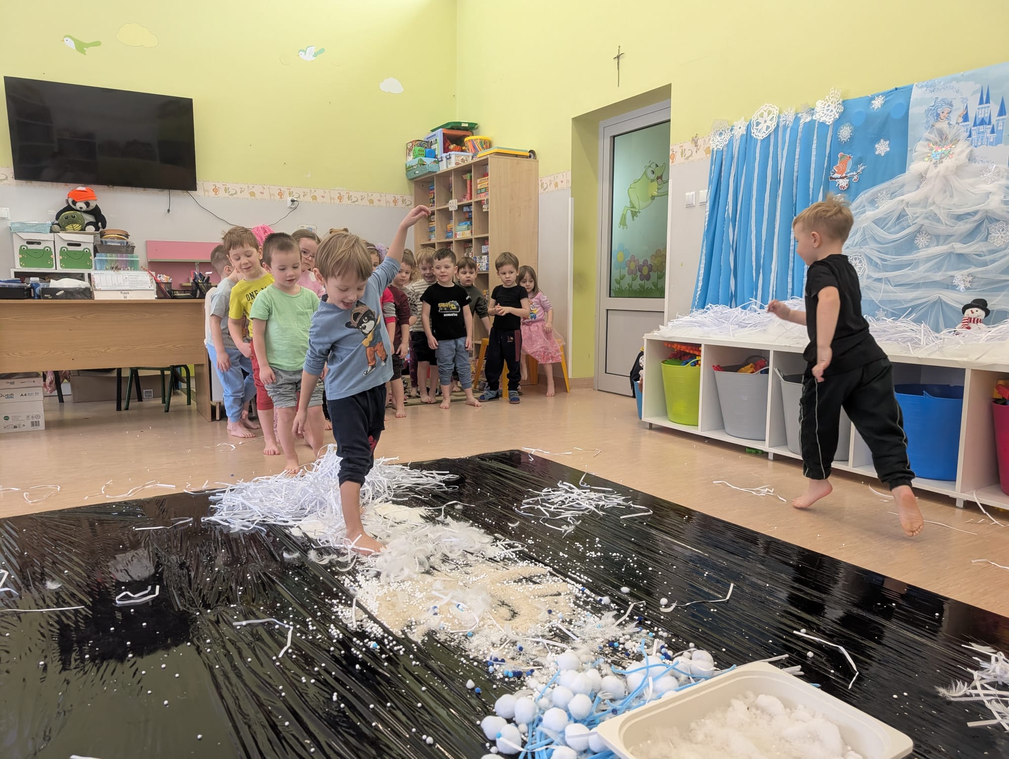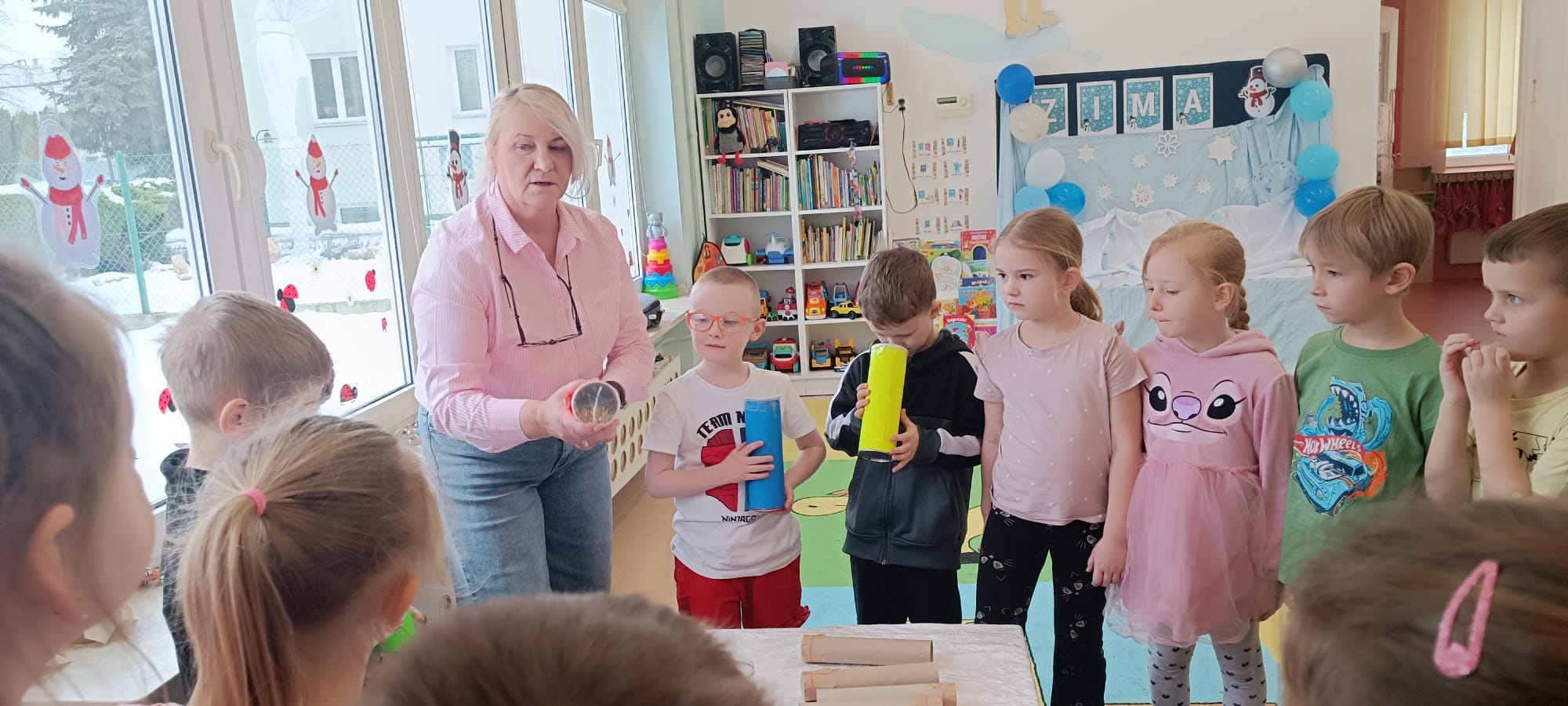 W tej grupie królowały dźwięki! Dzieci wsłuchiwały się w odgłosy zimy, śpiewały zimowe piosenki i muzykowały przy użyciu instrumentów domowej roboty. Prawdziwym hitem okazała się sensoryczna ścieżka muzyczna, która pozwoliła przedszkolakom „wychodzić” rytm zimy.