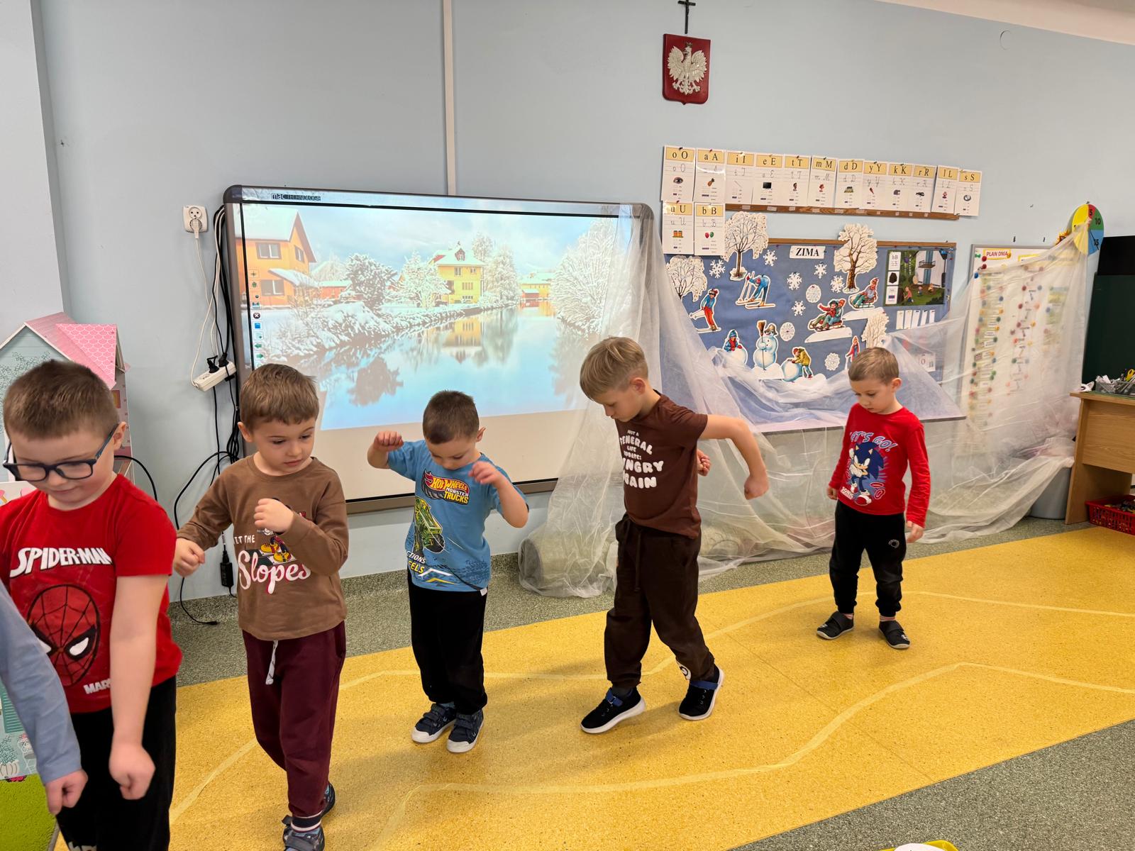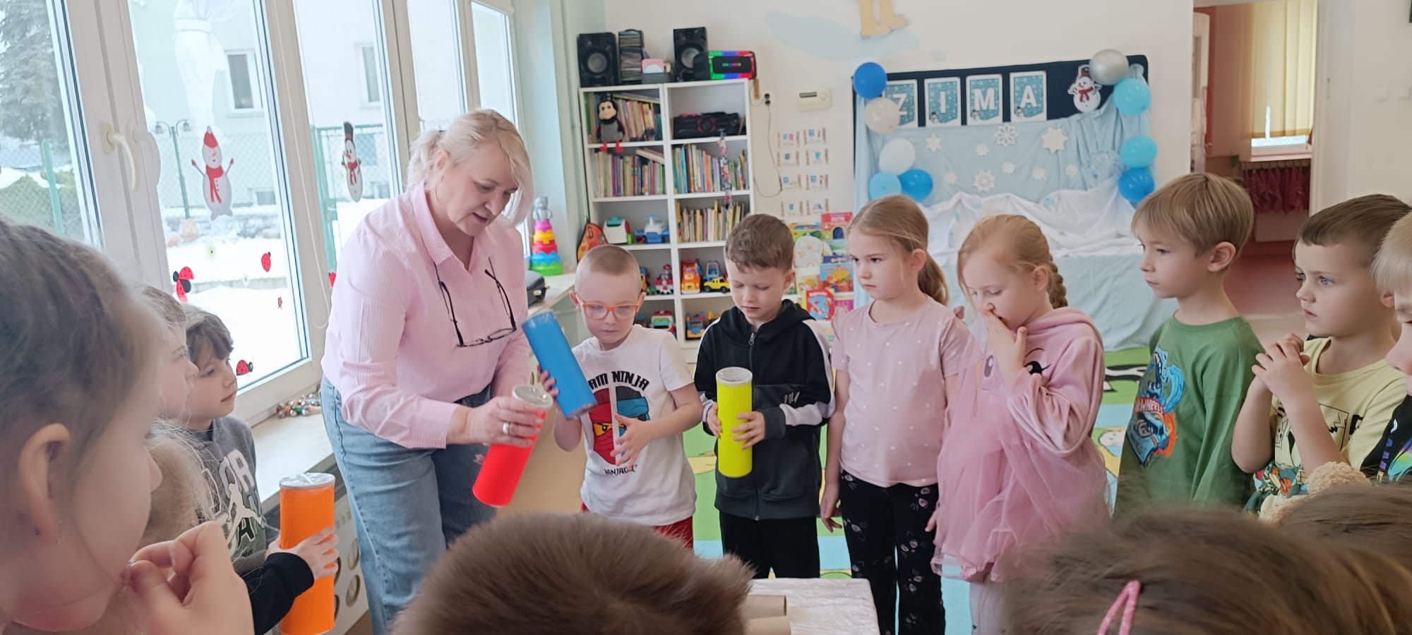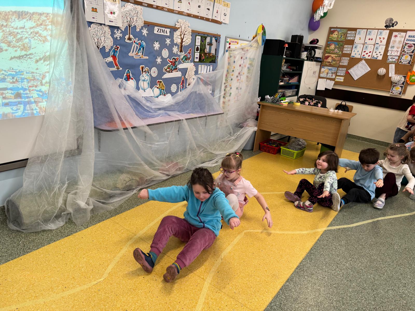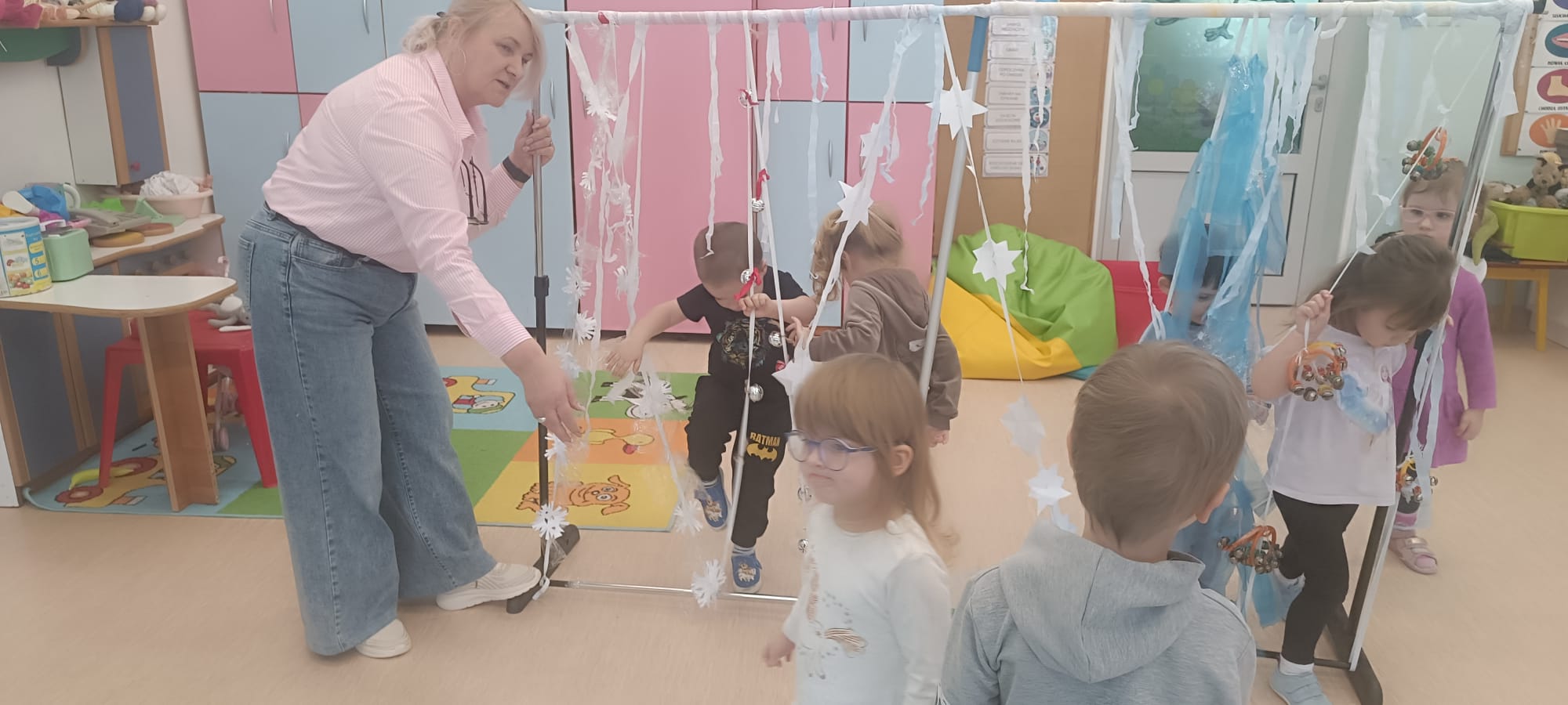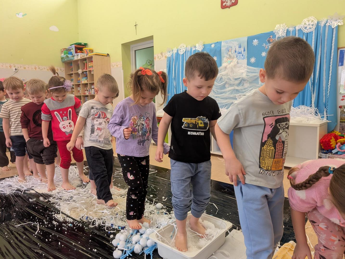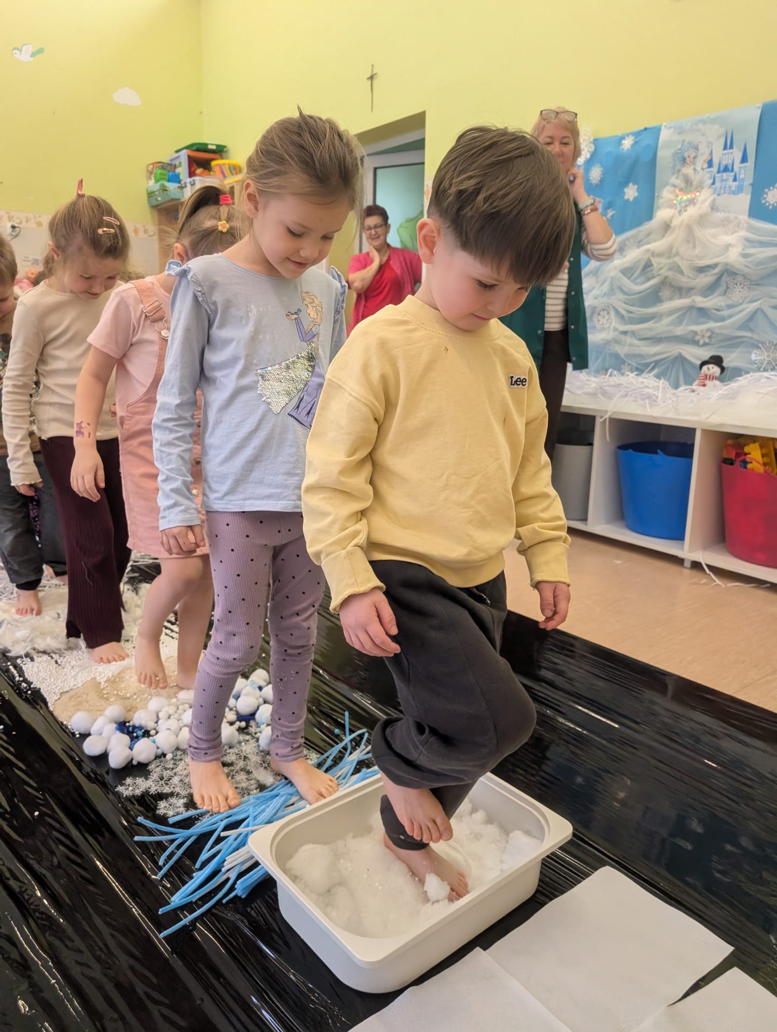W tej grupie królowały dźwięki! Dzieci wsłuchiwały się w odgłosy zimy, śpiewały zimowe piosenki i muzykowały przy użyciu instrumentów domowej roboty. Prawdziwym hitem okazała się sensoryczna ścieżka muzyczna, która pozwoliła przedszkolakom „wychodzić” rytm zimy.