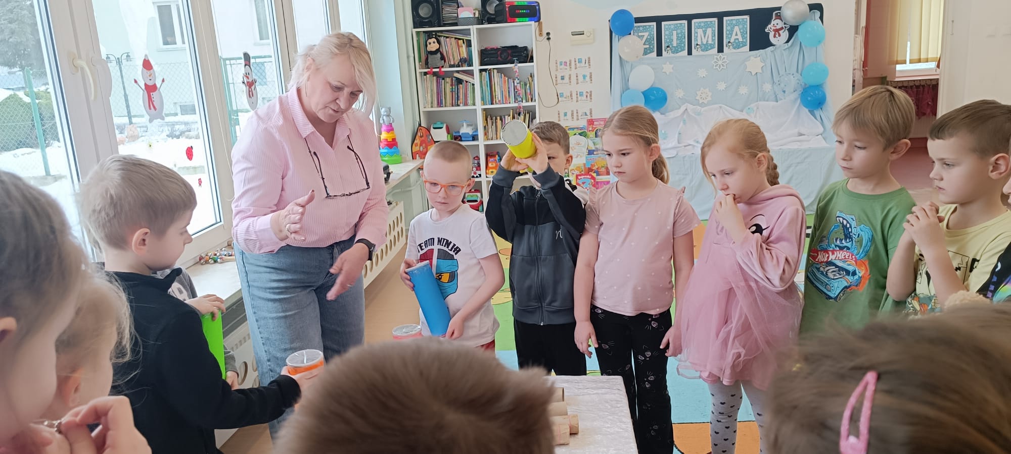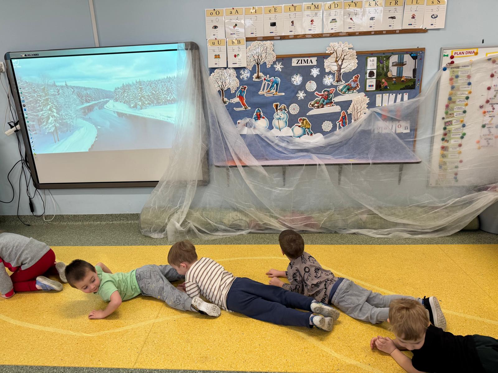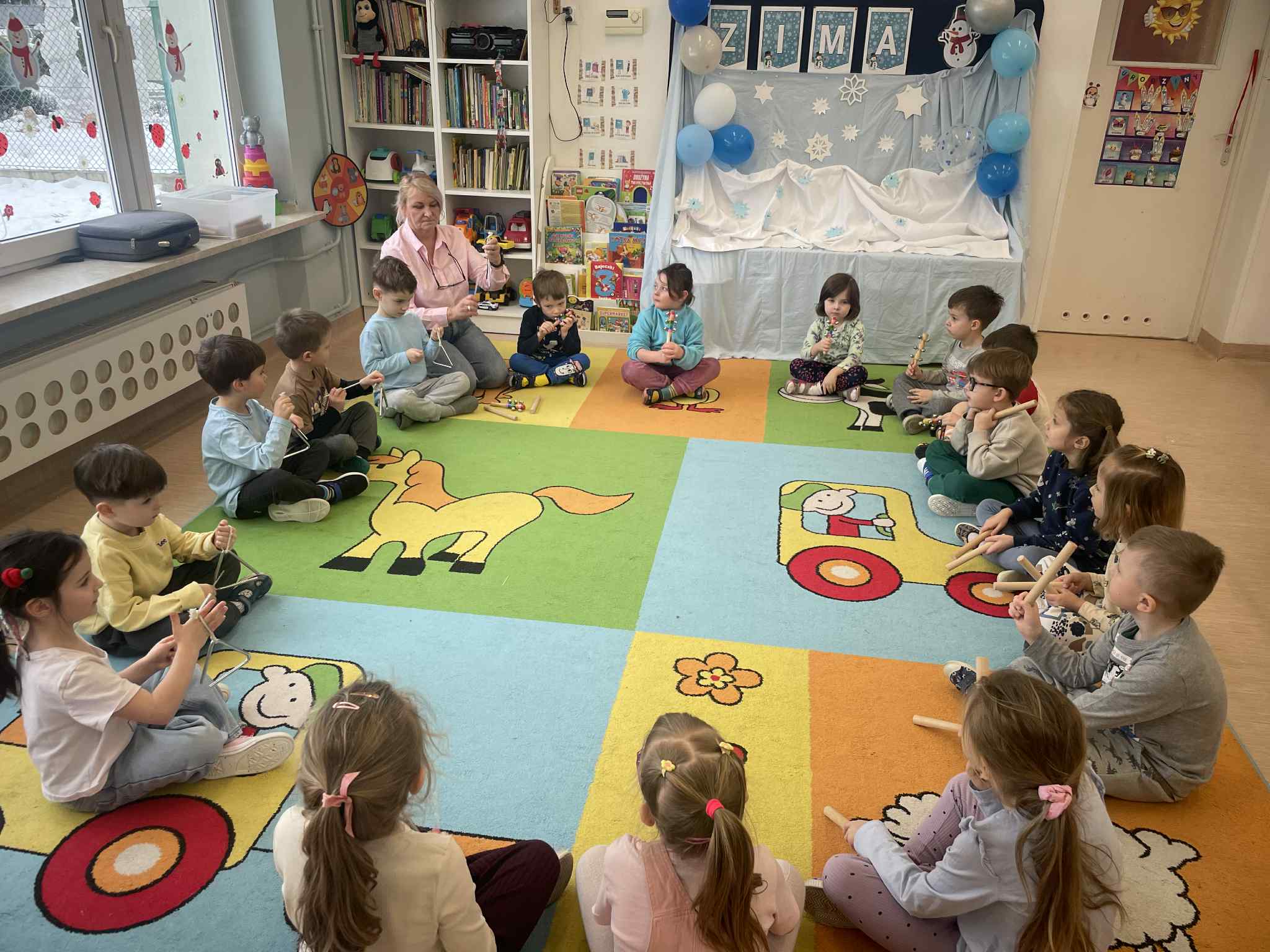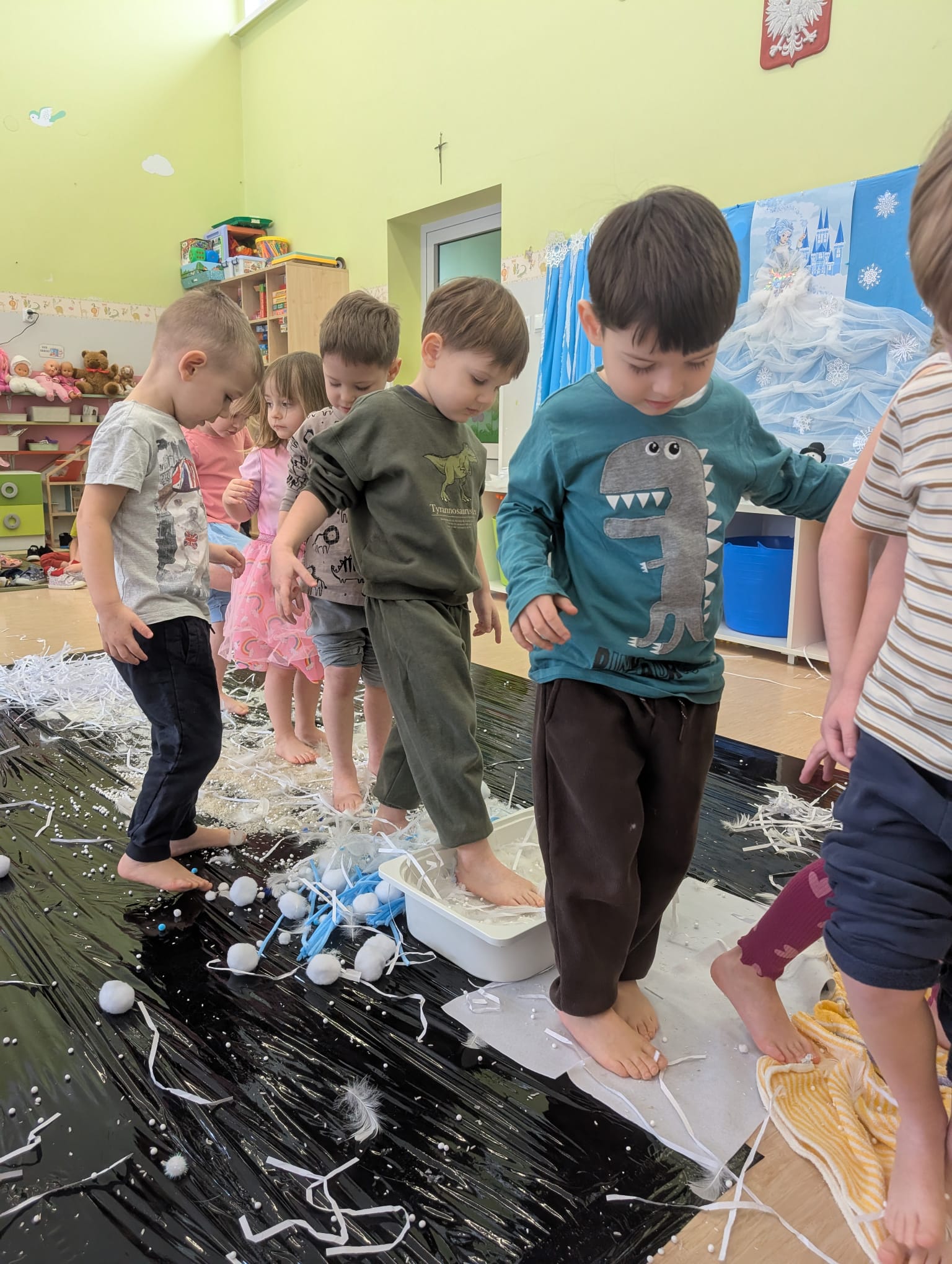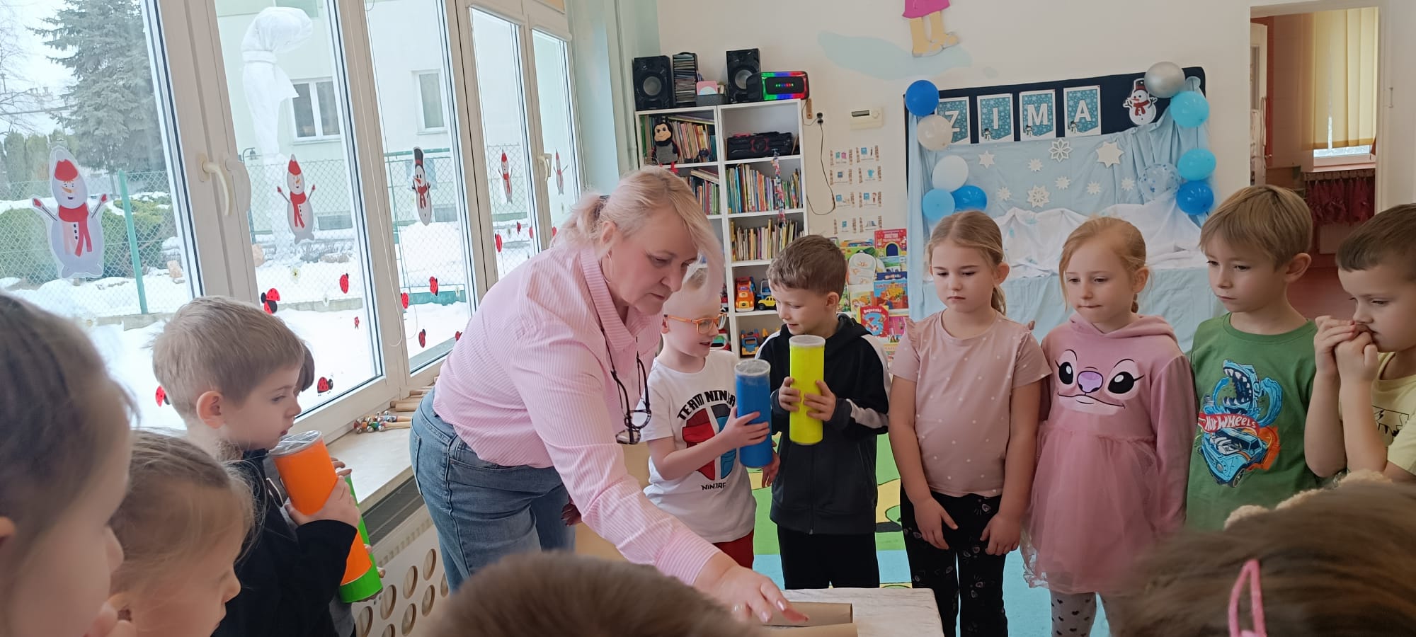 W tej grupie królowały dźwięki! Dzieci wsłuchiwały się w odgłosy zimy, śpiewały zimowe piosenki i muzykowały przy użyciu instrumentów domowej roboty. Prawdziwym hitem okazała się sensoryczna ścieżka muzyczna, która pozwoliła przedszkolakom „wychodzić” rytm zimy.