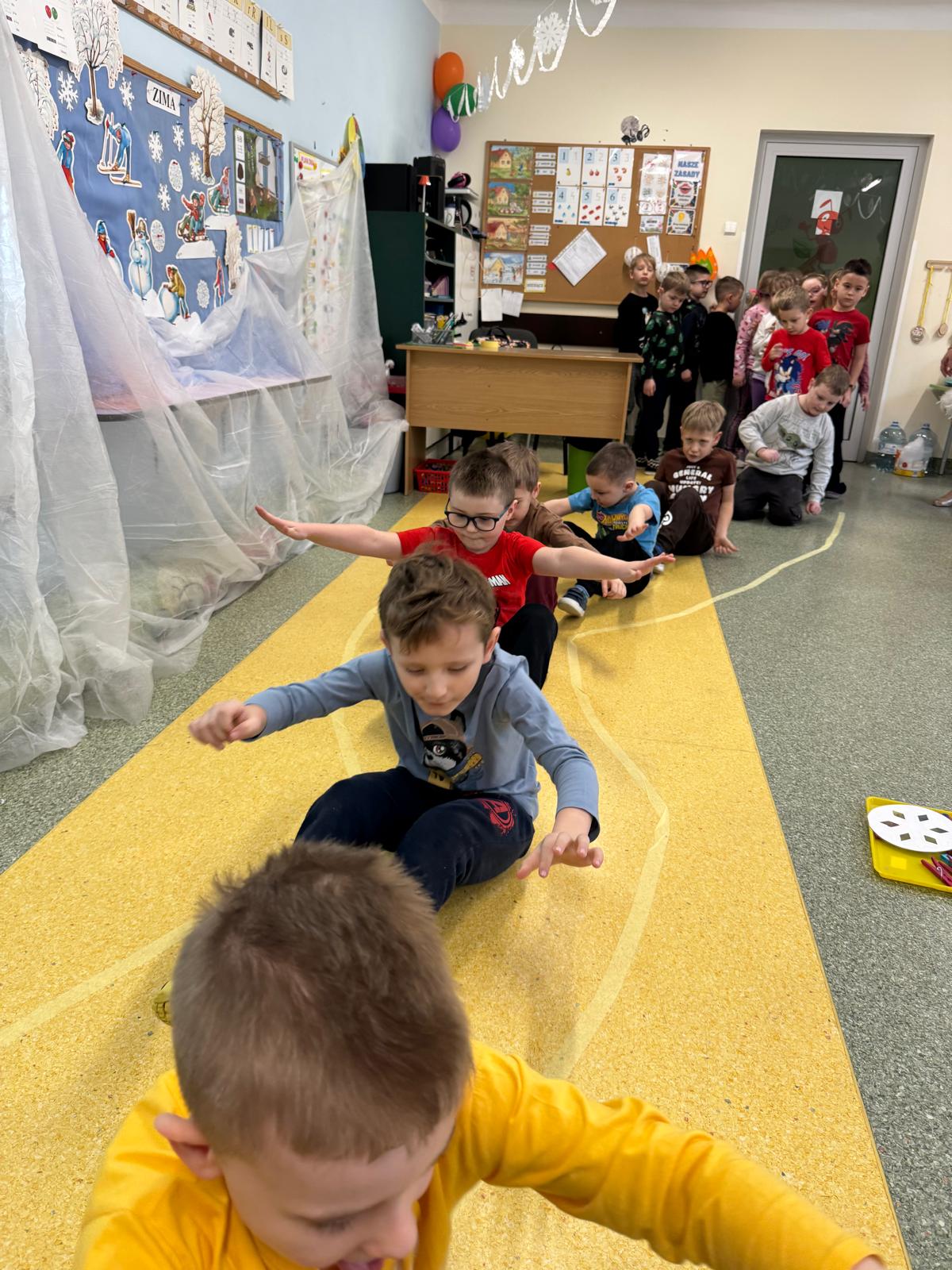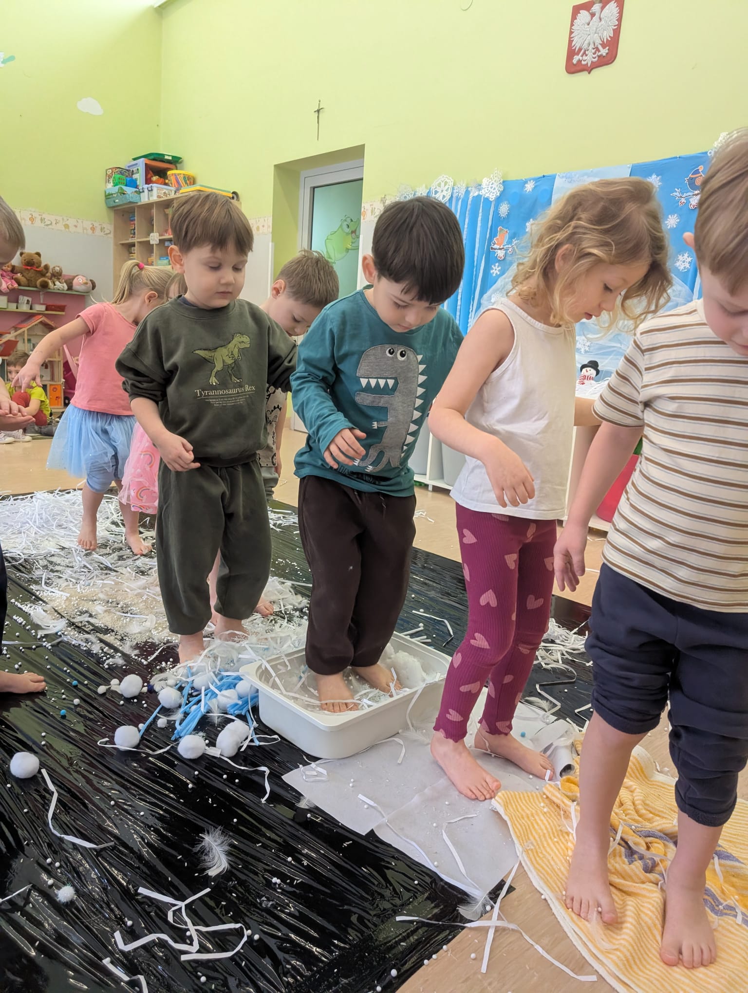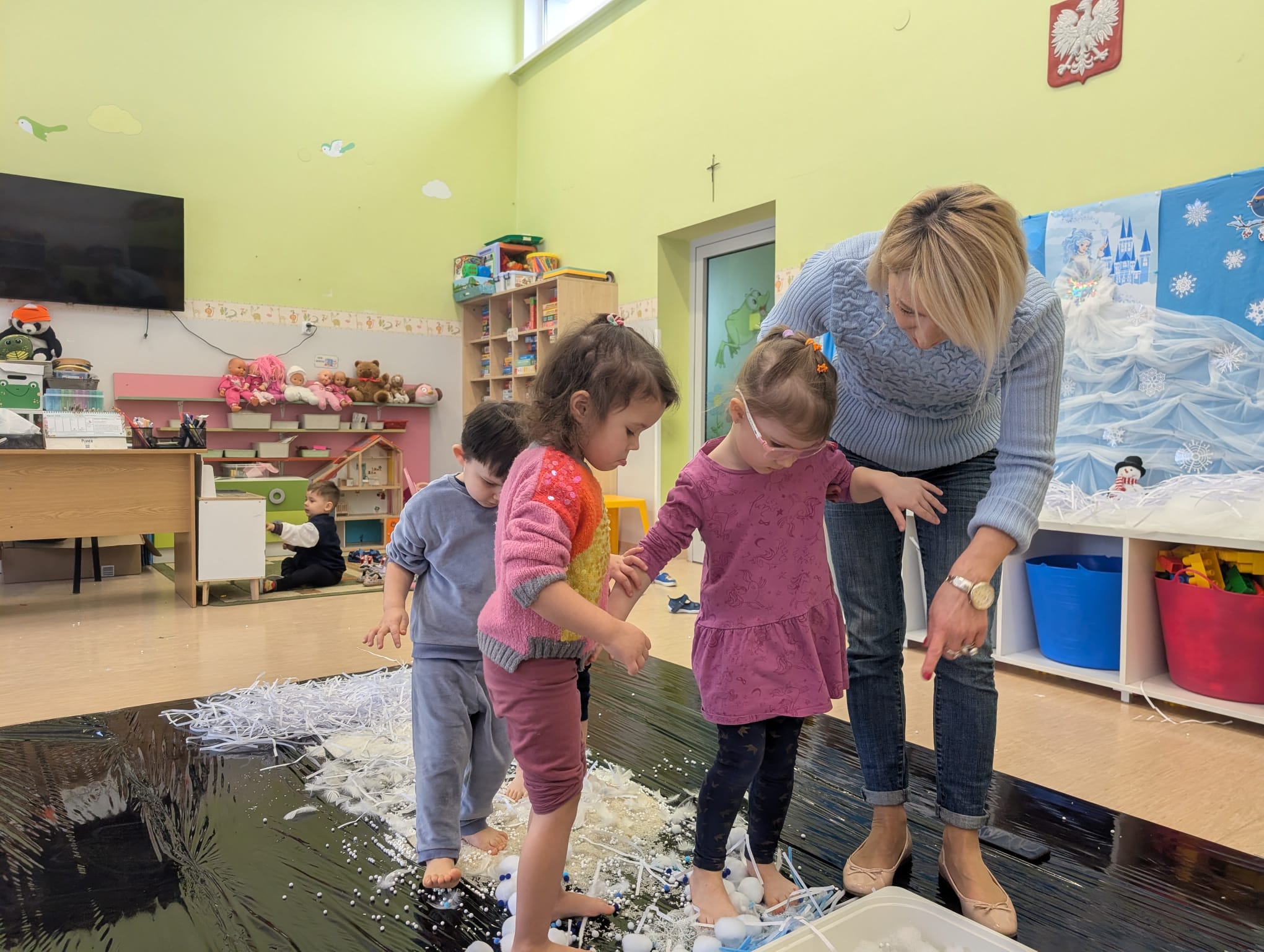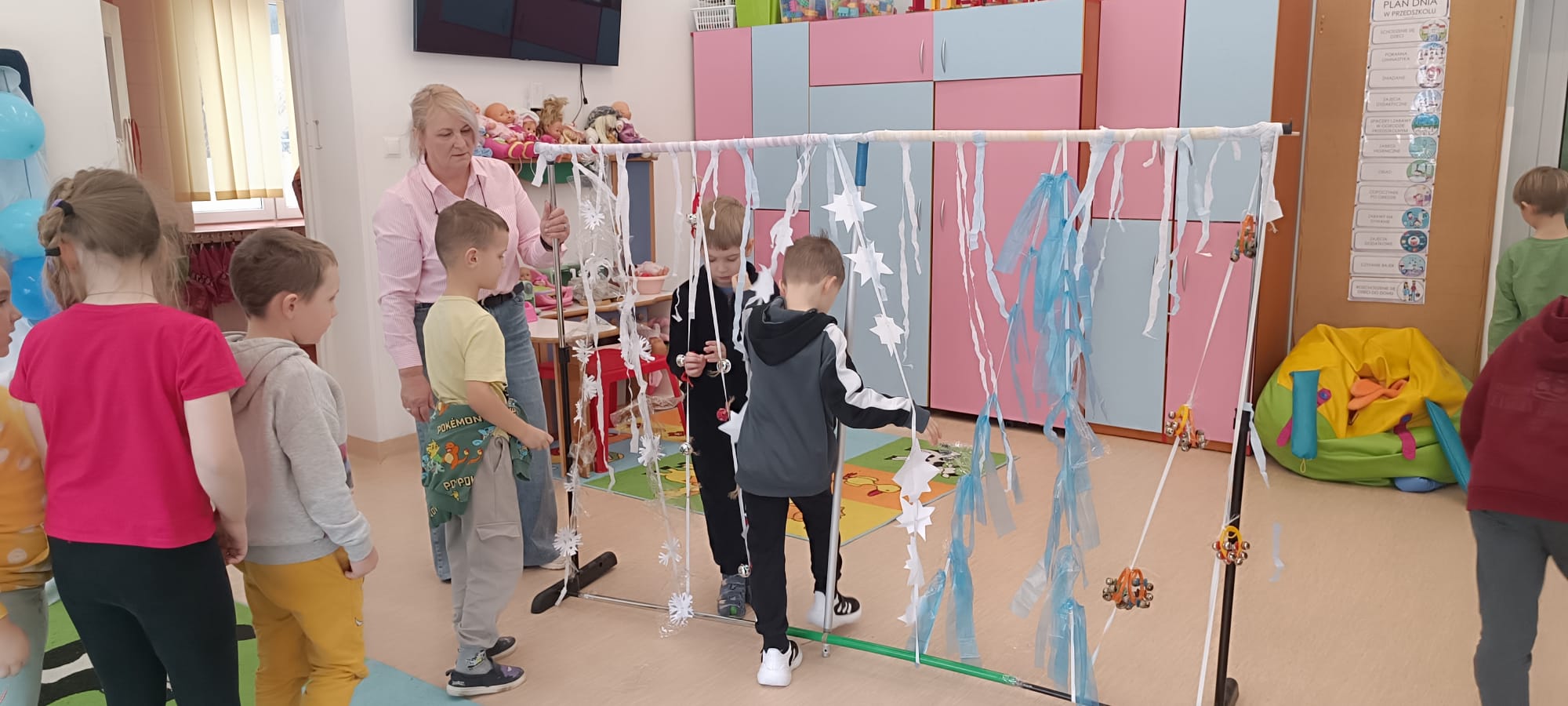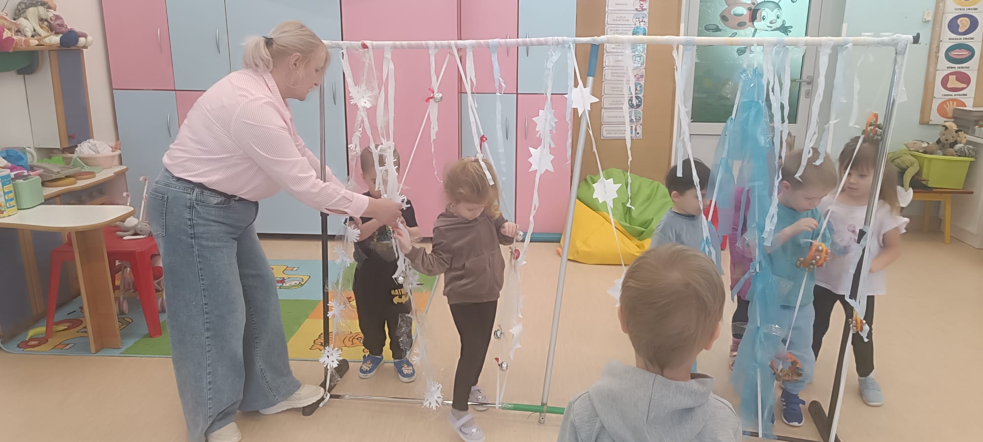 W tej grupie królowały dźwięki! Dzieci wsłuchiwały się w odgłosy zimy, śpiewały zimowe piosenki i muzykowały przy użyciu instrumentów domowej roboty. Prawdziwym hitem okazała się sensoryczna ścieżka muzyczna, która pozwoliła przedszkolakom „wychodzić” rytm zimy.