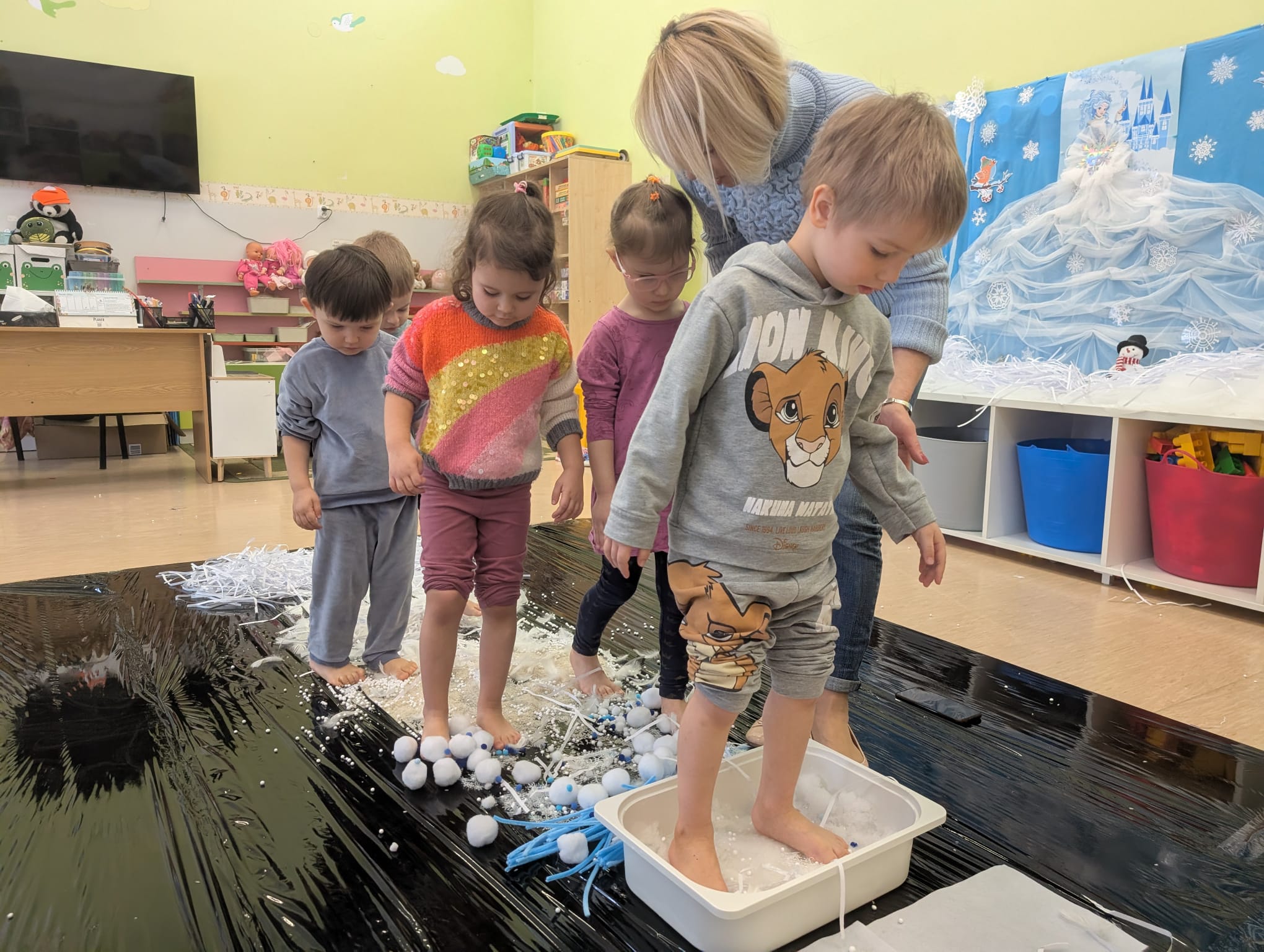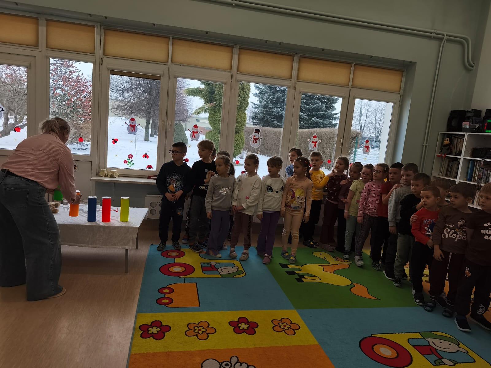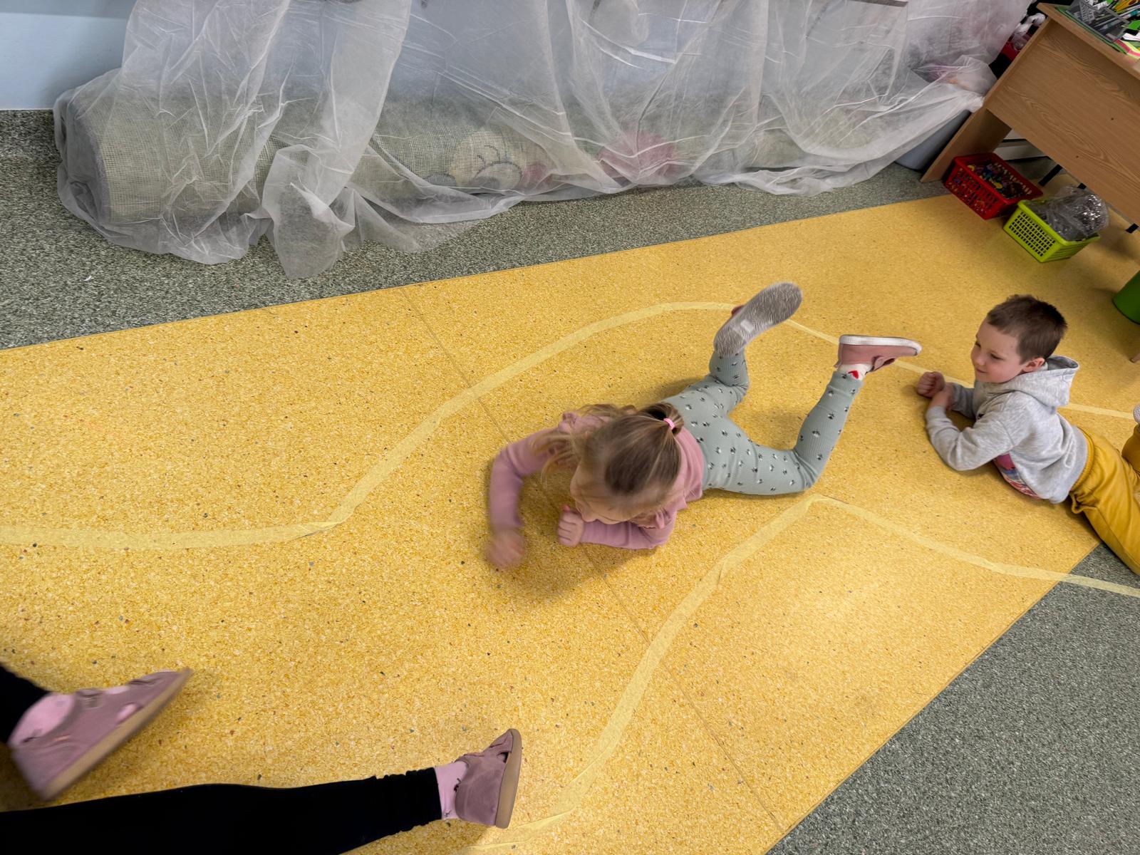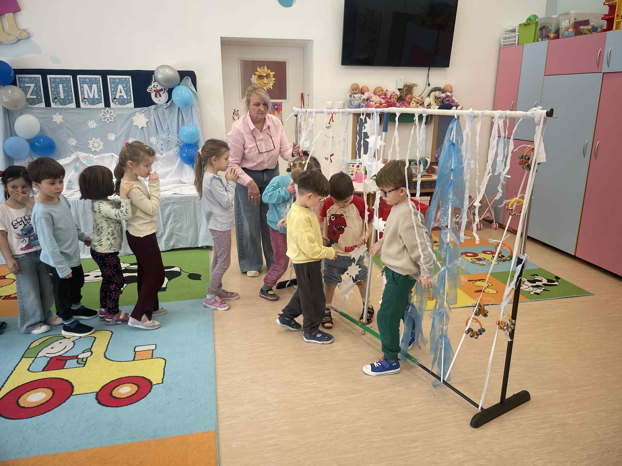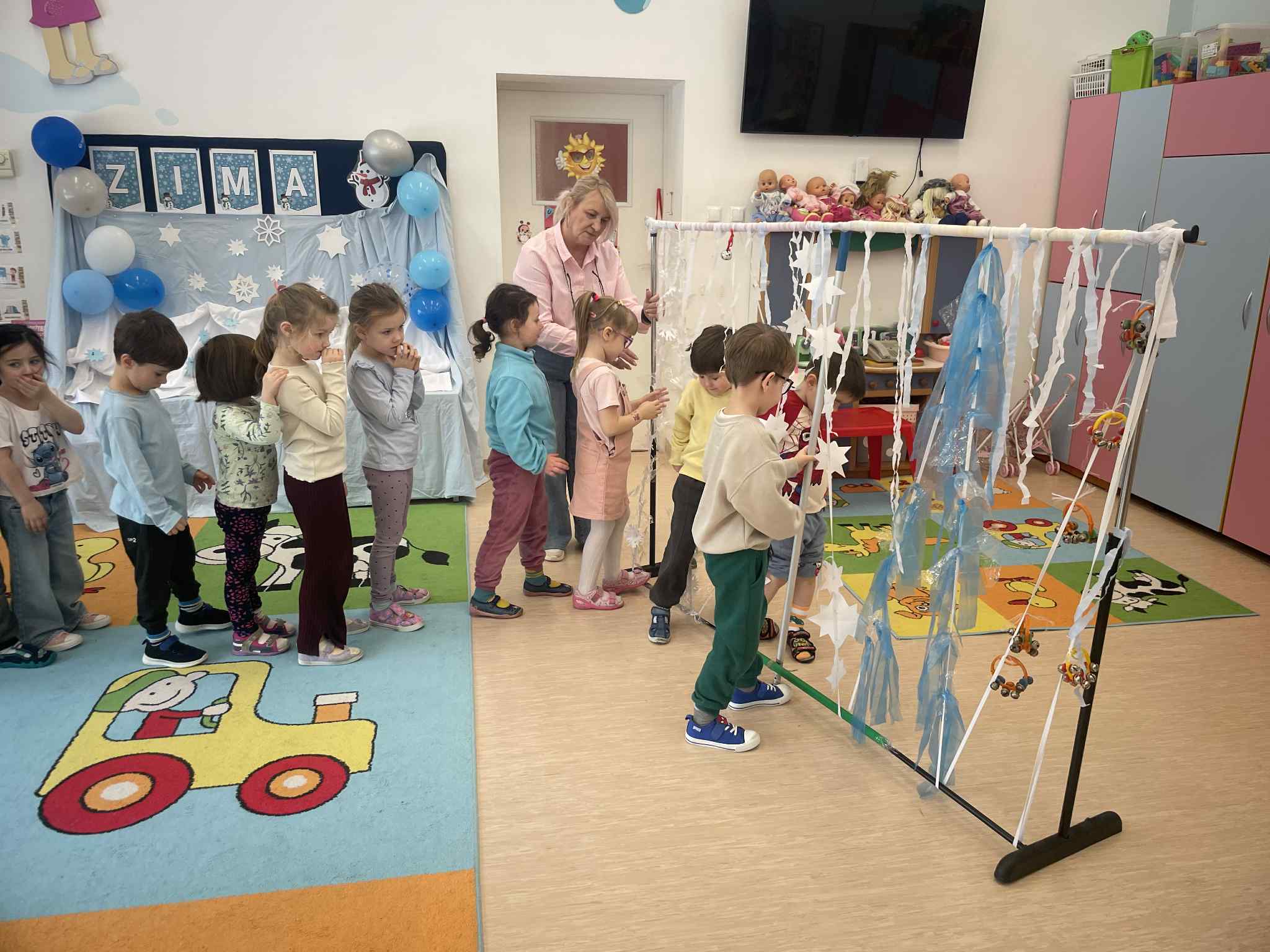W tej grupie królowały dźwięki! Dzieci wsłuchiwały się w odgłosy zimy, śpiewały zimowe piosenki i muzykowały przy użyciu instrumentów domowej roboty. Prawdziwym hitem okazała się sensoryczna ścieżka muzyczna, która pozwoliła przedszkolakom „wychodzić” rytm zimy.