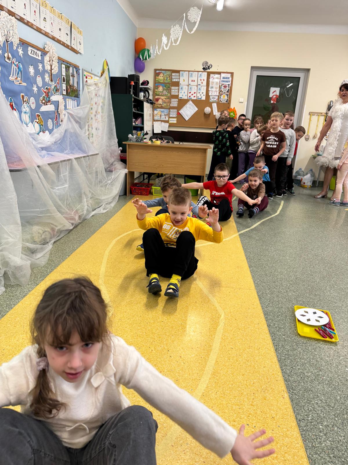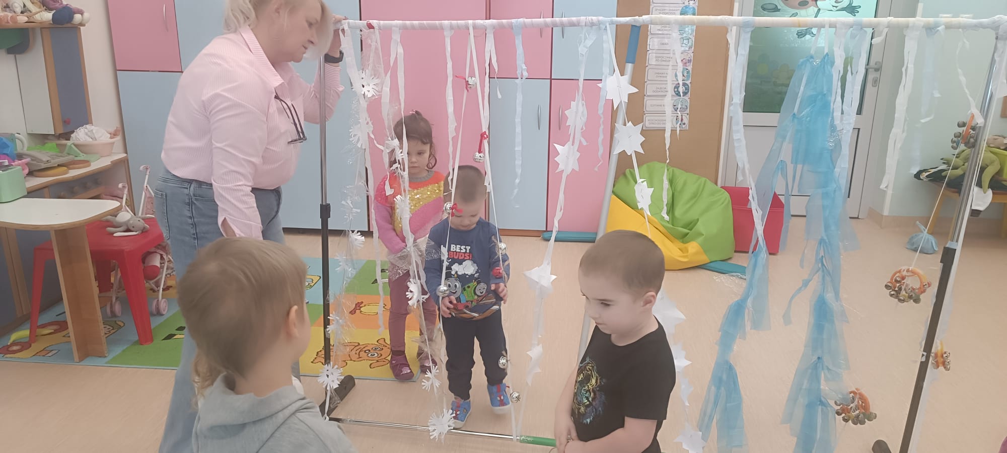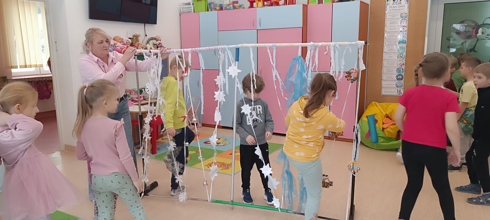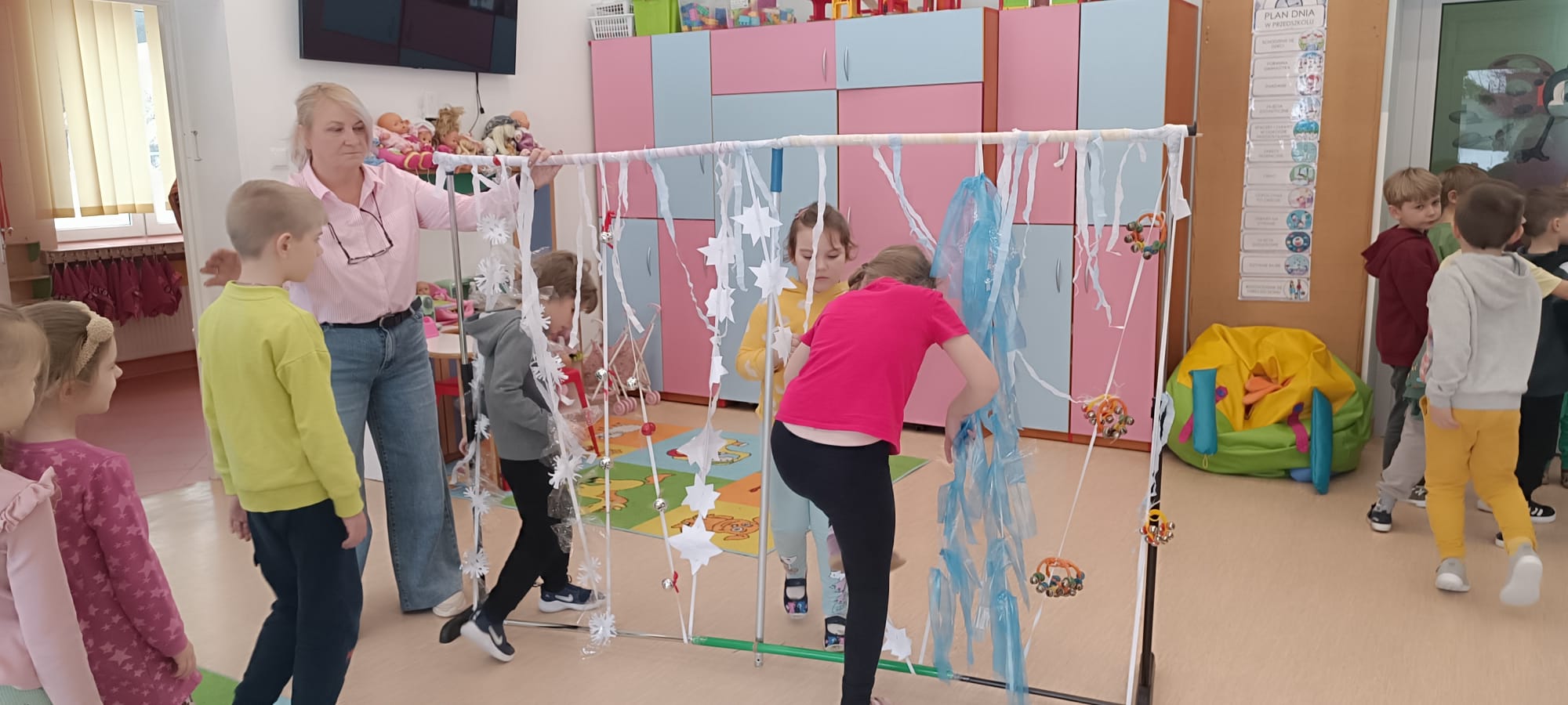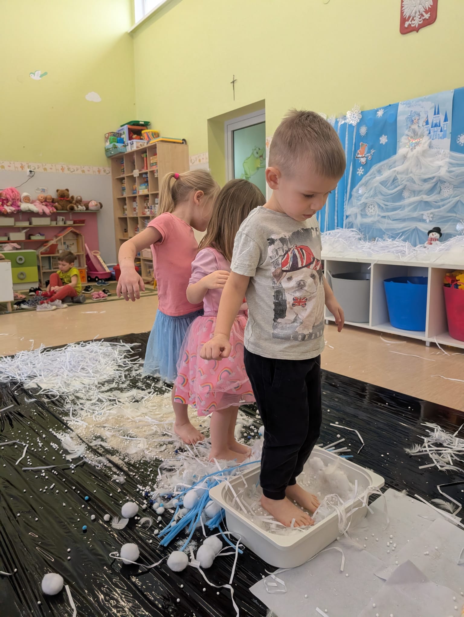 W tej grupie królowały dźwięki! Dzieci wsłuchiwały się w odgłosy zimy, śpiewały zimowe piosenki i muzykowały przy użyciu instrumentów domowej roboty. Prawdziwym hitem okazała się sensoryczna ścieżka muzyczna, która pozwoliła przedszkolakom „wychodzić” rytm zimy.