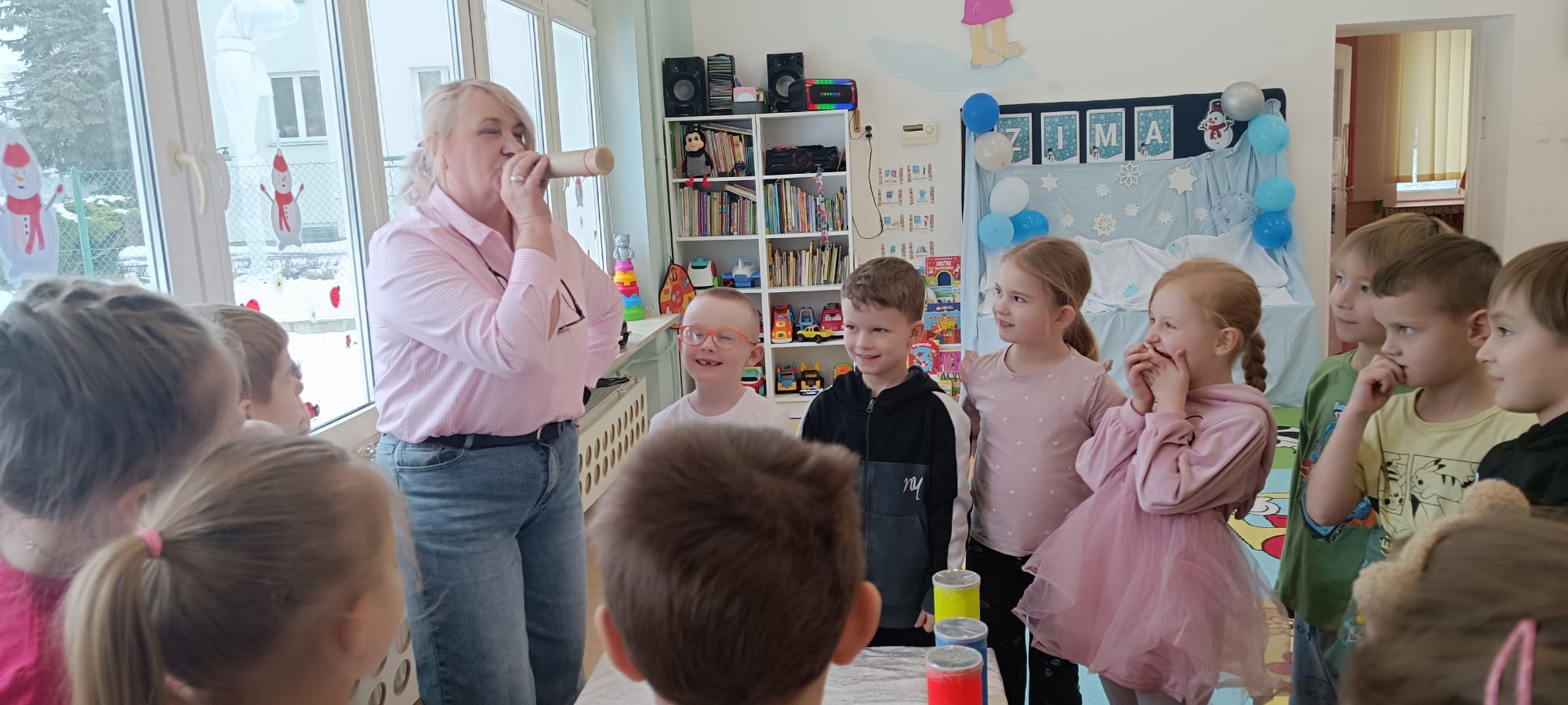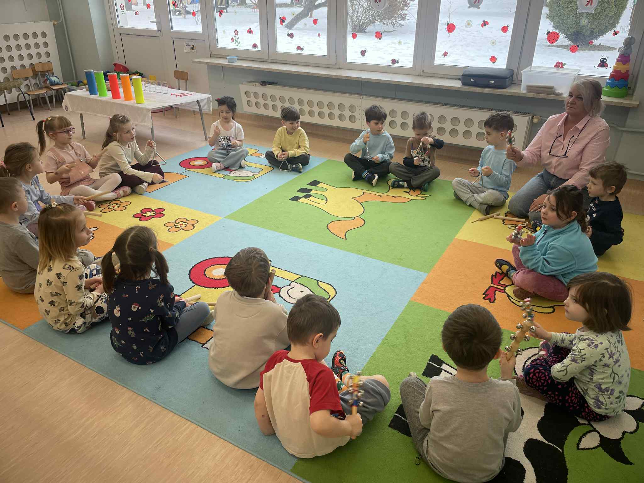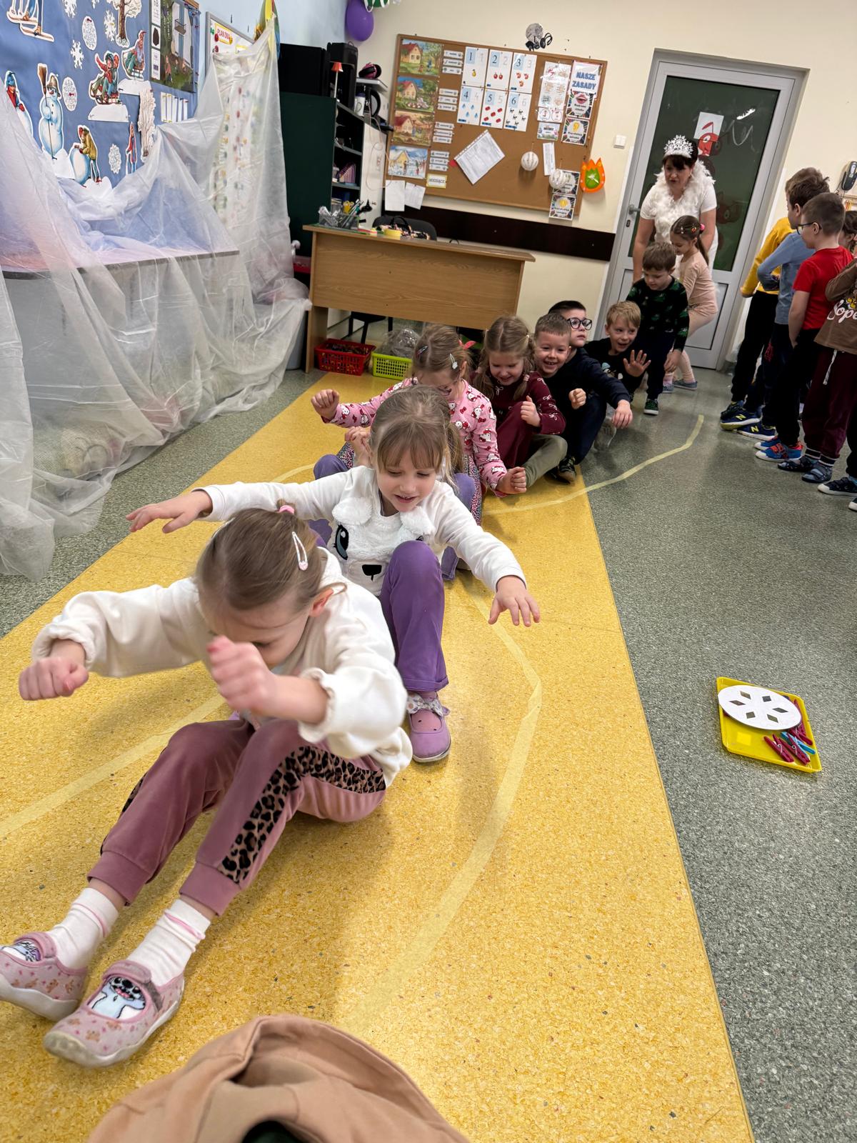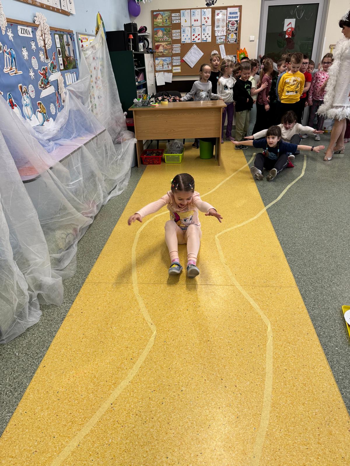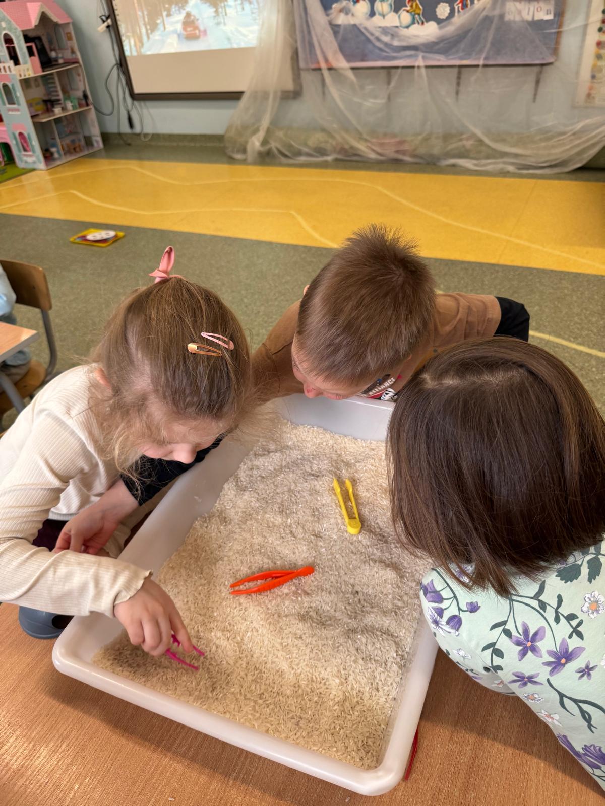 W tej grupie królowały dźwięki! Dzieci wsłuchiwały się w odgłosy zimy, śpiewały zimowe piosenki i muzykowały przy użyciu instrumentów domowej roboty. Prawdziwym hitem okazała się sensoryczna ścieżka muzyczna, która pozwoliła przedszkolakom „wychodzić” rytm zimy.