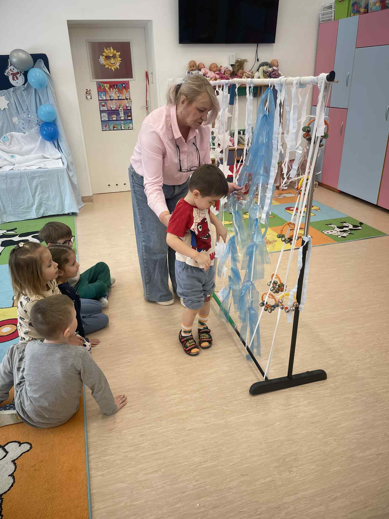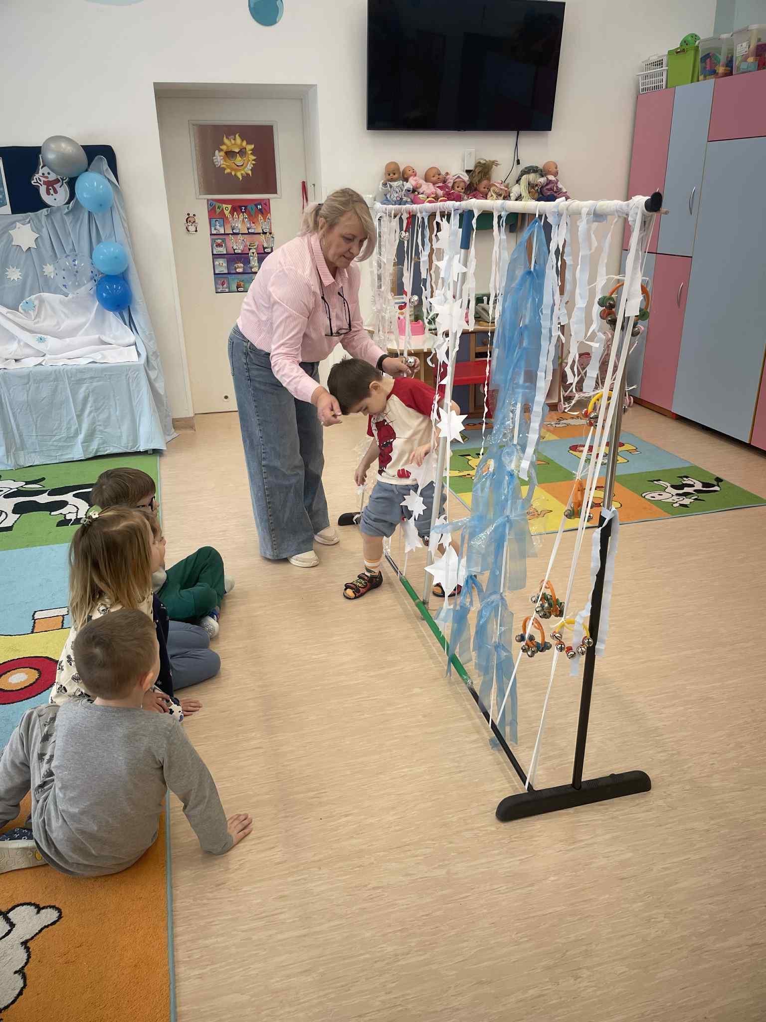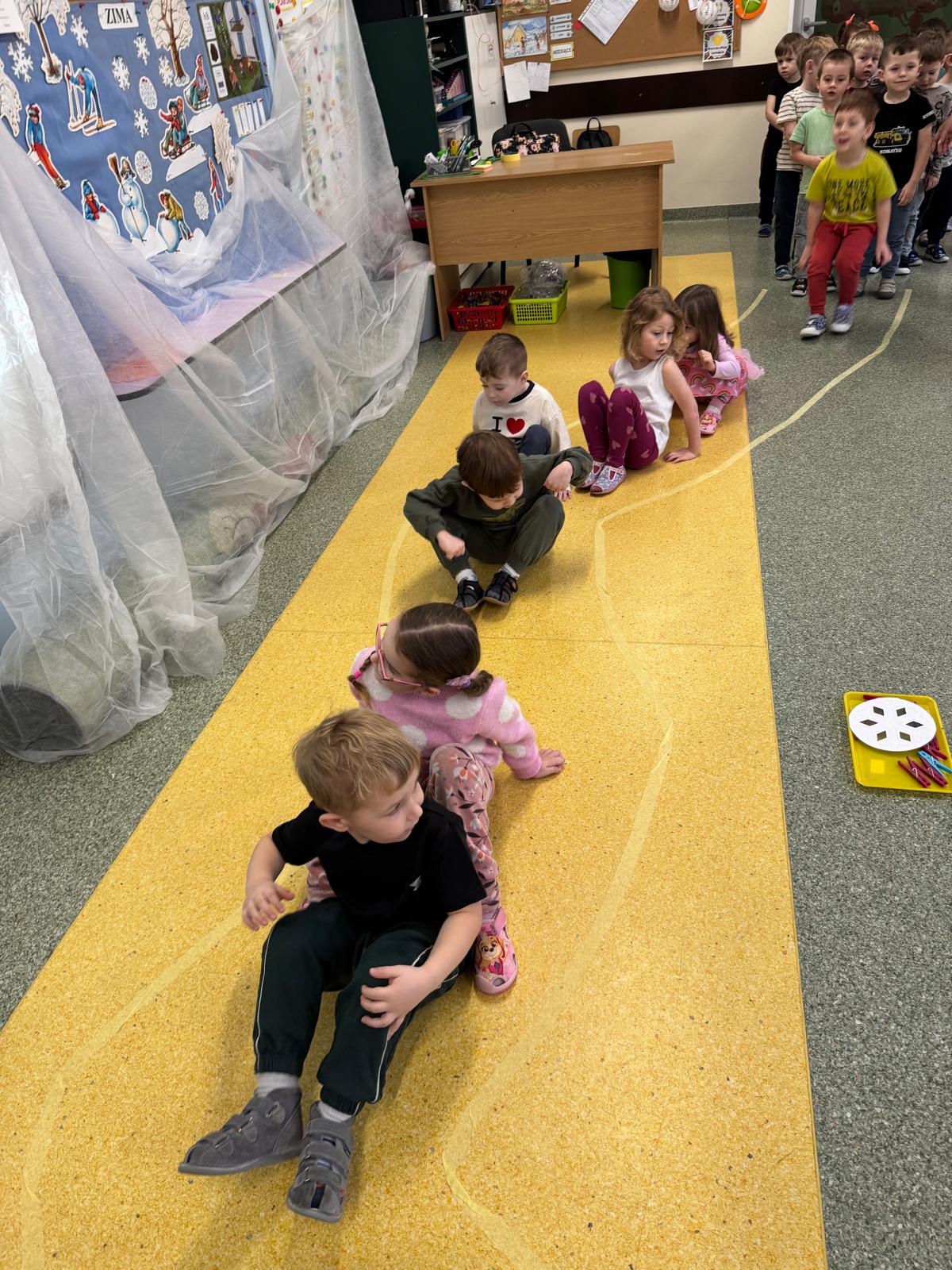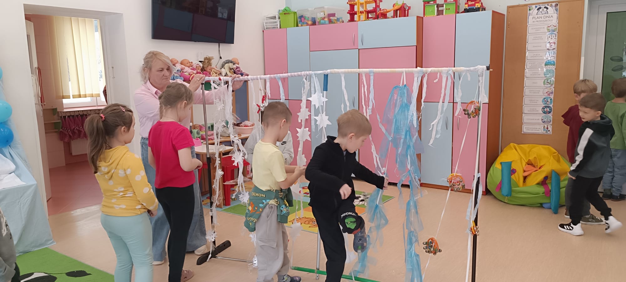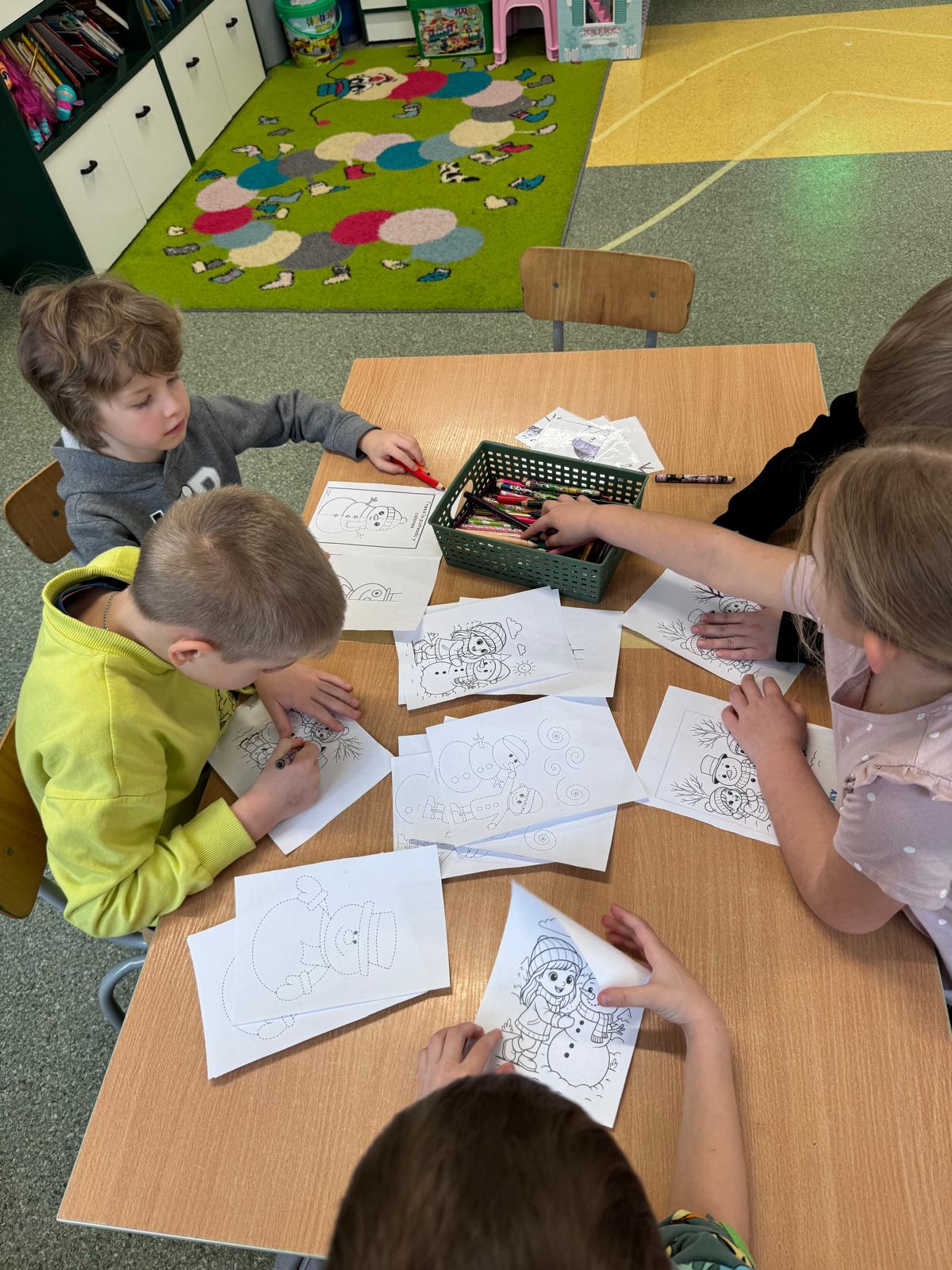W tej grupie królowały dźwięki! Dzieci wsłuchiwały się w odgłosy zimy, śpiewały zimowe piosenki i muzykowały przy użyciu instrumentów domowej roboty. Prawdziwym hitem okazała się sensoryczna ścieżka muzyczna, która pozwoliła przedszkolakom „wychodzić” rytm zimy.