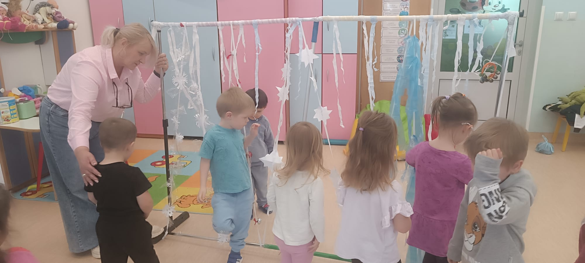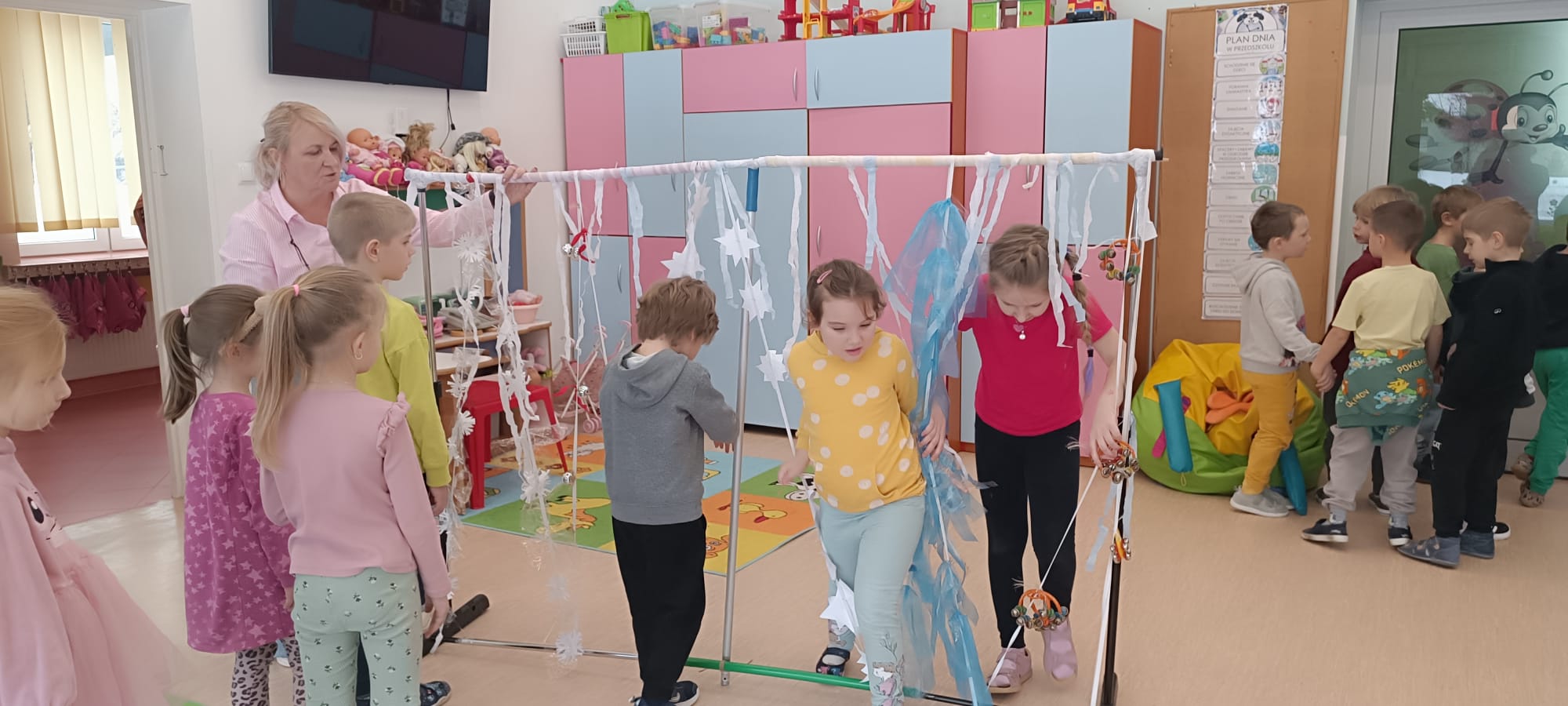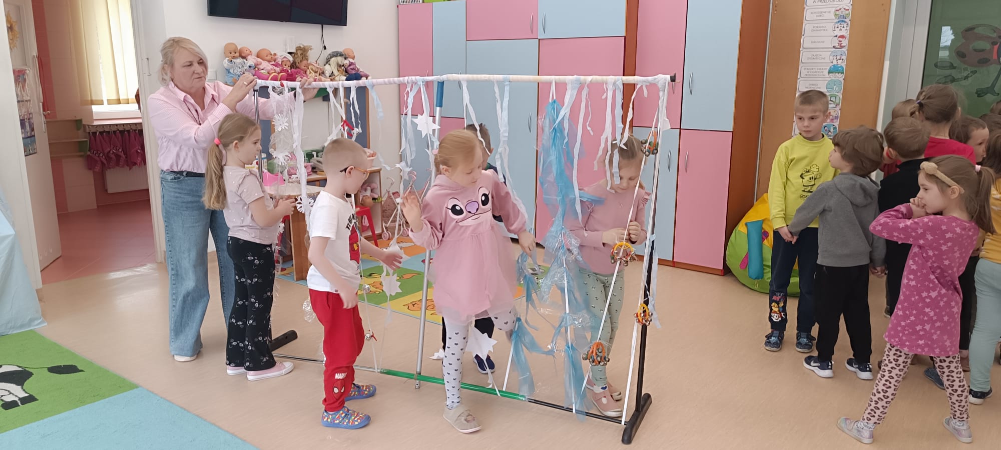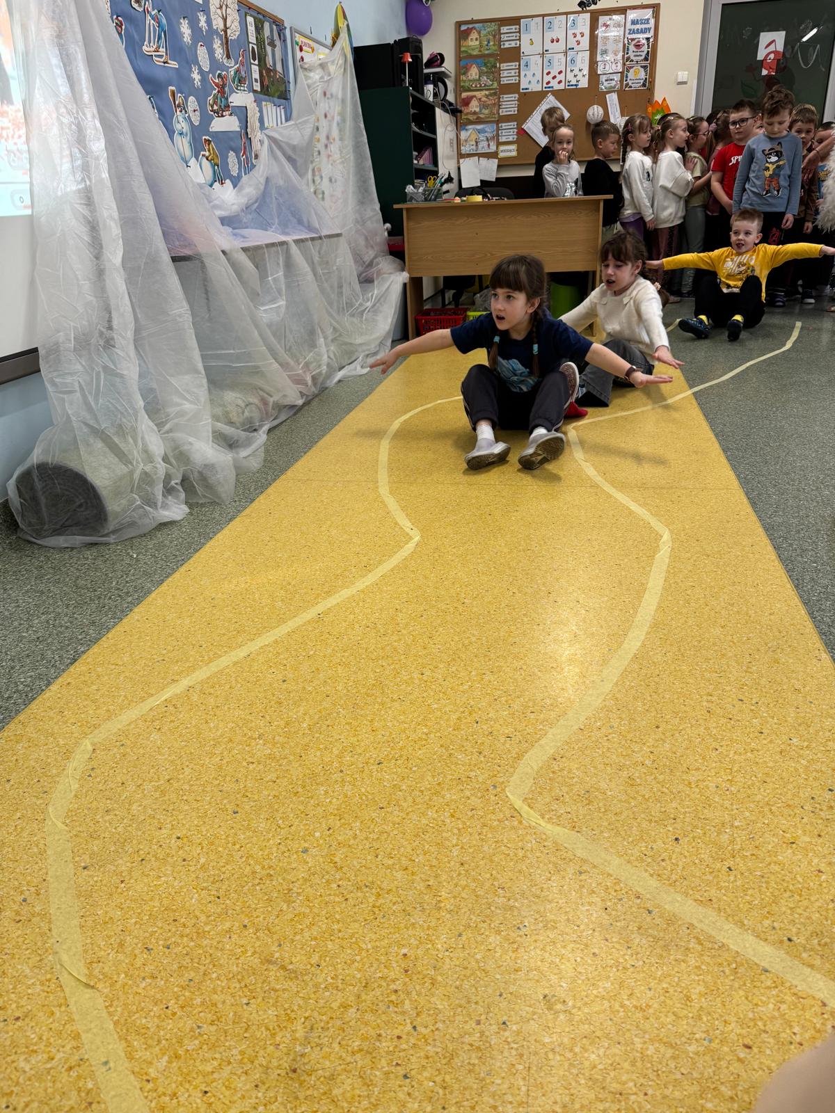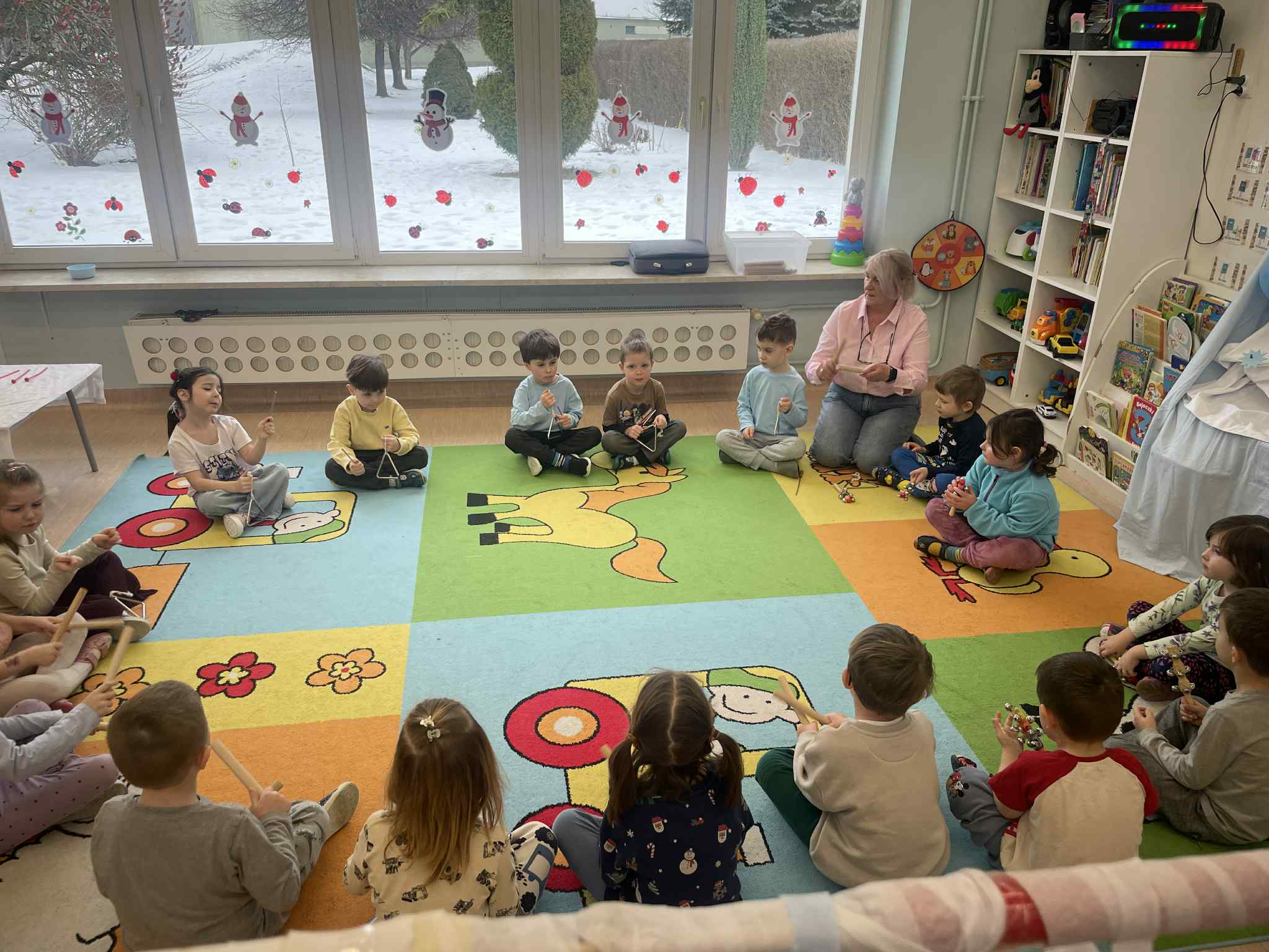 W tej grupie królowały dźwięki! Dzieci wsłuchiwały się w odgłosy zimy, śpiewały zimowe piosenki i muzykowały przy użyciu instrumentów domowej roboty. Prawdziwym hitem okazała się sensoryczna ścieżka muzyczna, która pozwoliła przedszkolakom „wychodzić” rytm zimy.