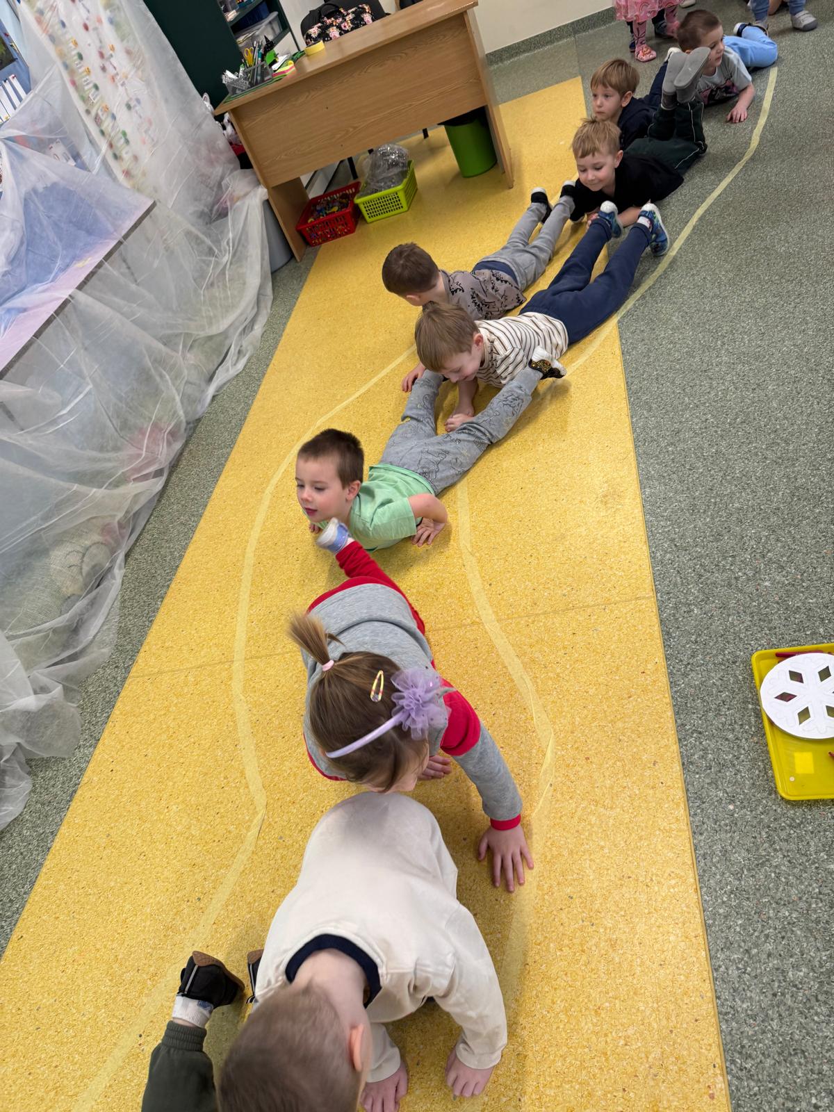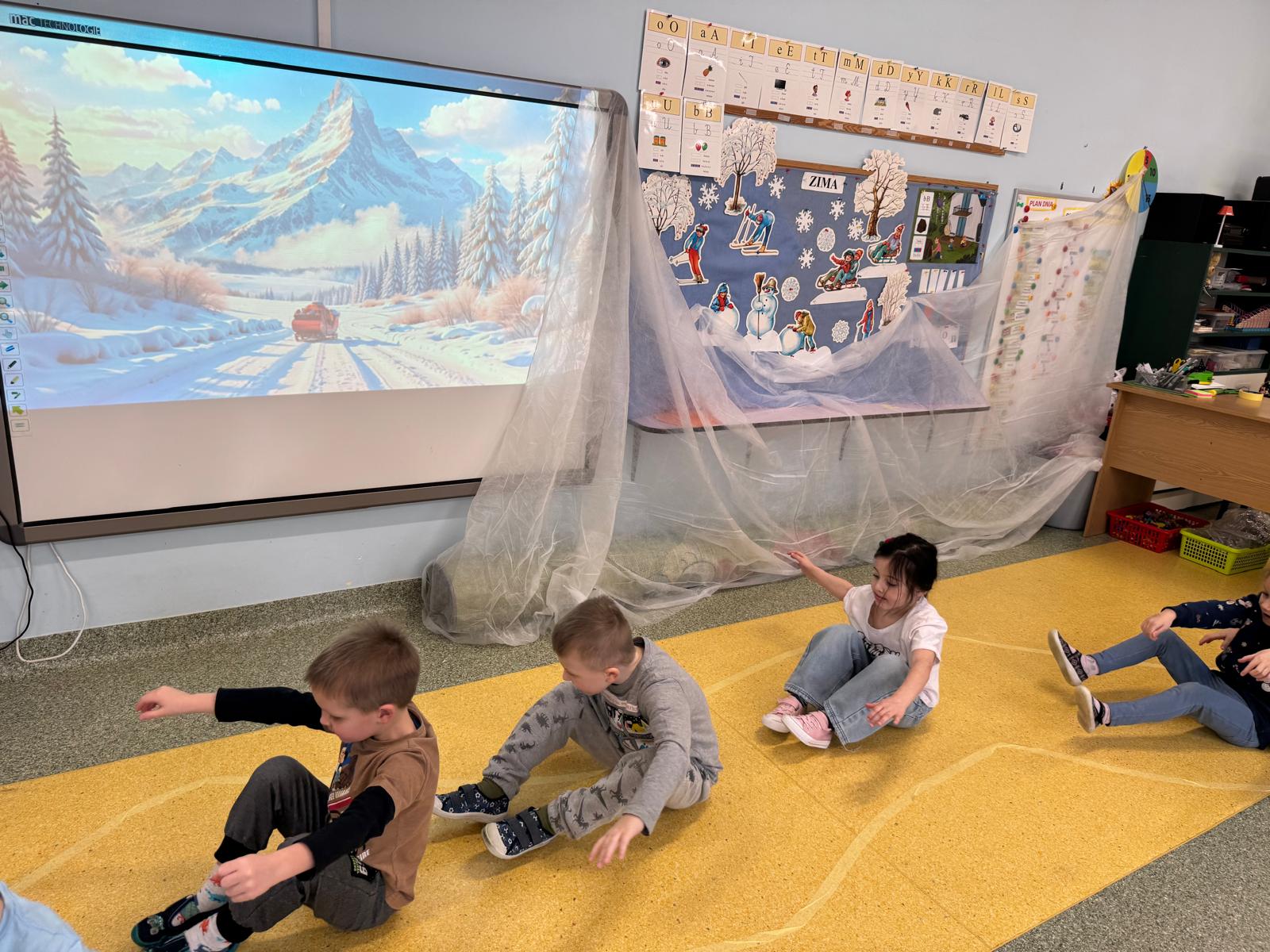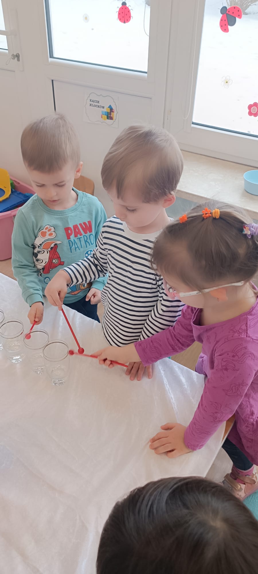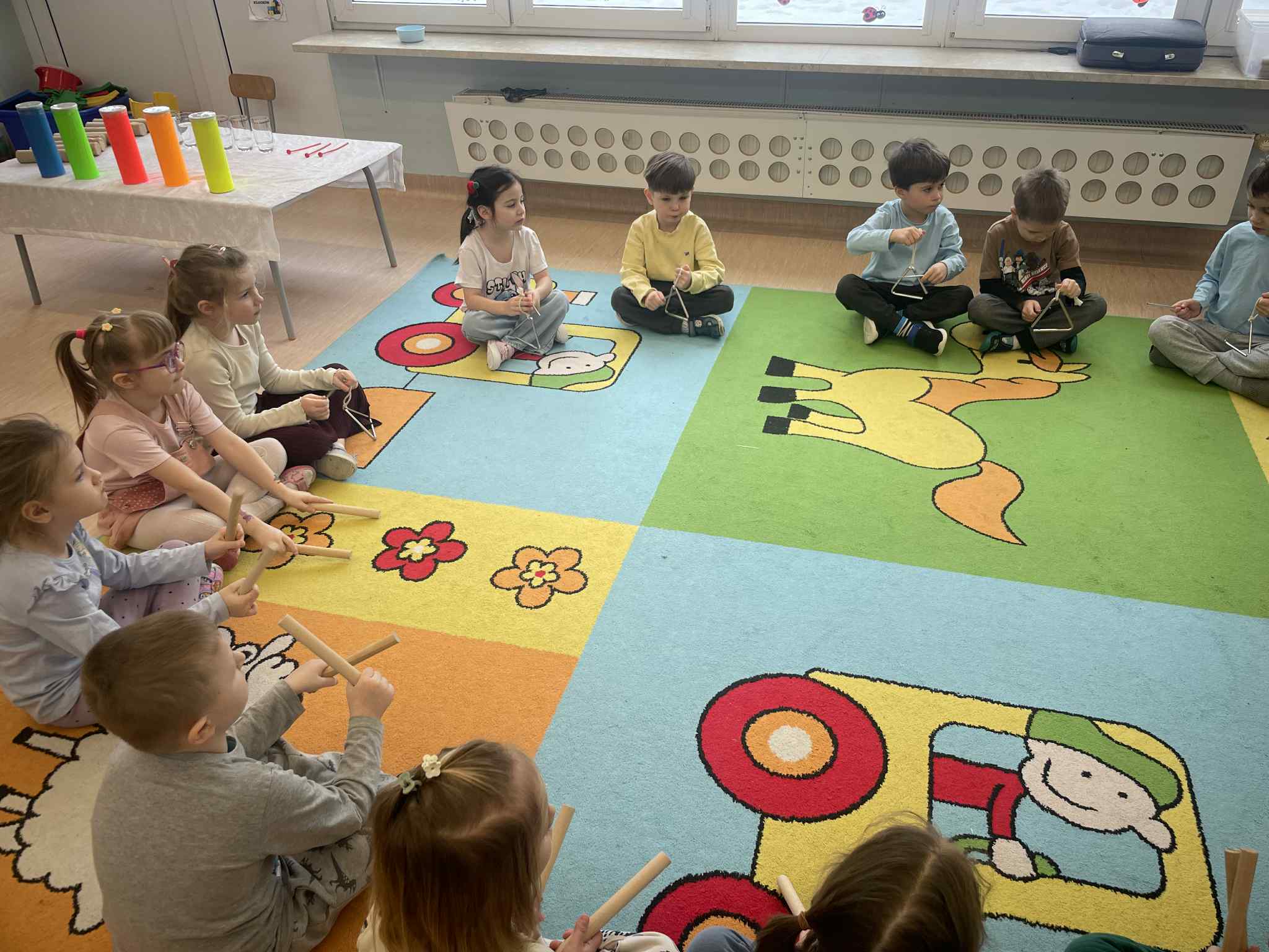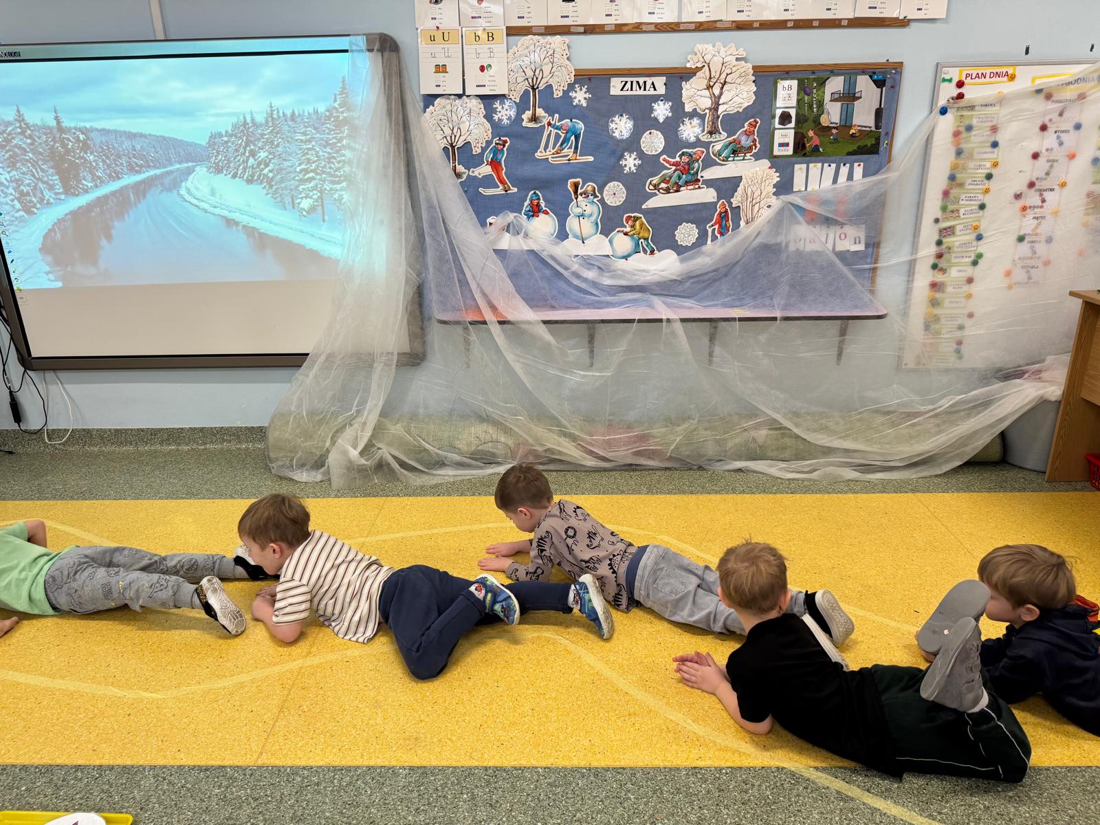 W tej grupie królowały dźwięki! Dzieci wsłuchiwały się w odgłosy zimy, śpiewały zimowe piosenki i muzykowały przy użyciu instrumentów domowej roboty. Prawdziwym hitem okazała się sensoryczna ścieżka muzyczna, która pozwoliła przedszkolakom „wychodzić” rytm zimy.