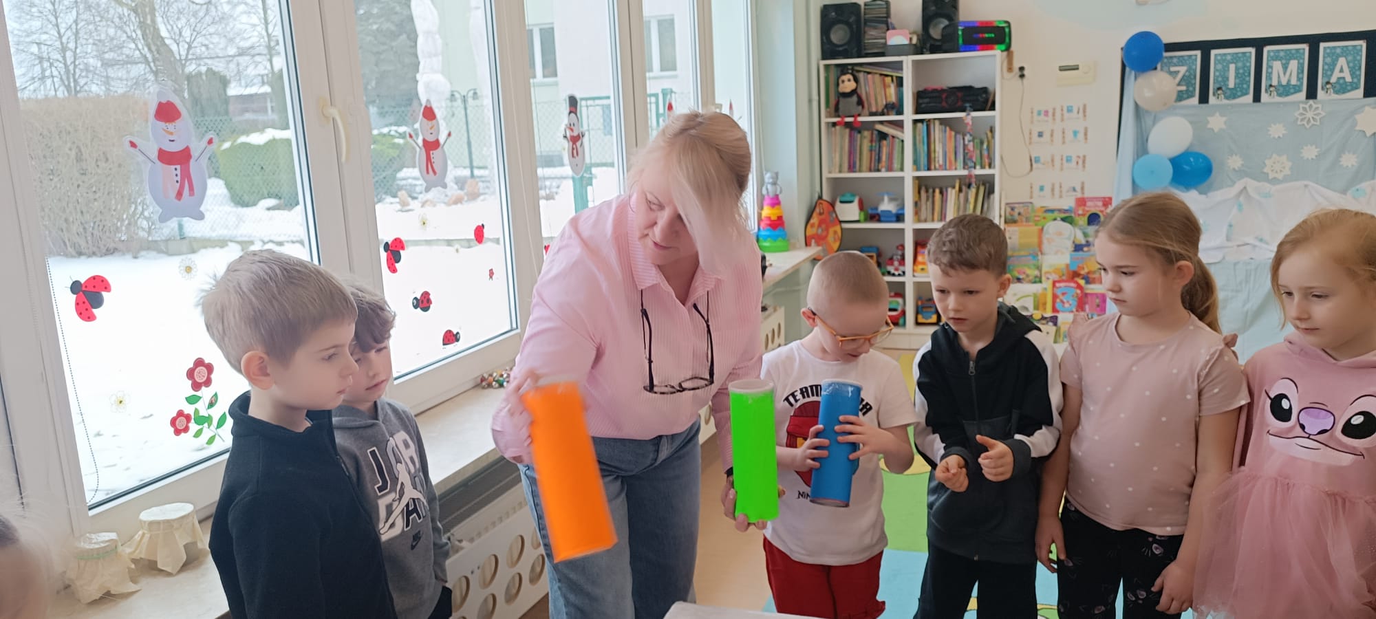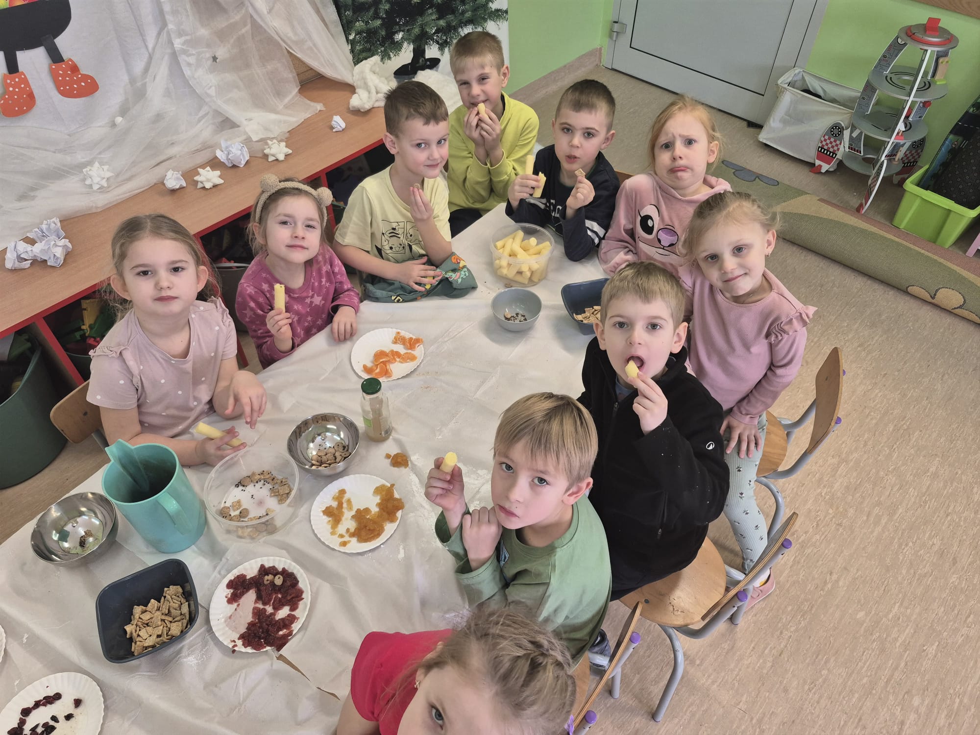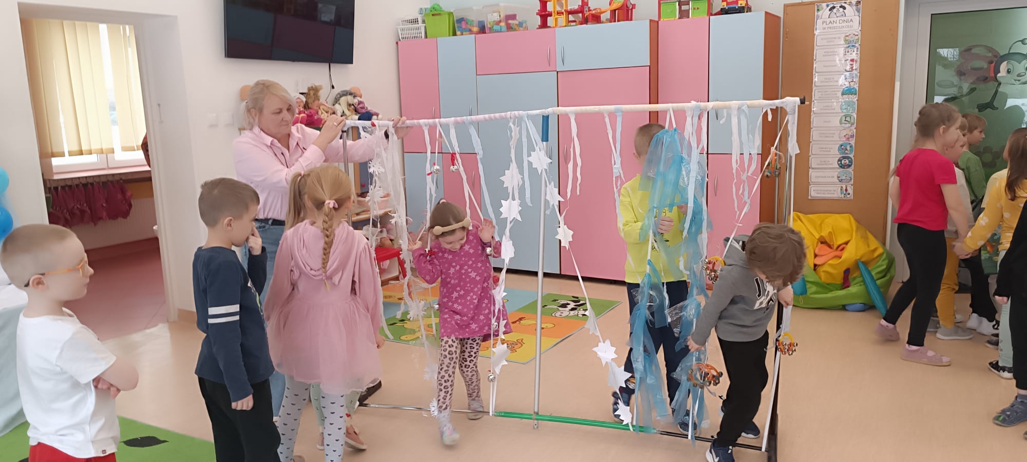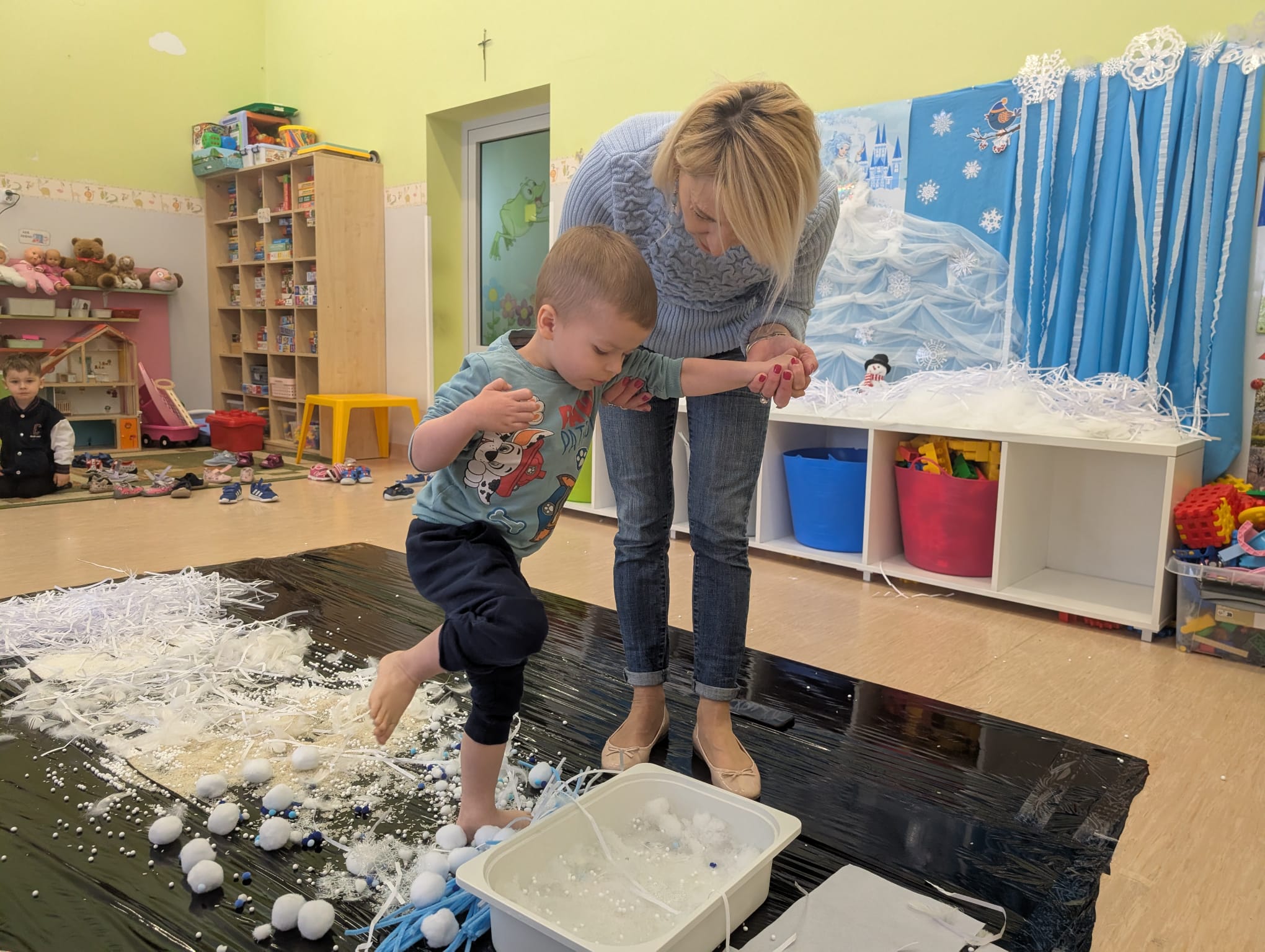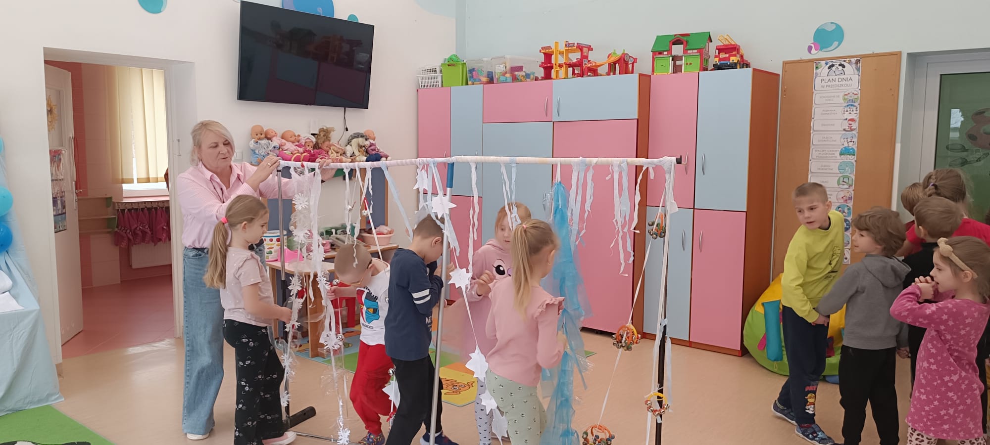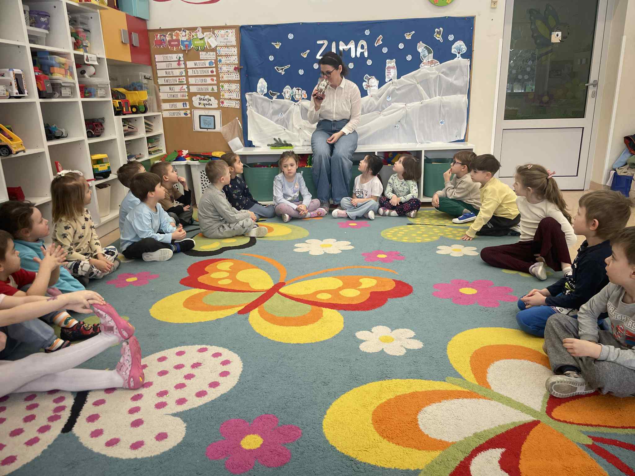 W tej grupie królowały dźwięki! Dzieci wsłuchiwały się w odgłosy zimy, śpiewały zimowe piosenki i muzykowały przy użyciu instrumentów domowej roboty. Prawdziwym hitem okazała się sensoryczna ścieżka muzyczna, która pozwoliła przedszkolakom „wychodzić” rytm zimy.