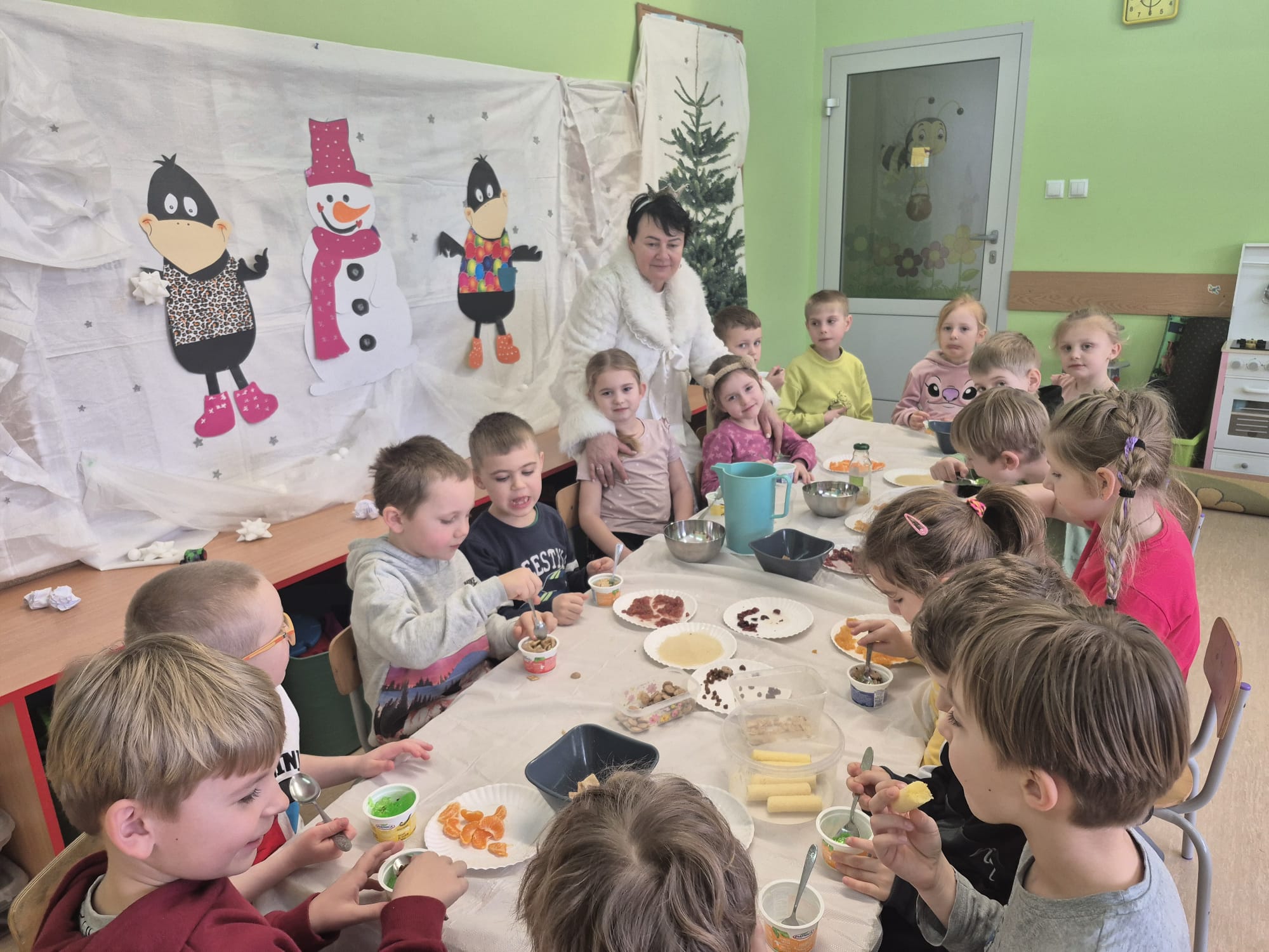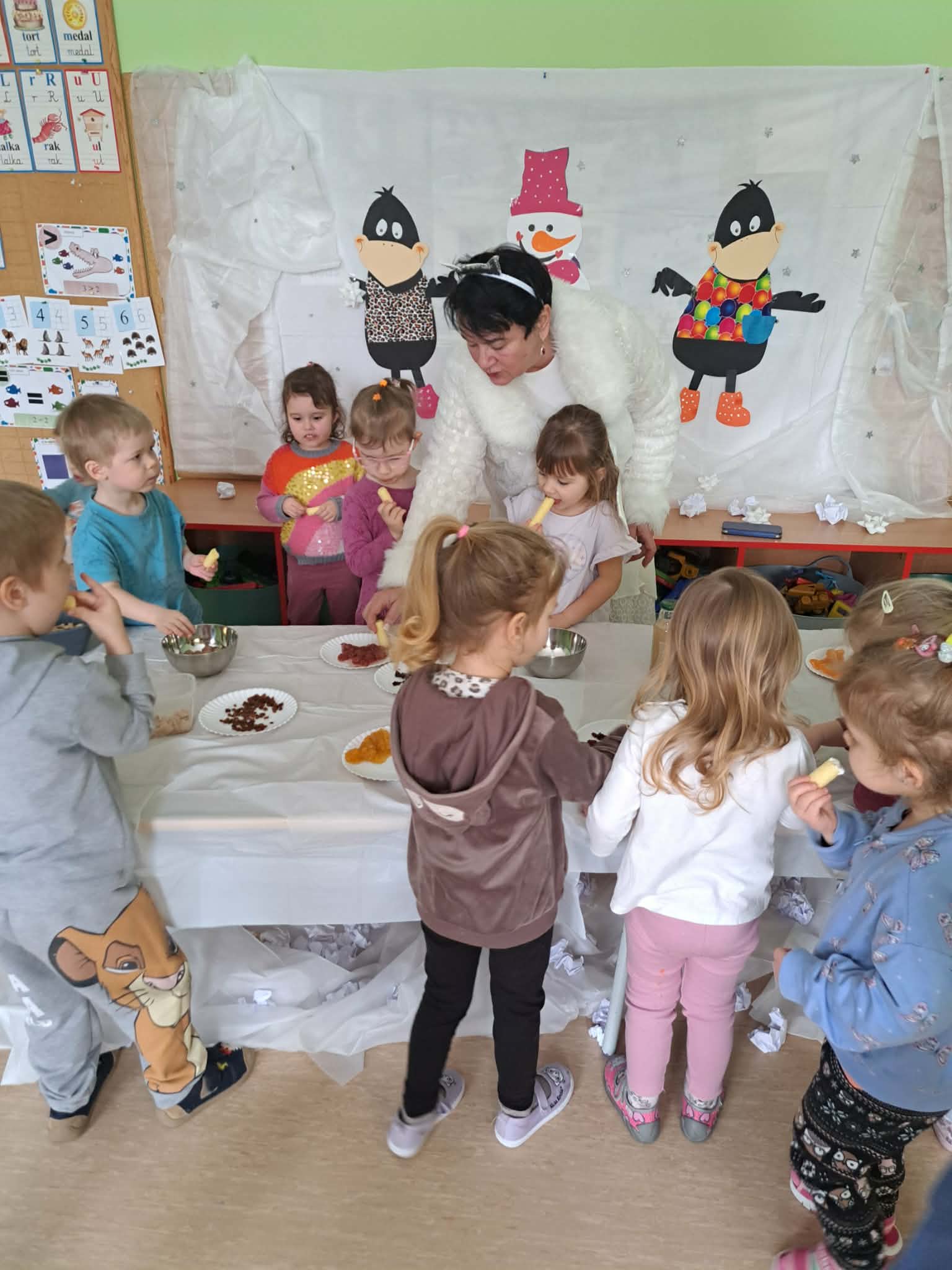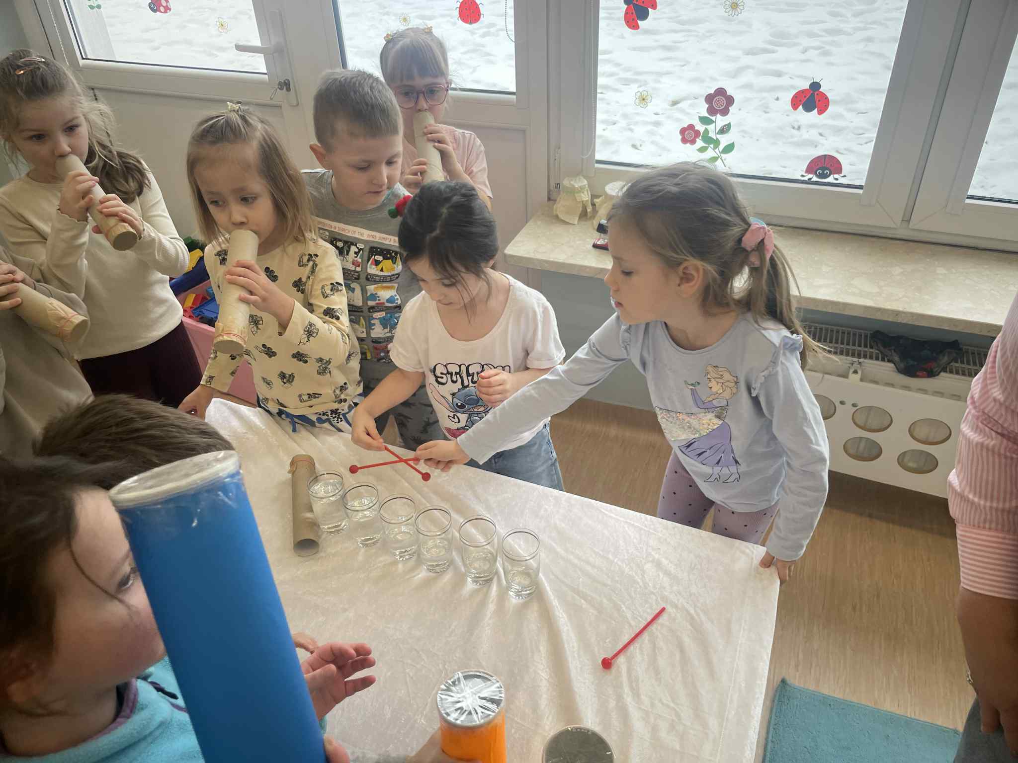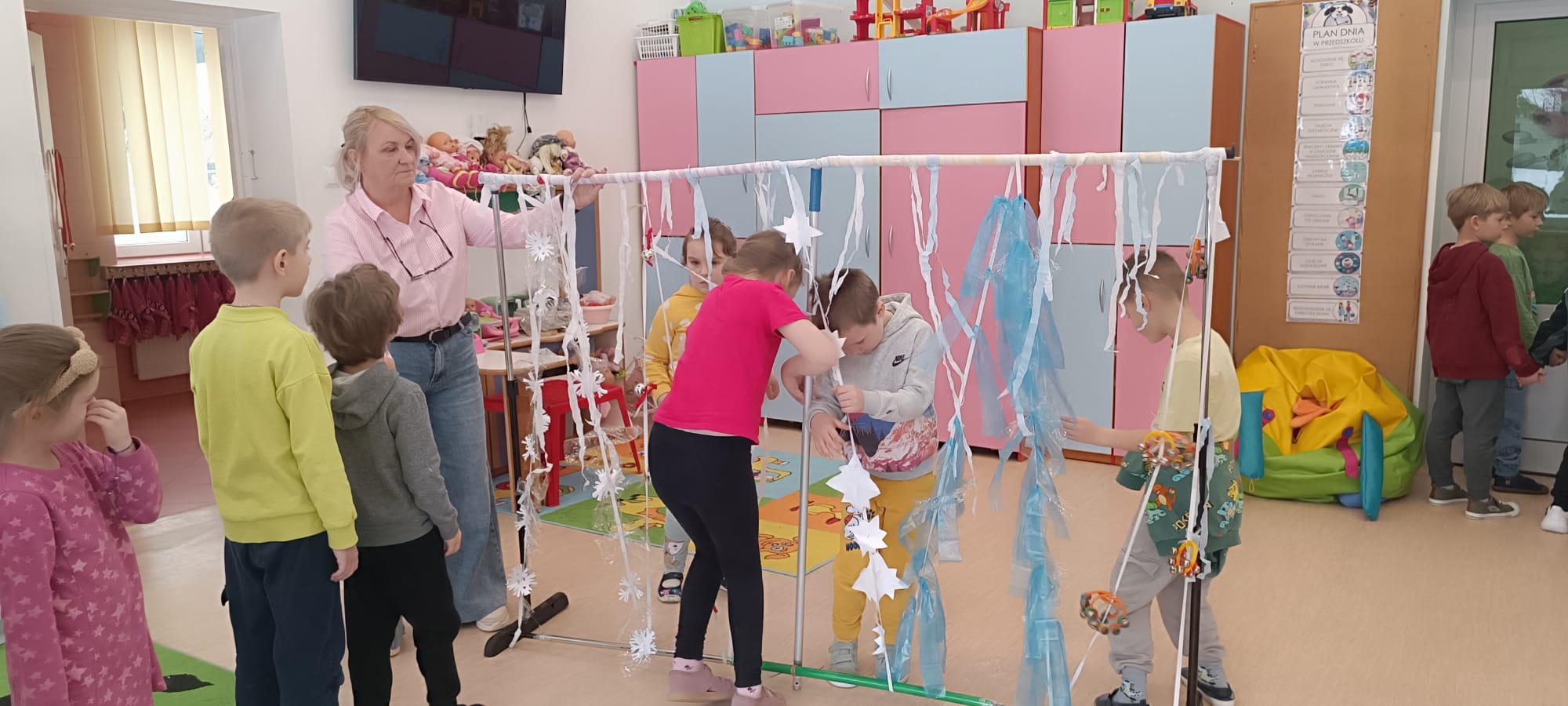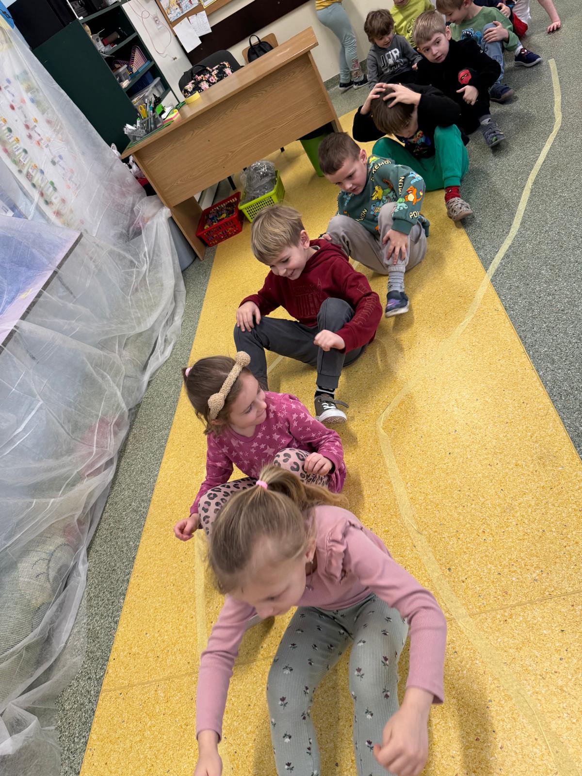 W tej grupie królowały dźwięki! Dzieci wsłuchiwały się w odgłosy zimy, śpiewały zimowe piosenki i muzykowały przy użyciu instrumentów domowej roboty. Prawdziwym hitem okazała się sensoryczna ścieżka muzyczna, która pozwoliła przedszkolakom „wychodzić” rytm zimy.