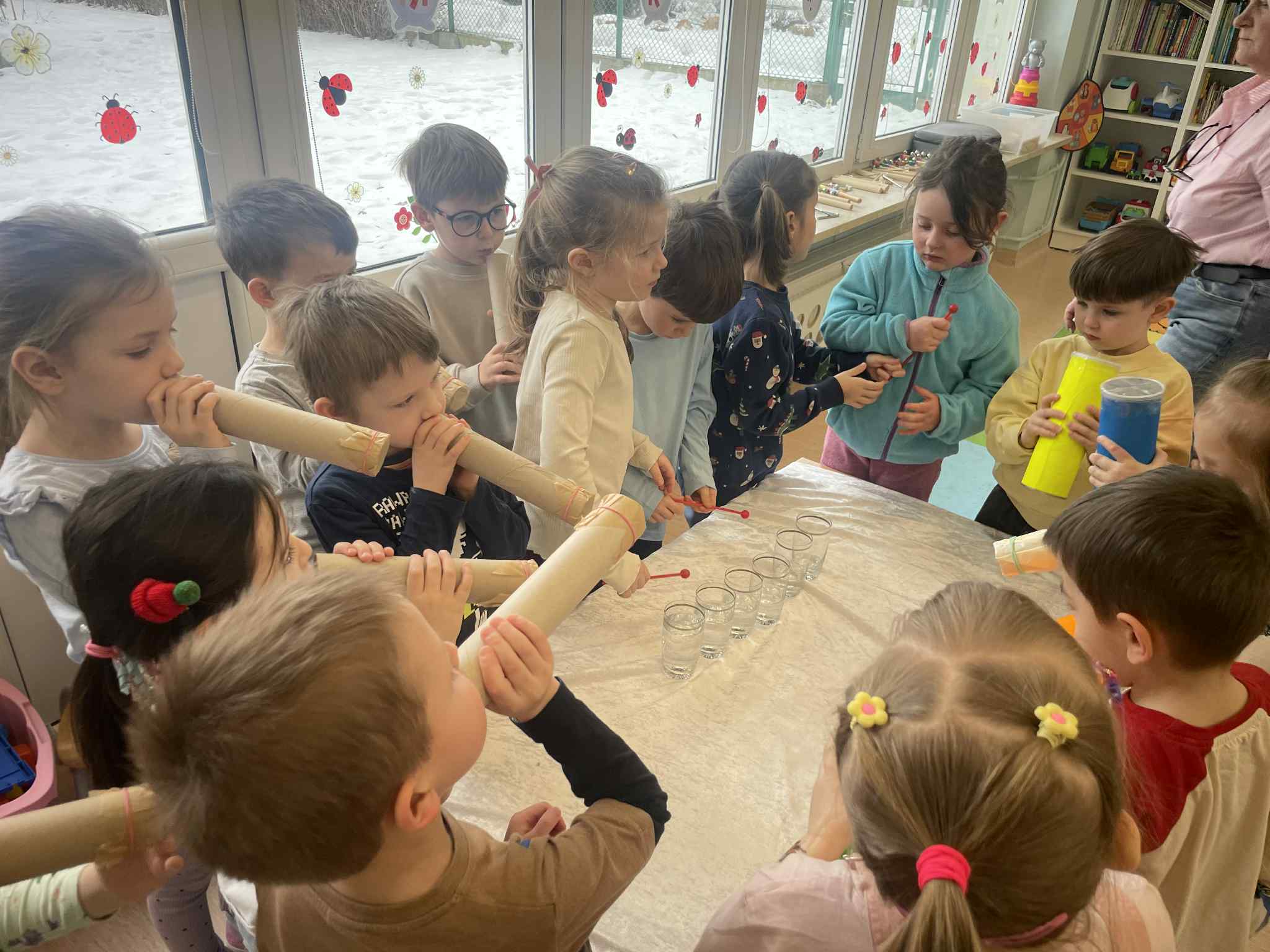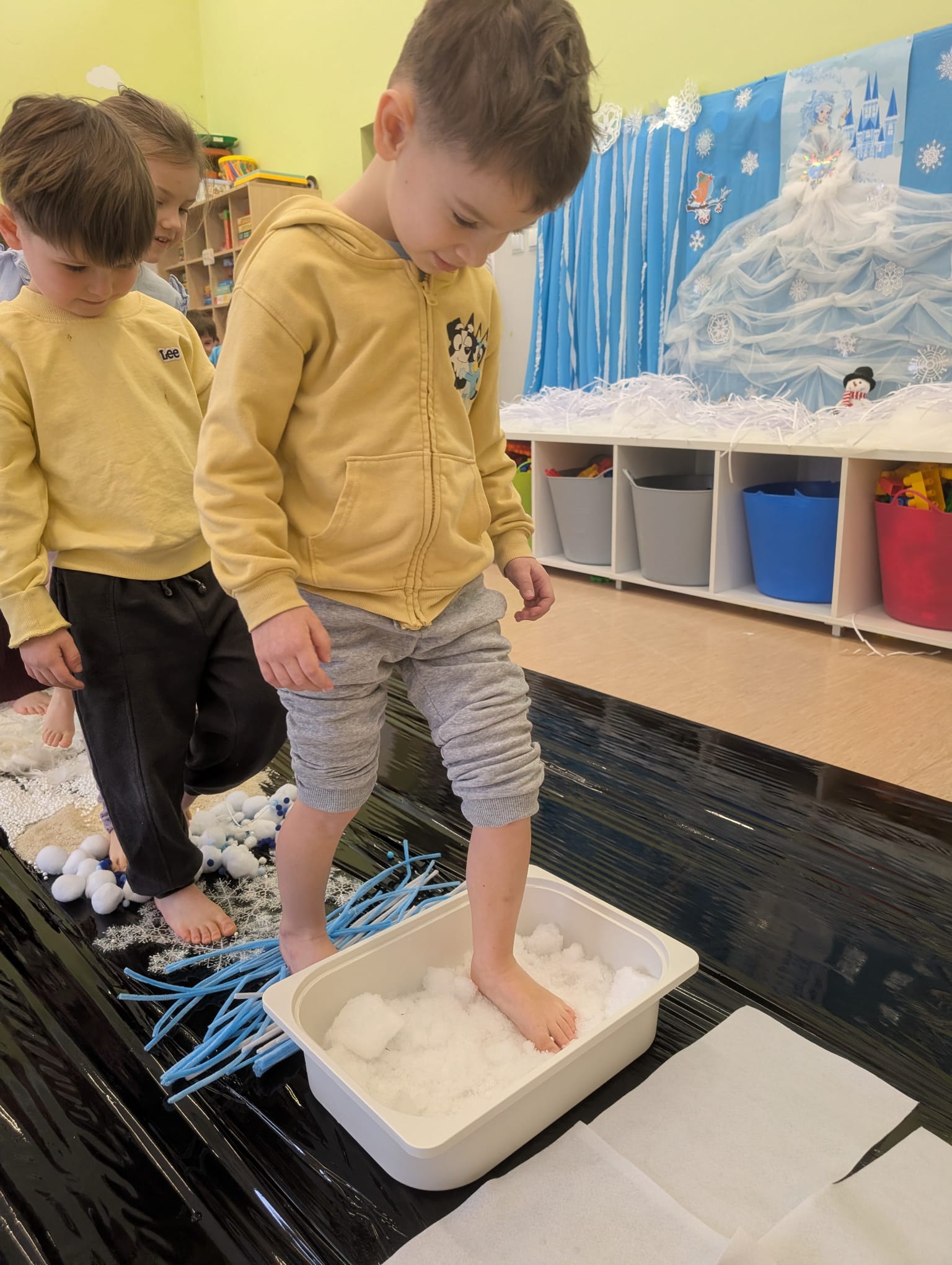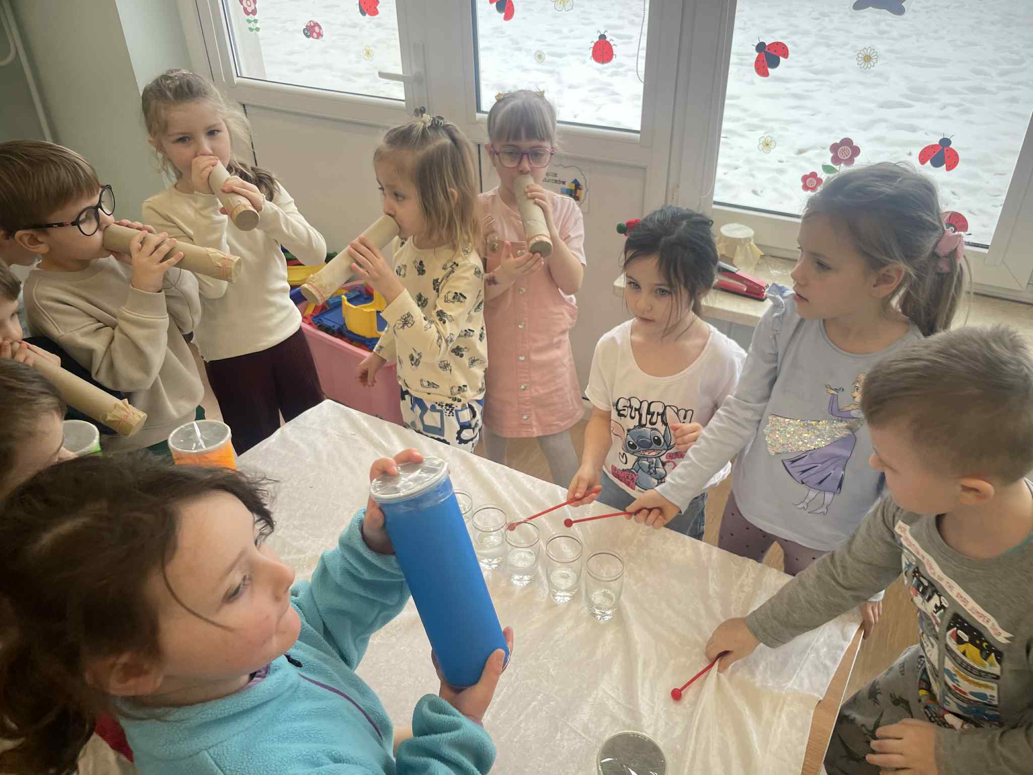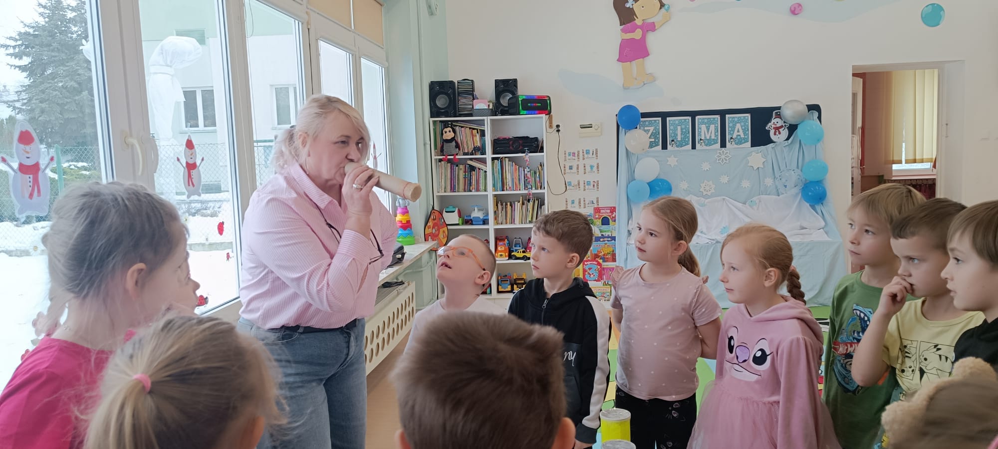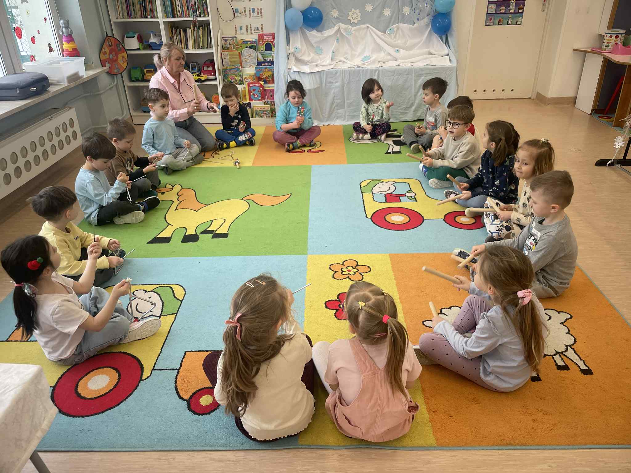 W tej grupie królowały dźwięki! Dzieci wsłuchiwały się w odgłosy zimy, śpiewały zimowe piosenki i muzykowały przy użyciu instrumentów domowej roboty. Prawdziwym hitem okazała się sensoryczna ścieżka muzyczna, która pozwoliła przedszkolakom „wychodzić” rytm zimy.