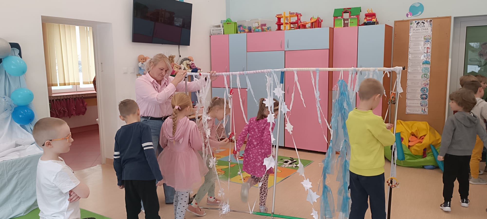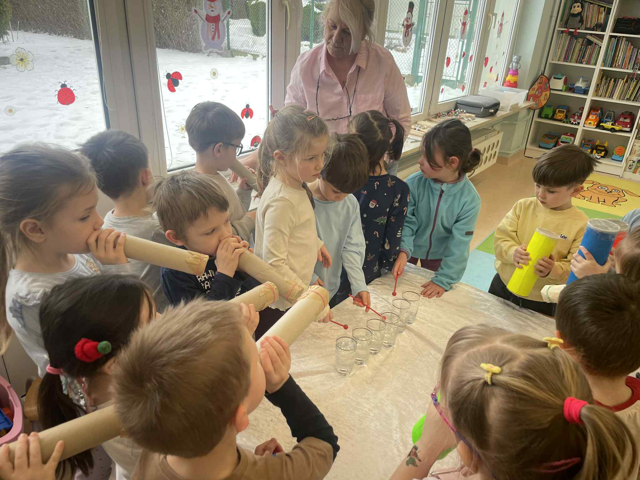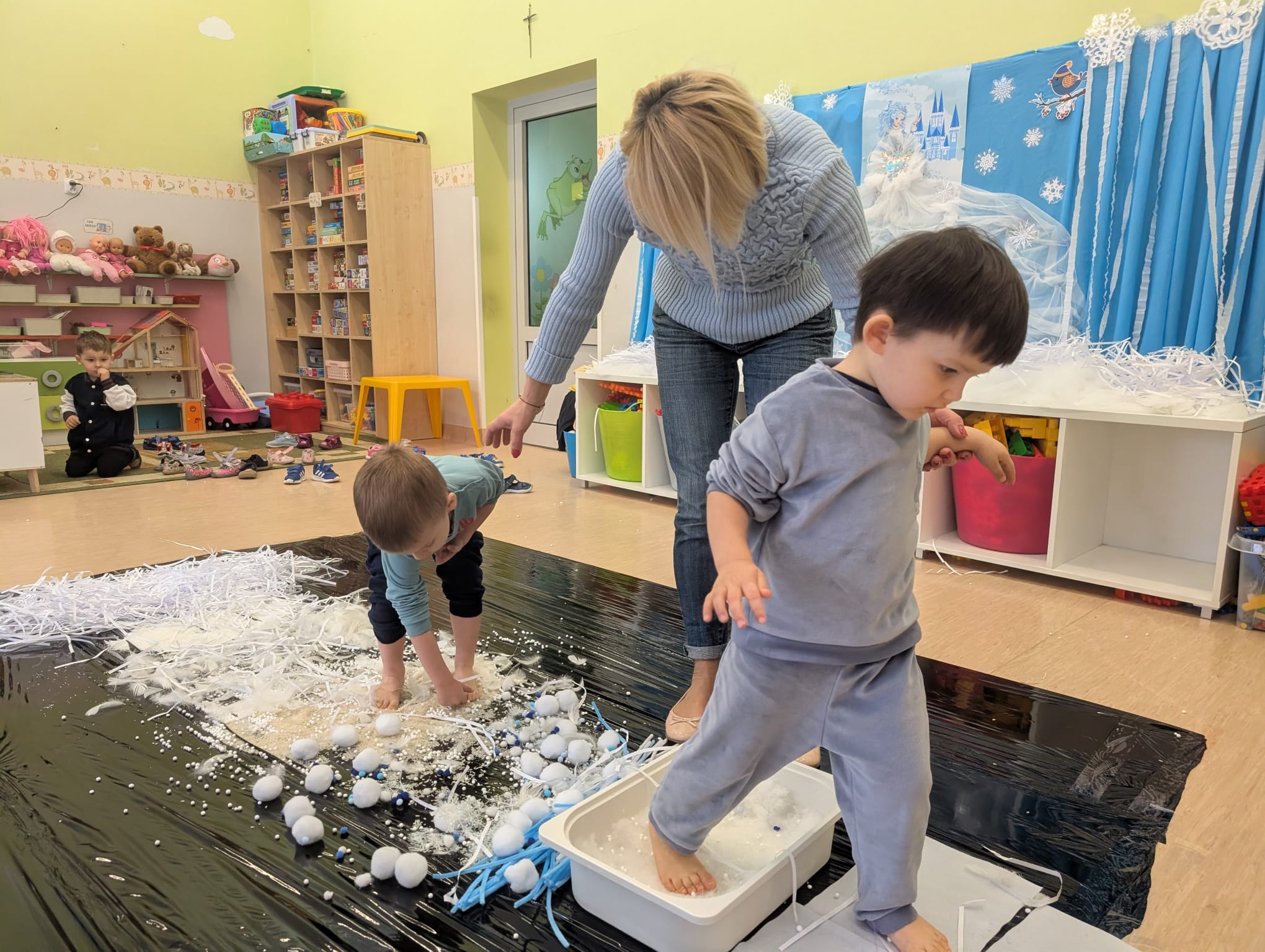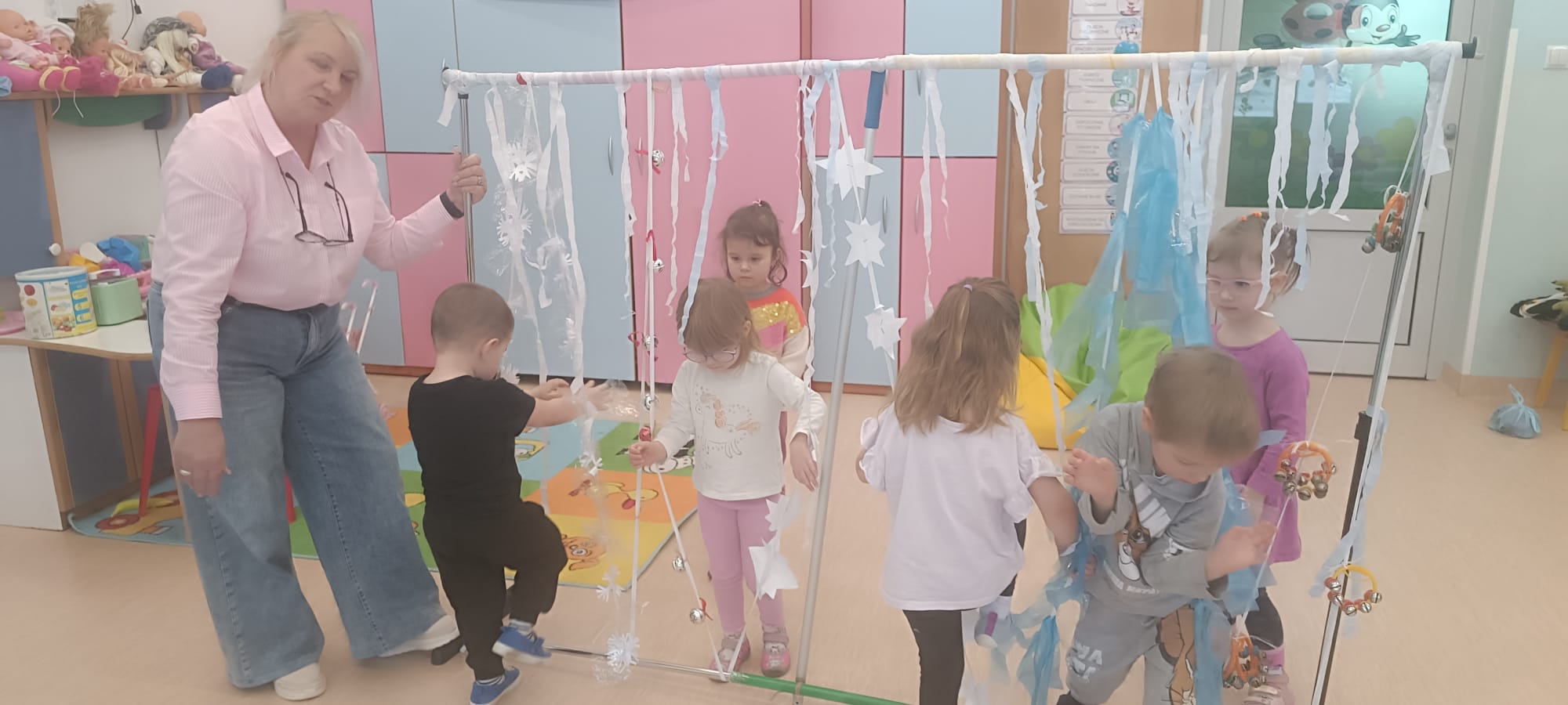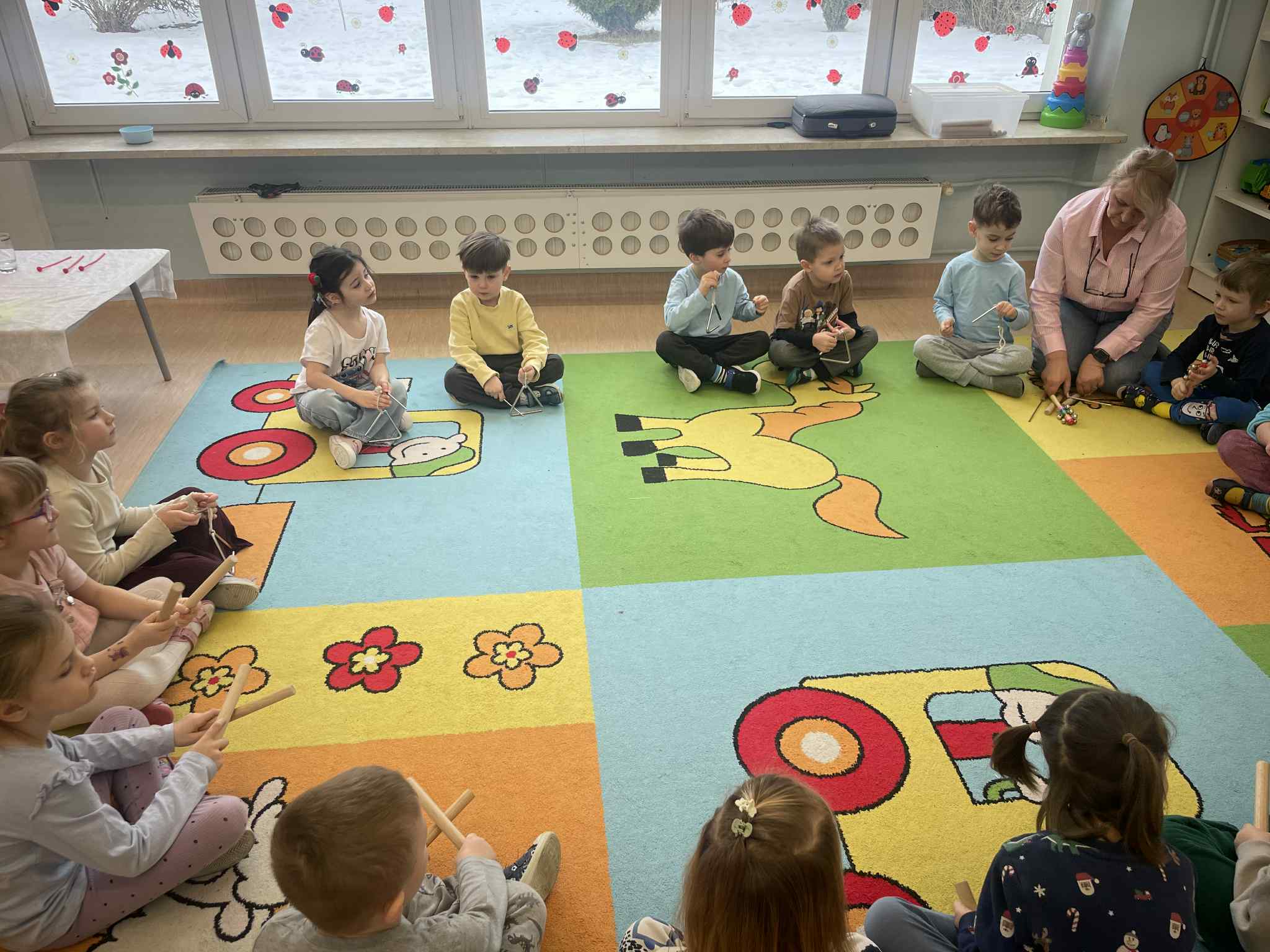 W tej grupie królowały dźwięki! Dzieci wsłuchiwały się w odgłosy zimy, śpiewały zimowe piosenki i muzykowały przy użyciu instrumentów domowej roboty. Prawdziwym hitem okazała się sensoryczna ścieżka muzyczna, która pozwoliła przedszkolakom „wychodzić” rytm zimy.