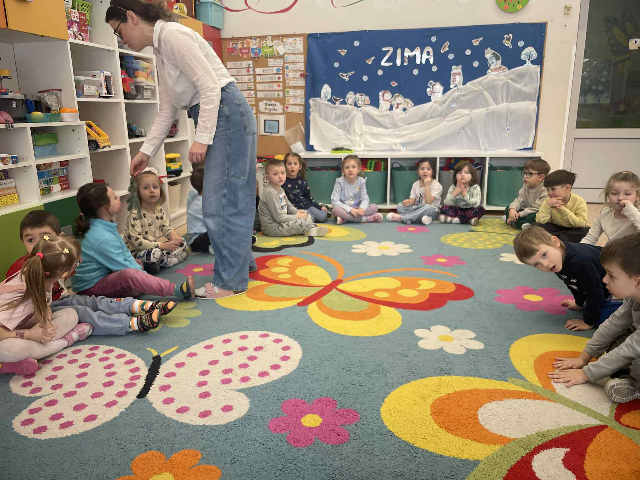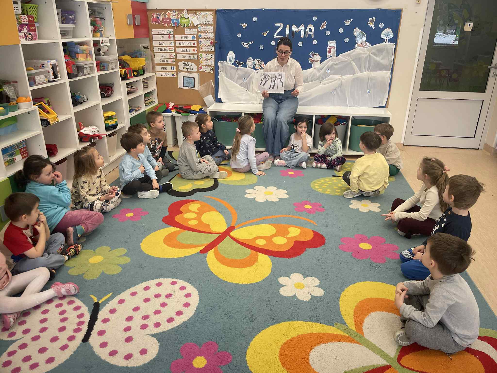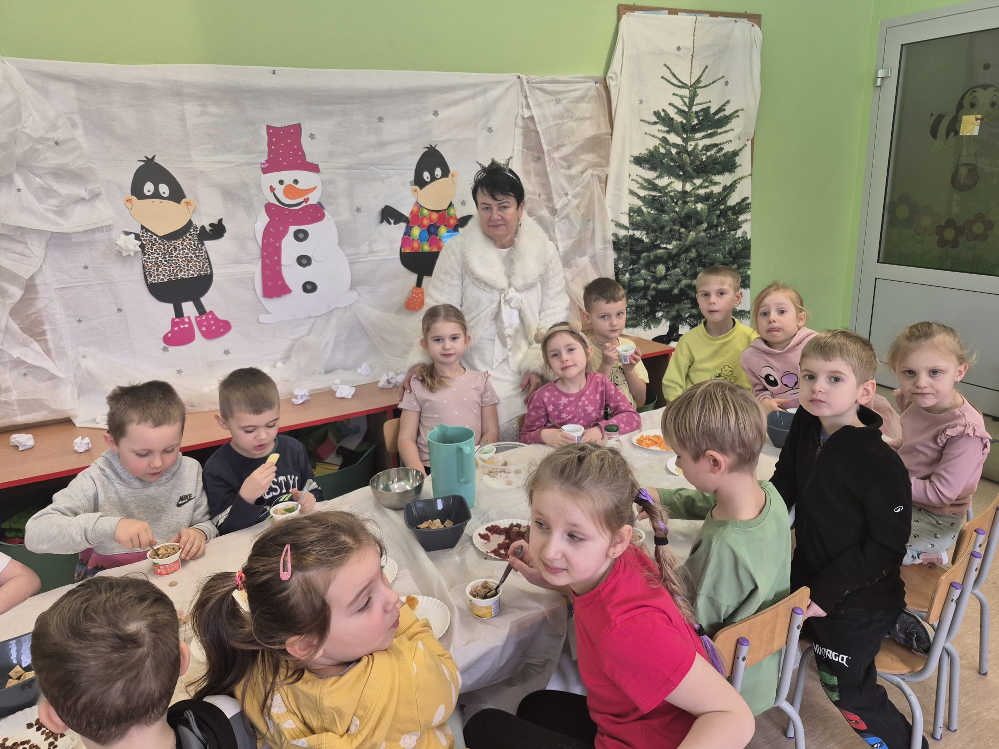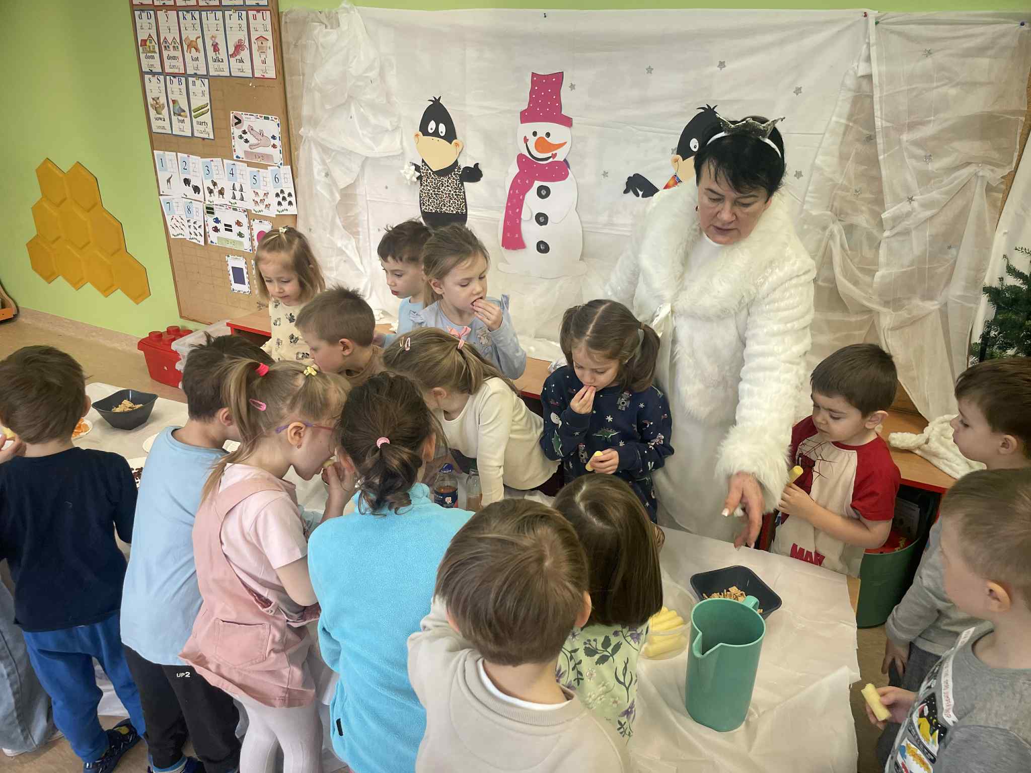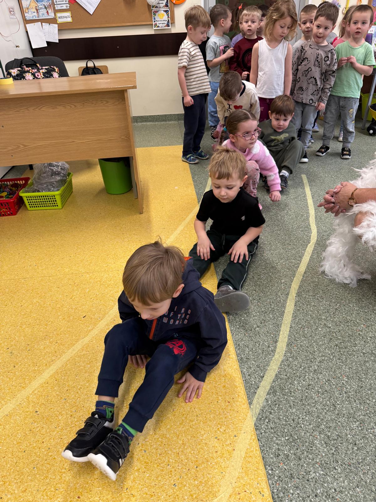 W tej grupie królowały dźwięki! Dzieci wsłuchiwały się w odgłosy zimy, śpiewały zimowe piosenki i muzykowały przy użyciu instrumentów domowej roboty. Prawdziwym hitem okazała się sensoryczna ścieżka muzyczna, która pozwoliła przedszkolakom „wychodzić” rytm zimy.