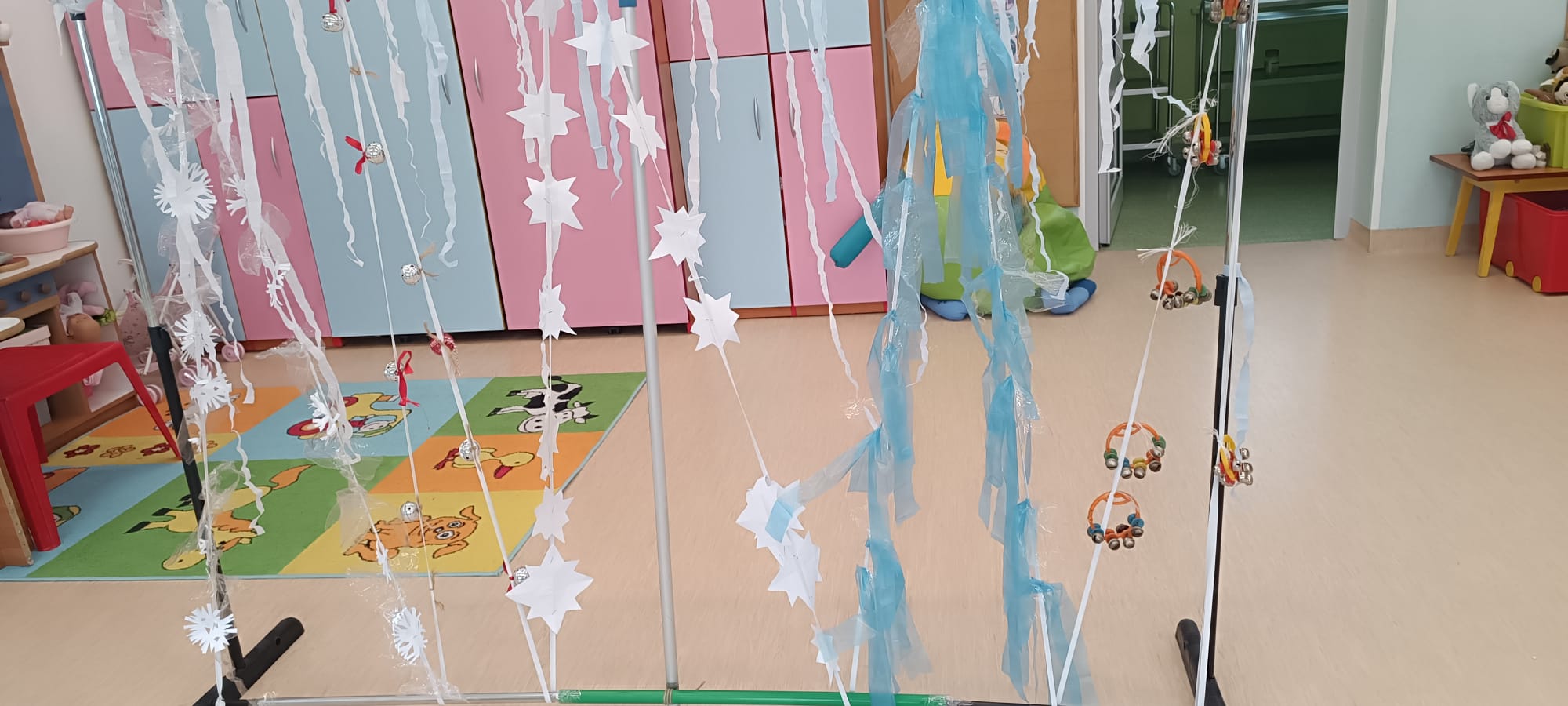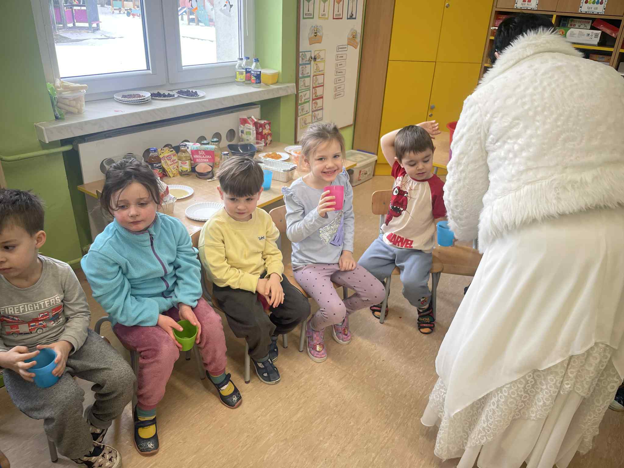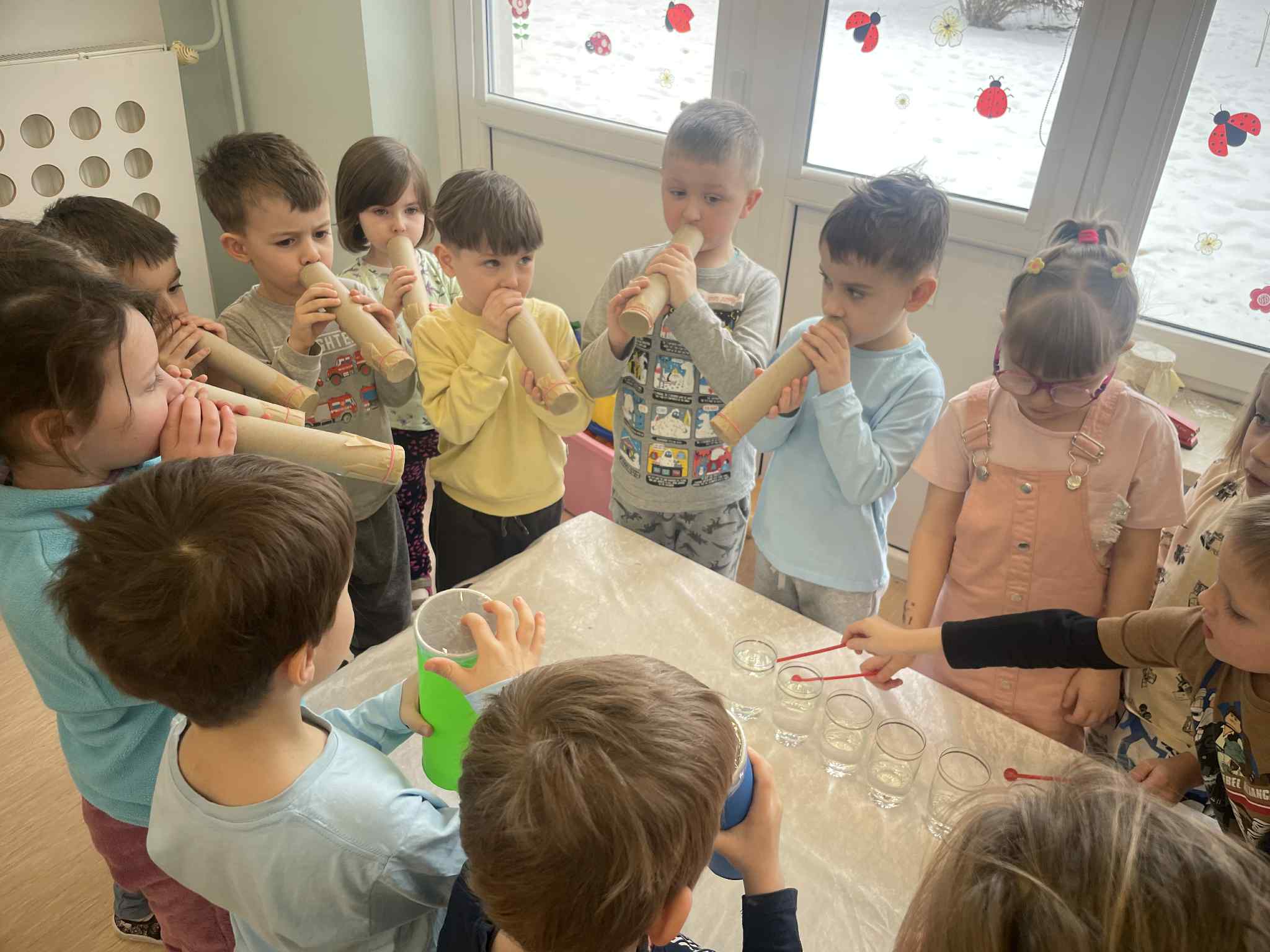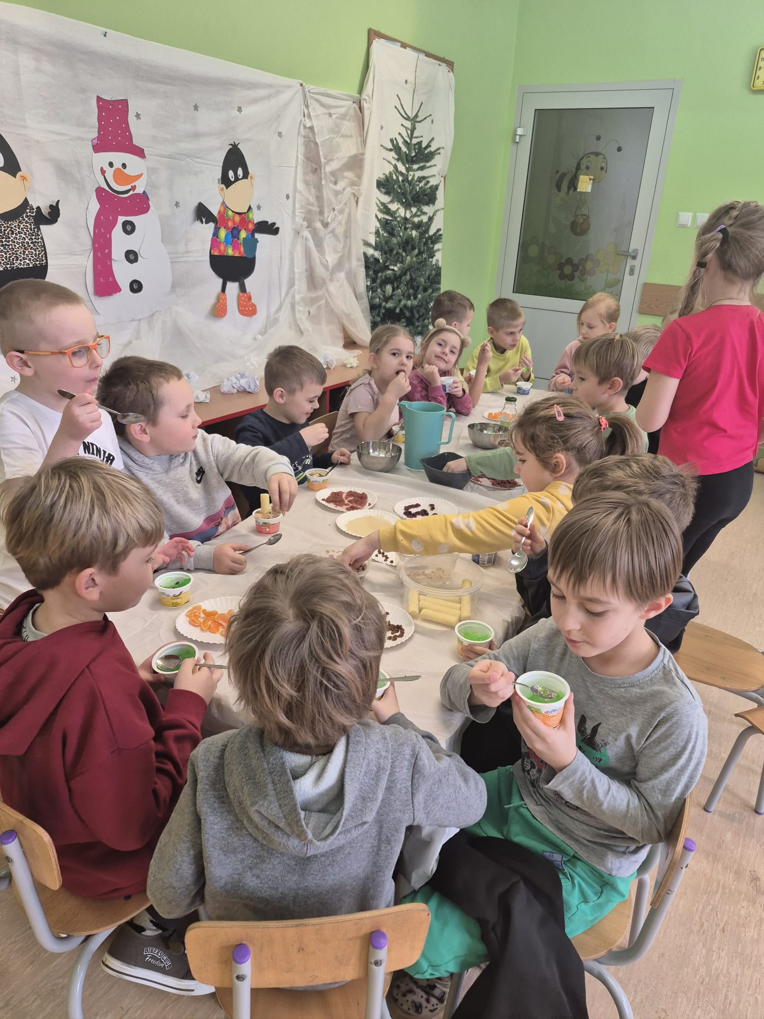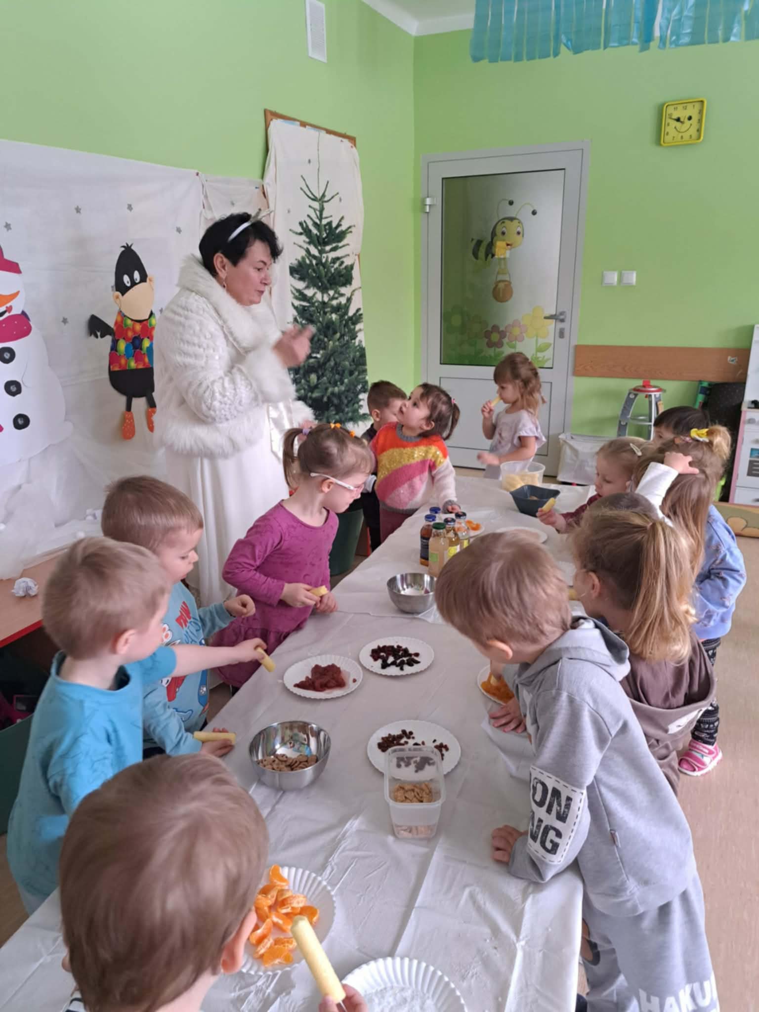 W tej grupie królowały dźwięki! Dzieci wsłuchiwały się w odgłosy zimy, śpiewały zimowe piosenki i muzykowały przy użyciu instrumentów domowej roboty. Prawdziwym hitem okazała się sensoryczna ścieżka muzyczna, która pozwoliła przedszkolakom „wychodzić” rytm zimy.