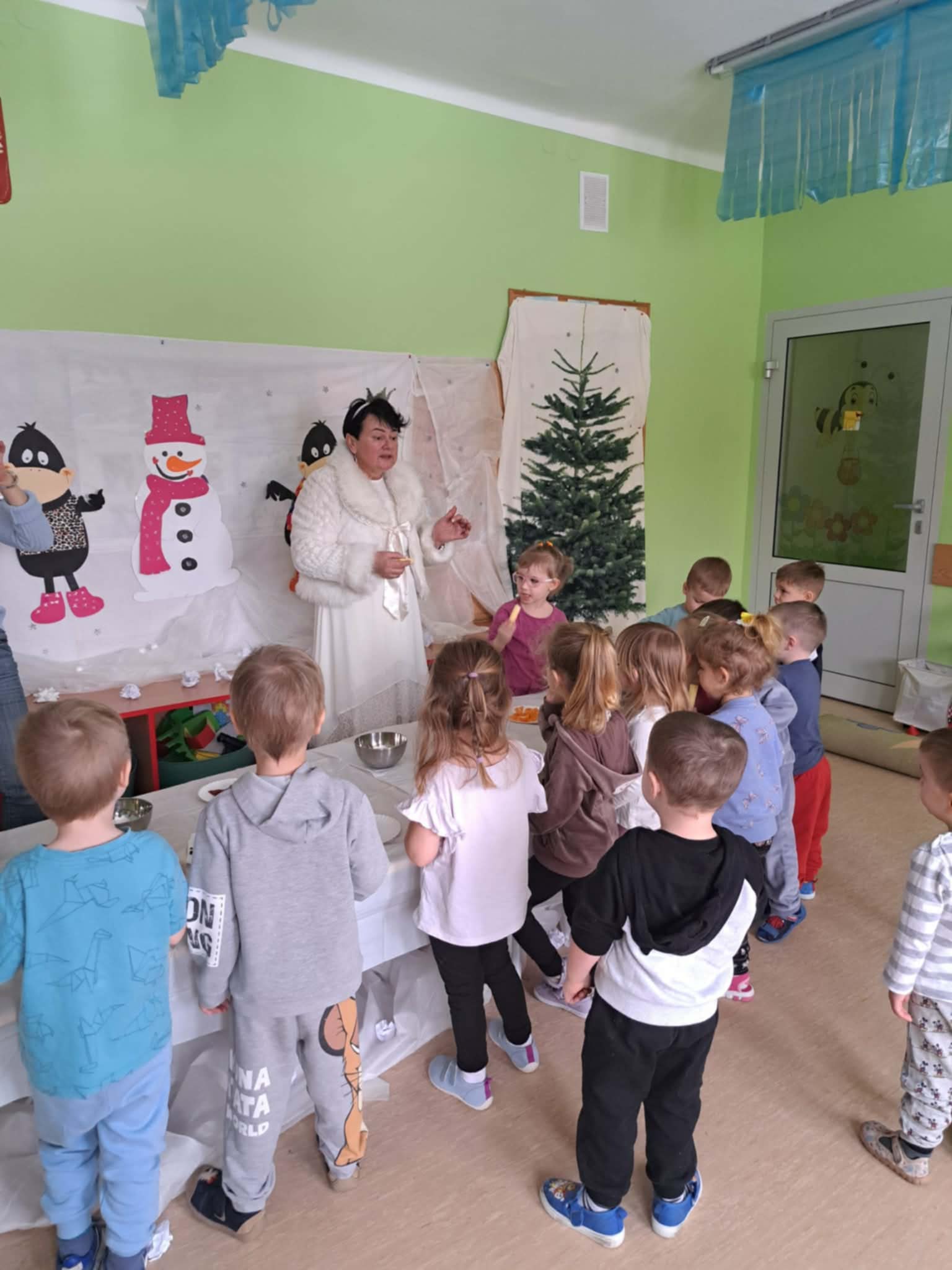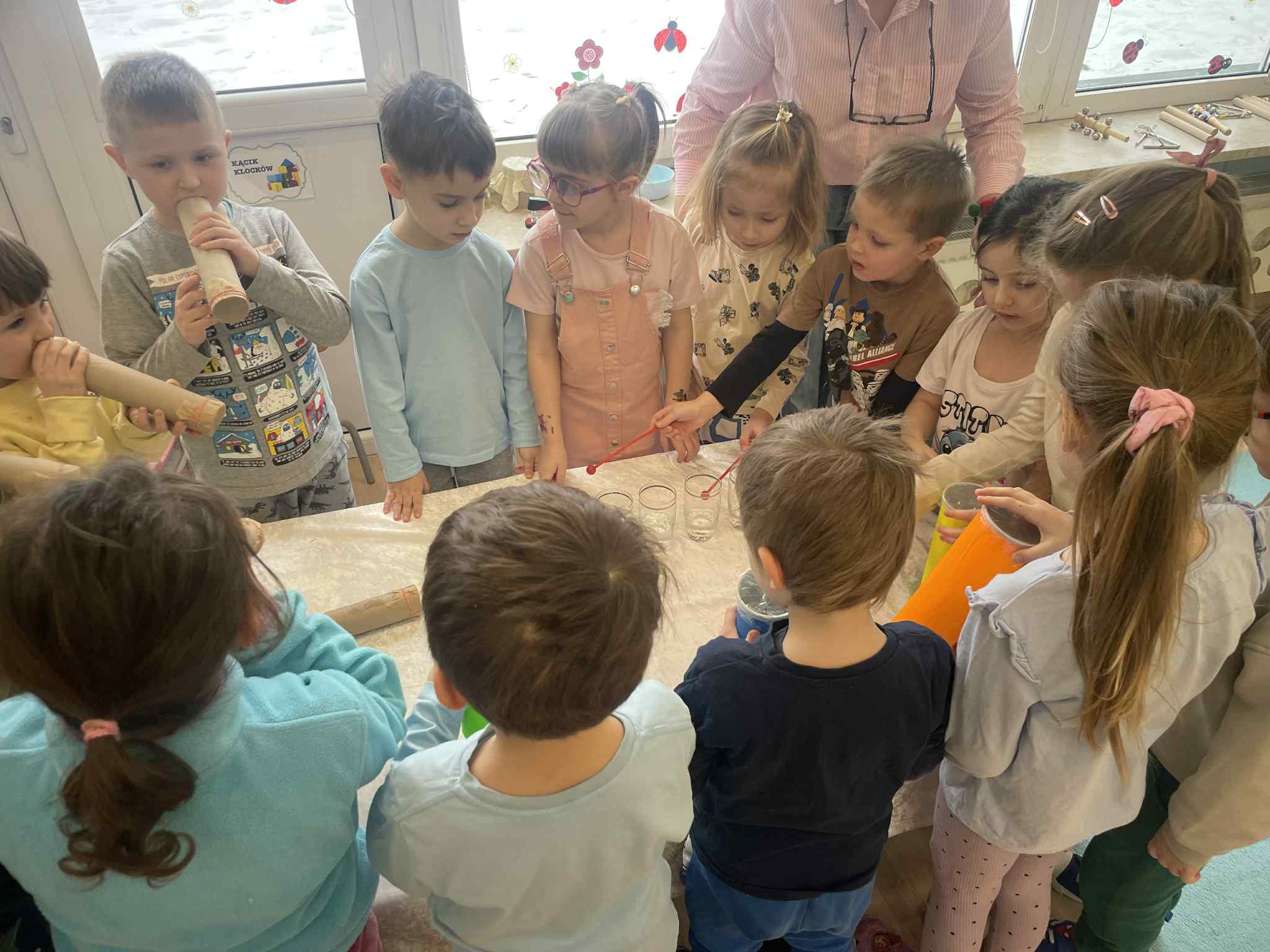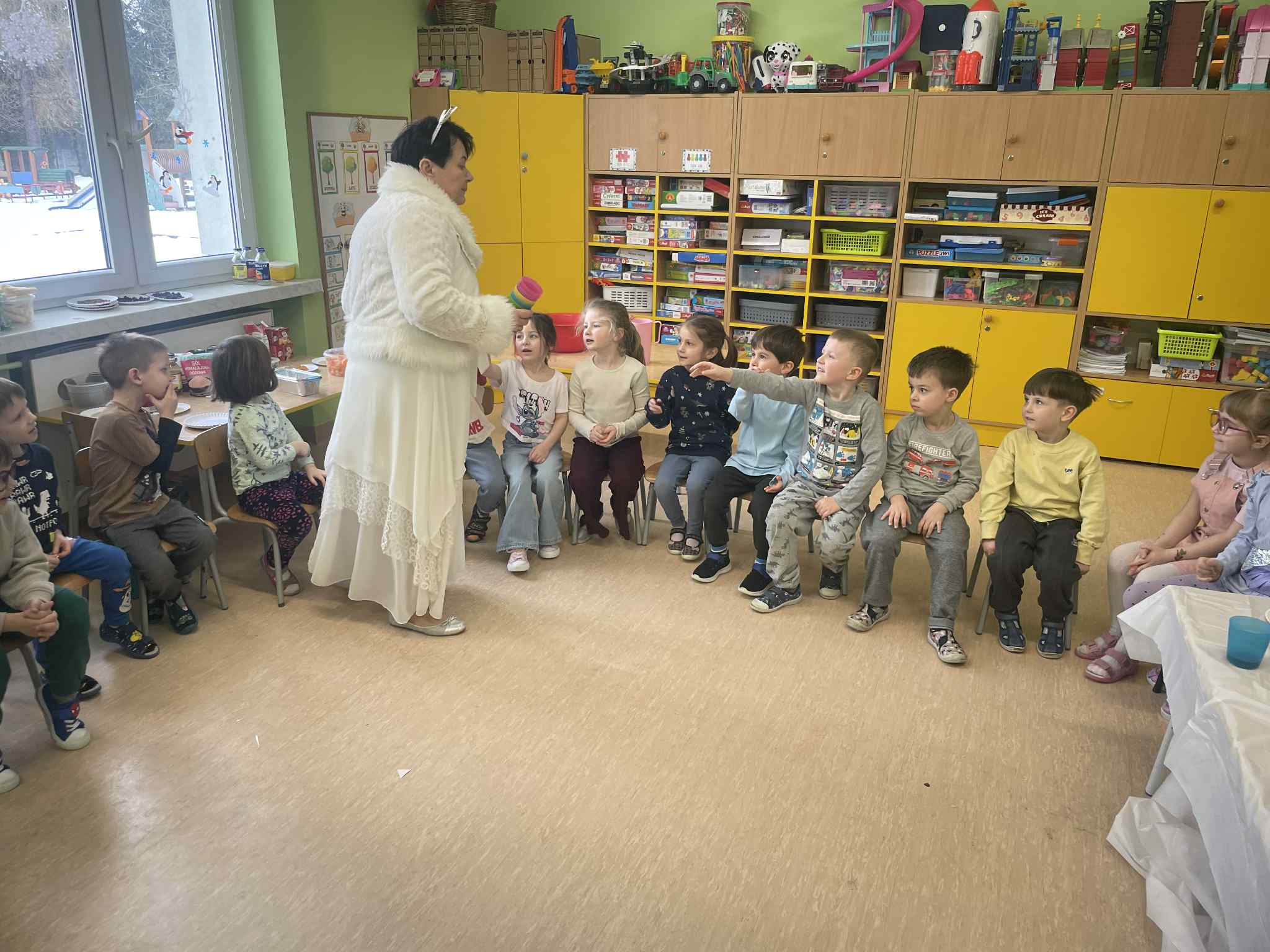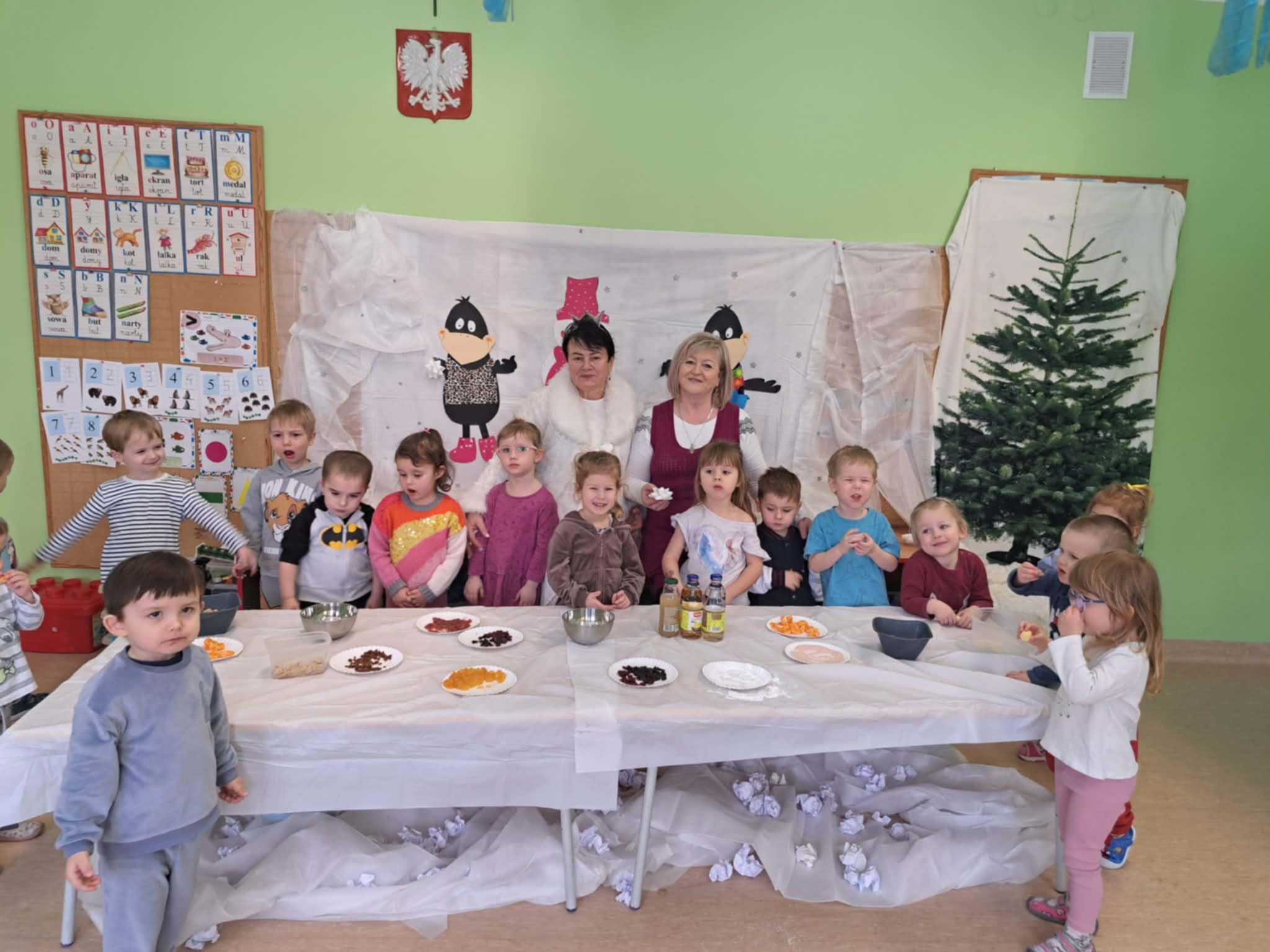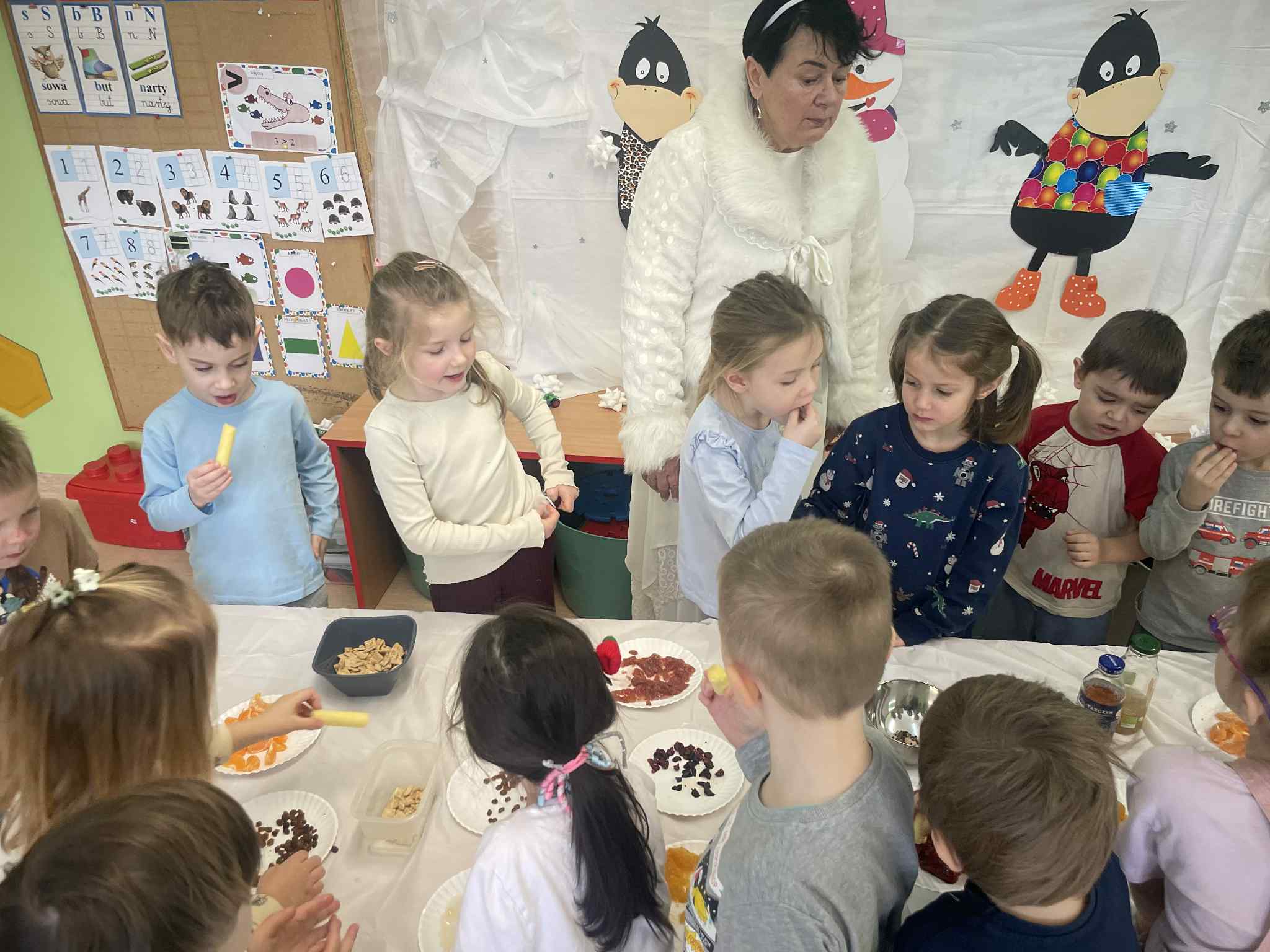 W tej grupie królowały dźwięki! Dzieci wsłuchiwały się w odgłosy zimy, śpiewały zimowe piosenki i muzykowały przy użyciu instrumentów domowej roboty. Prawdziwym hitem okazała się sensoryczna ścieżka muzyczna, która pozwoliła przedszkolakom „wychodzić” rytm zimy.