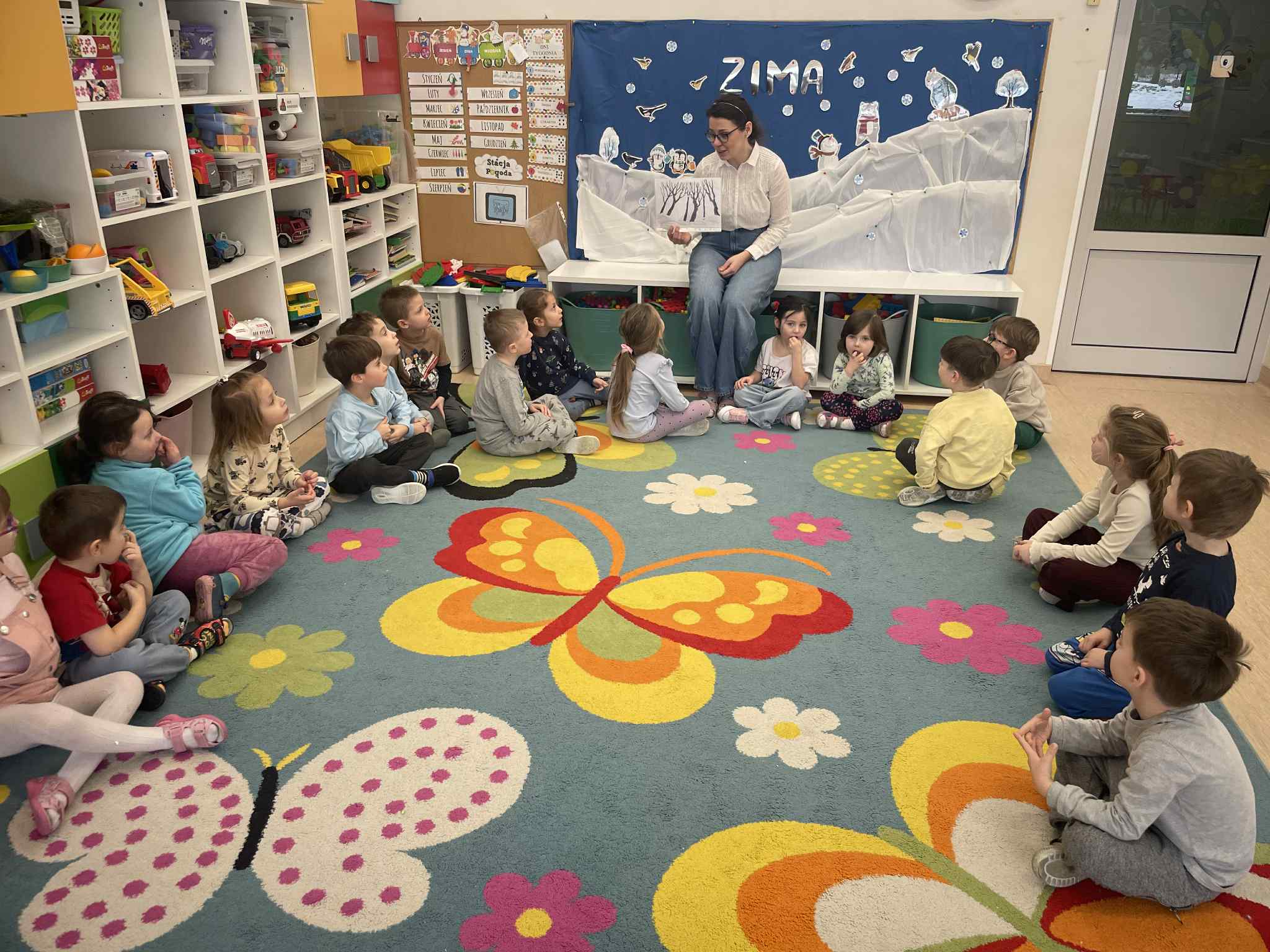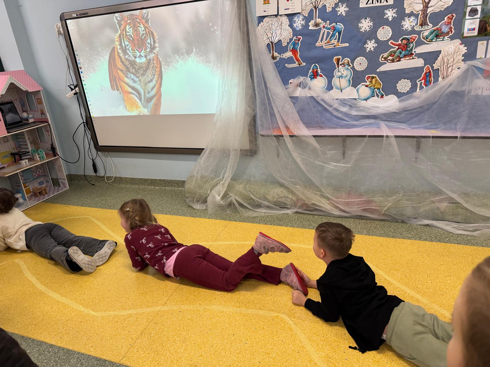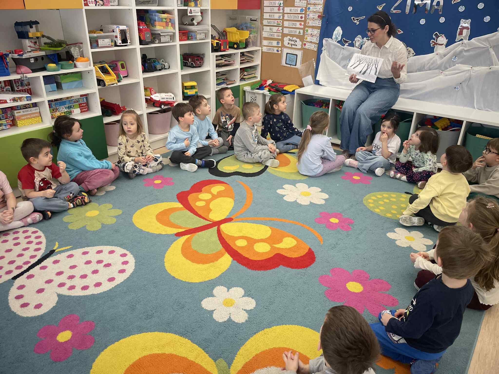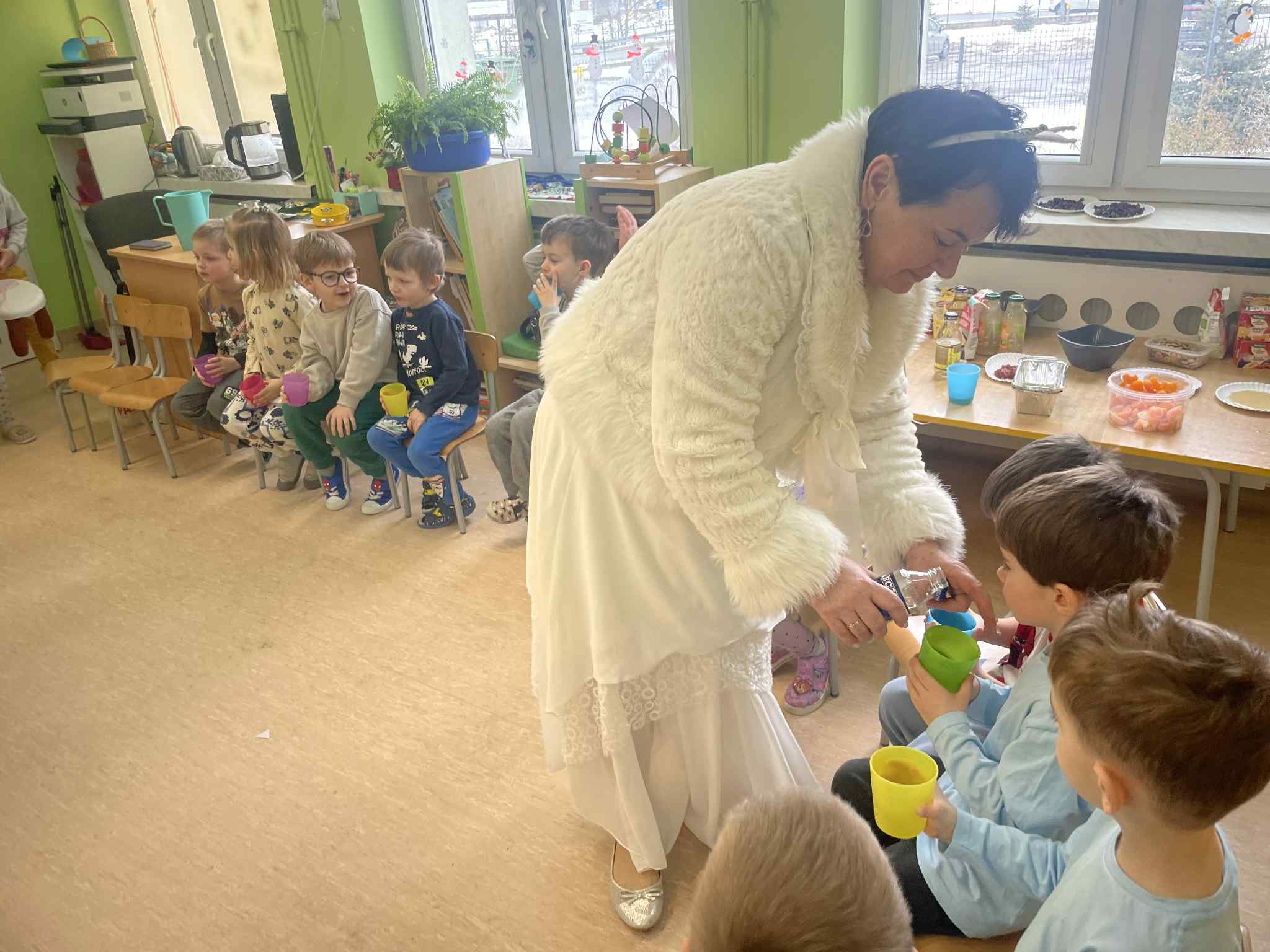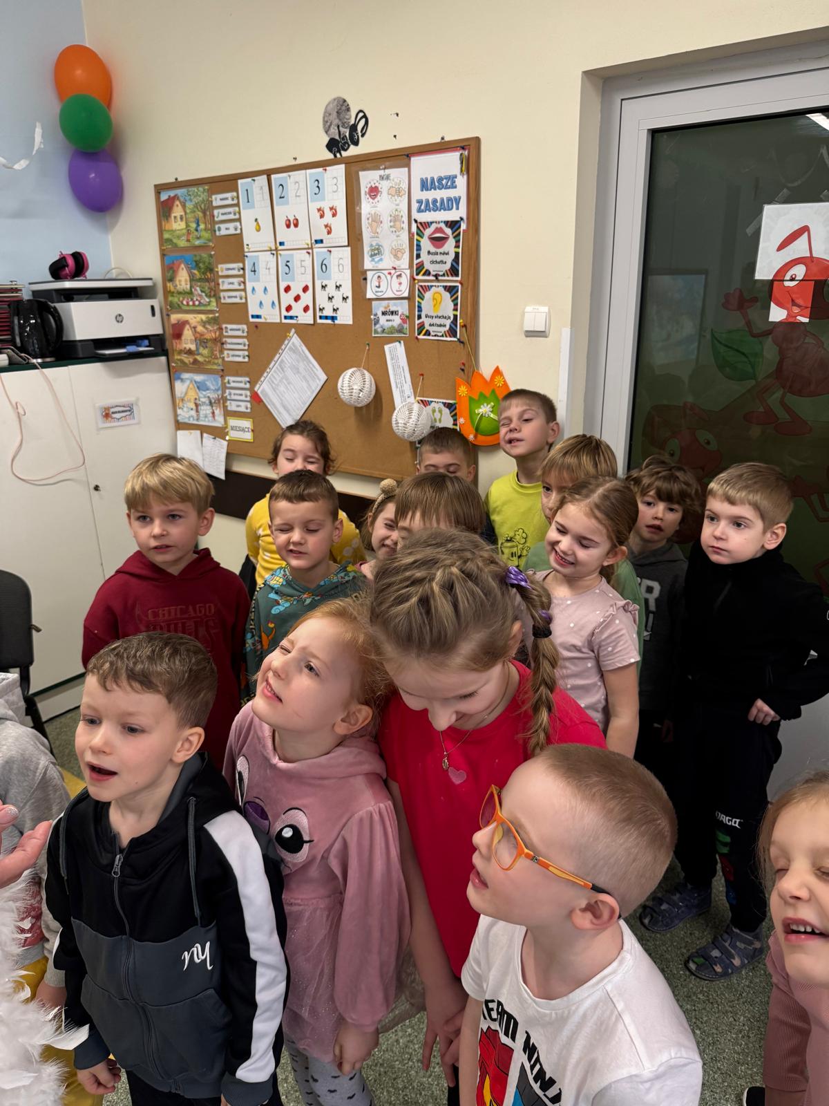 W tej grupie królowały dźwięki! Dzieci wsłuchiwały się w odgłosy zimy, śpiewały zimowe piosenki i muzykowały przy użyciu instrumentów domowej roboty. Prawdziwym hitem okazała się sensoryczna ścieżka muzyczna, która pozwoliła przedszkolakom „wychodzić” rytm zimy.