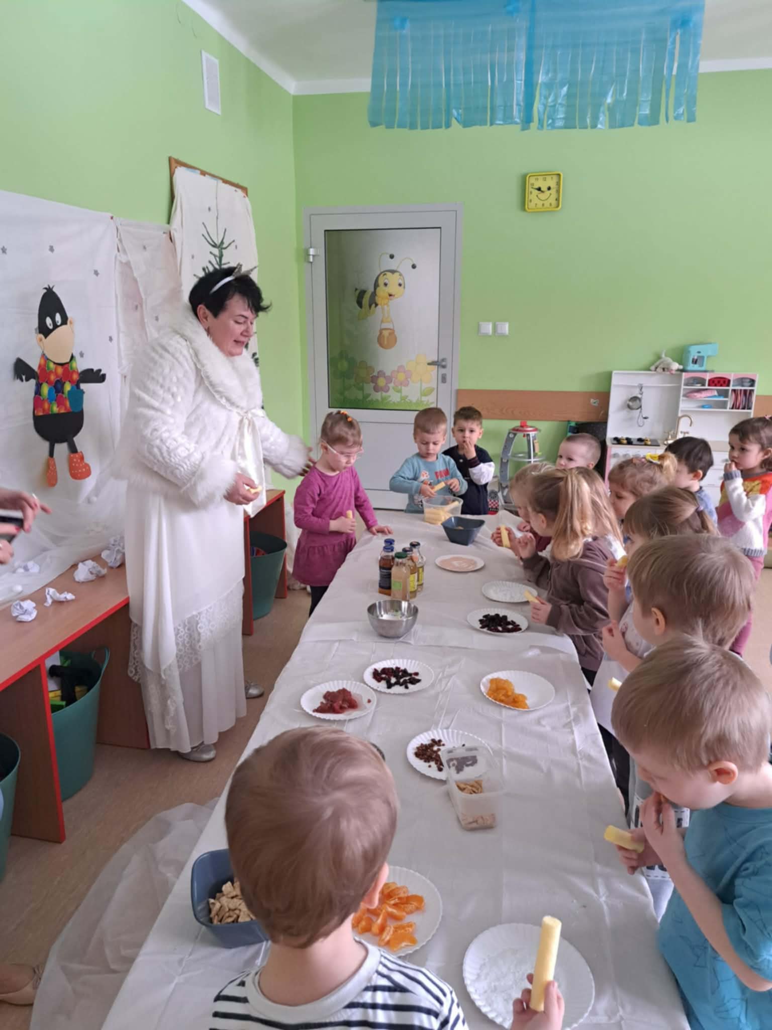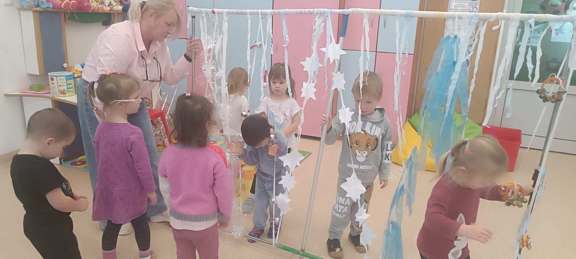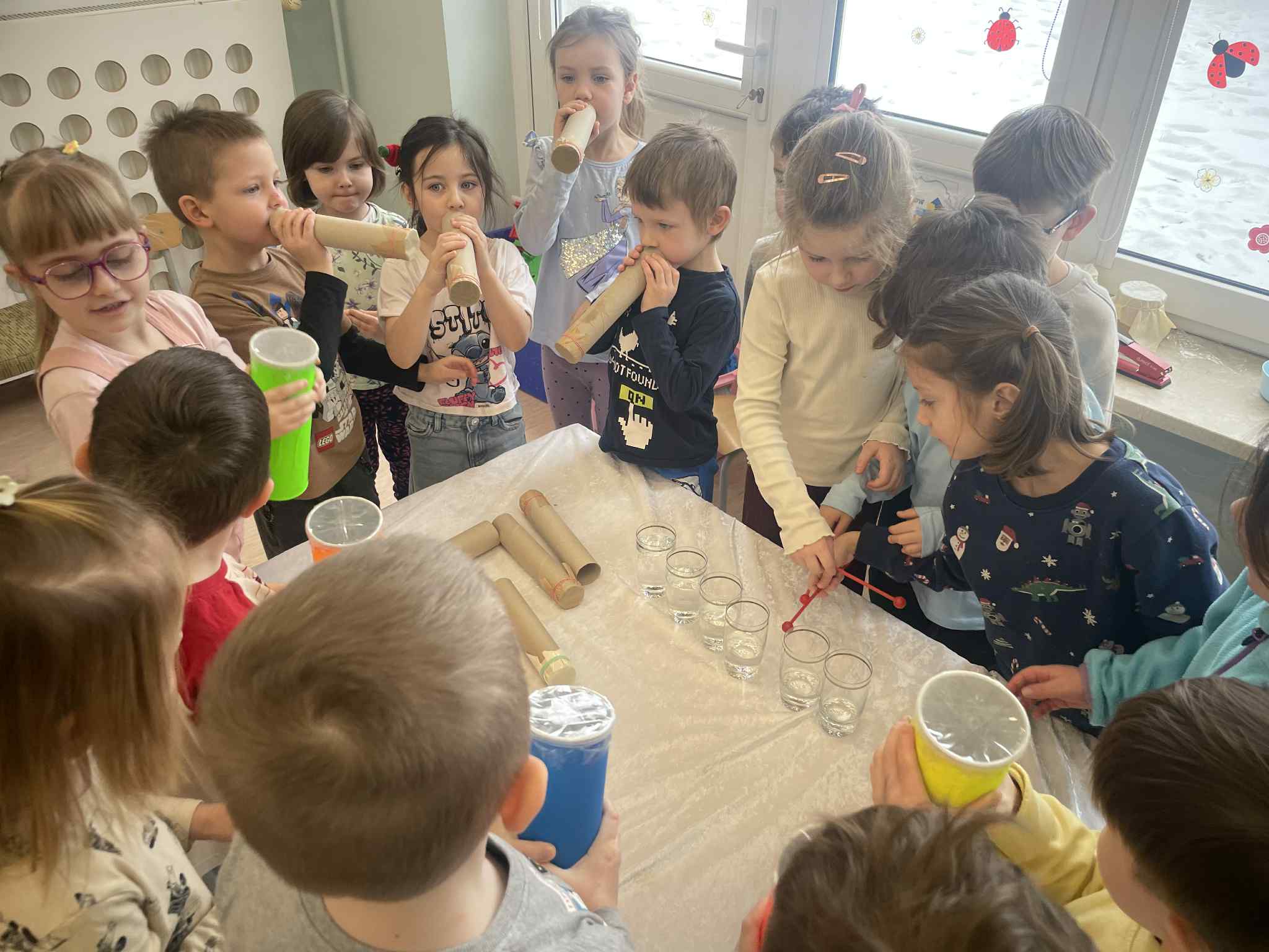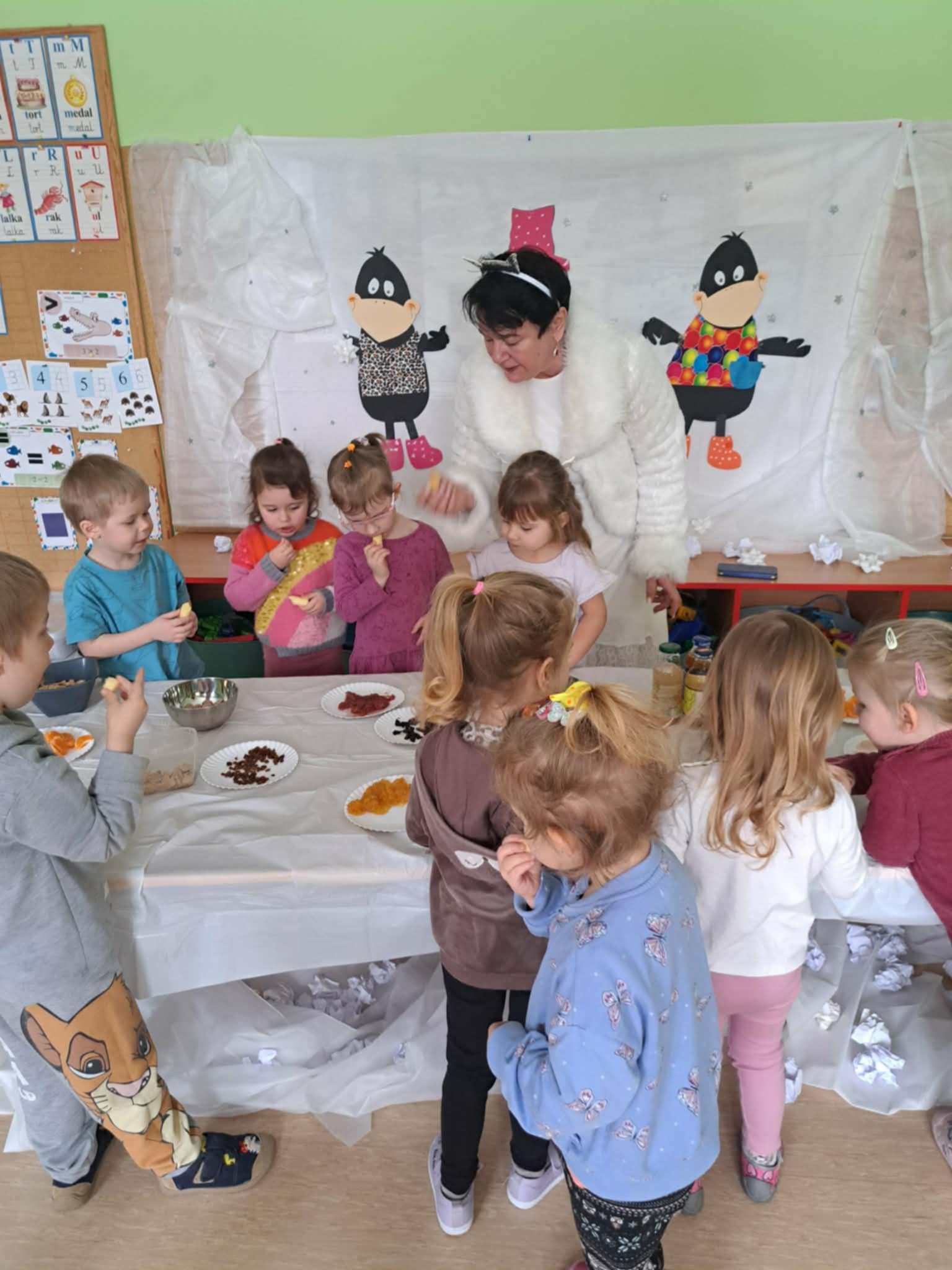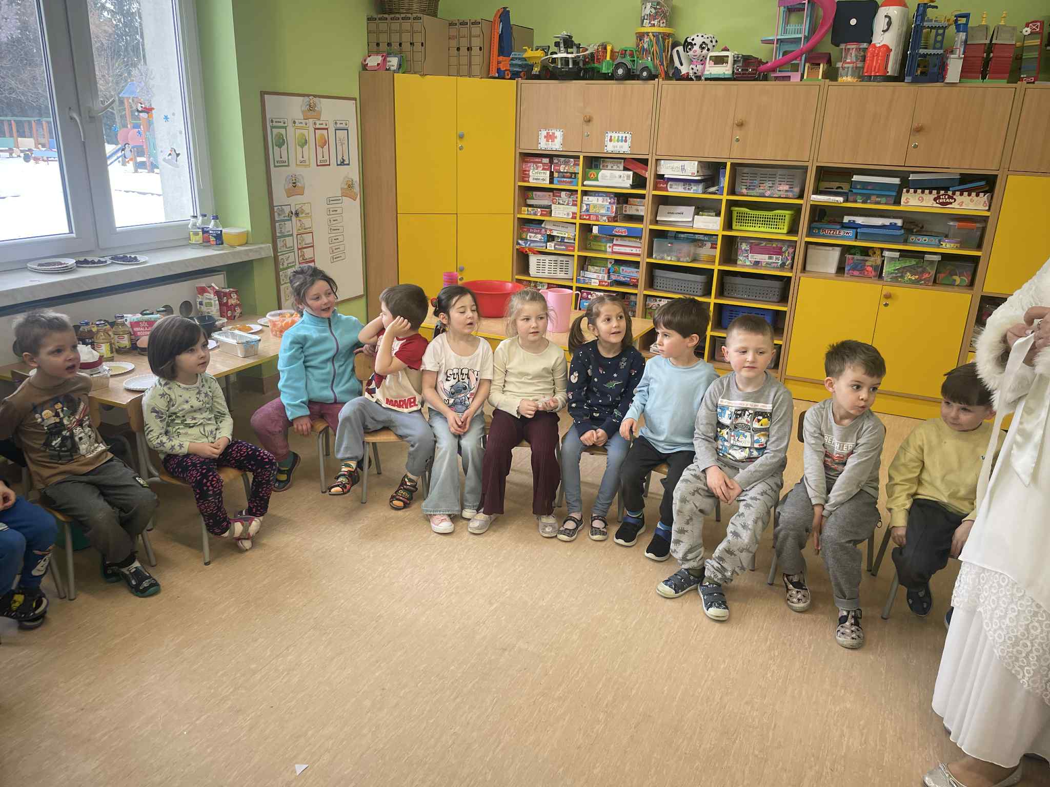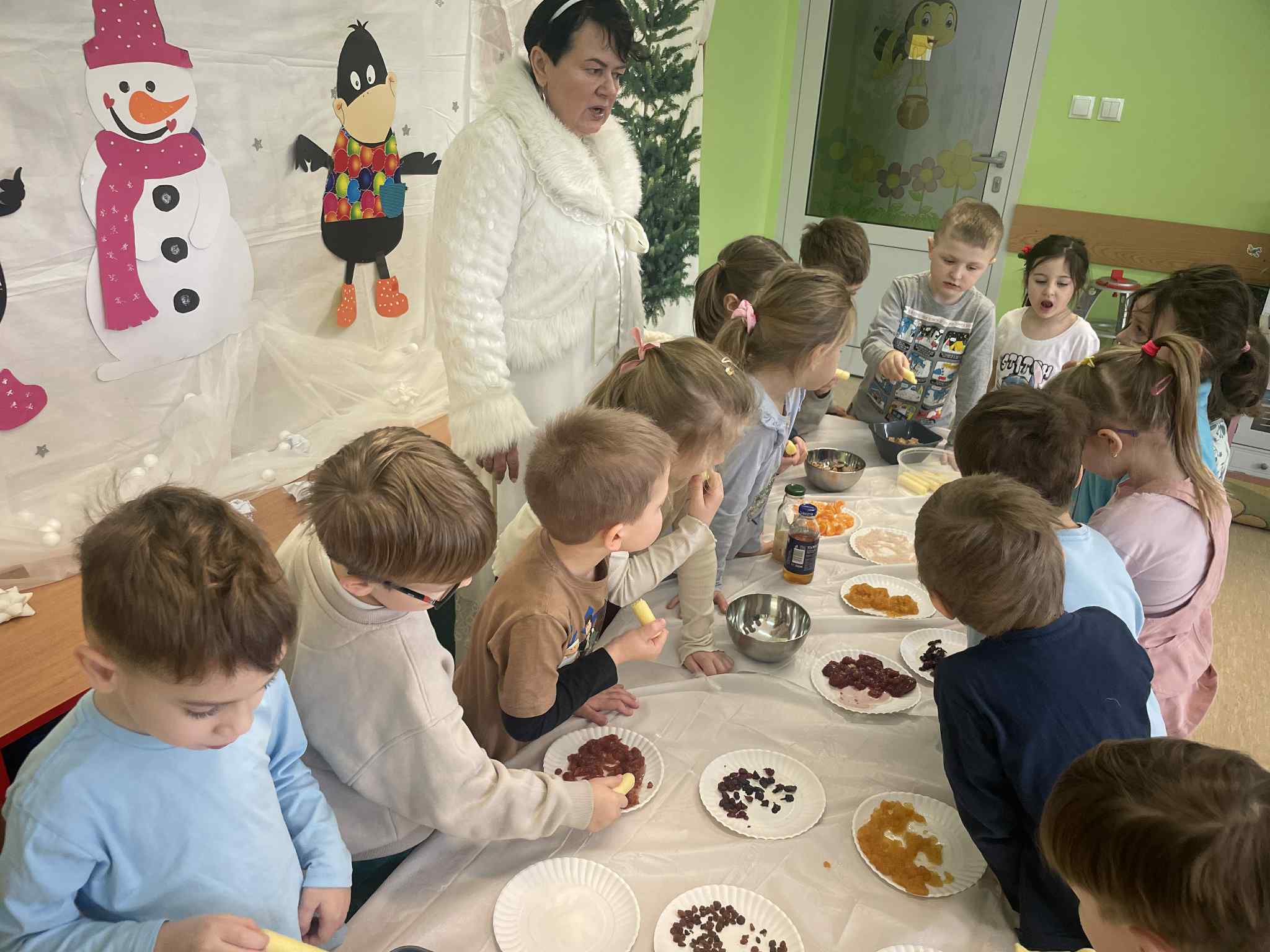 W tej grupie królowały dźwięki! Dzieci wsłuchiwały się w odgłosy zimy, śpiewały zimowe piosenki i muzykowały przy użyciu instrumentów domowej roboty. Prawdziwym hitem okazała się sensoryczna ścieżka muzyczna, która pozwoliła przedszkolakom „wychodzić” rytm zimy.