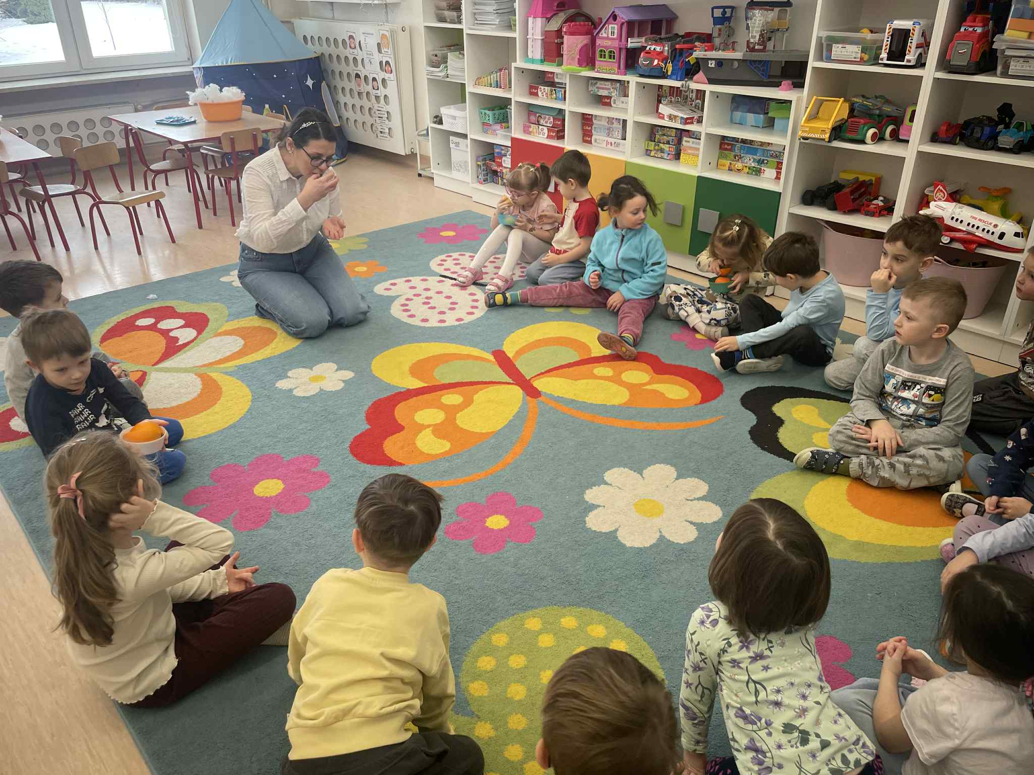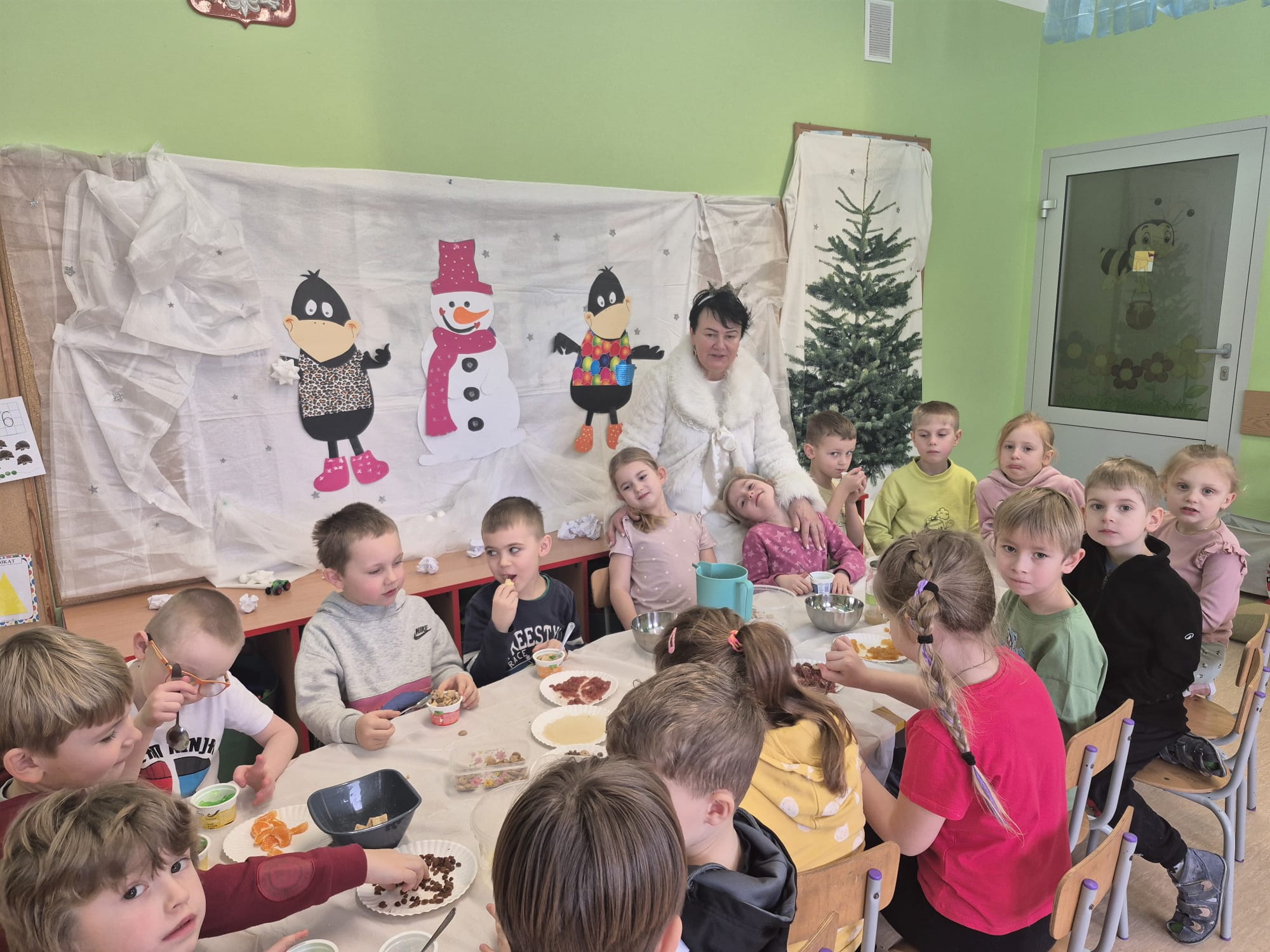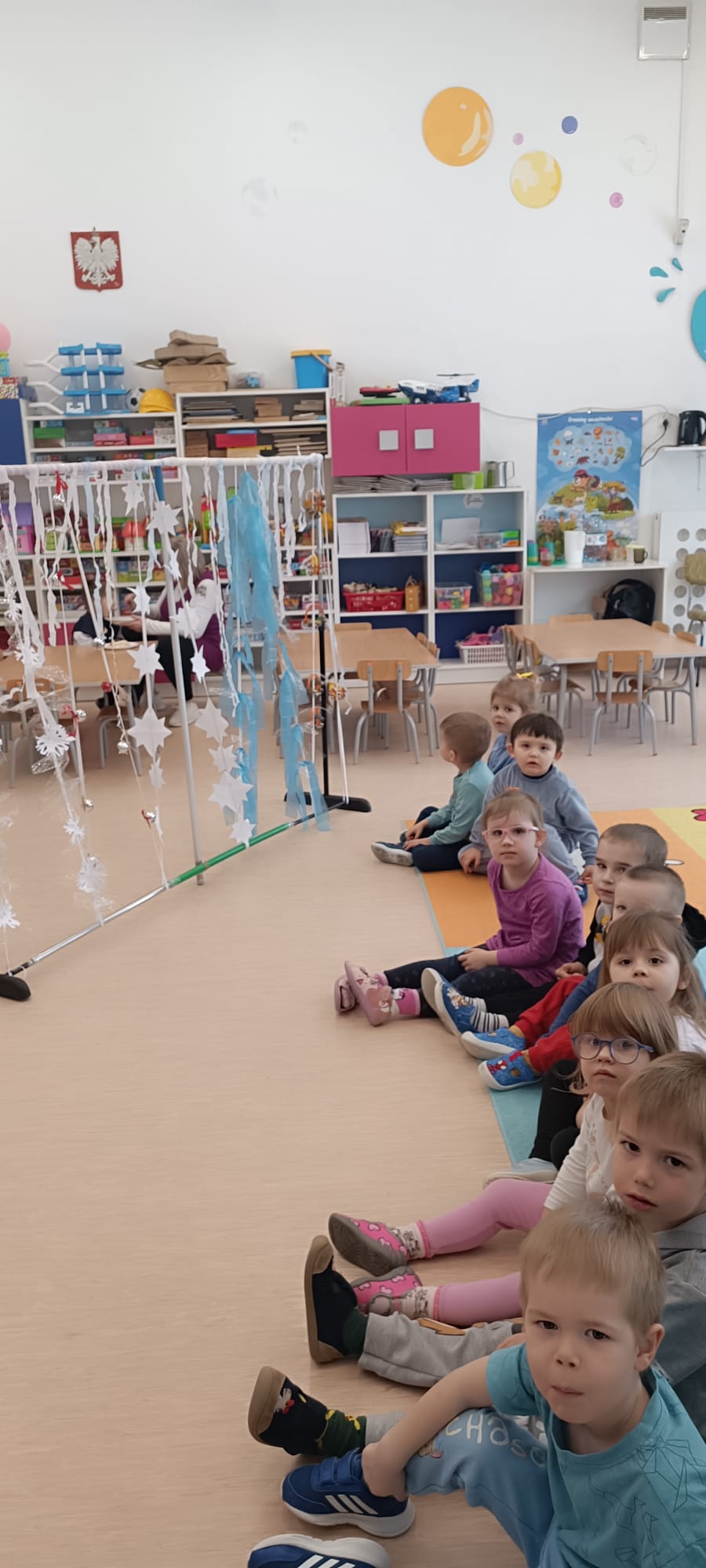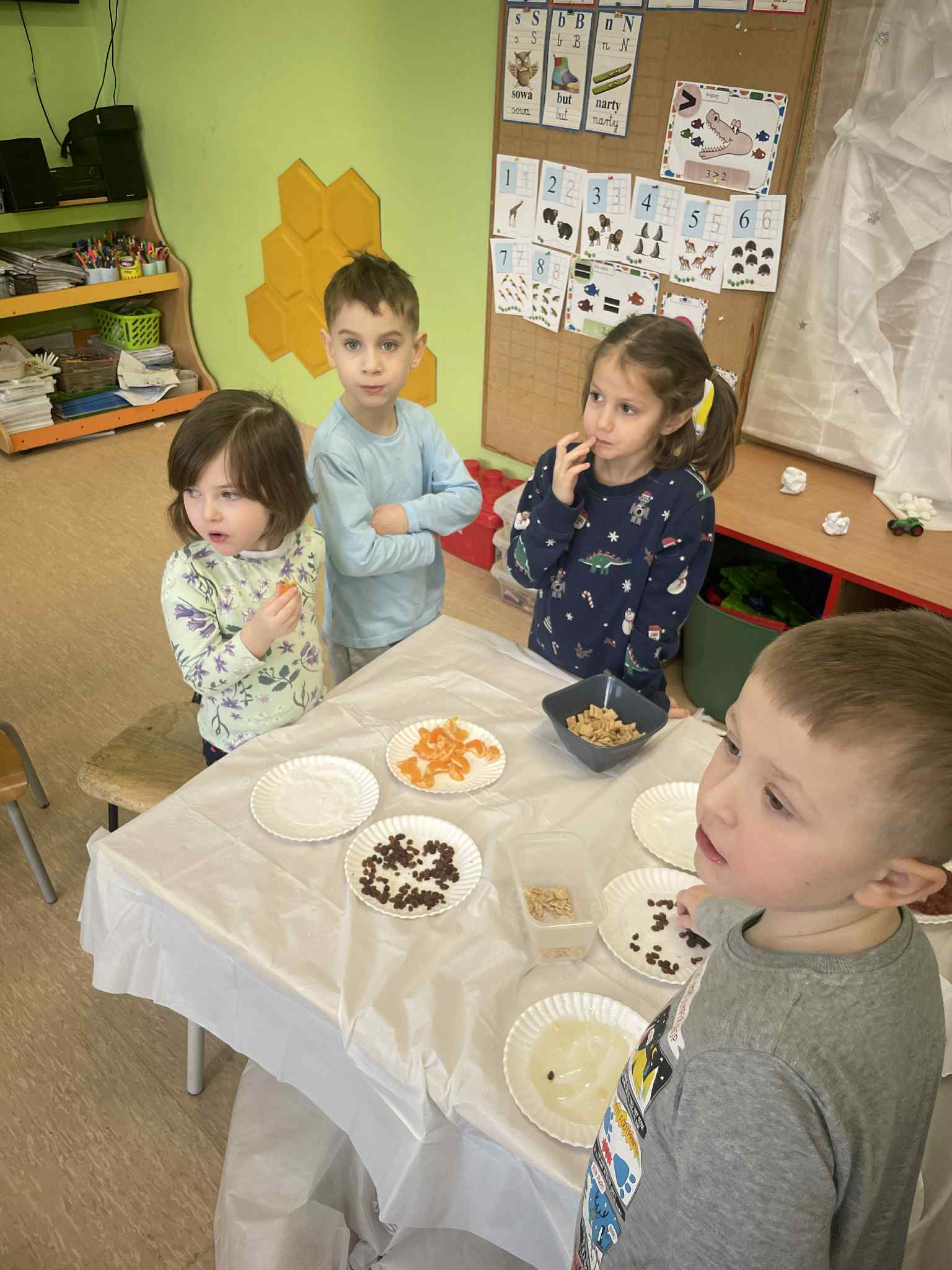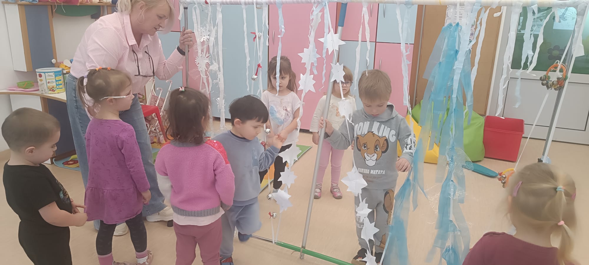W tej grupie królowały dźwięki! Dzieci wsłuchiwały się w odgłosy zimy, śpiewały zimowe piosenki i muzykowały przy użyciu instrumentów domowej roboty. Prawdziwym hitem okazała się sensoryczna ścieżka muzyczna, która pozwoliła przedszkolakom „wychodzić” rytm zimy.