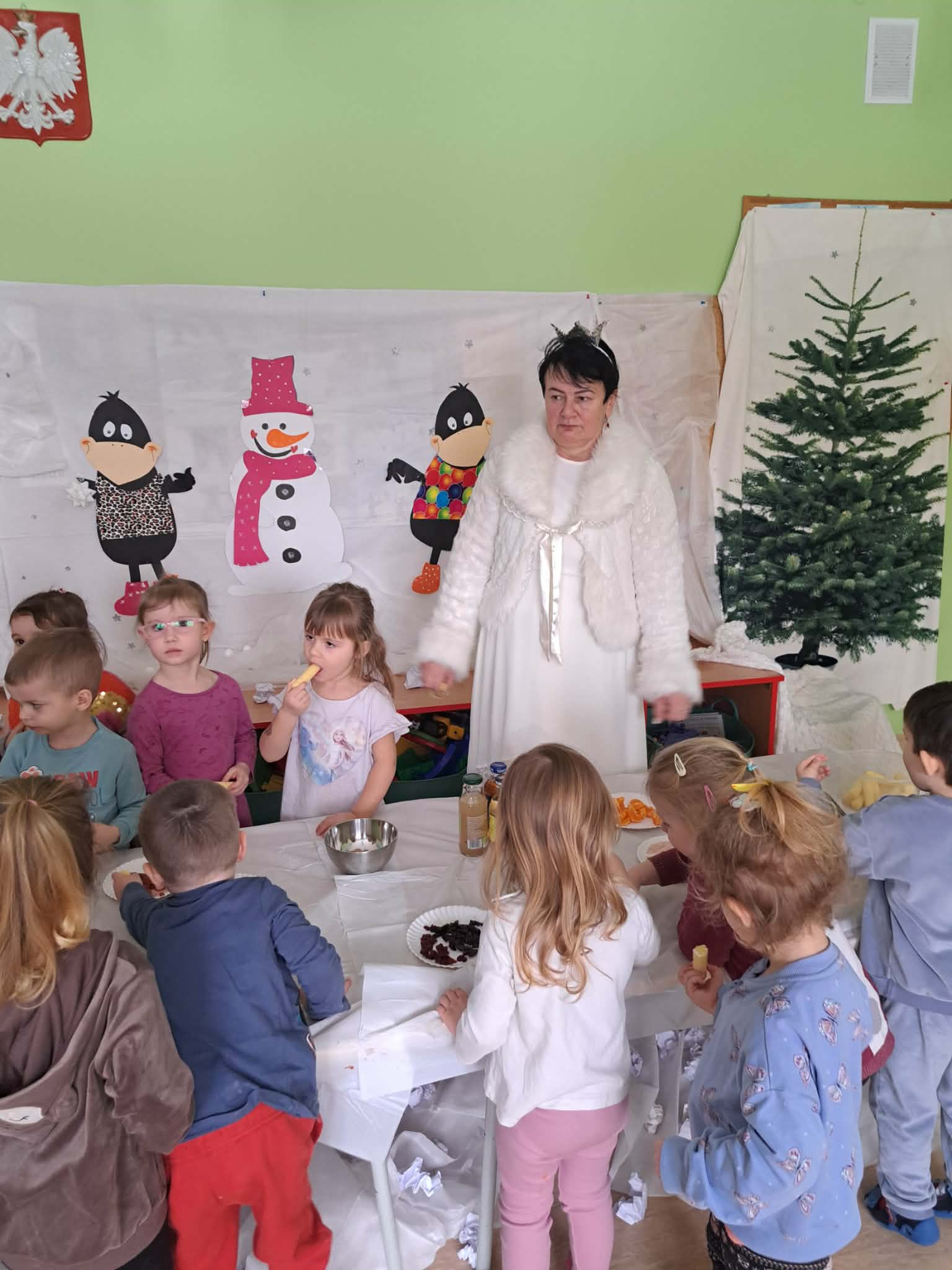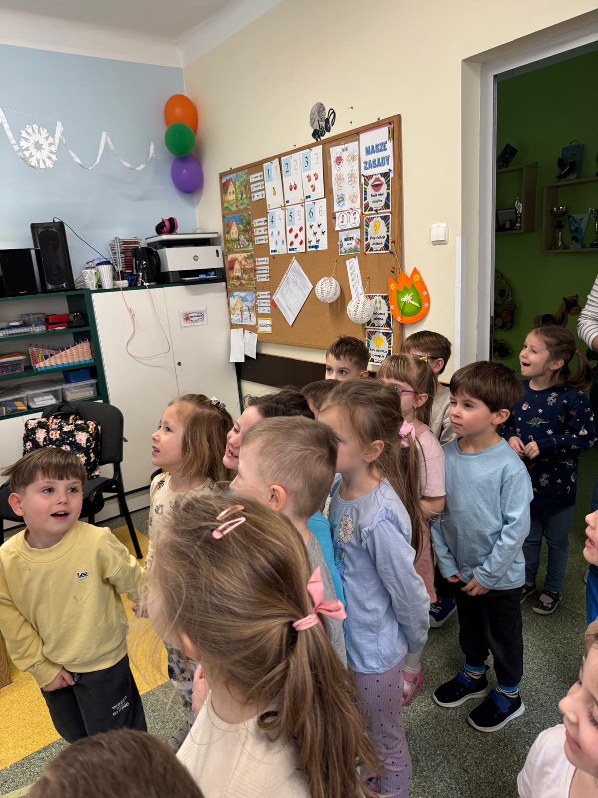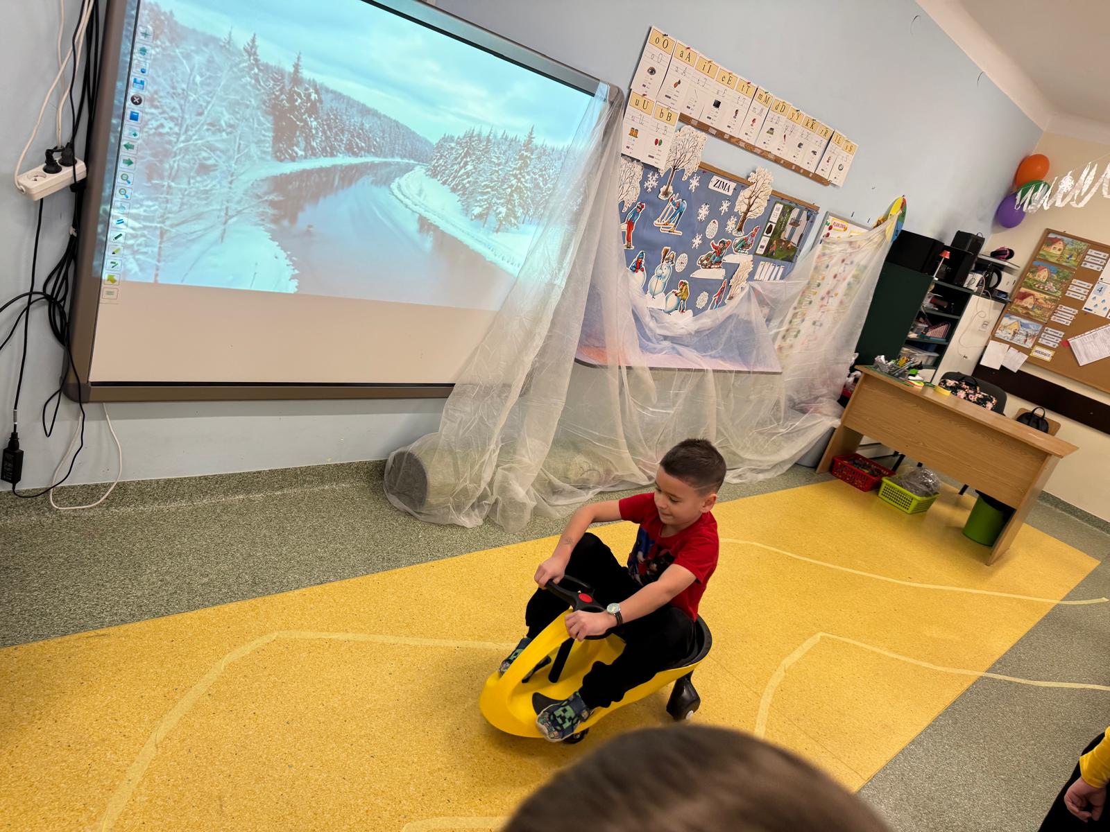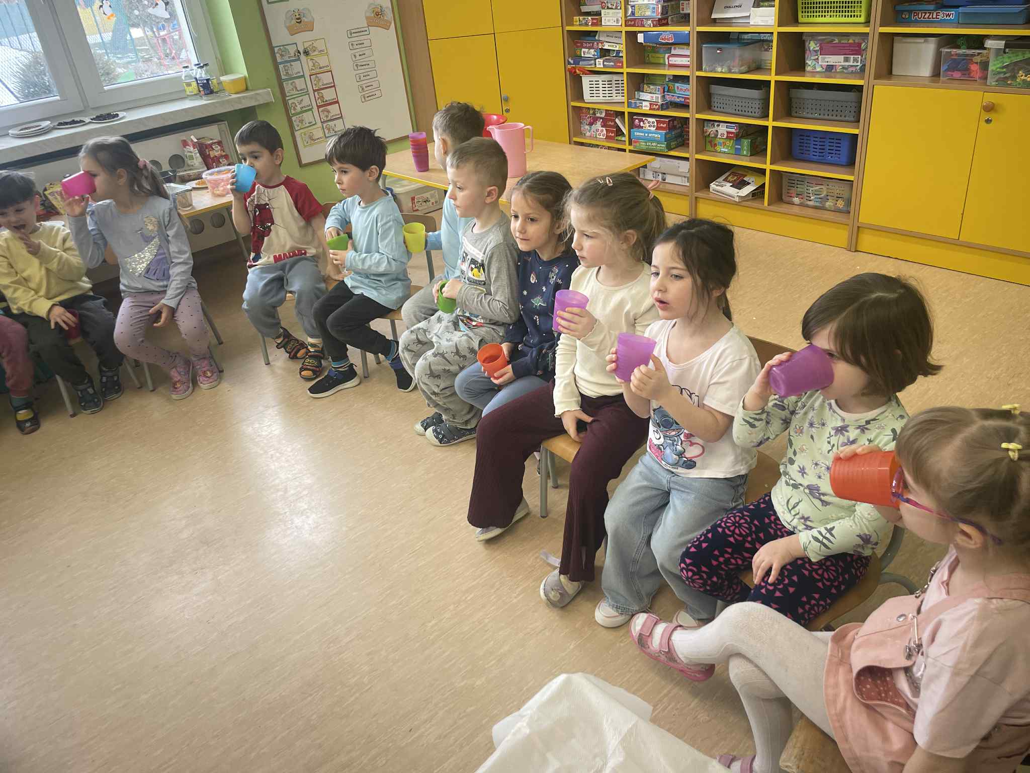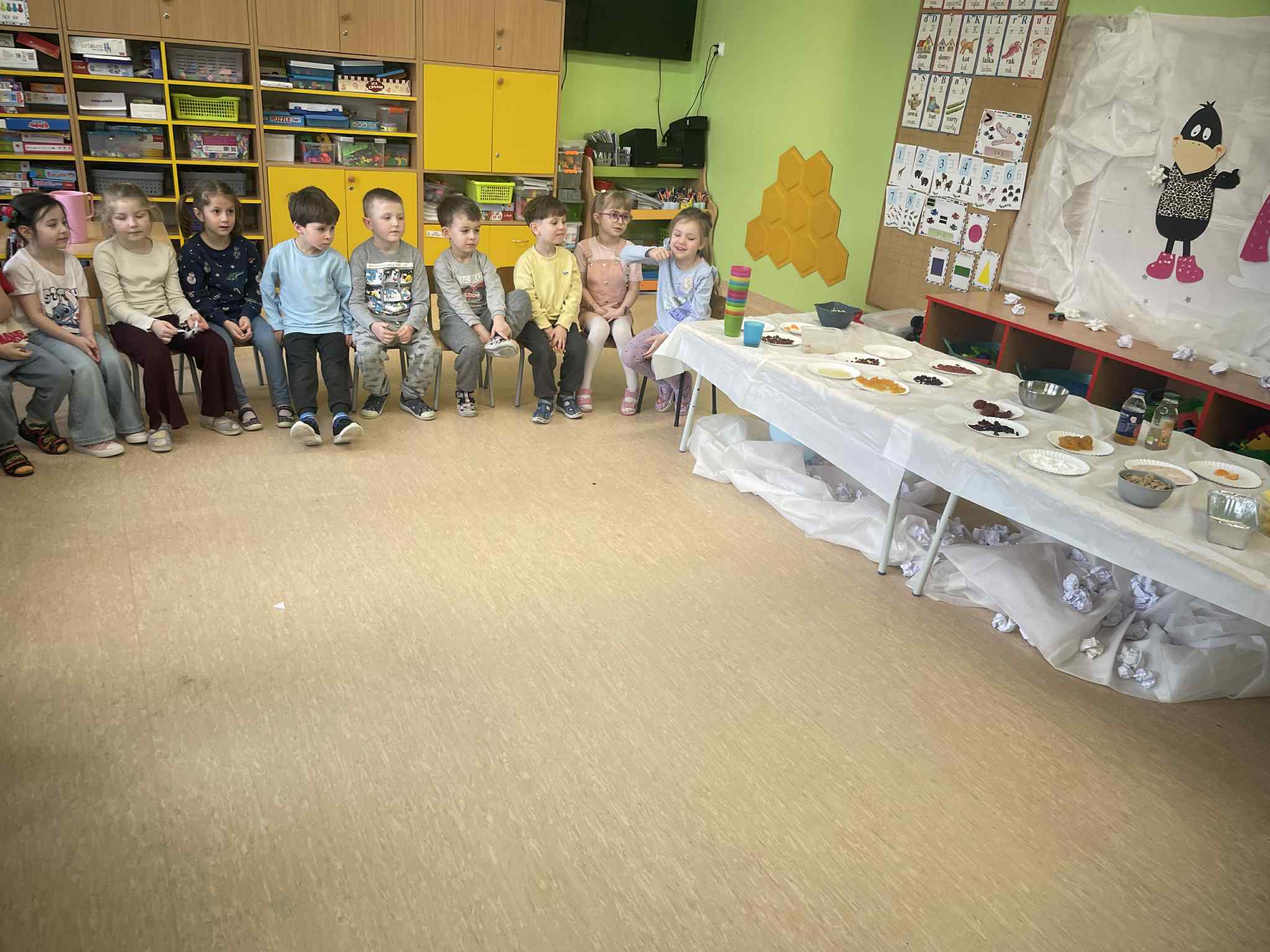 W tej grupie królowały dźwięki! Dzieci wsłuchiwały się w odgłosy zimy, śpiewały zimowe piosenki i muzykowały przy użyciu instrumentów domowej roboty. Prawdziwym hitem okazała się sensoryczna ścieżka muzyczna, która pozwoliła przedszkolakom „wychodzić” rytm zimy.