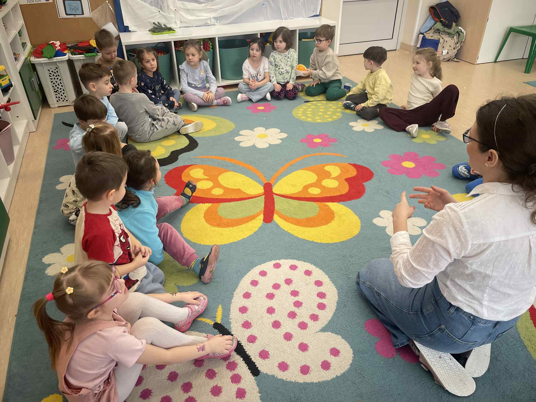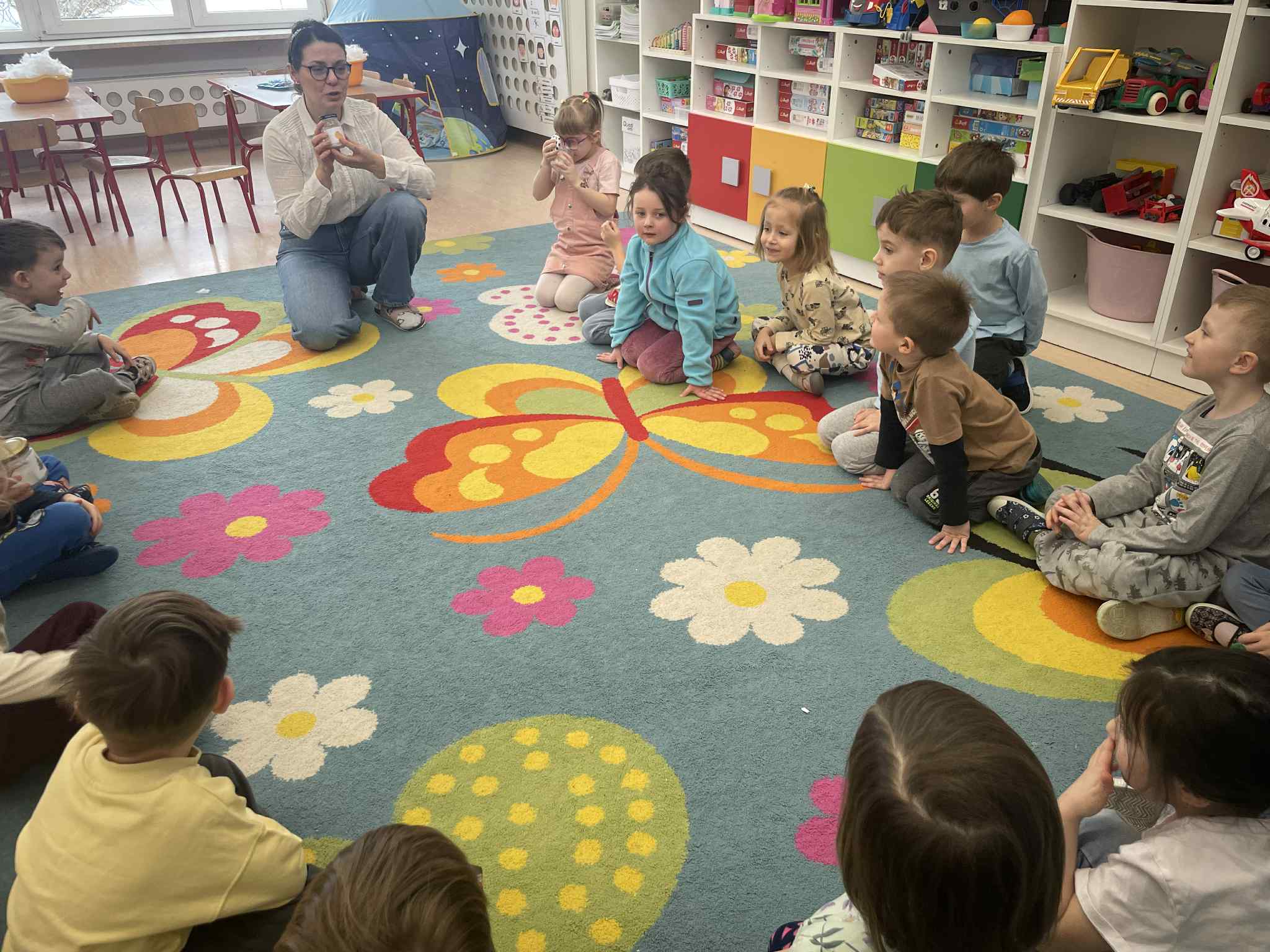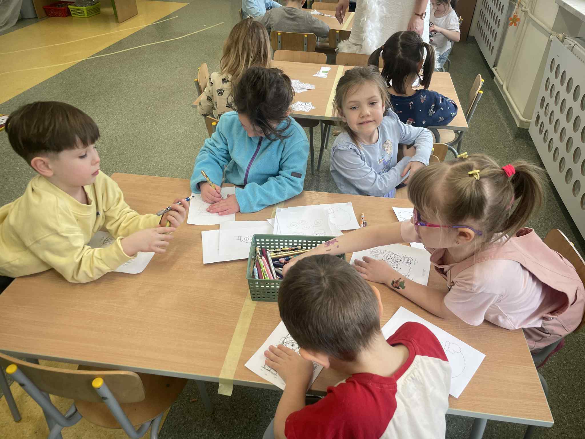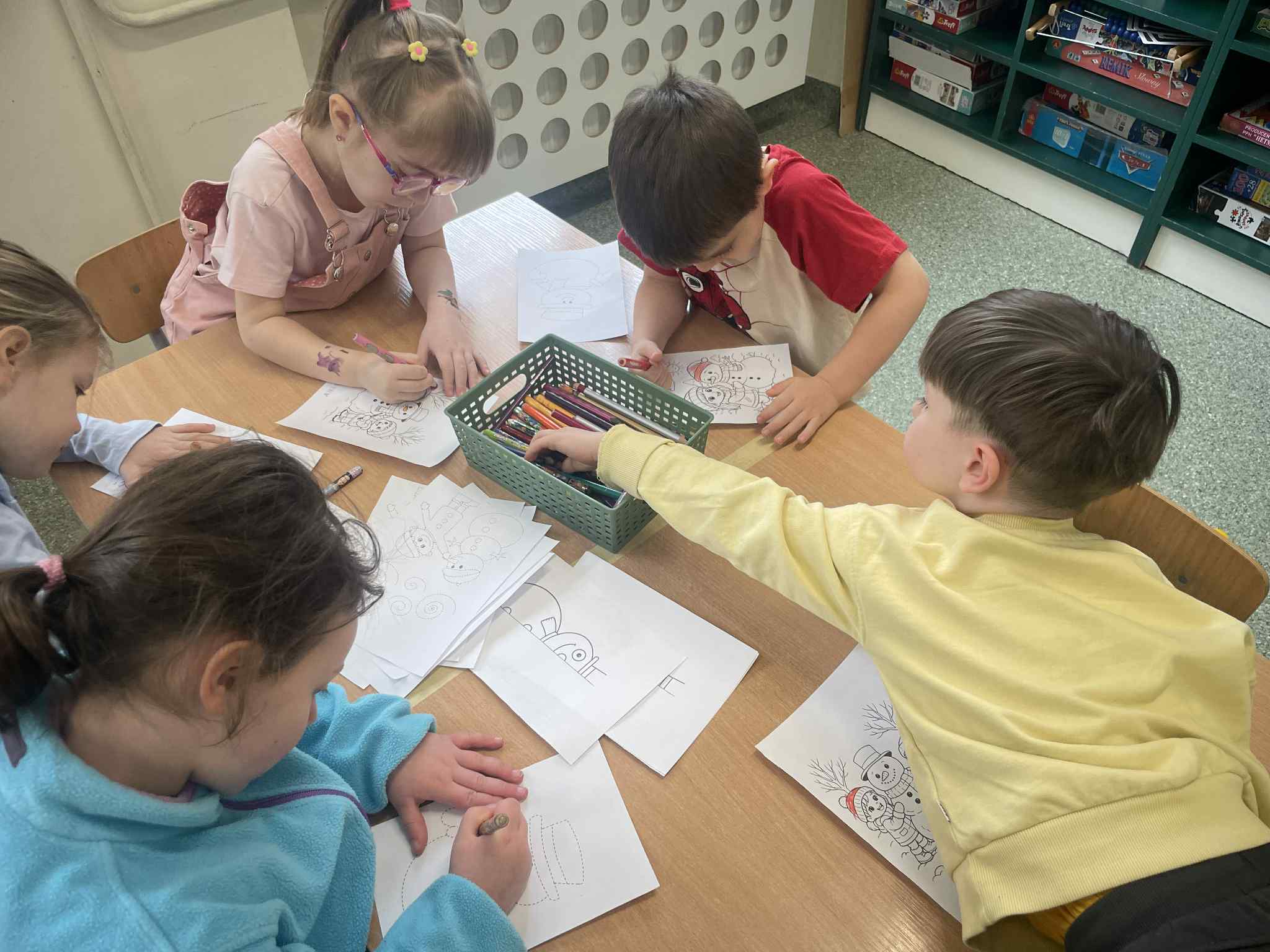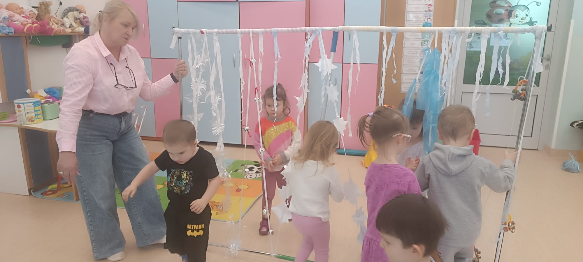 W tej grupie królowały dźwięki! Dzieci wsłuchiwały się w odgłosy zimy, śpiewały zimowe piosenki i muzykowały przy użyciu instrumentów domowej roboty. Prawdziwym hitem okazała się sensoryczna ścieżka muzyczna, która pozwoliła przedszkolakom „wychodzić” rytm zimy.