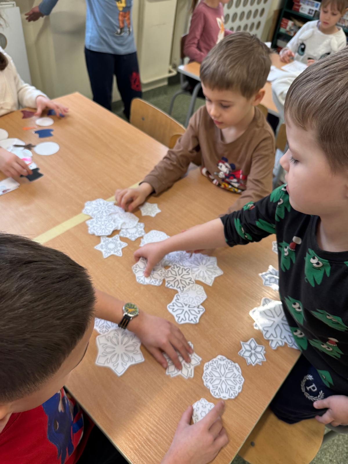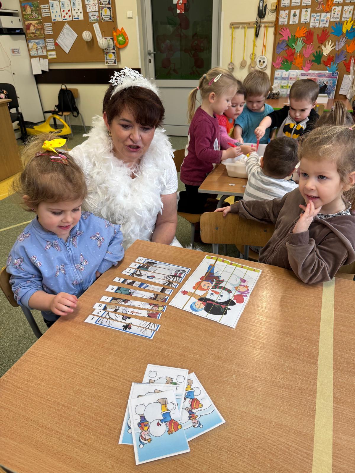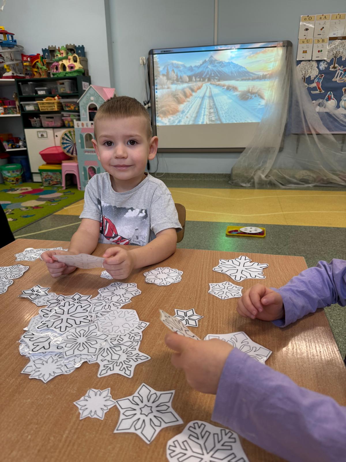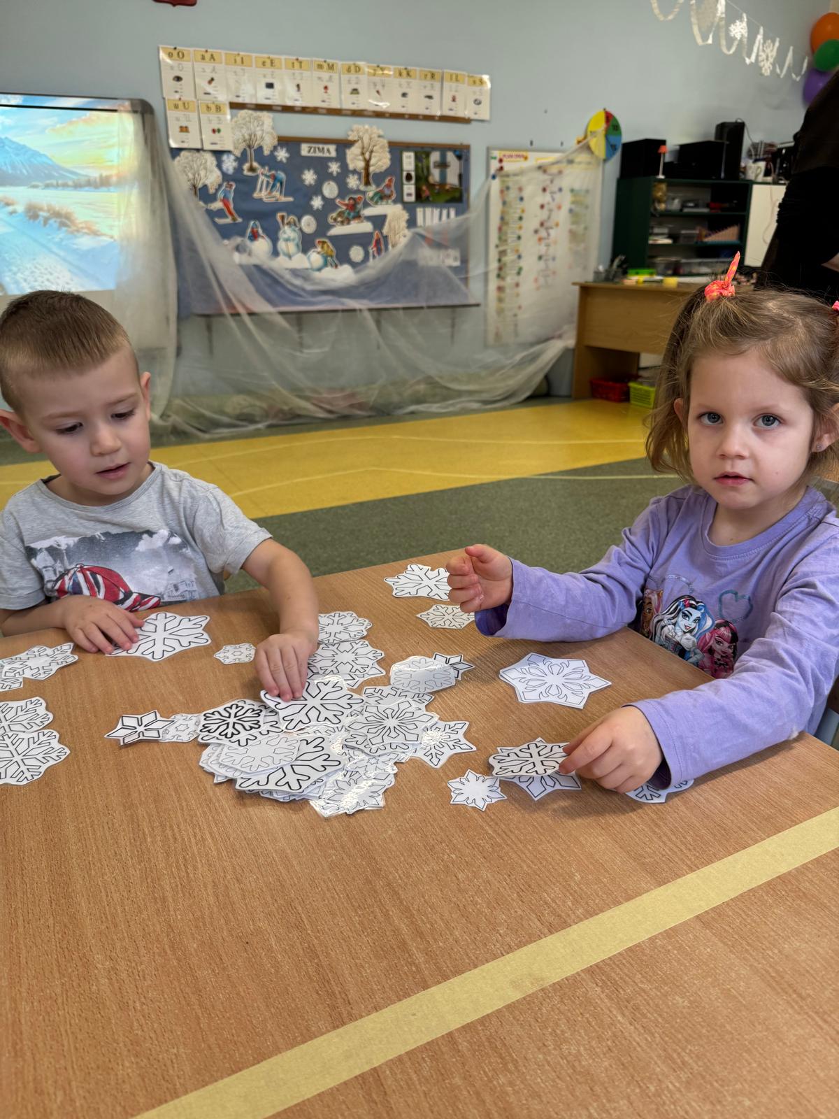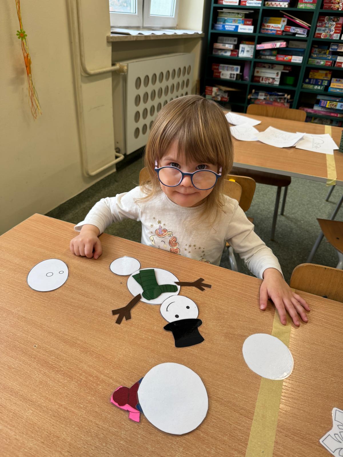 Tutaj przedszkolaki skupiły się na uważnej obserwacji. Dzieci układały zimowe puzzle, ćwicząc przy tym liczenie do 10, kolorowały według kodów i odnajdywały pary takich samych śnieżynek. Z lupami w dłoniach badały strukturę śniegu, sprawdzając, jakie tajemnice kryje w sobie biały puch. Na koniec pokonały pełen zakrętów tor przeszkód.