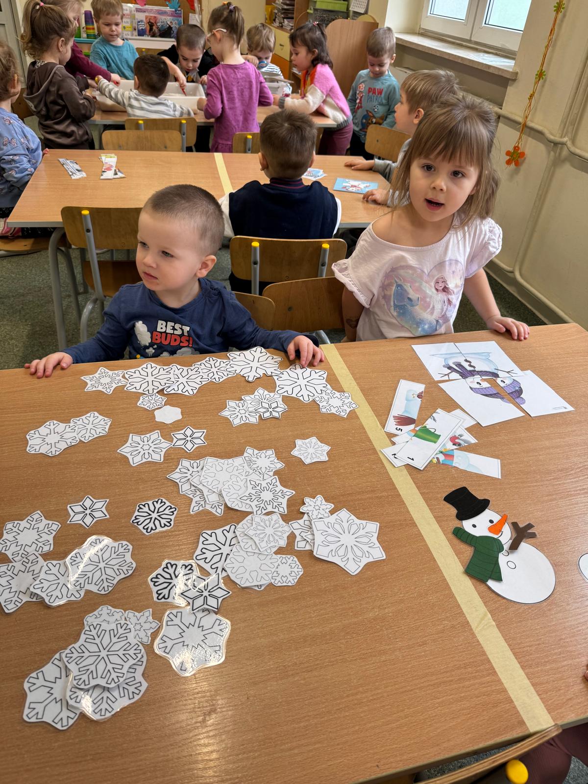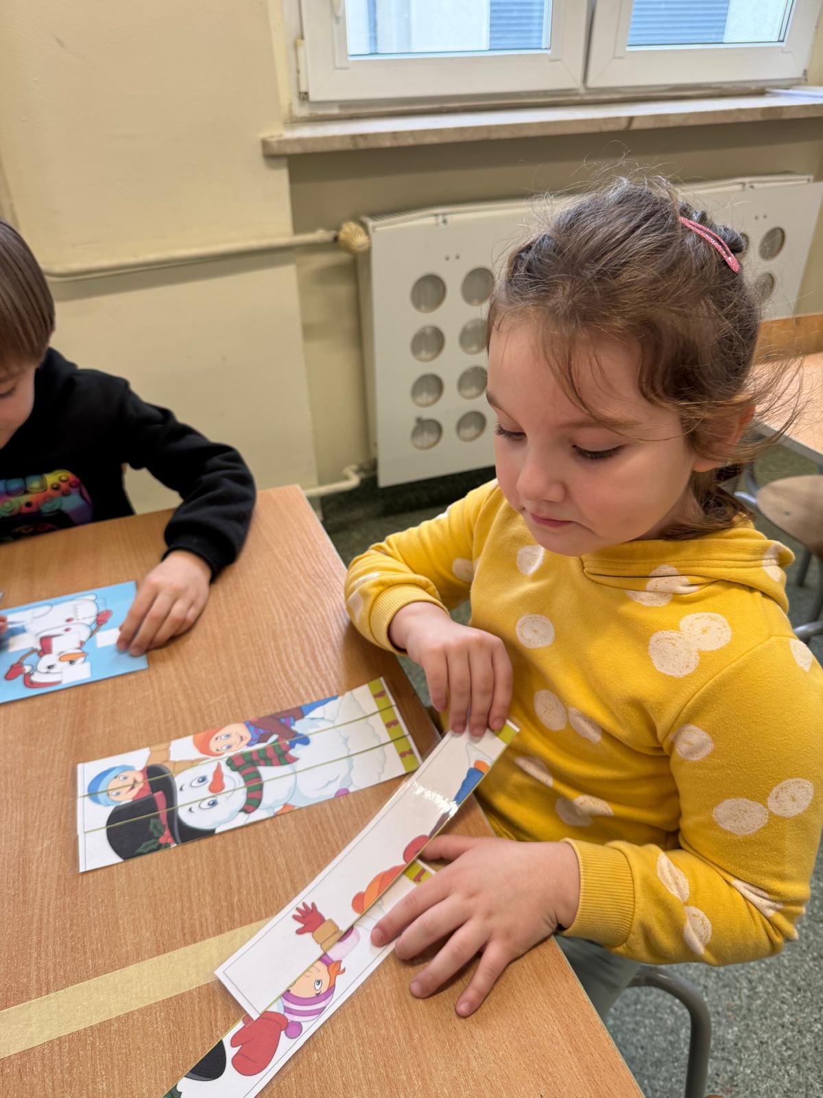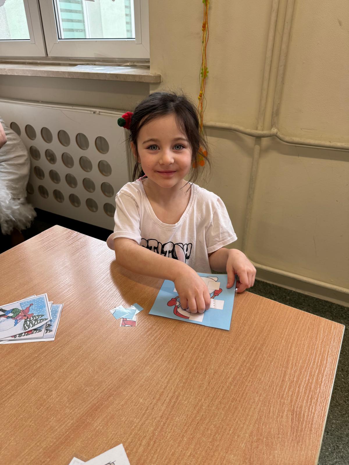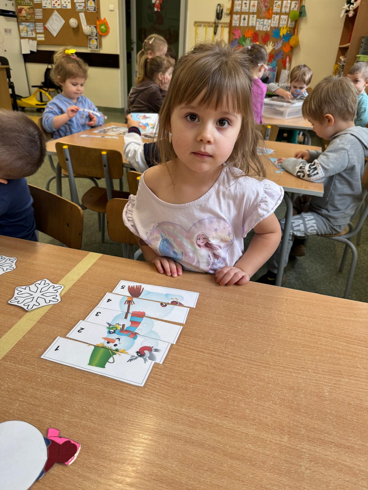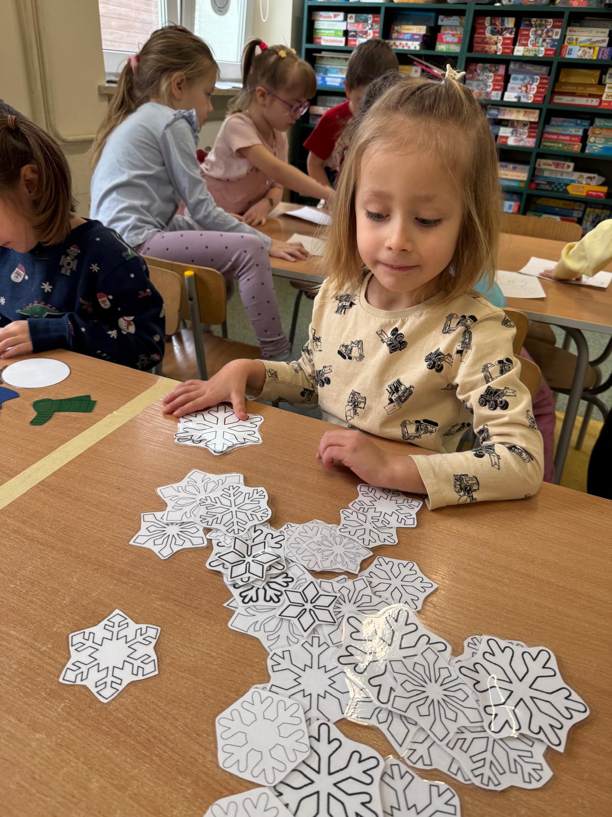Tutaj przedszkolaki skupiły się na uważnej obserwacji. Dzieci układały zimowe puzzle, ćwicząc przy tym liczenie do 10, kolorowały według kodów i odnajdywały pary takich samych śnieżynek. Z lupami w dłoniach badały strukturę śniegu, sprawdzając, jakie tajemnice kryje w sobie biały puch. Na koniec pokonały pełen zakrętów tor przeszkód.