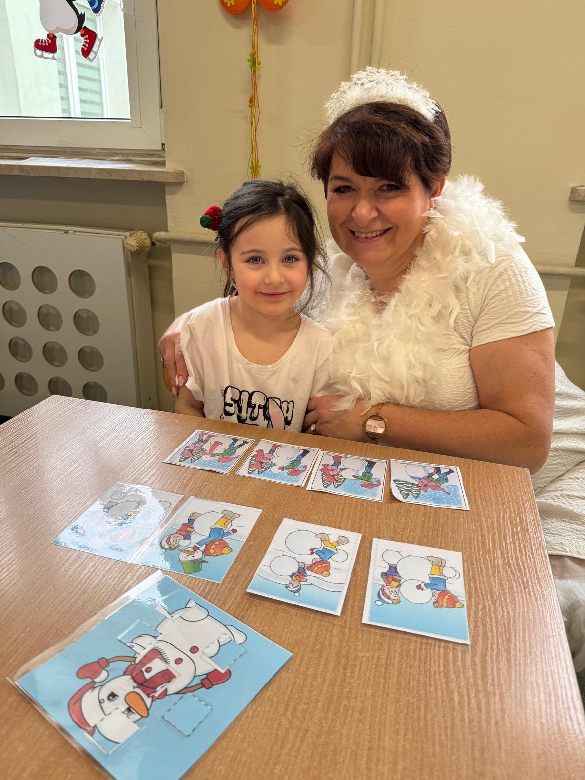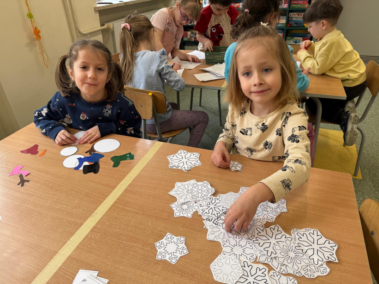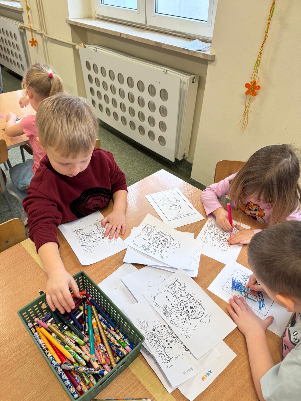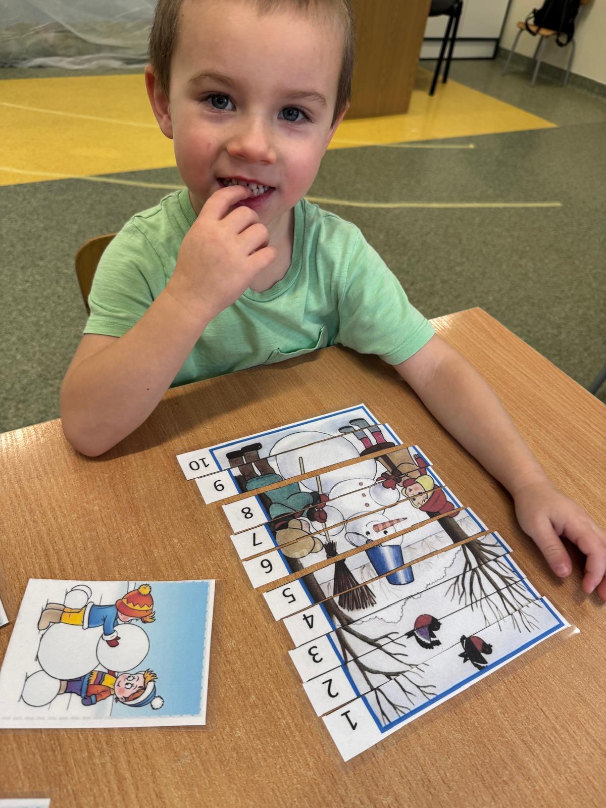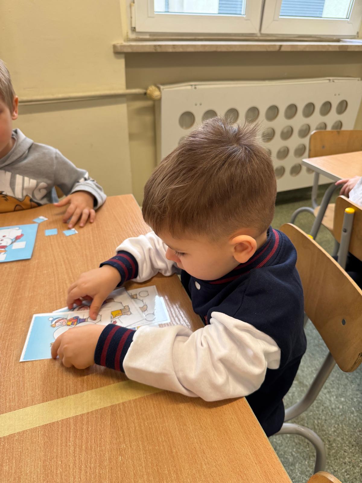 Tutaj przedszkolaki skupiły się na uważnej obserwacji. Dzieci układały zimowe puzzle, ćwicząc przy tym liczenie do 10, kolorowały według kodów i odnajdywały pary takich samych śnieżynek. Z lupami w dłoniach badały strukturę śniegu, sprawdzając, jakie tajemnice kryje w sobie biały puch. Na koniec pokonały pełen zakrętów tor przeszkód.