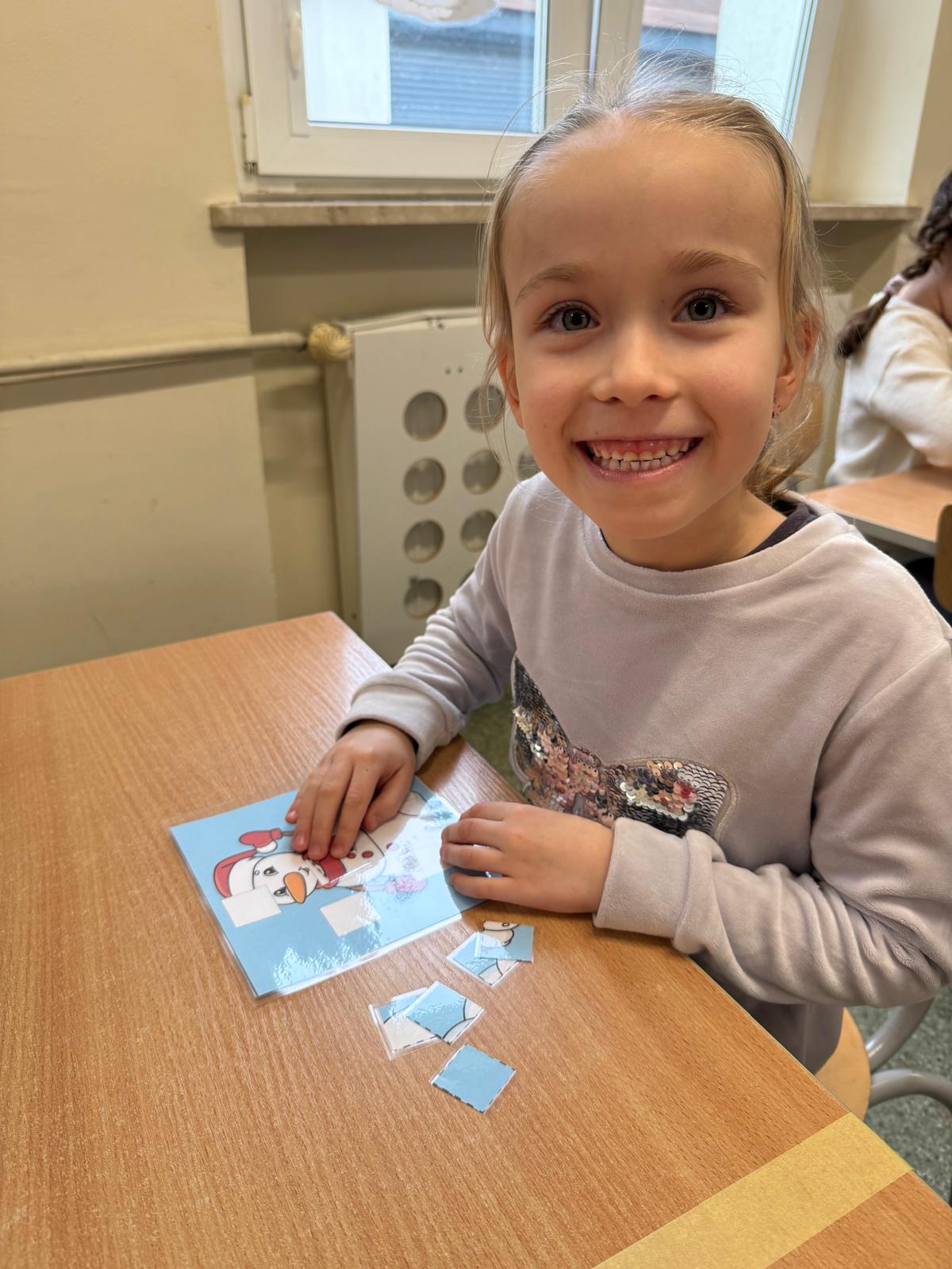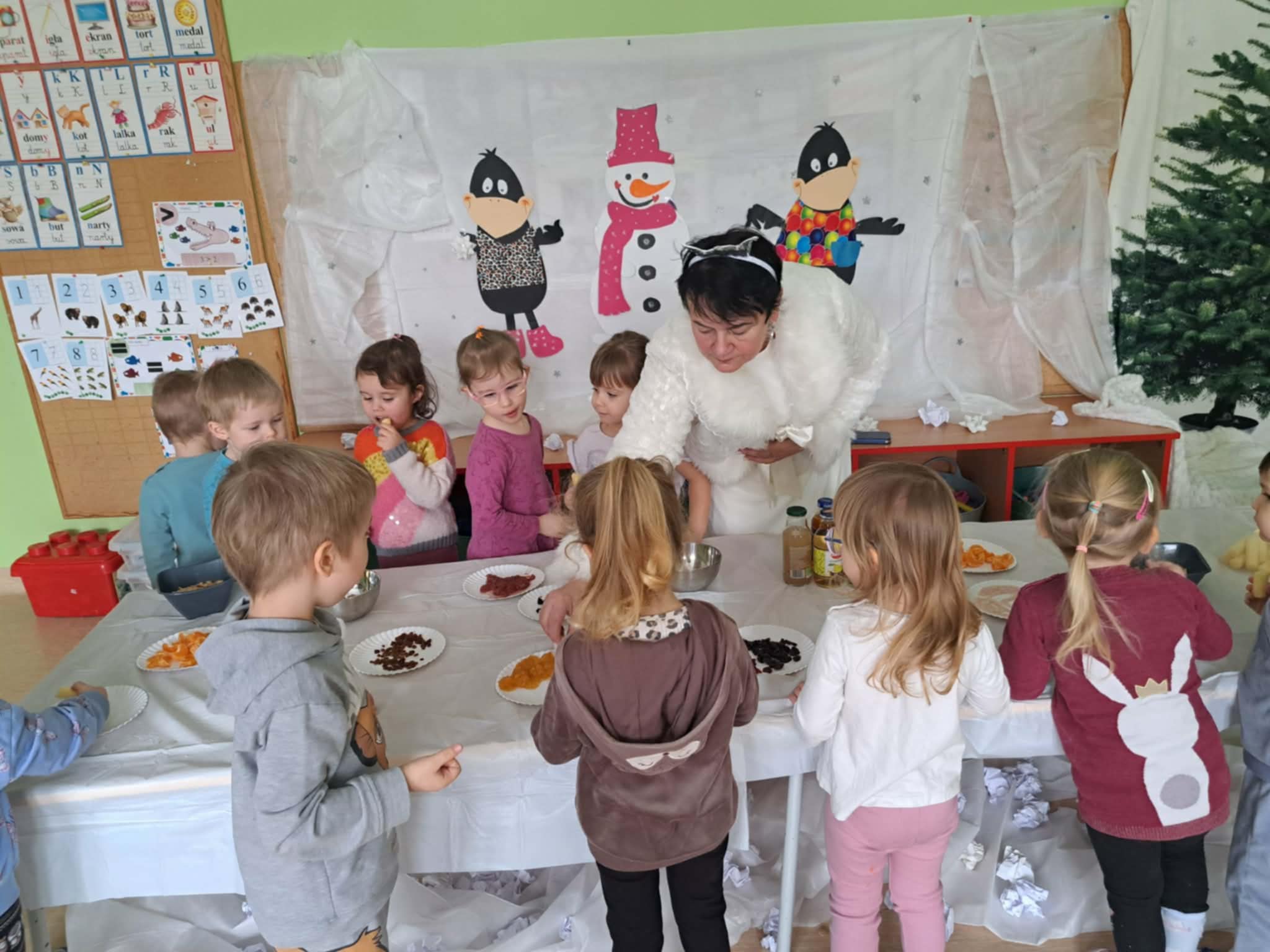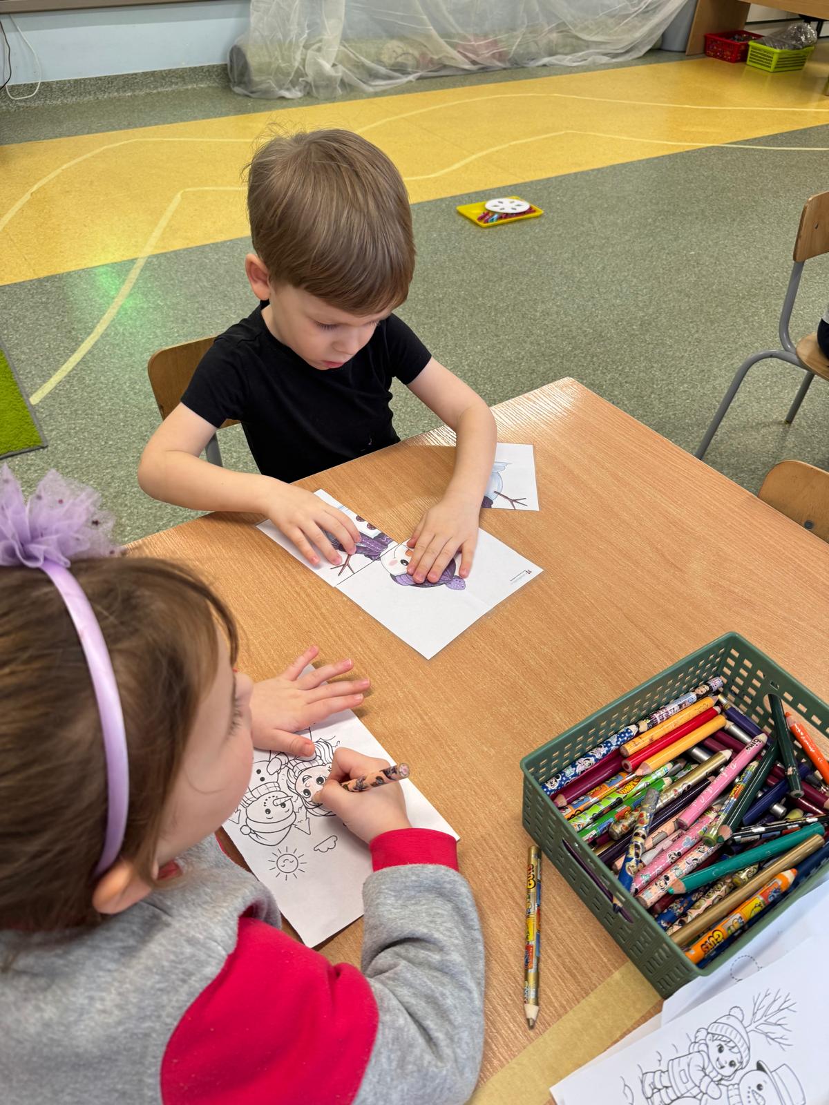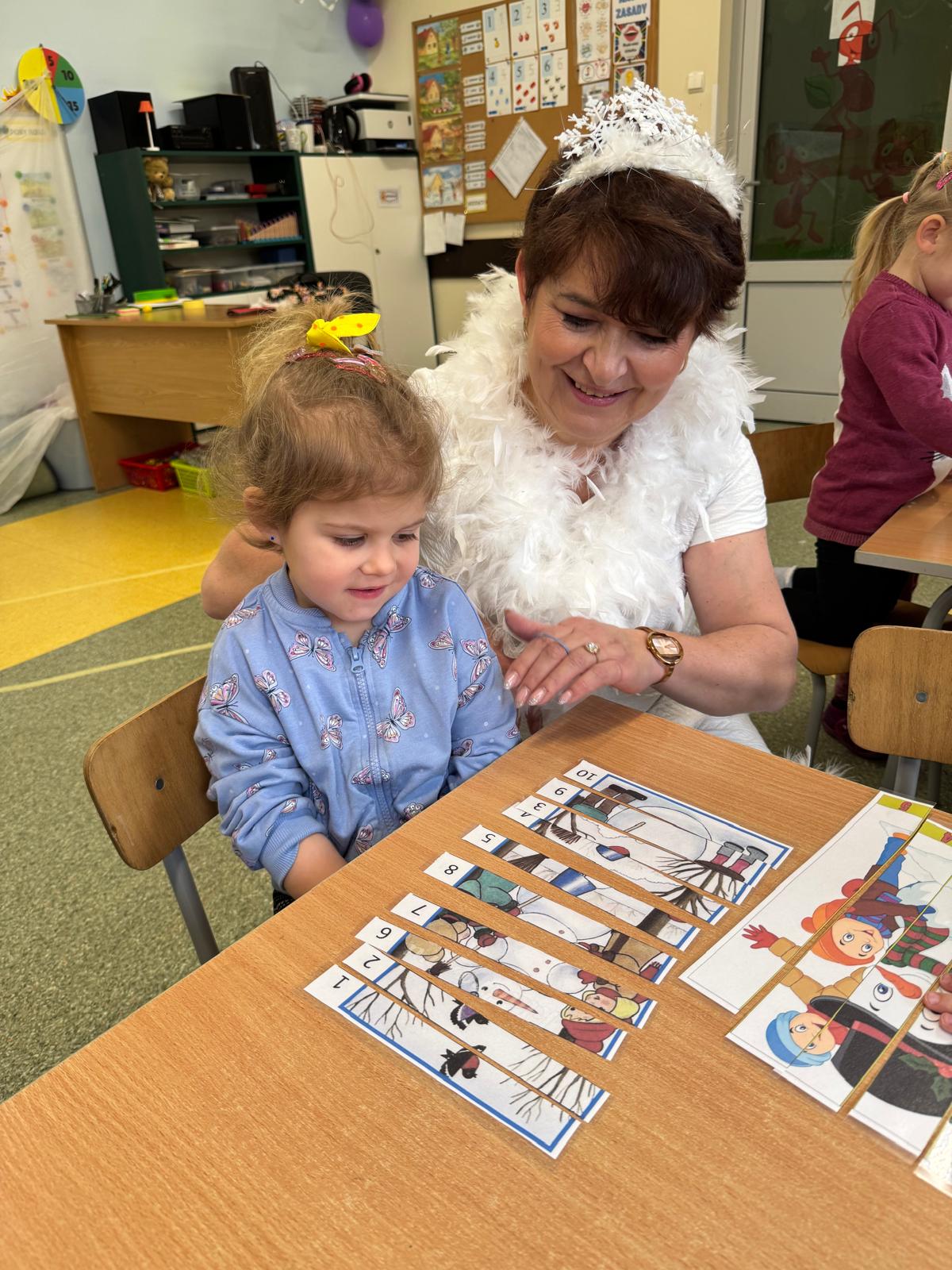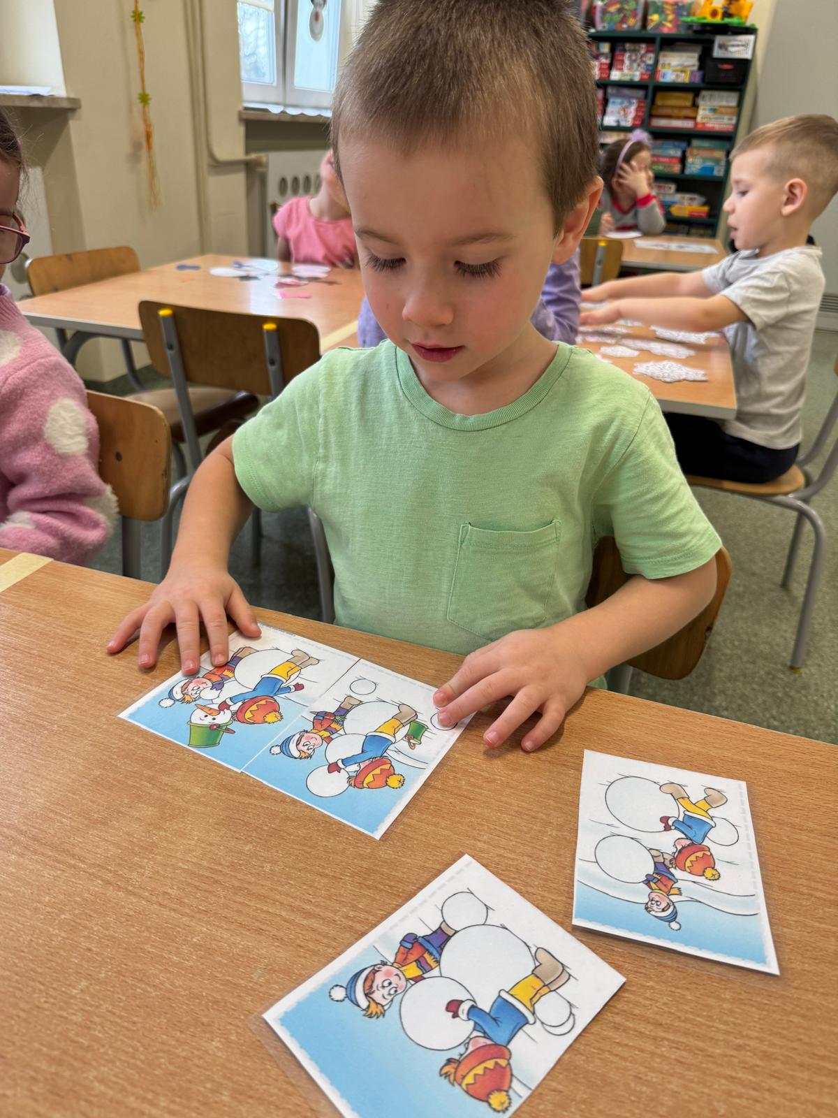 Tutaj przedszkolaki skupiły się na uważnej obserwacji. Dzieci układały zimowe puzzle, ćwicząc przy tym liczenie do 10, kolorowały według kodów i odnajdywały pary takich samych śnieżynek. Z lupami w dłoniach badały strukturę śniegu, sprawdzając, jakie tajemnice kryje w sobie biały puch. Na koniec pokonały pełen zakrętów tor przeszkód.